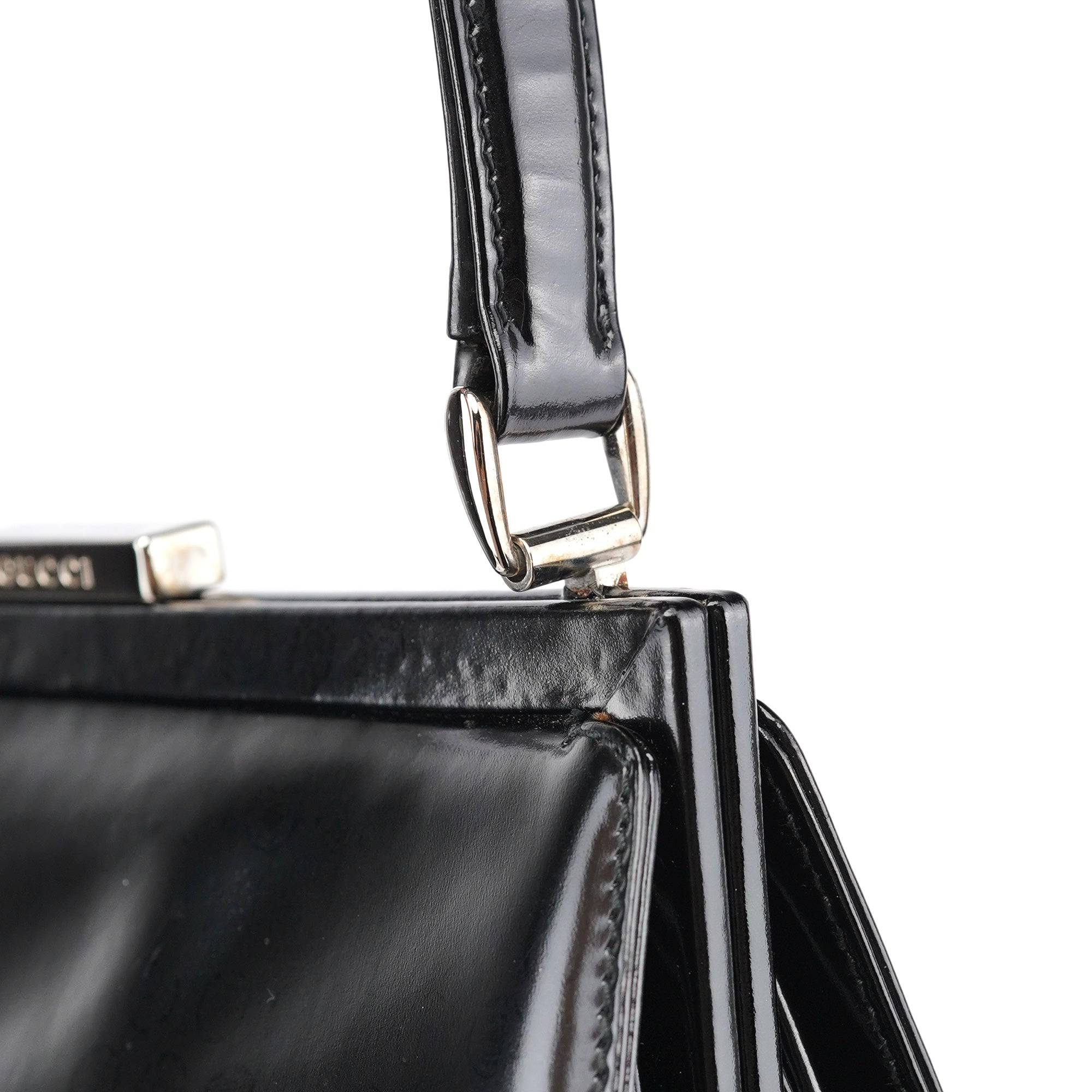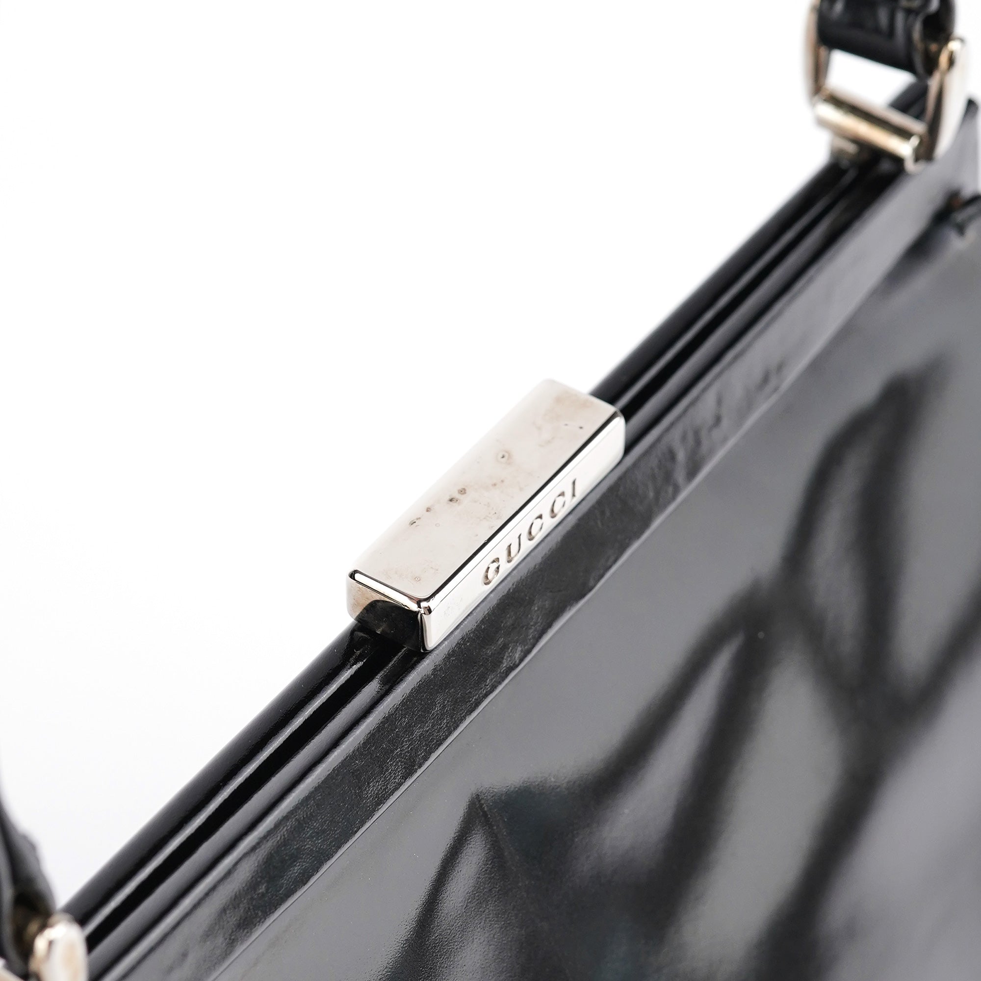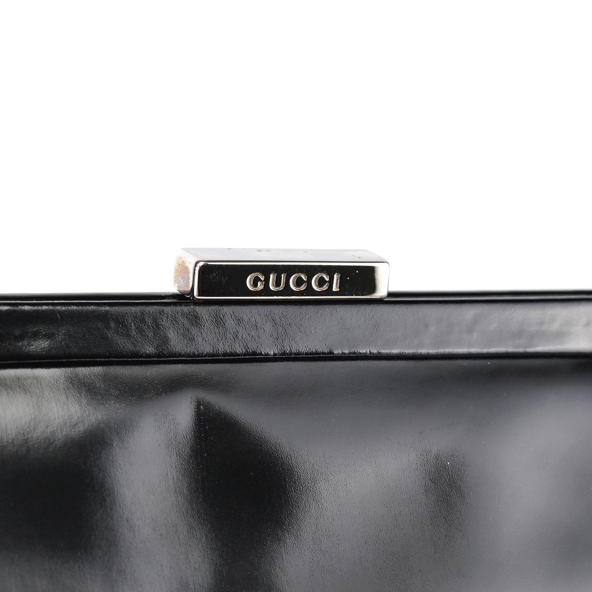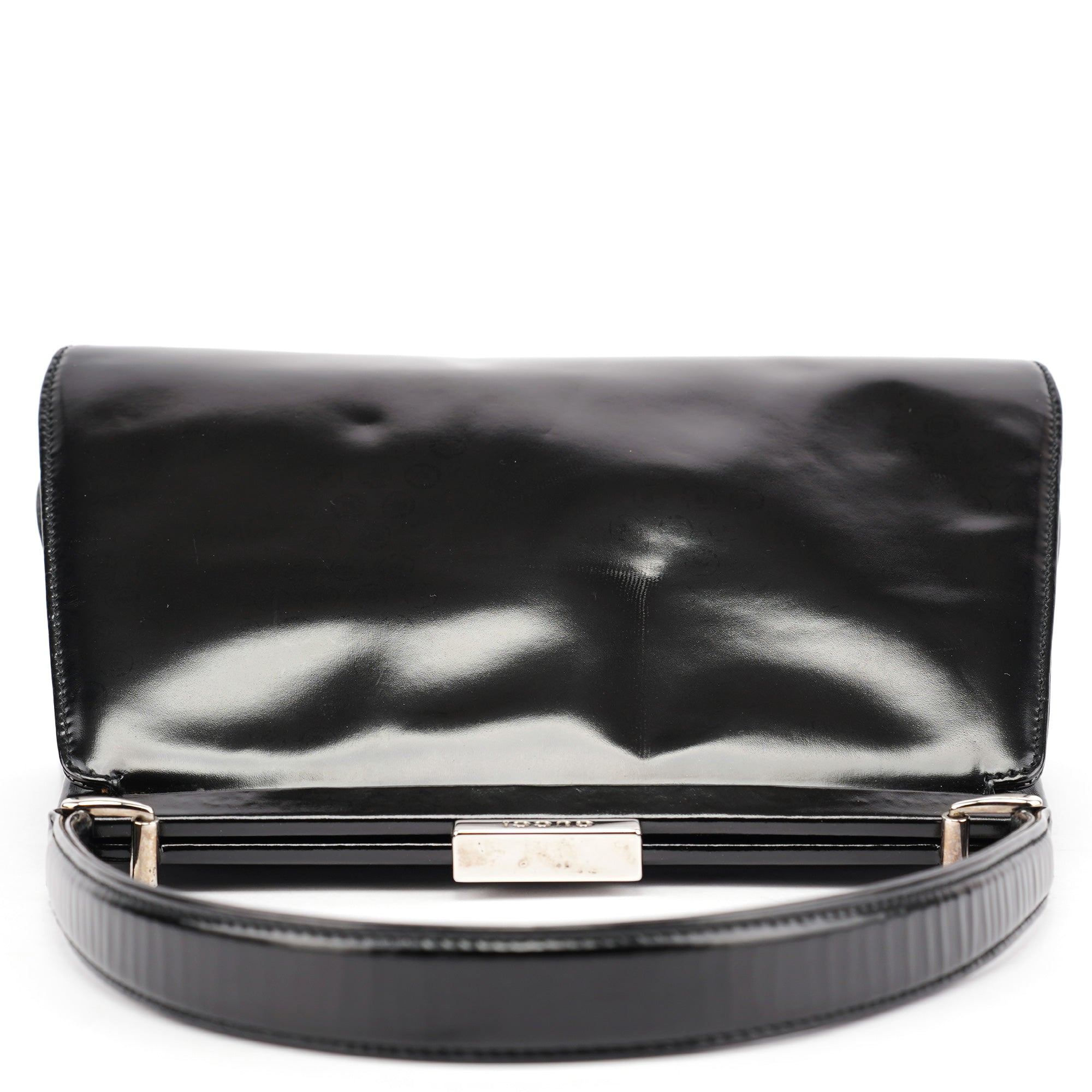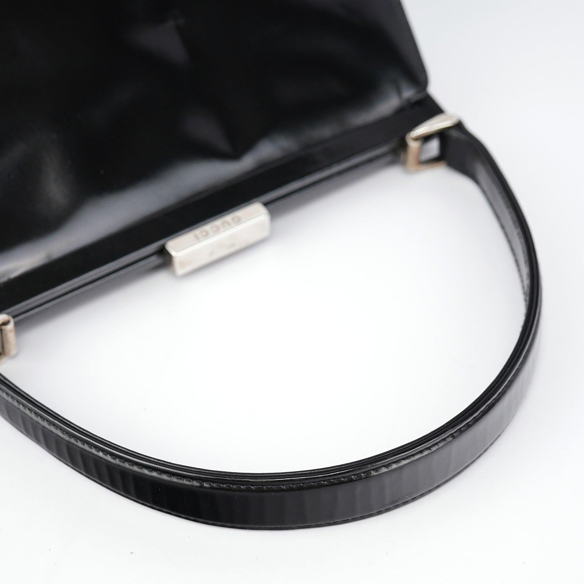 Designed in the mid-1990s by Tom Ford, this Gucci handbag is crafted in glossy black calfskin patent leather with a structured silhouette and silver-tone clasp closure. It features a single flat handle, a fabric-lined interior with a zip pocket, and an engraved logo bar at the frame.