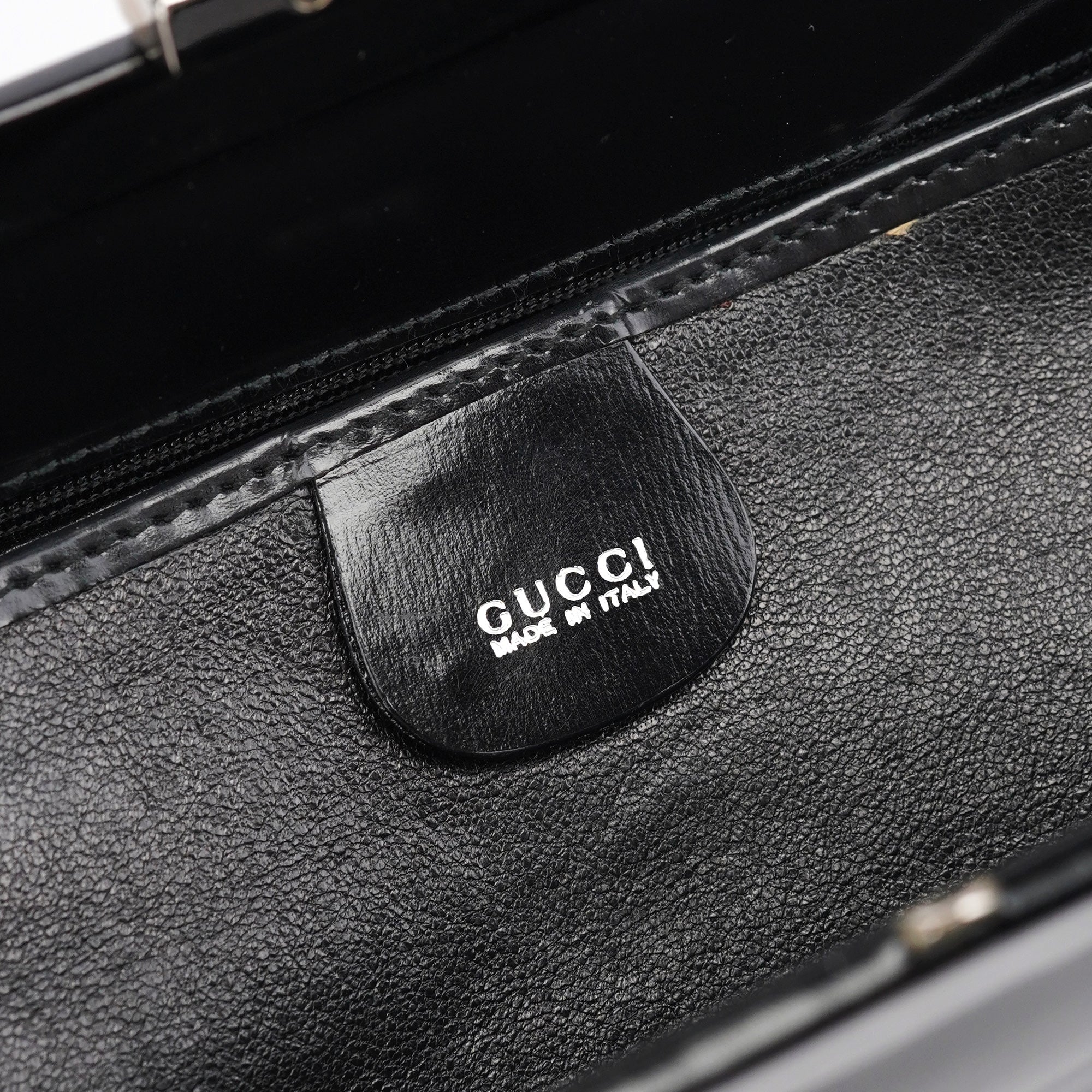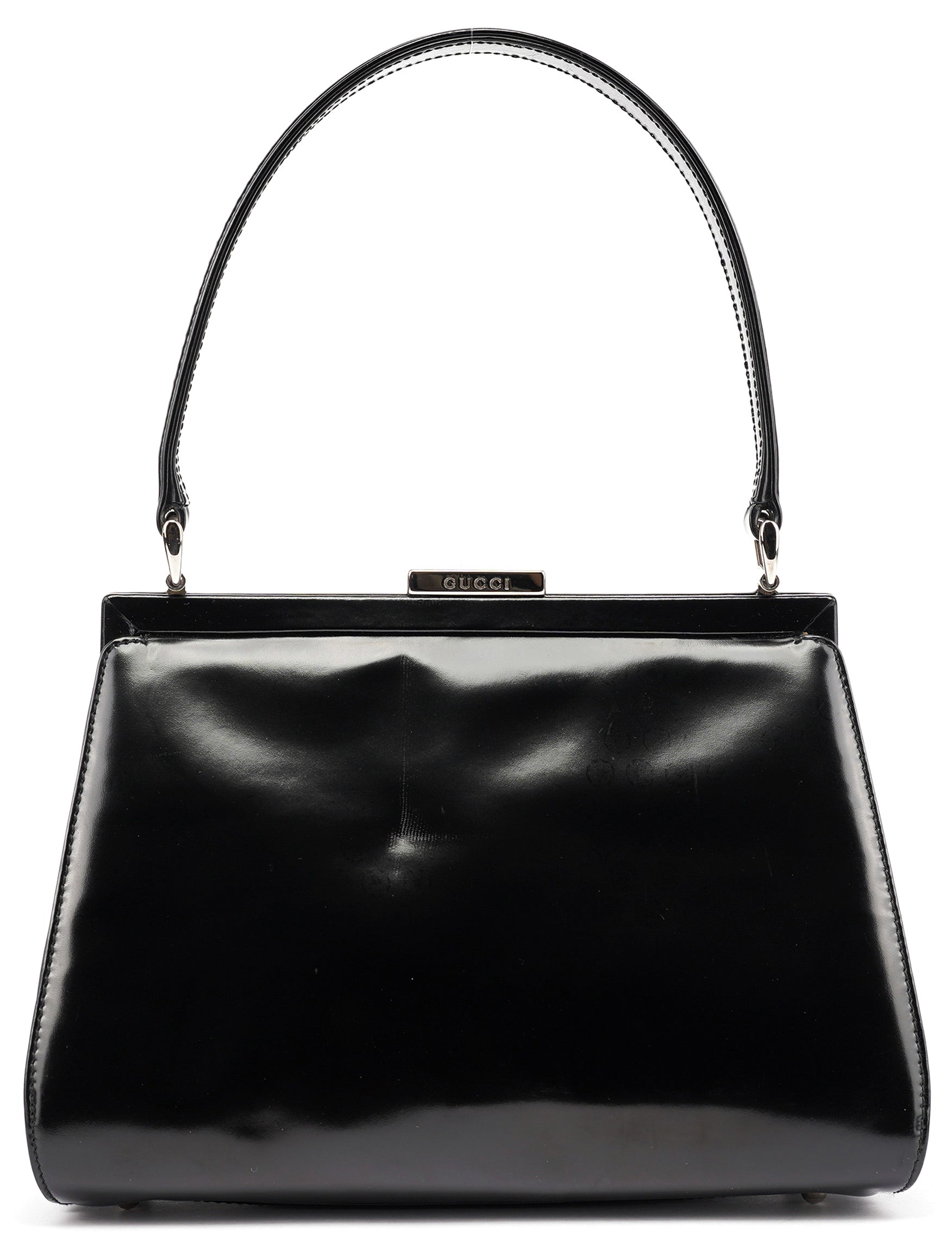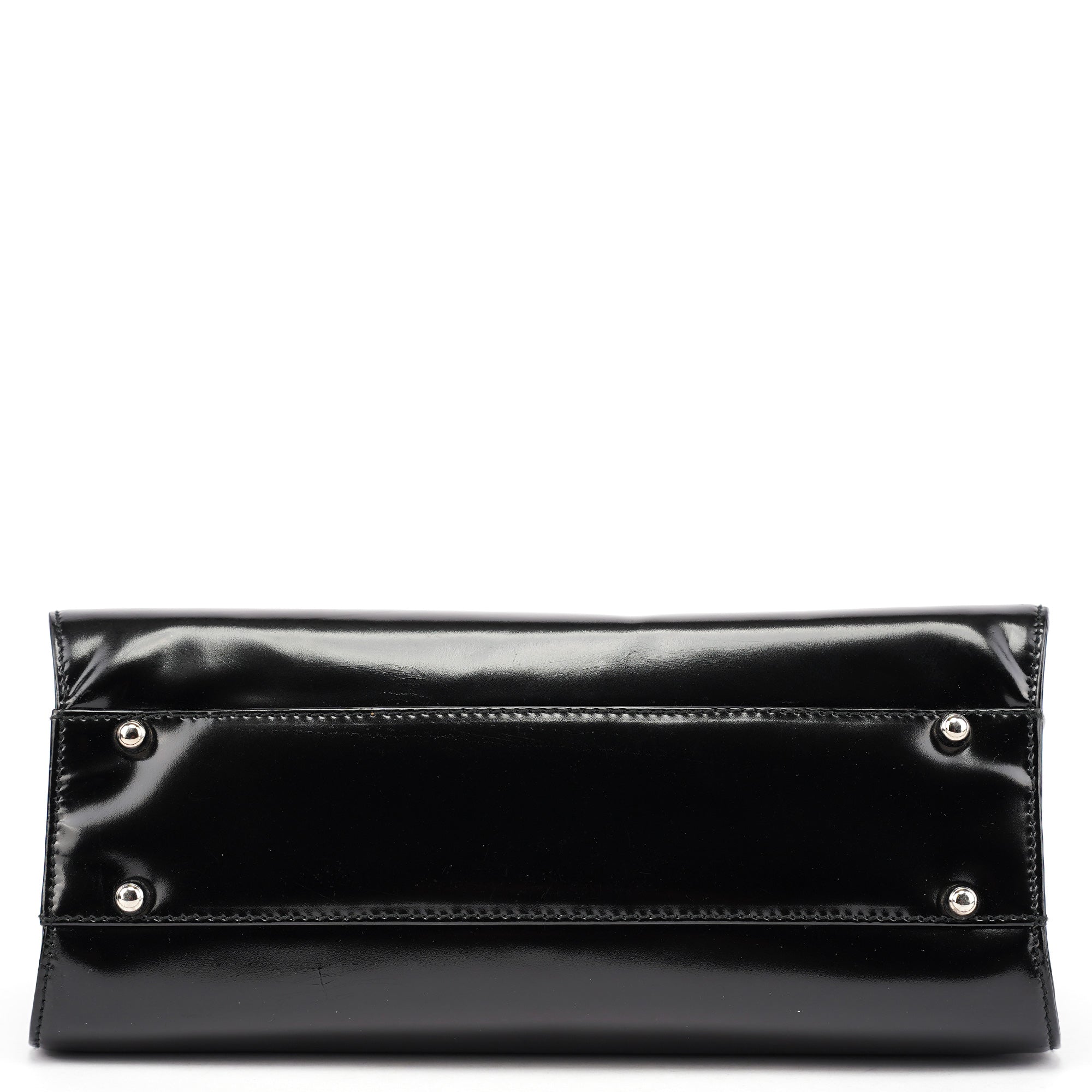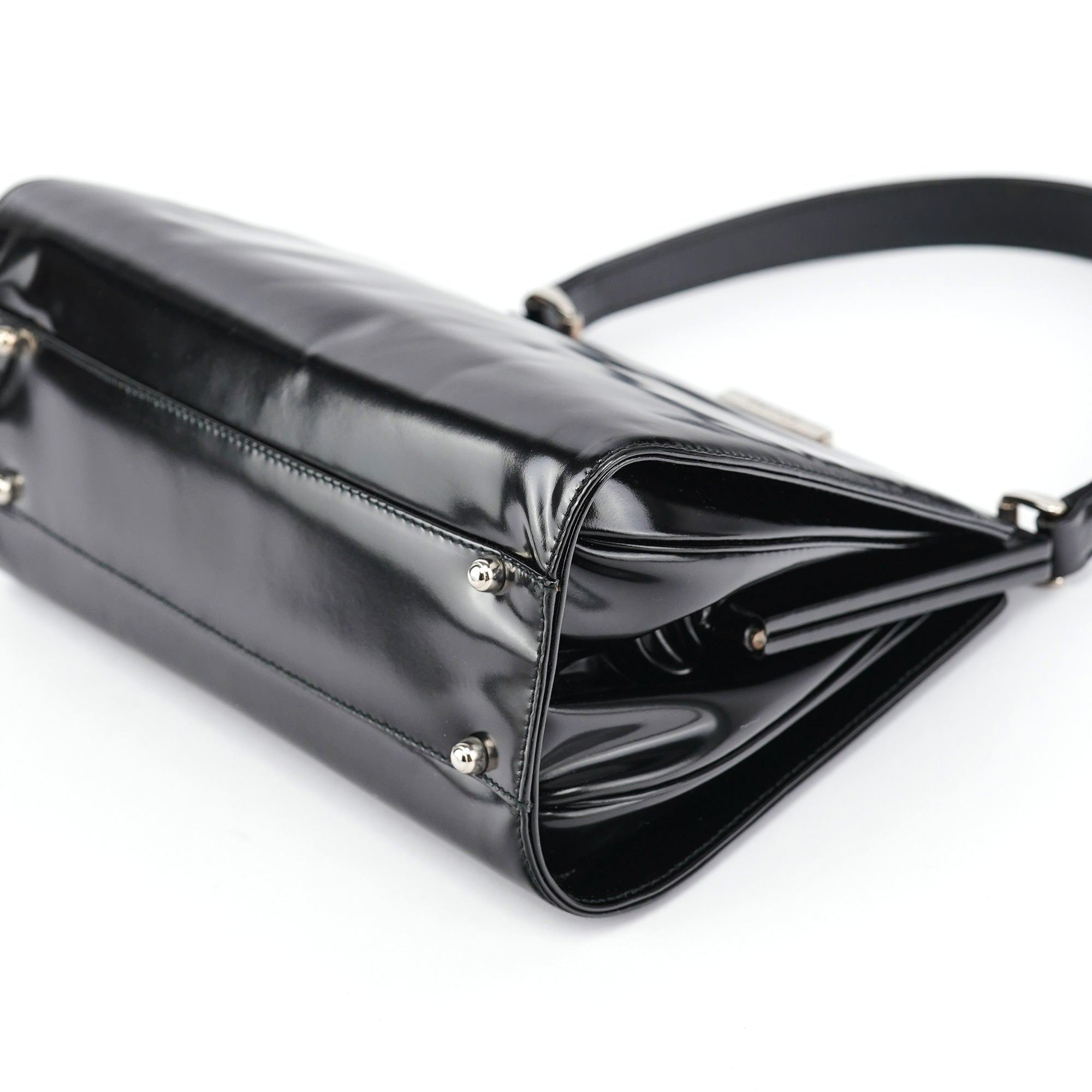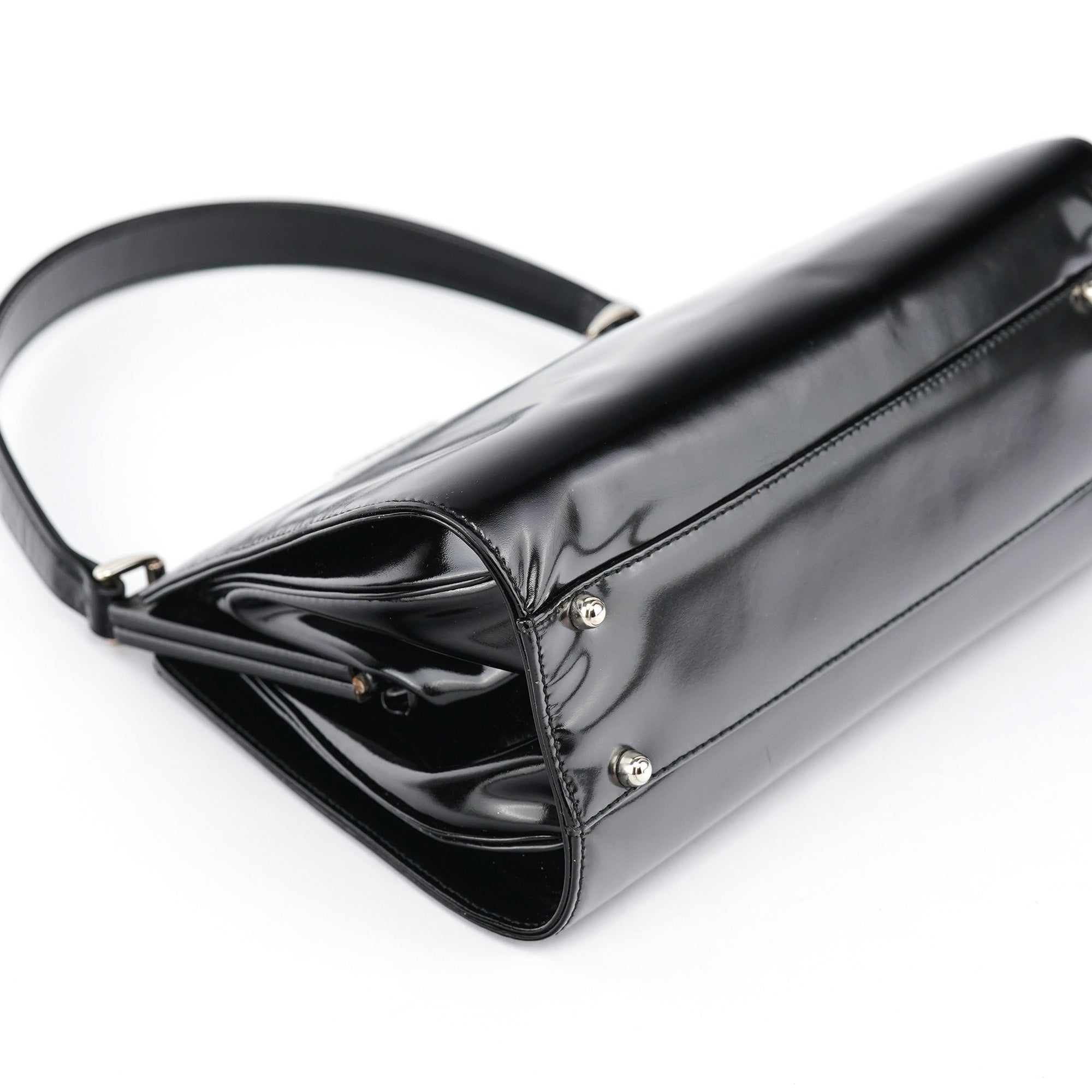 Designed in the mid-1990s by Tom Ford, this Gucci handbag is crafted in glossy black calfskin patent leather with a structured silhouette and silver-tone clasp closure. It features a single flat handle, a fabric-lined interior with a zip pocket, and an engraved logo bar at the frame.