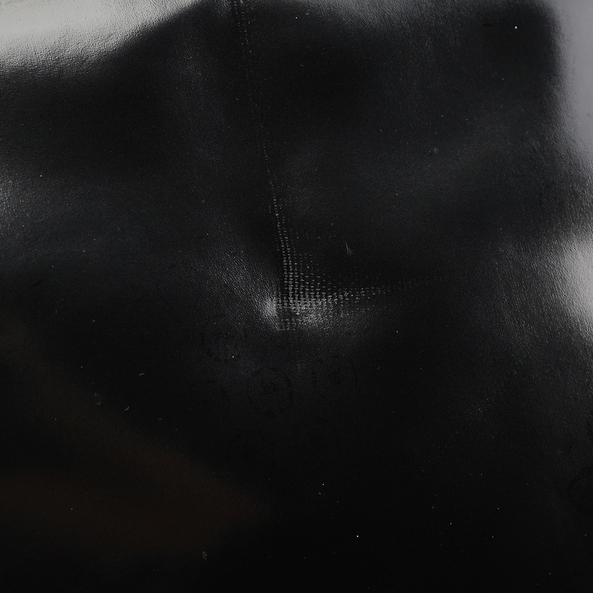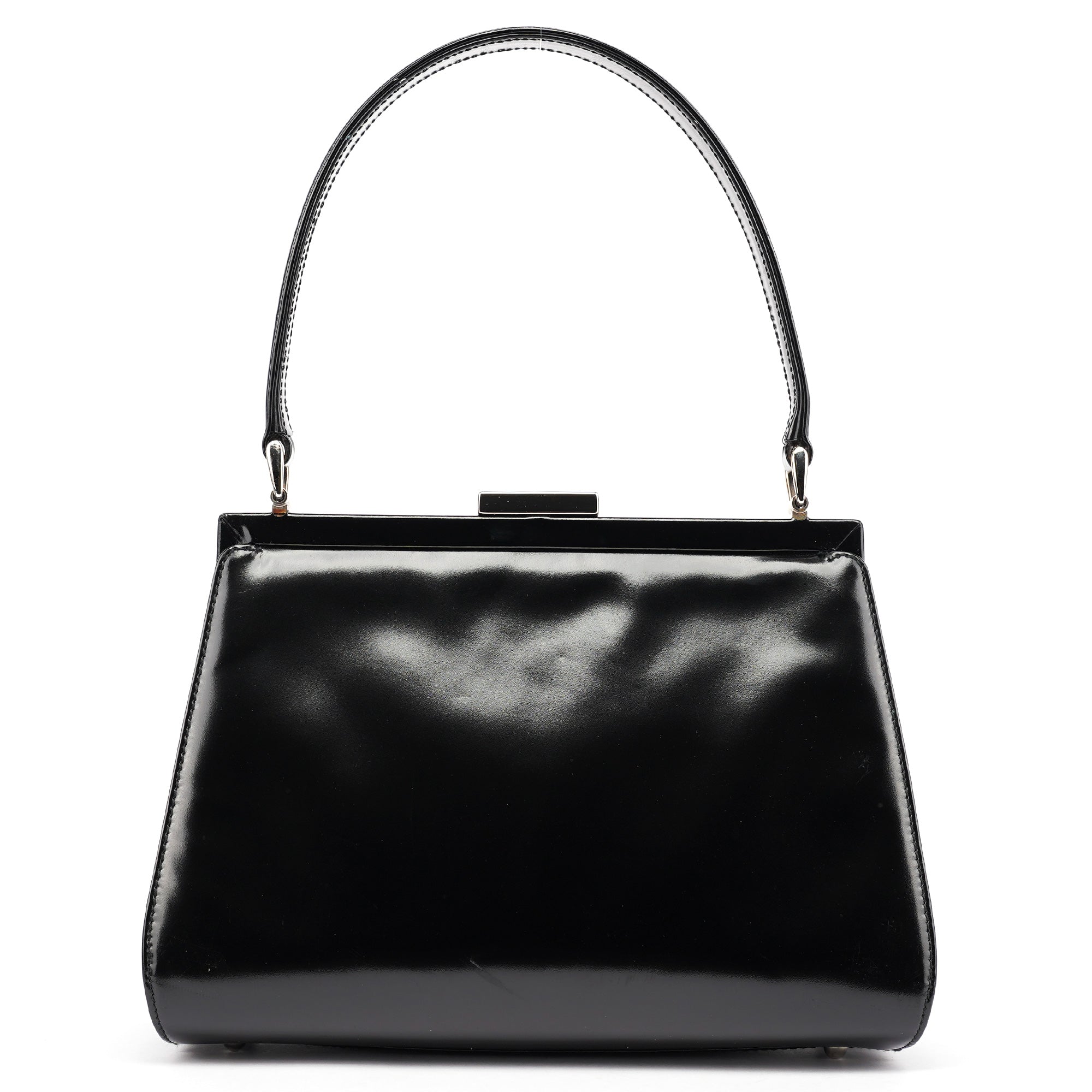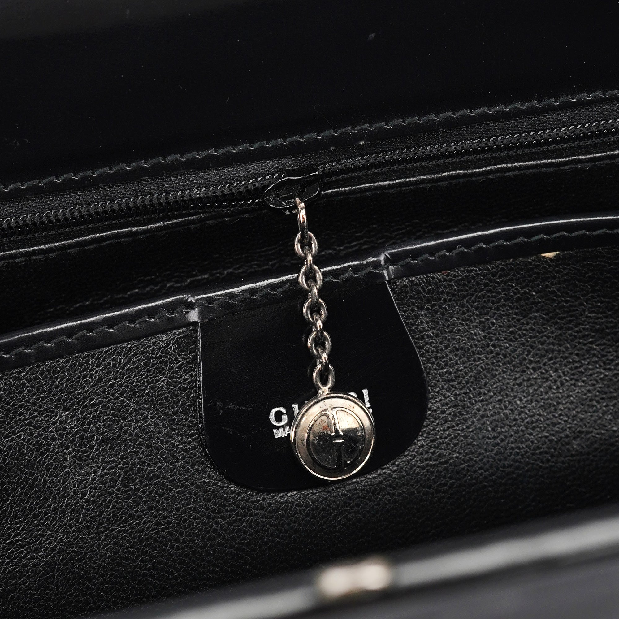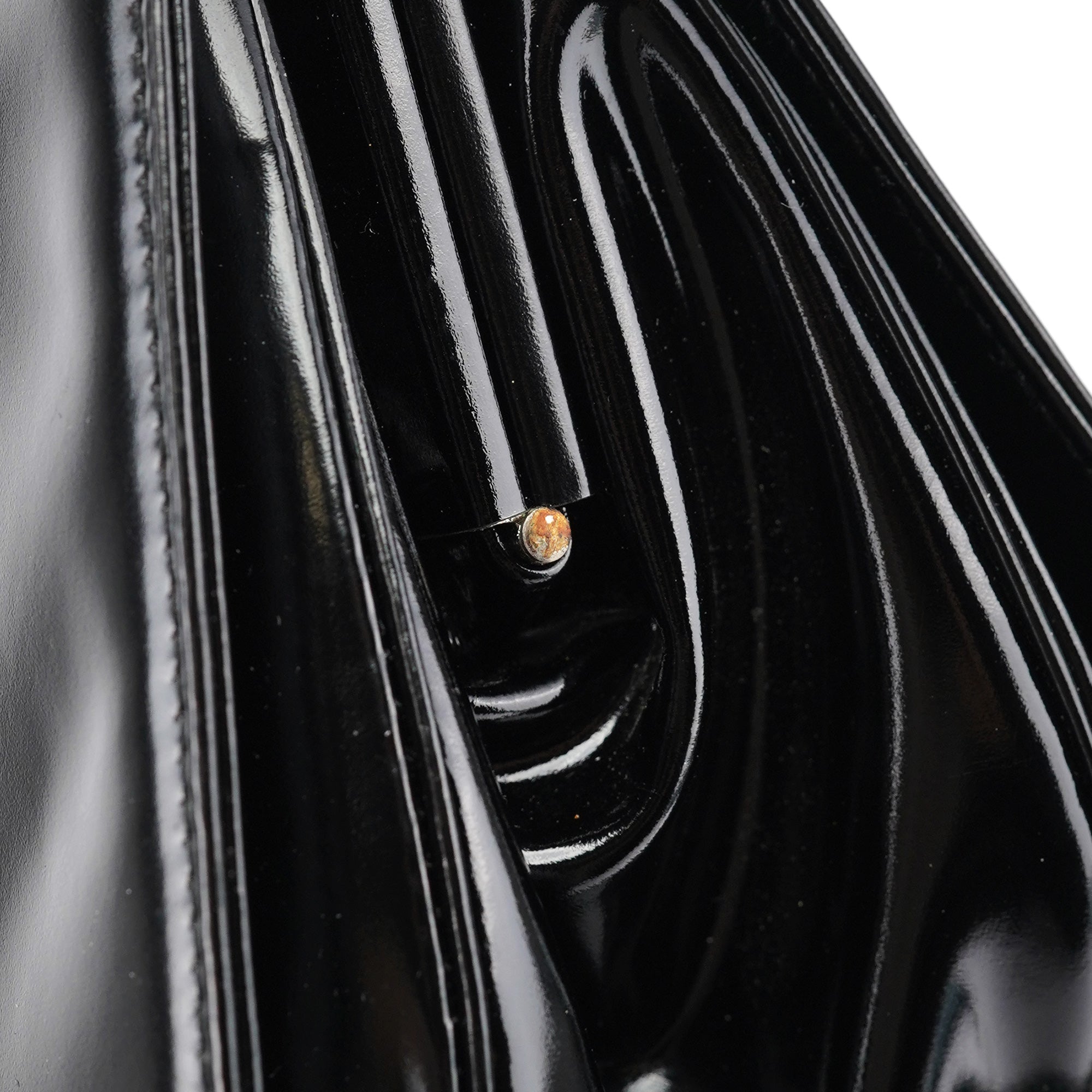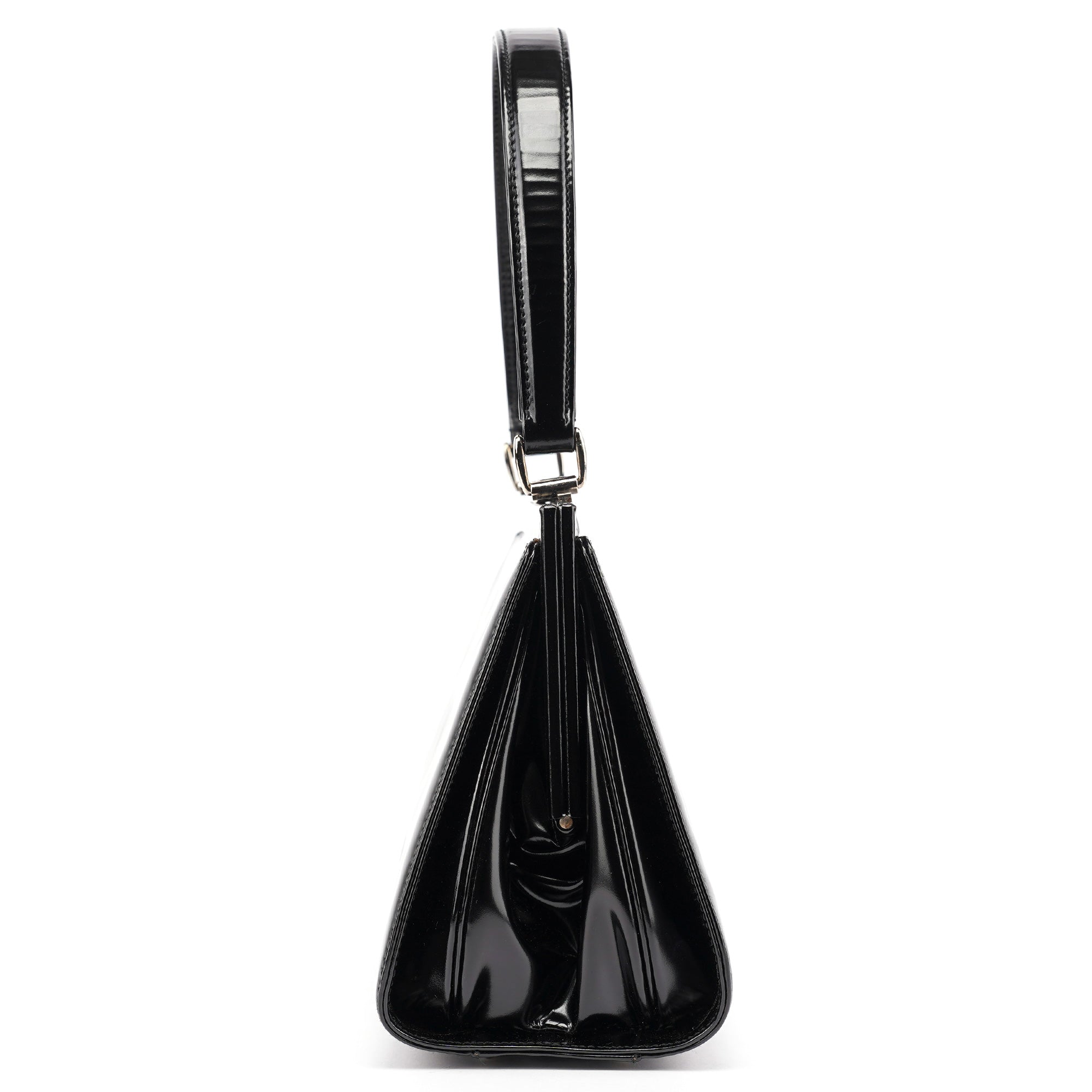 Designed in the mid-1990s by Tom Ford, this Gucci handbag is crafted in glossy black calfskin patent leather with a structured silhouette and silver-tone clasp closure. It features a single flat handle, a fabric-lined interior with a zip pocket, and an engraved logo bar at the frame.