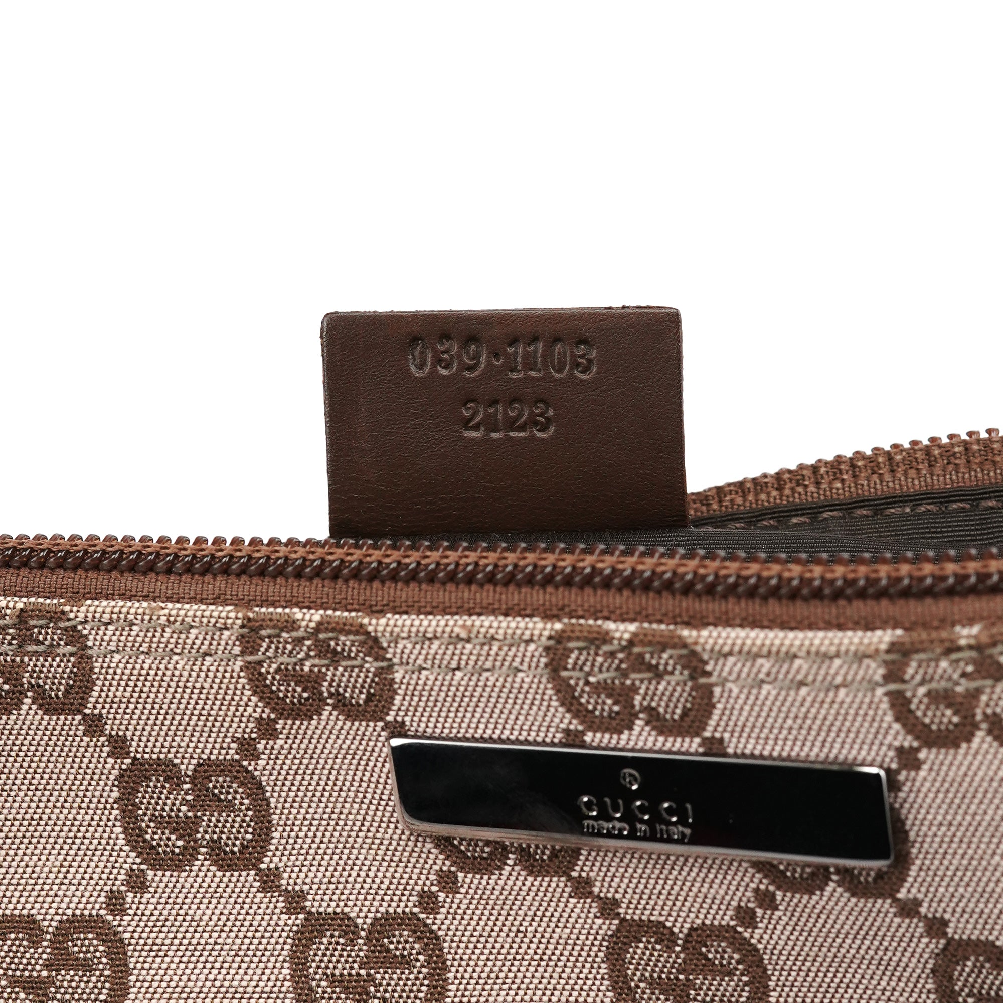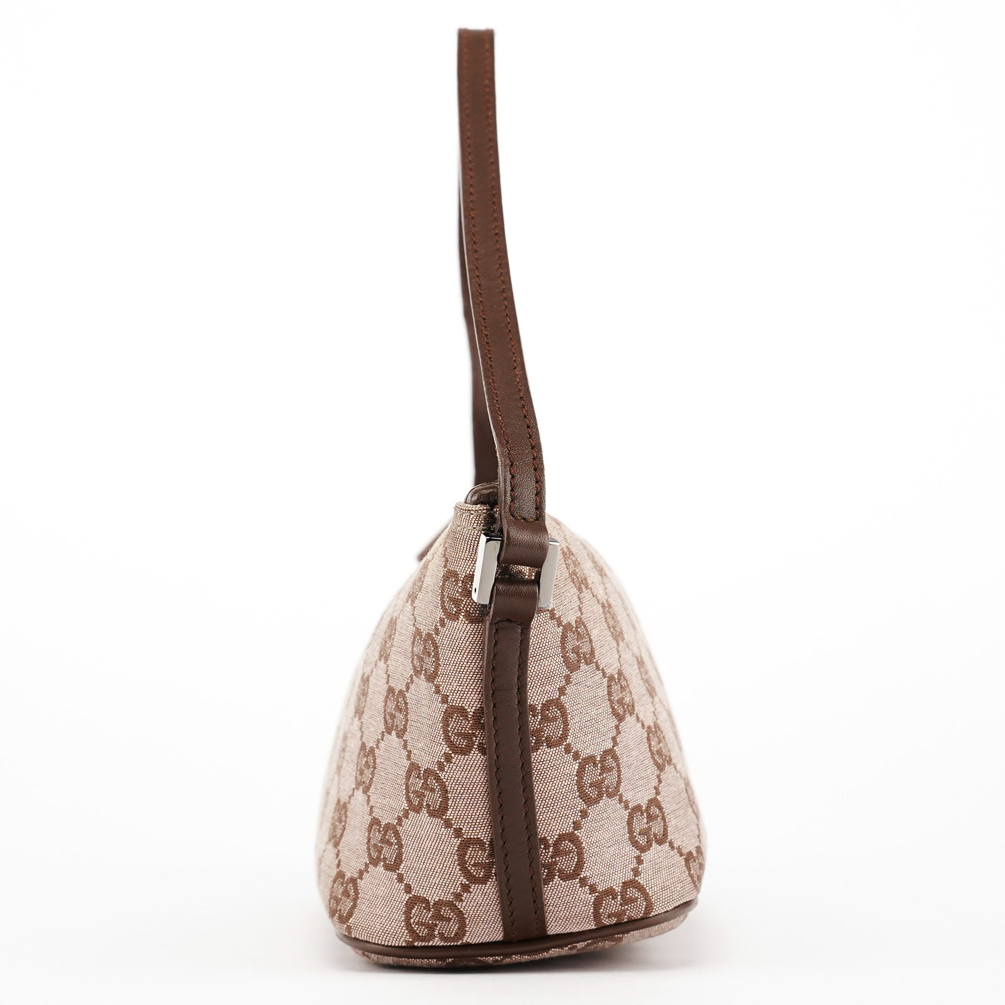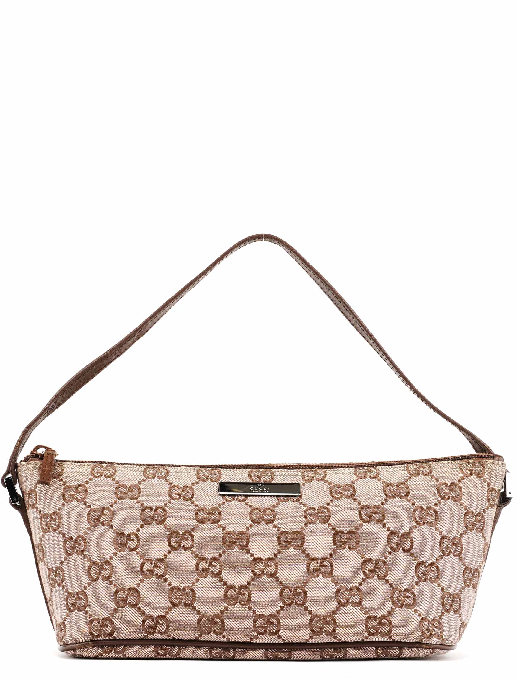 Designed in the late 1990s by Tom Ford, the Gucci GG Boat Pochette is an iconic shoulder bag crafted in beige GG canvas with brown leather trim. The slim silhouette features a zip-top closure, leather shoulder strap, and a compact fabric-lined interior.