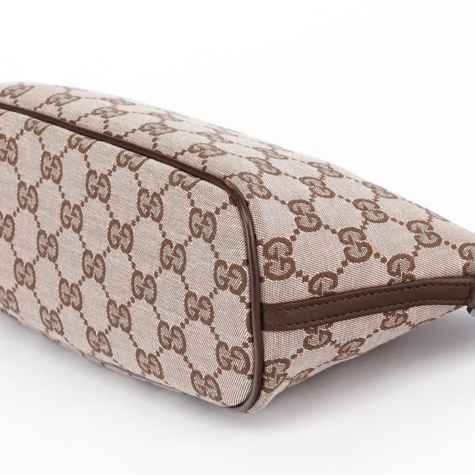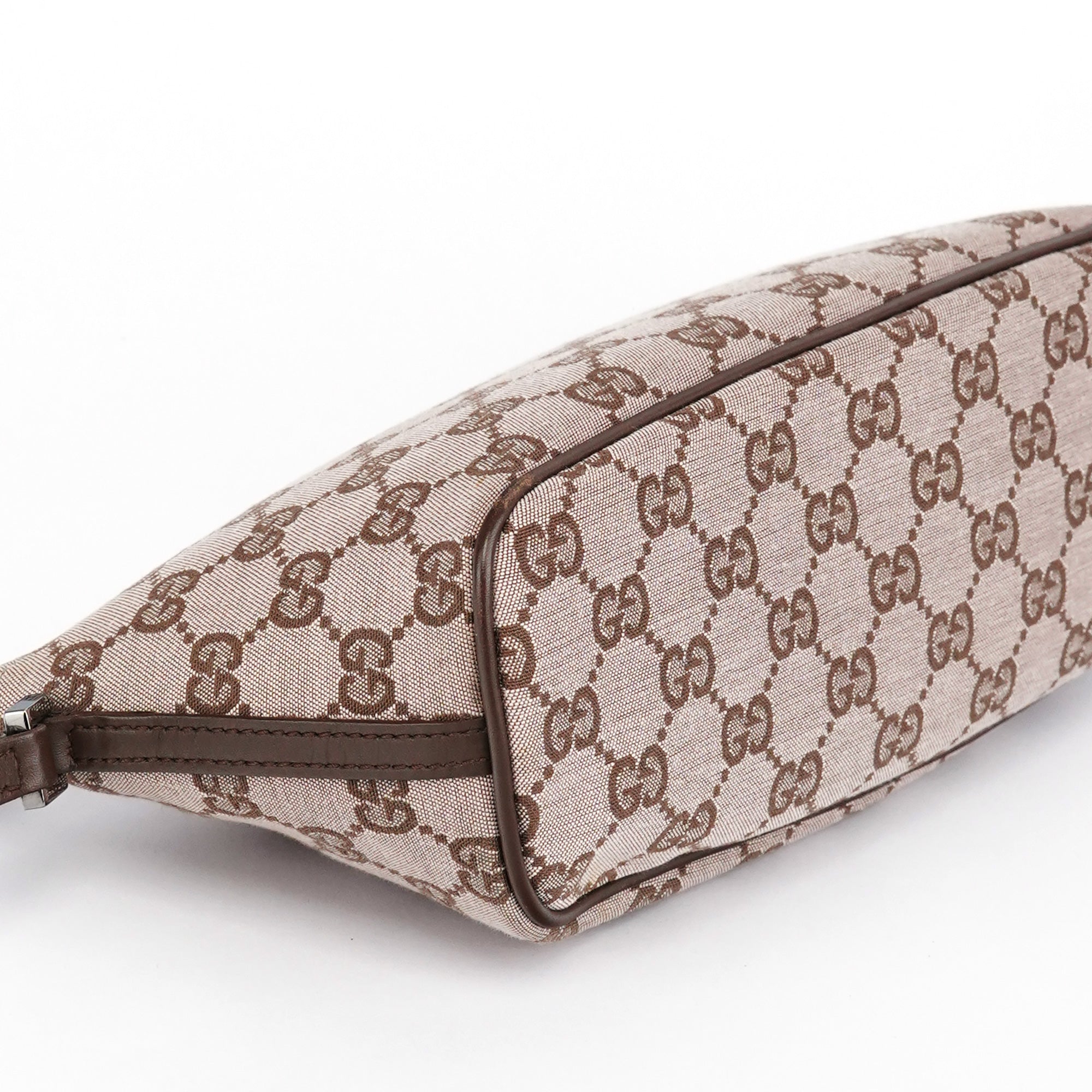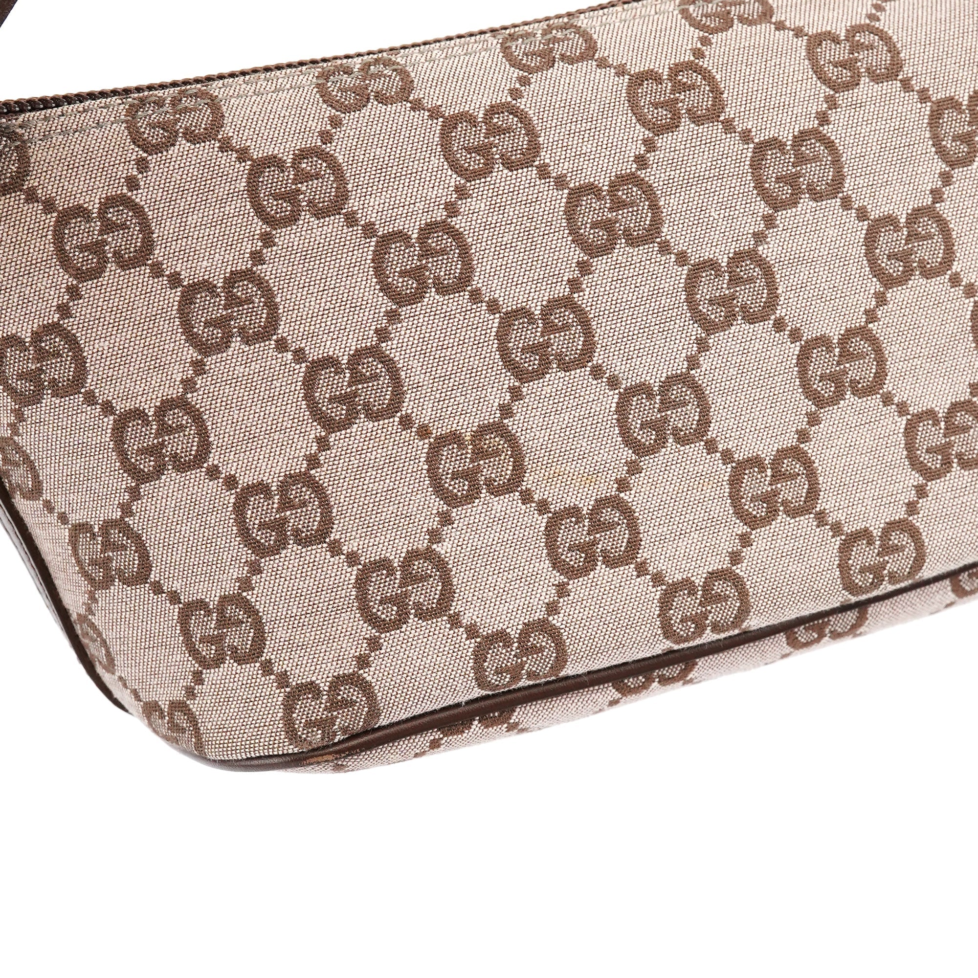 Designed in the late 1990s by Tom Ford, the Gucci GG Boat Pochette is an iconic shoulder bag crafted in beige GG canvas with brown leather trim. The slim silhouette features a zip-top closure, leather shoulder strap, and a compact fabric-lined interior.