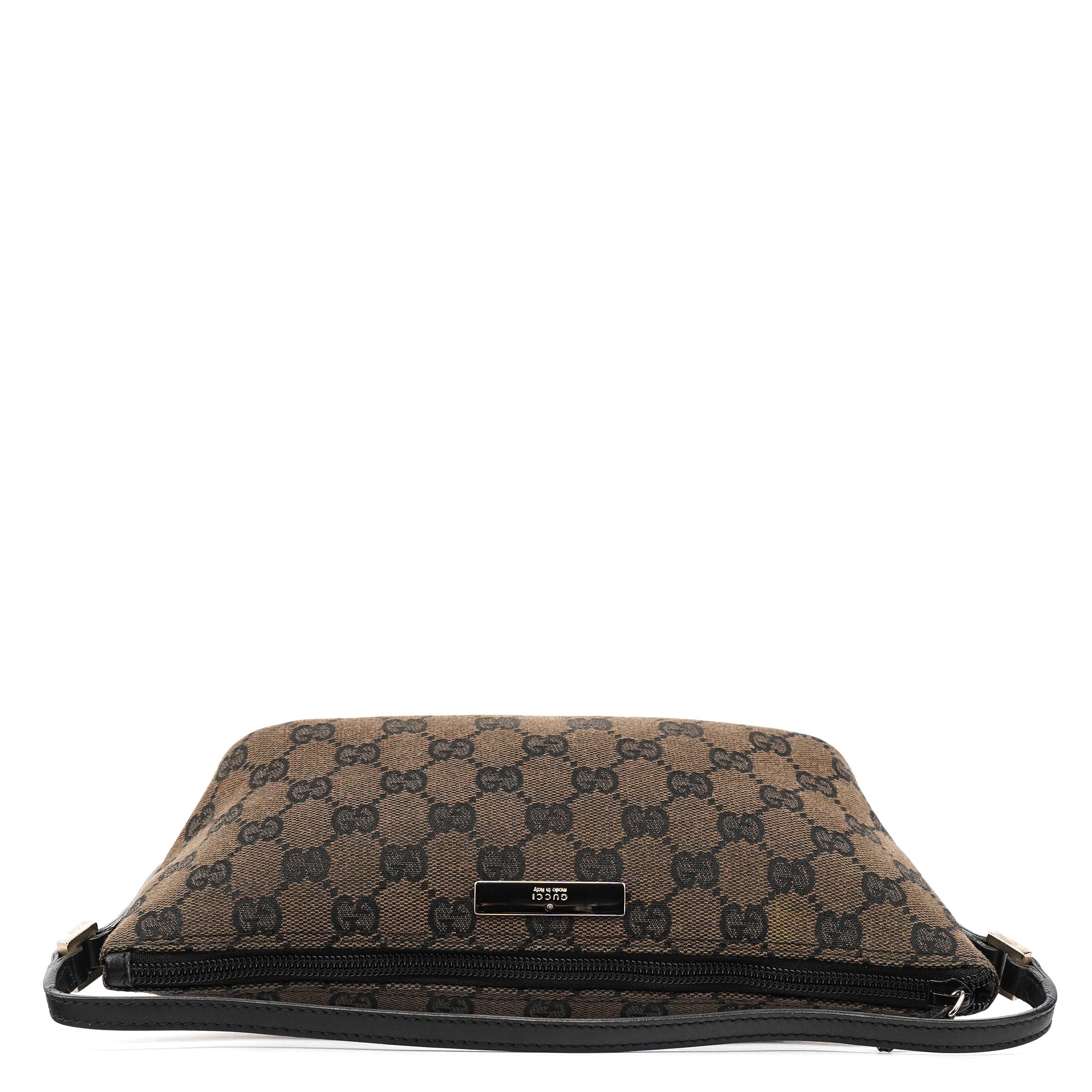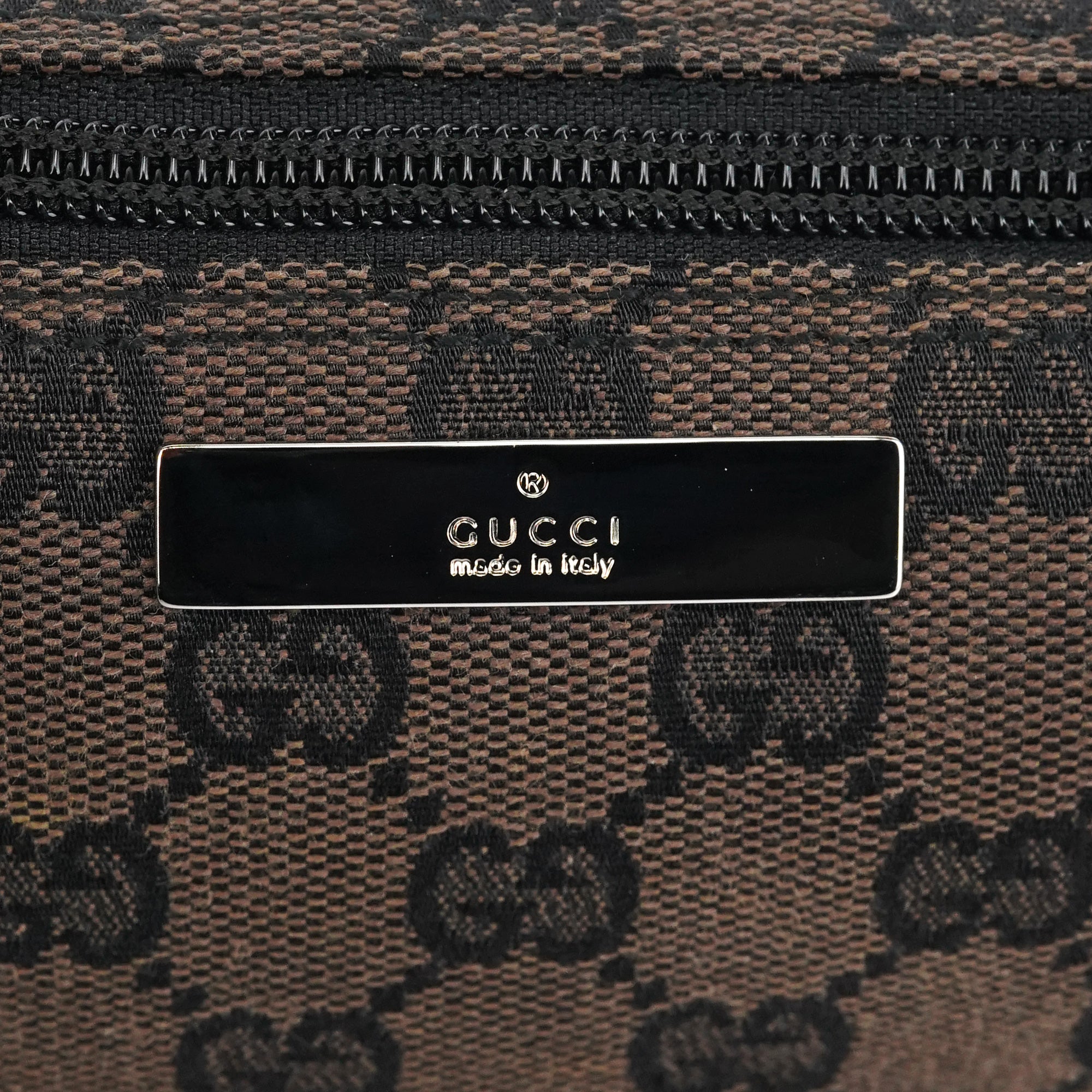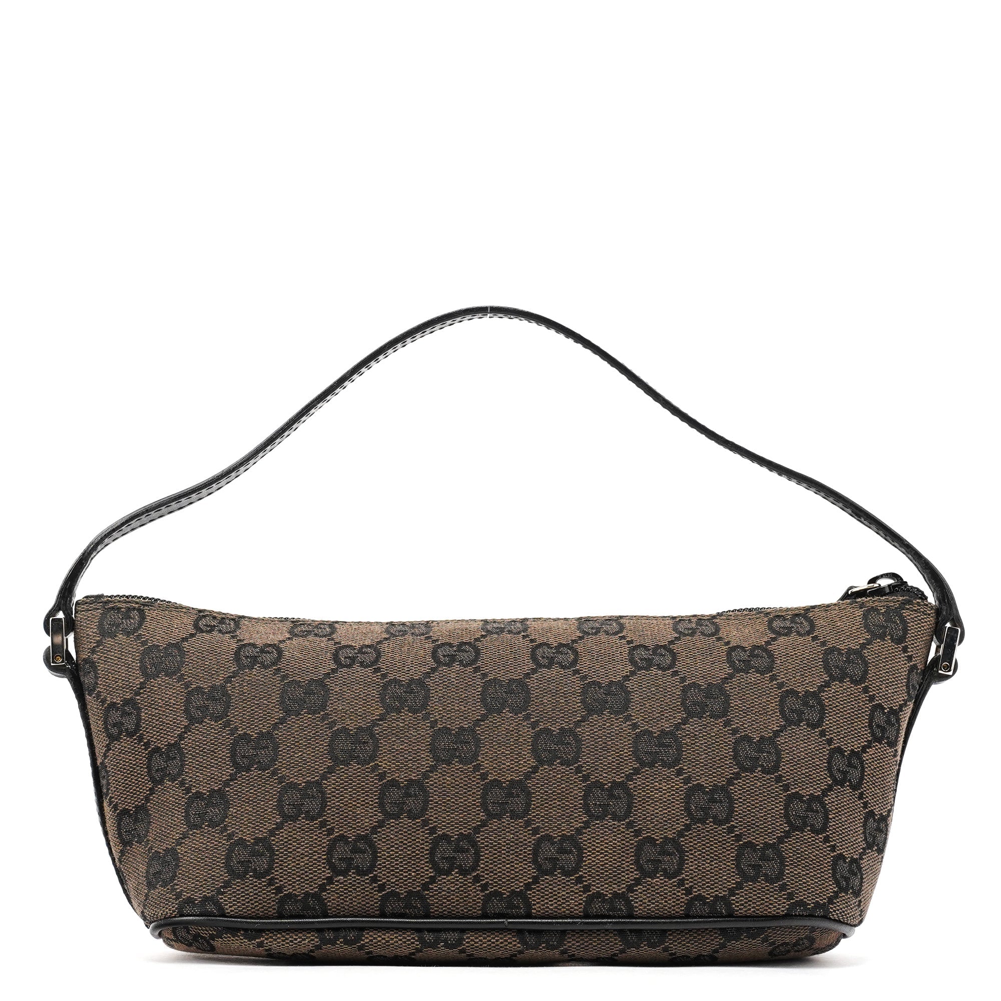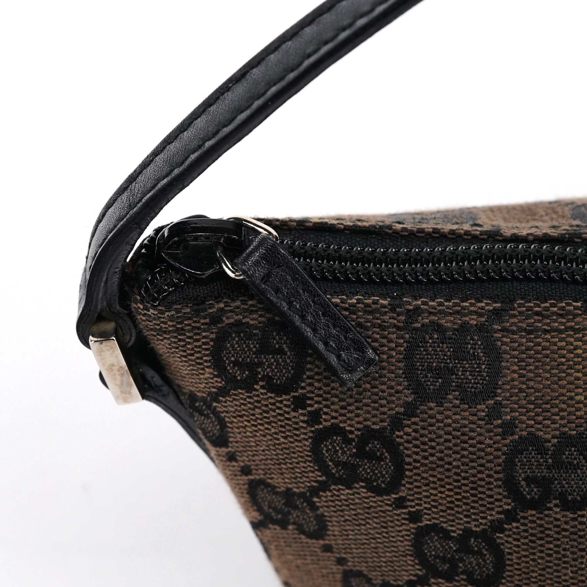 Designed in the late 1990s by Tom Ford, this Gucci boat pochette is crafted from brown GG canvas with black leather trim, finished with silver-tone hardware and a top zip closure.