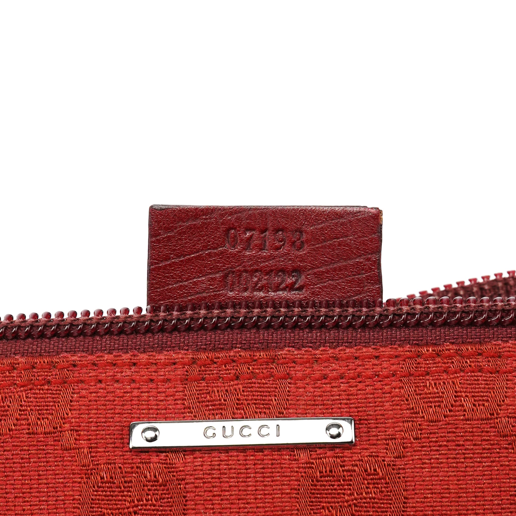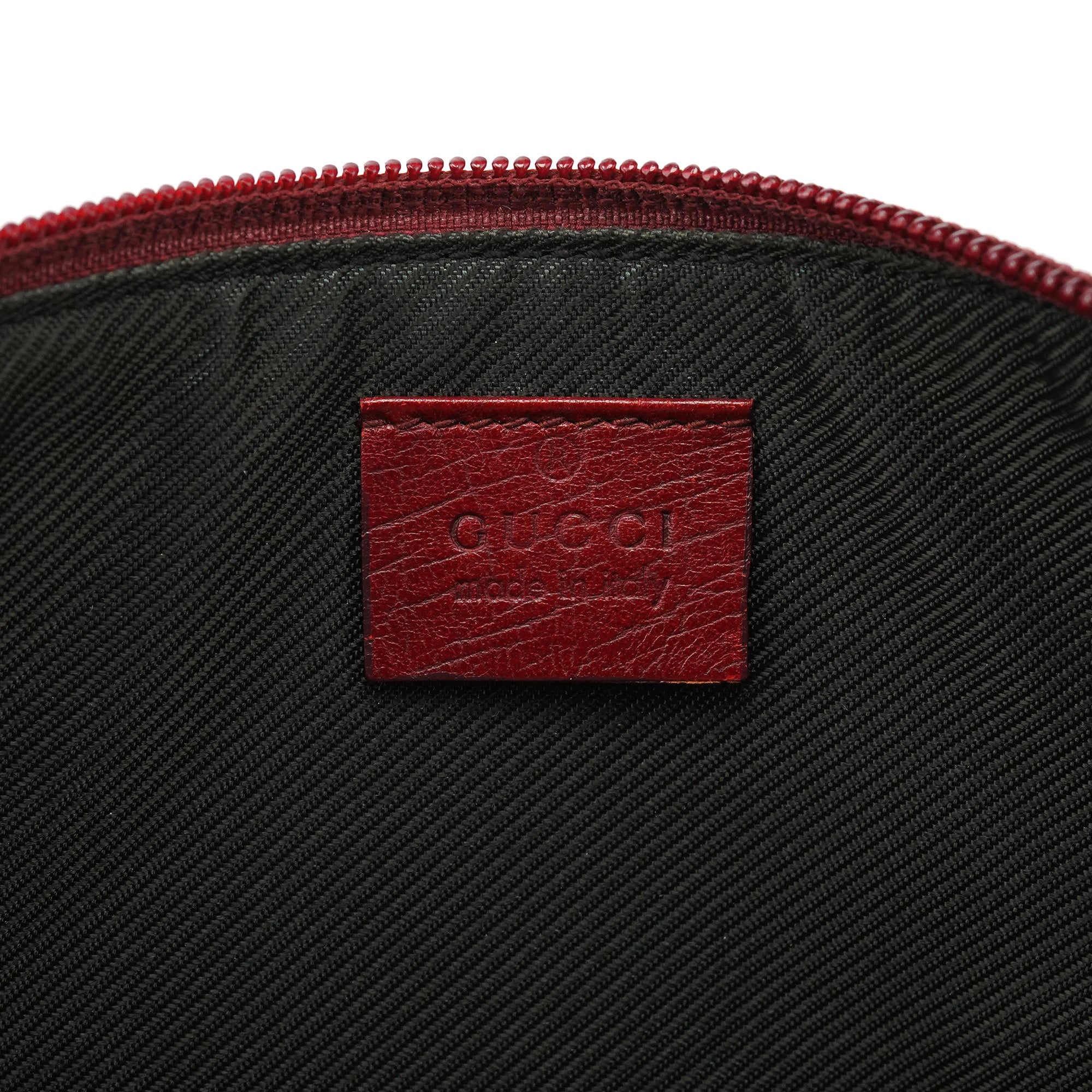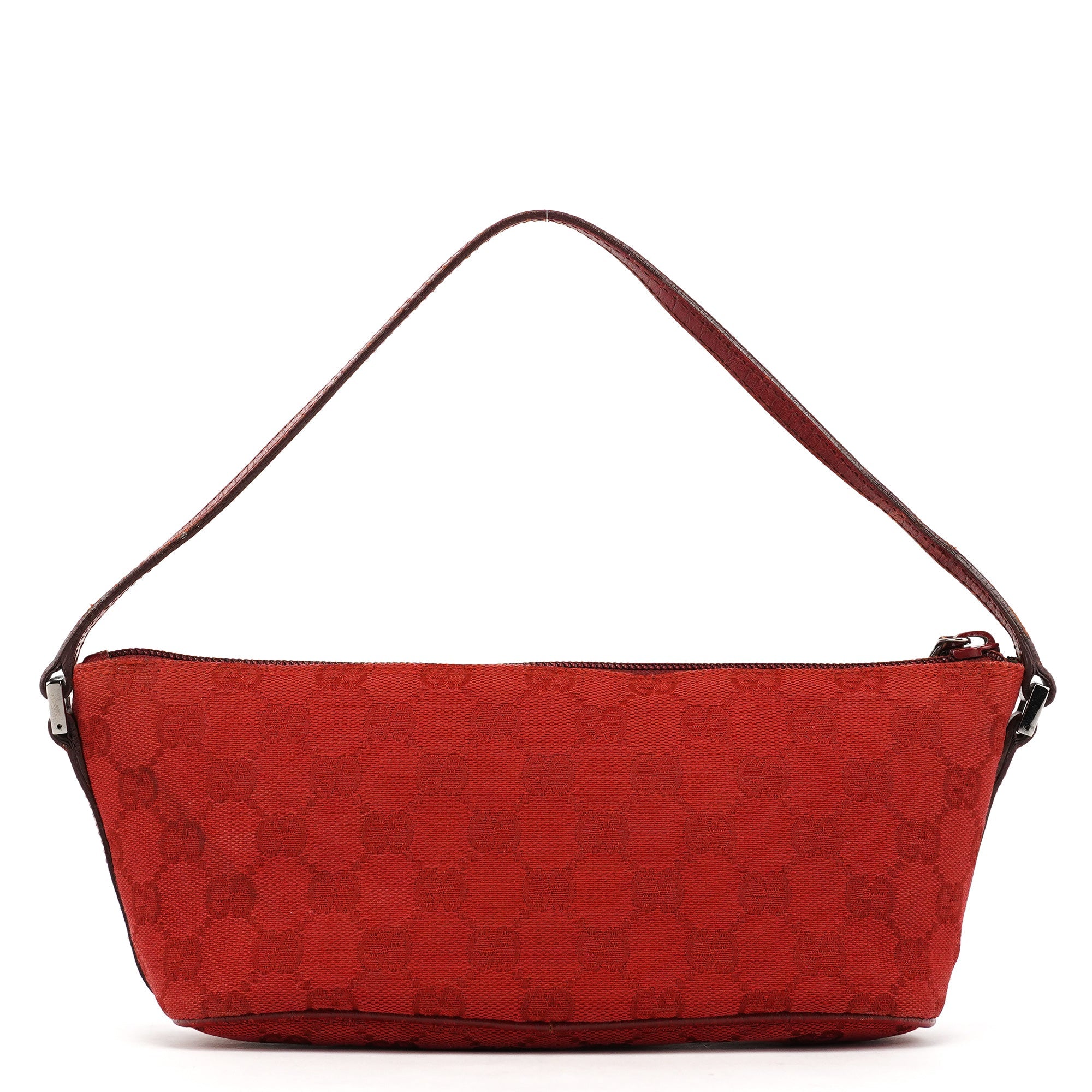Designed in the late 1990s by Tom Ford, this Gucci GG Boat Pochette is crafted from red GG canvas with tonal leather trim, finished with gold-tone hardware and a top zip closure opening to a satin-lined interior, completed by a discreet Gucci plaque.