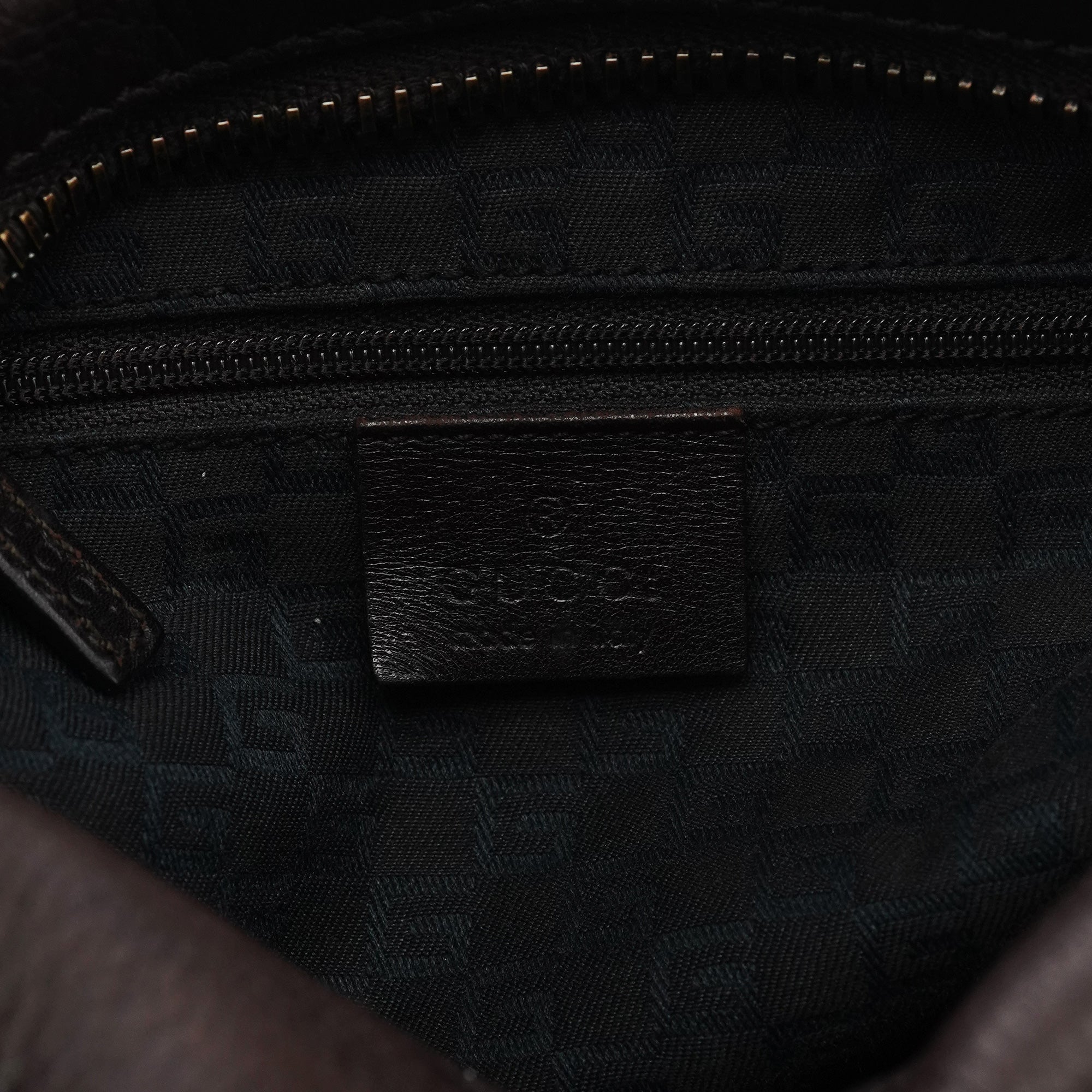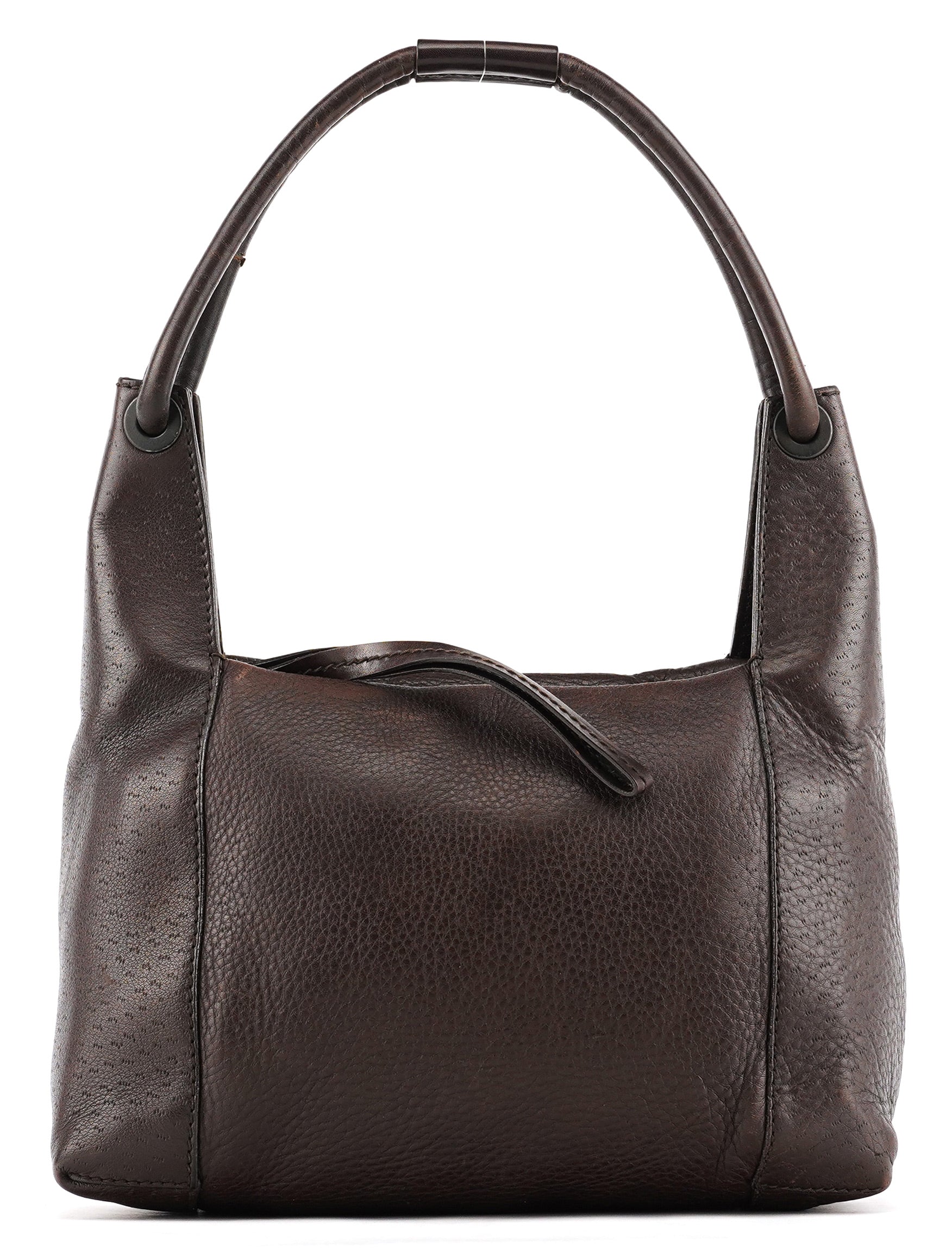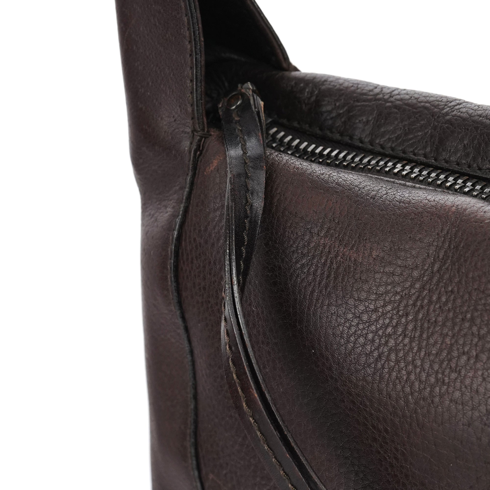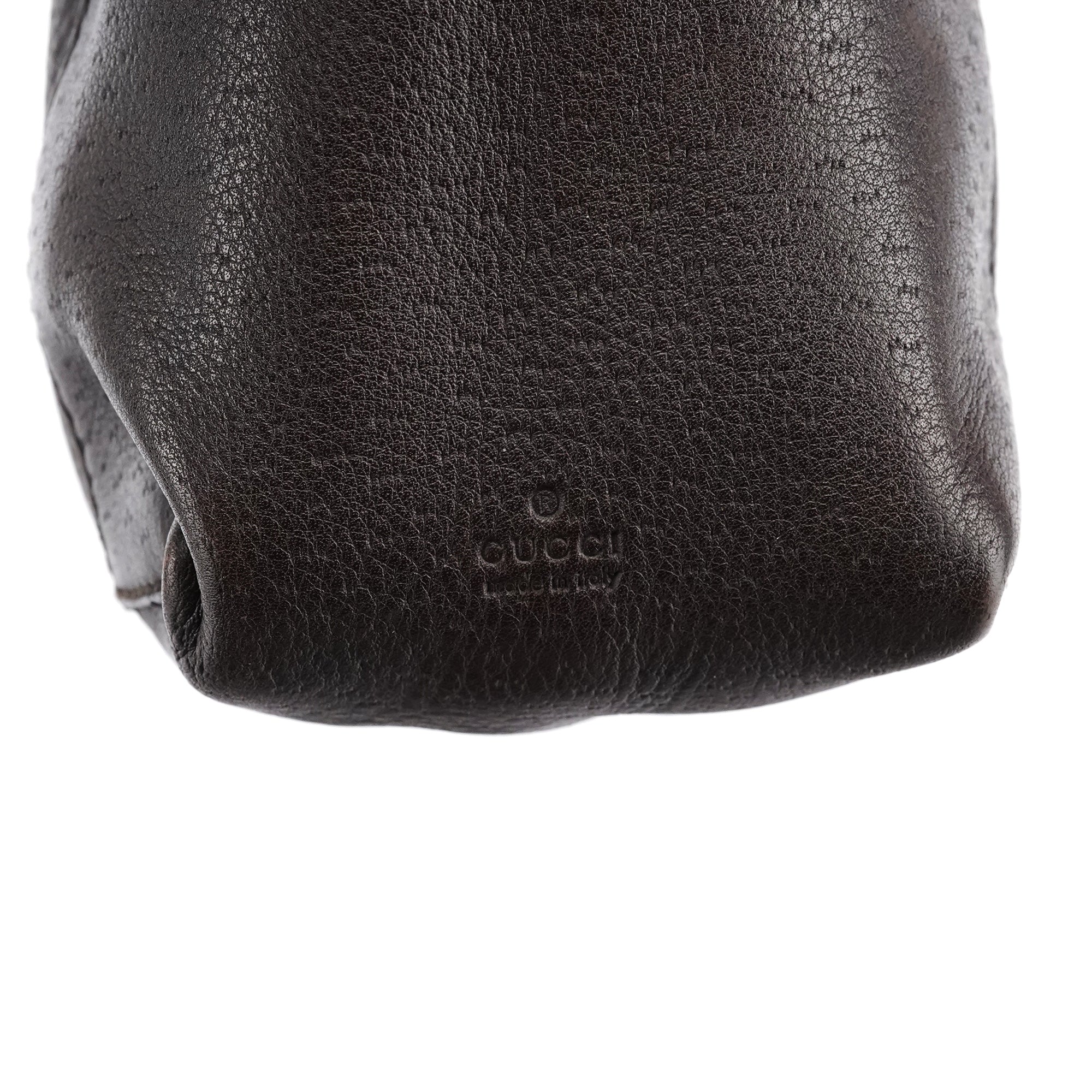 Designed in the early 2000s by Tom Ford, this Gucci shoulder hobo is made in supple dark brown leather with a curved silhouette and rounded top handle. Finished with subtle black hardware, a top-zip closure, and a monogram-lined interior with zip pocket.