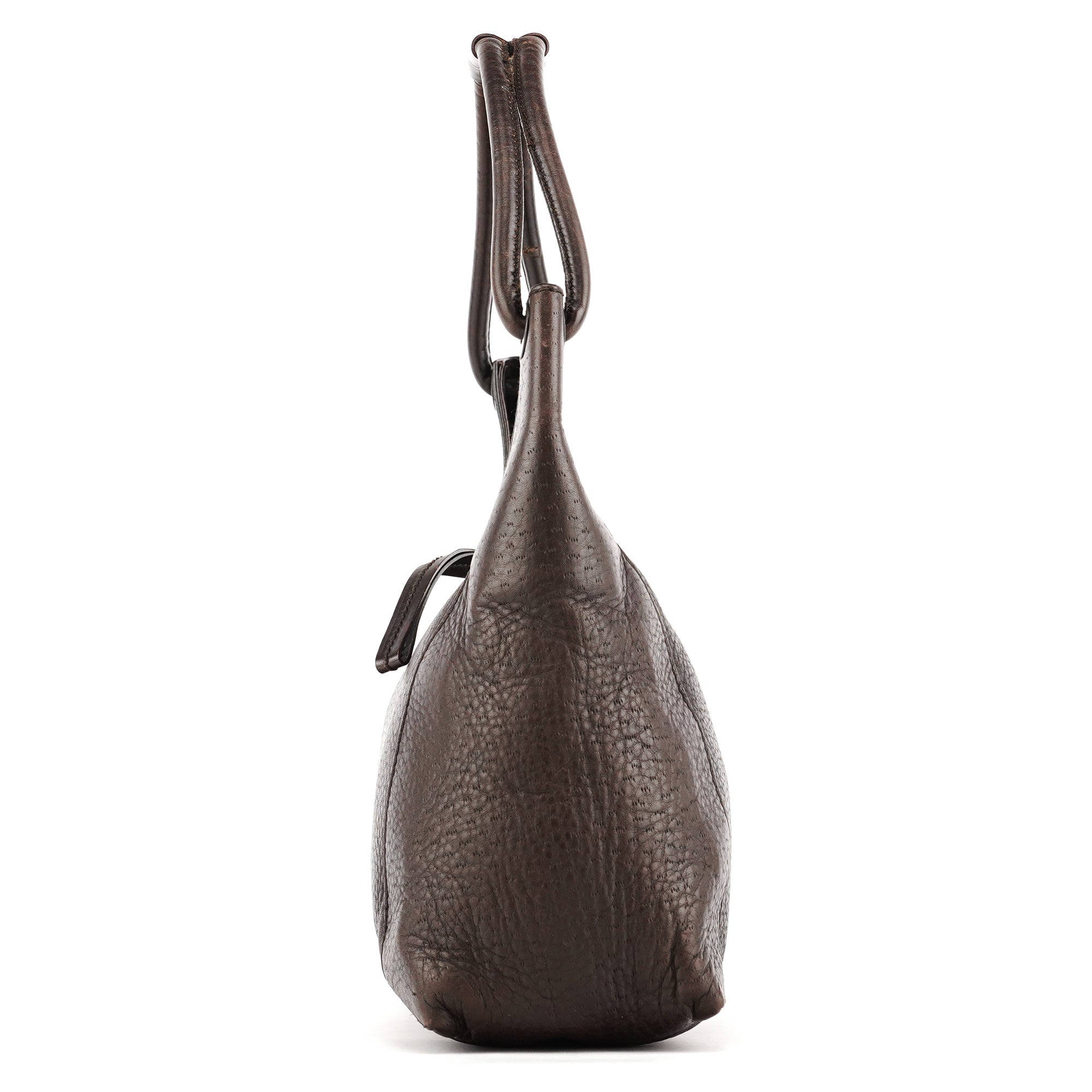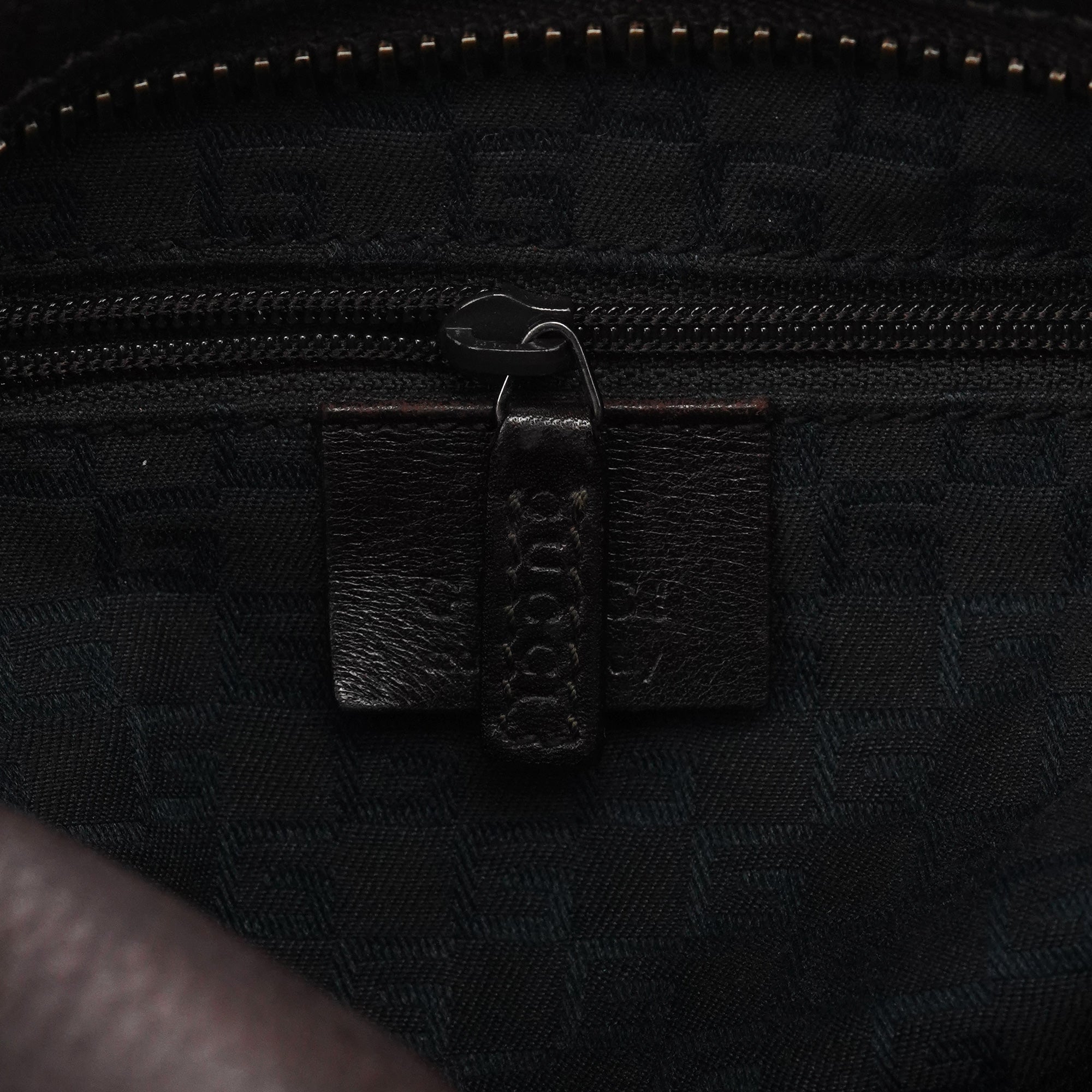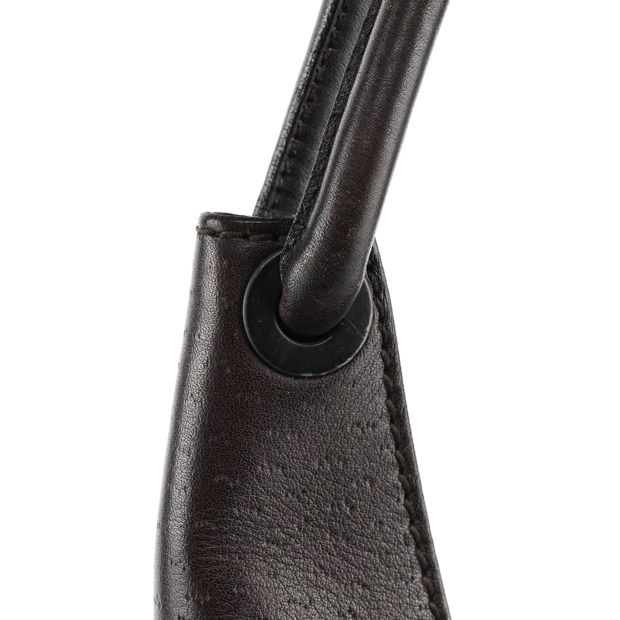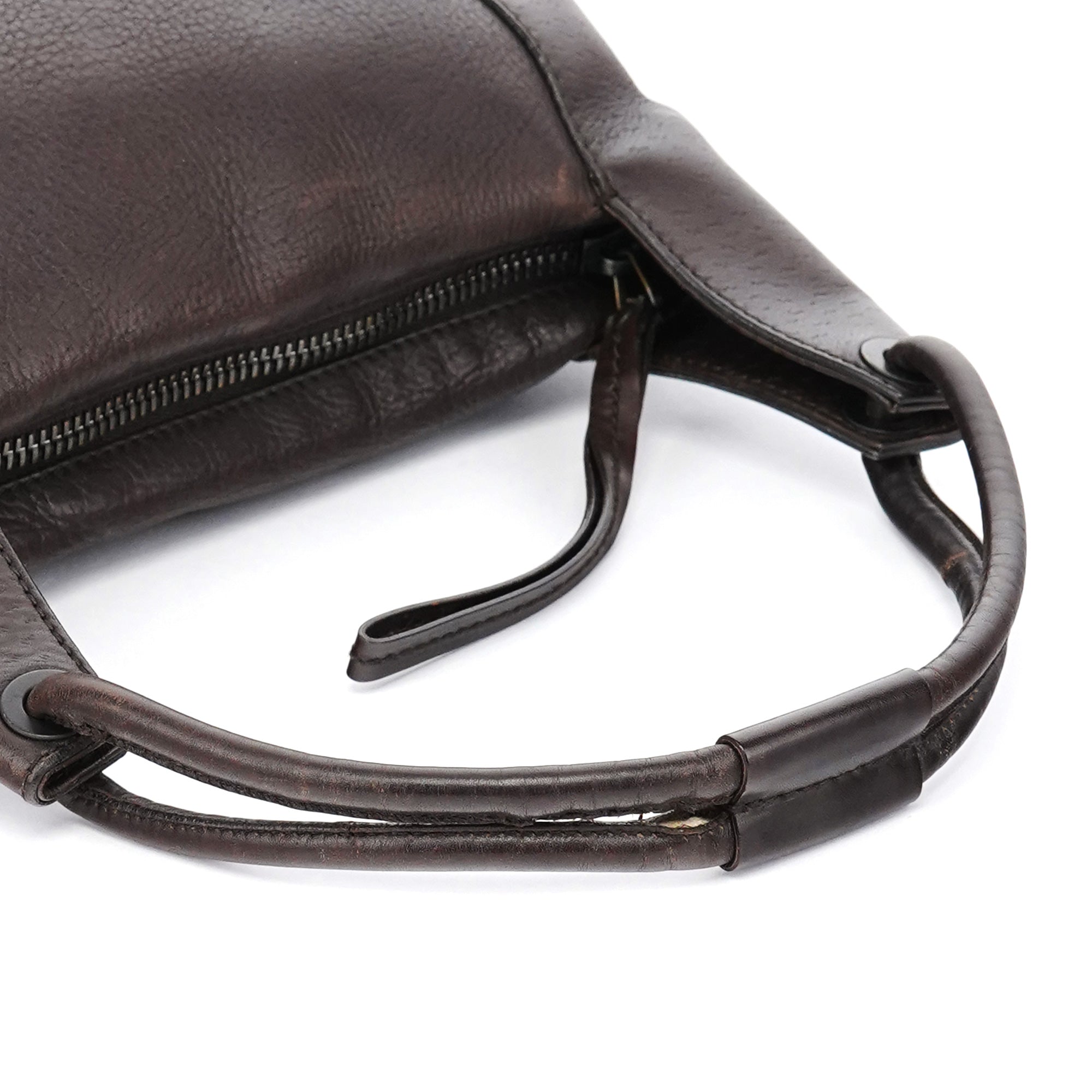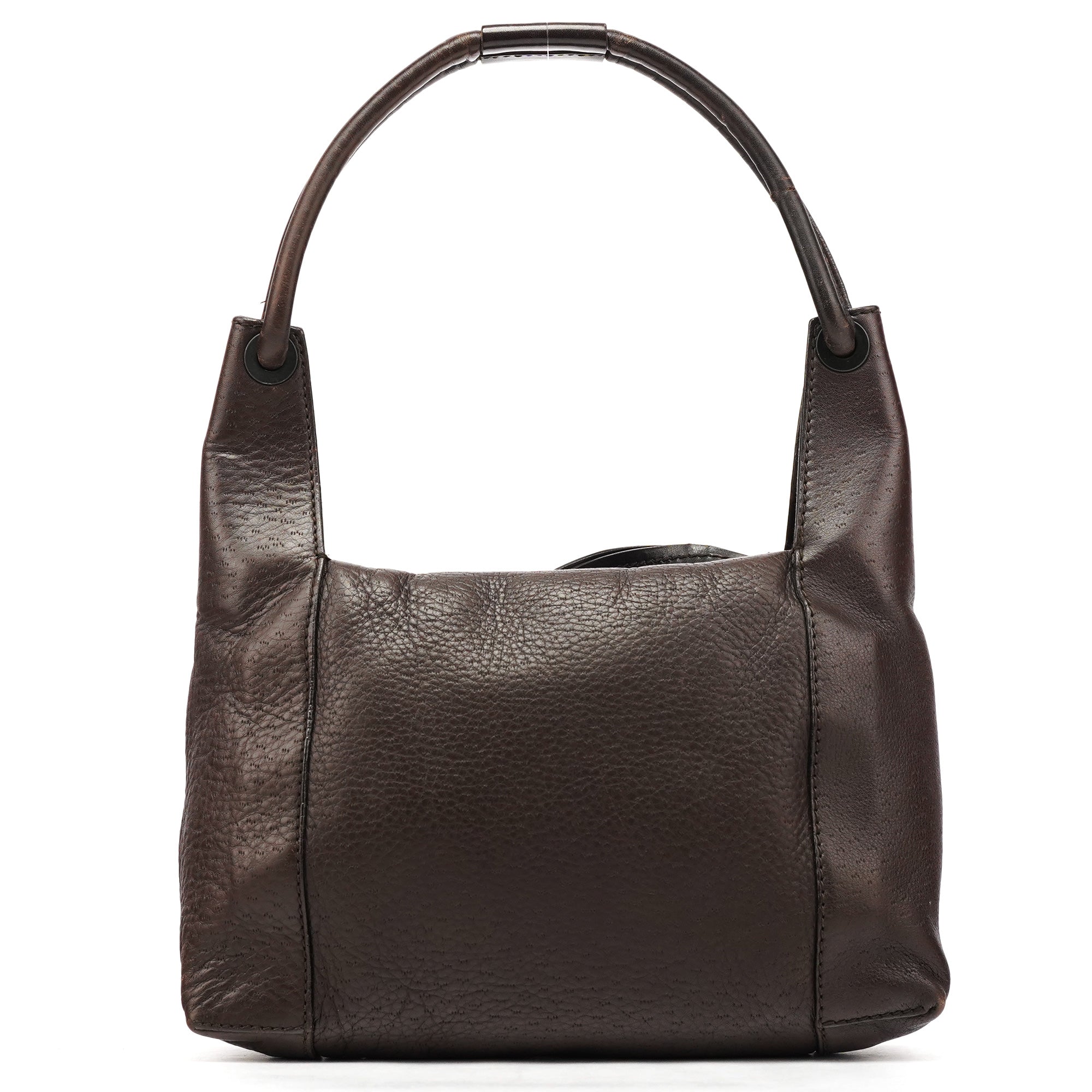 Designed in the early 2000s by Tom Ford, this Gucci shoulder hobo is made in supple dark brown leather with a curved silhouette and rounded top handle. Finished with subtle black hardware, a top-zip closure, and a monogram-lined interior with zip pocket.