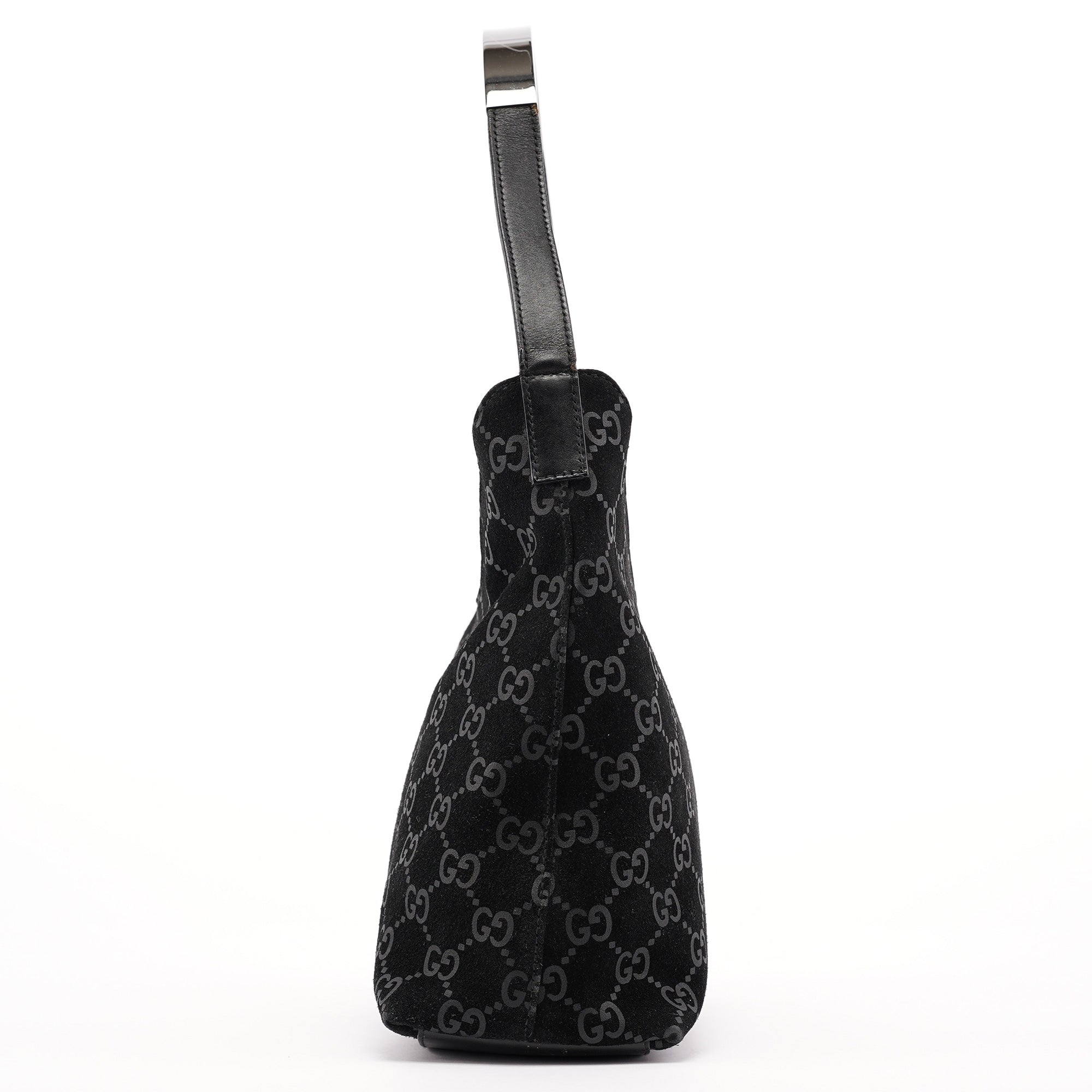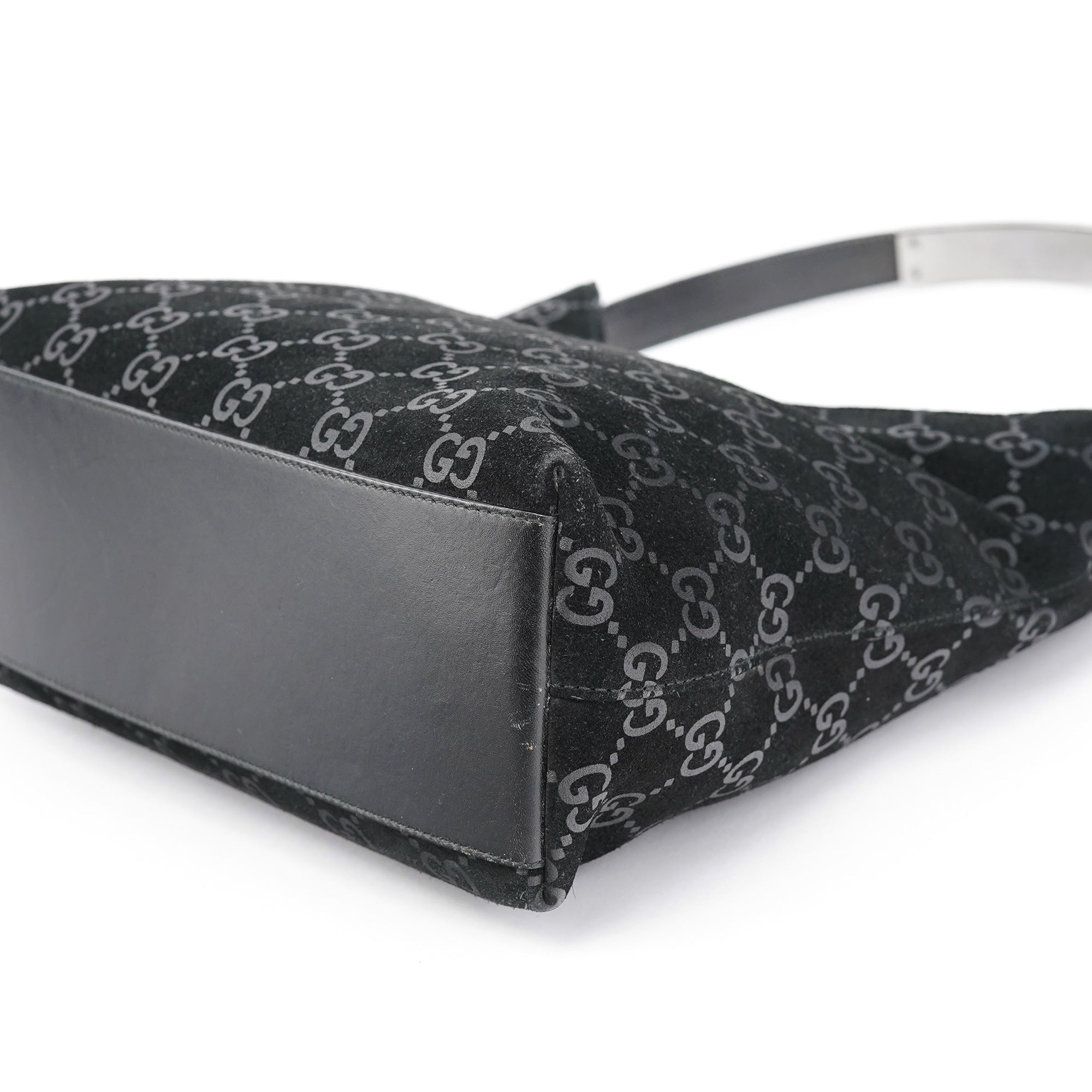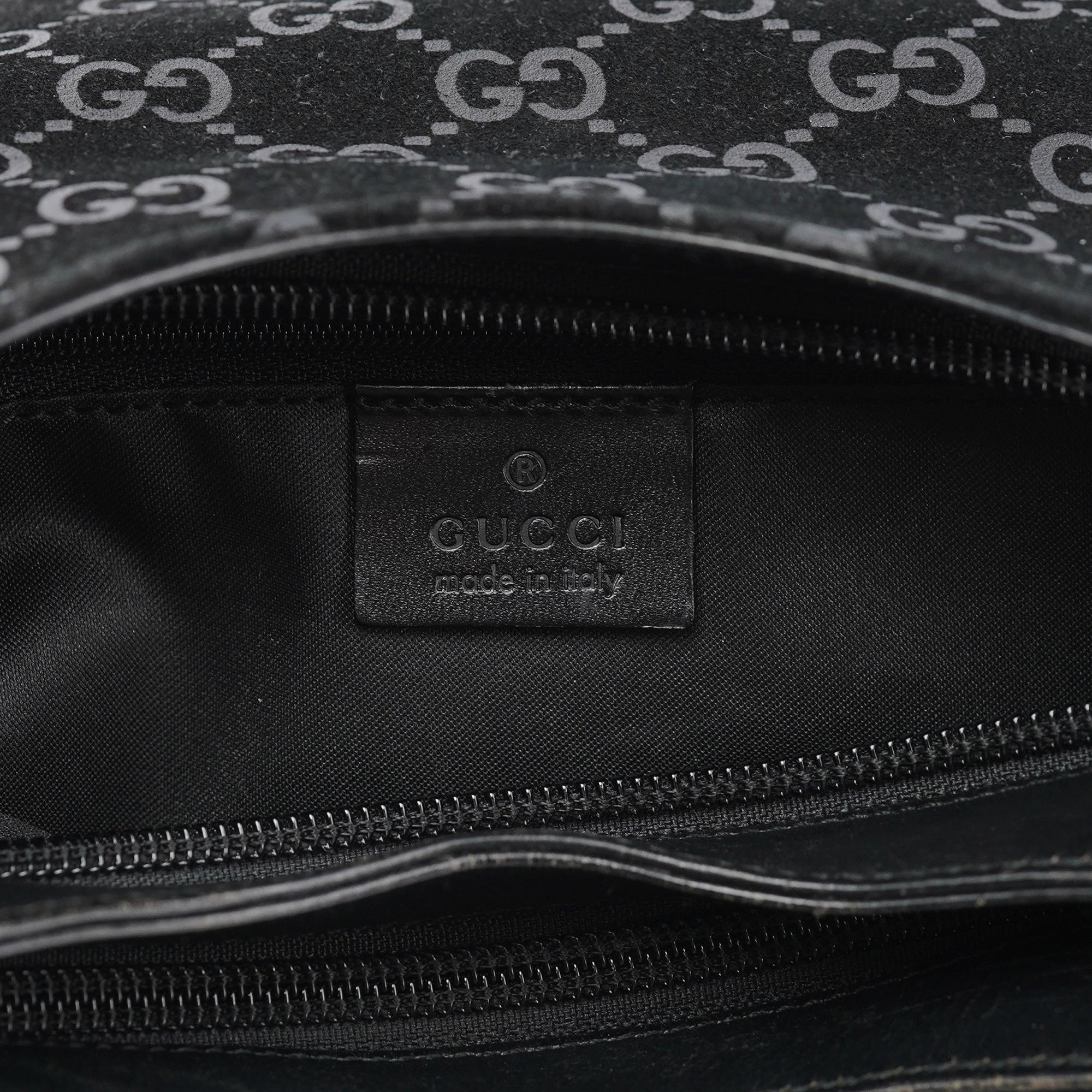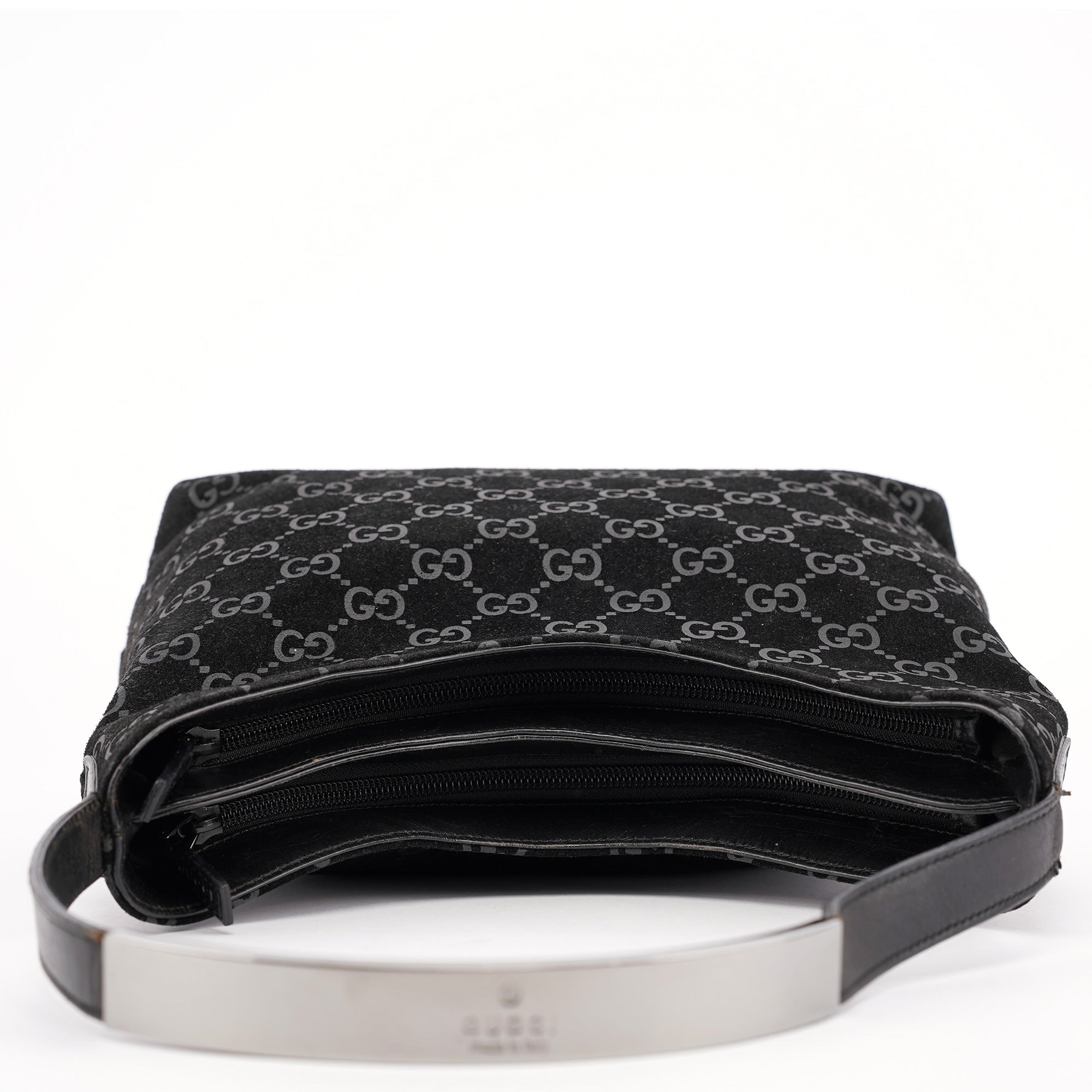 Designed in 1997 by Tom Ford, this Gucci shoulder bag is crafted in black GG monogram suede with tonal leather trim and a minimalist curved silhouette. It features dual zip-top compartments, silver-tone hardware, and a slim leather shoulder strap. The interior is lined in black canvas with one zipped pocket.