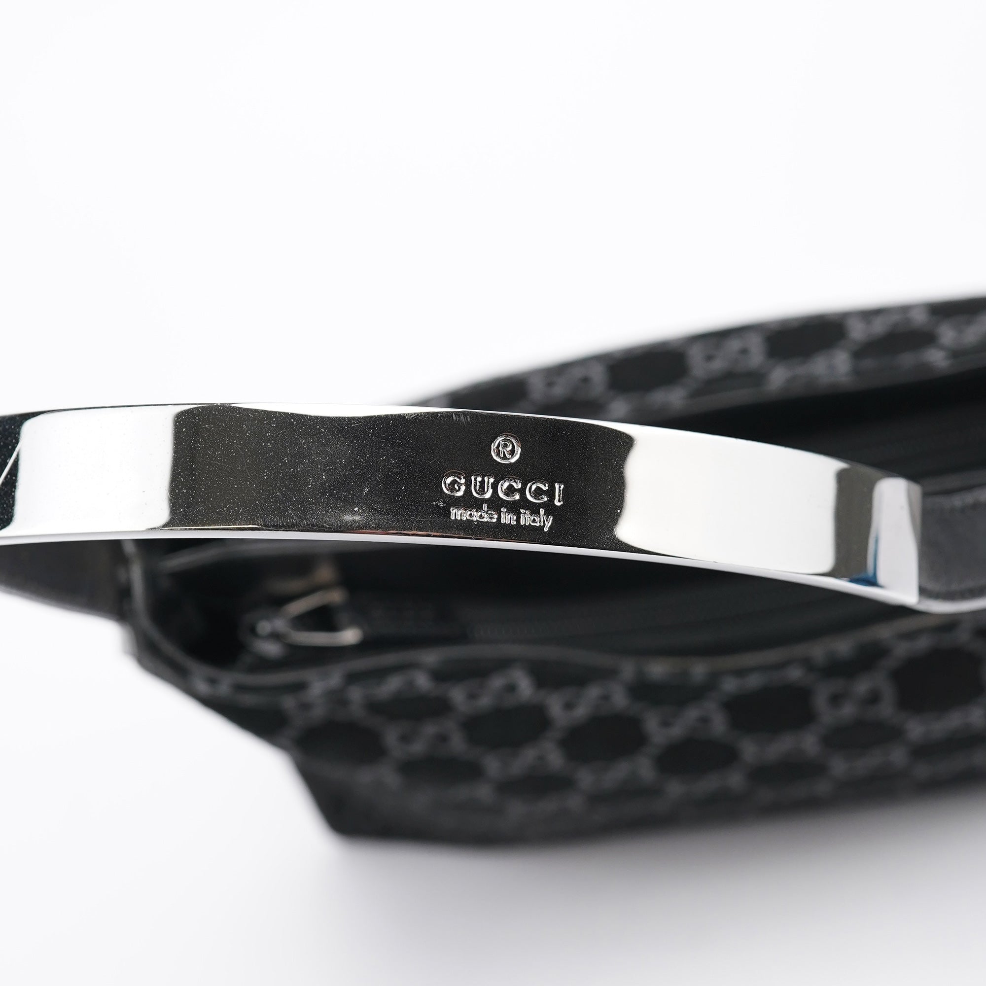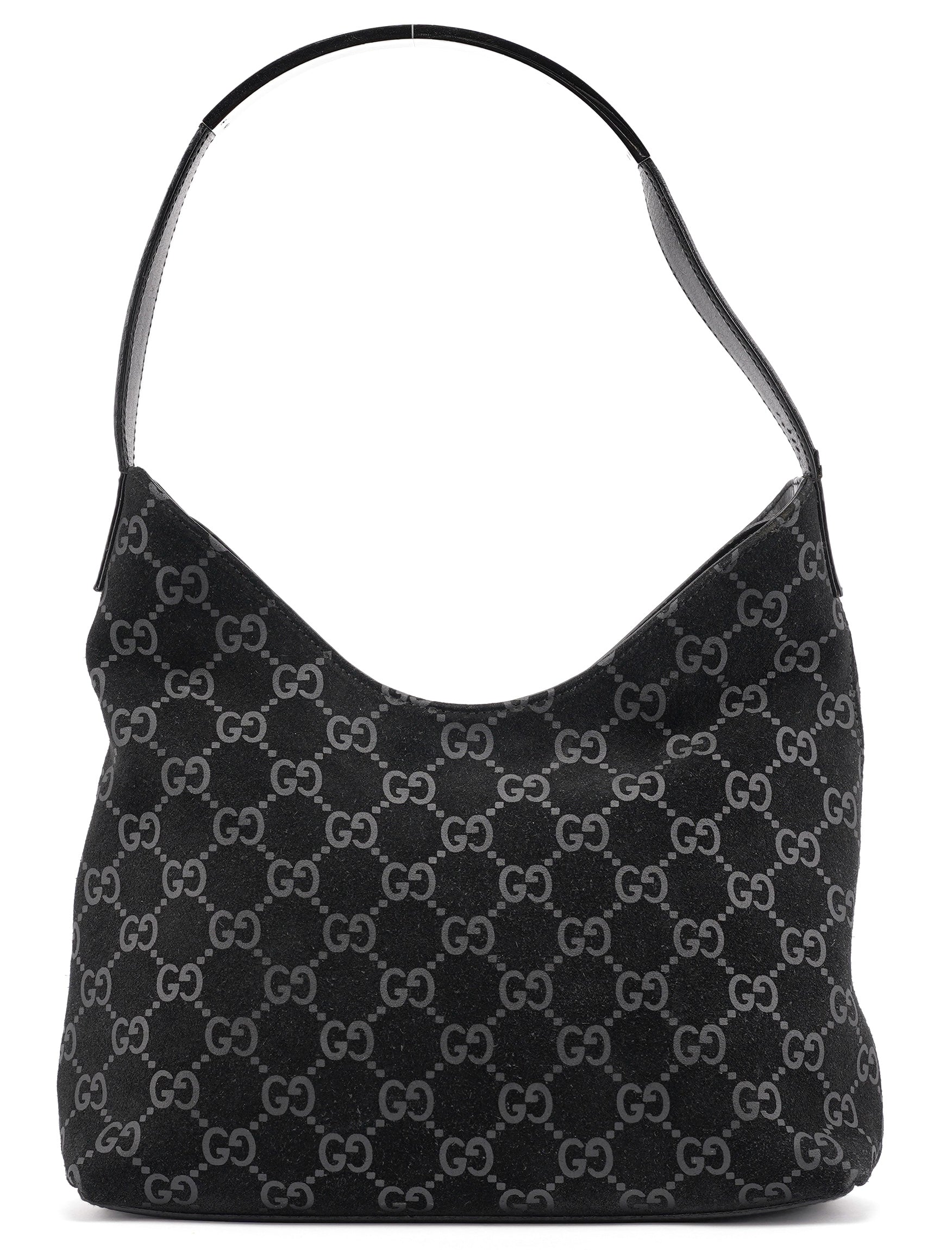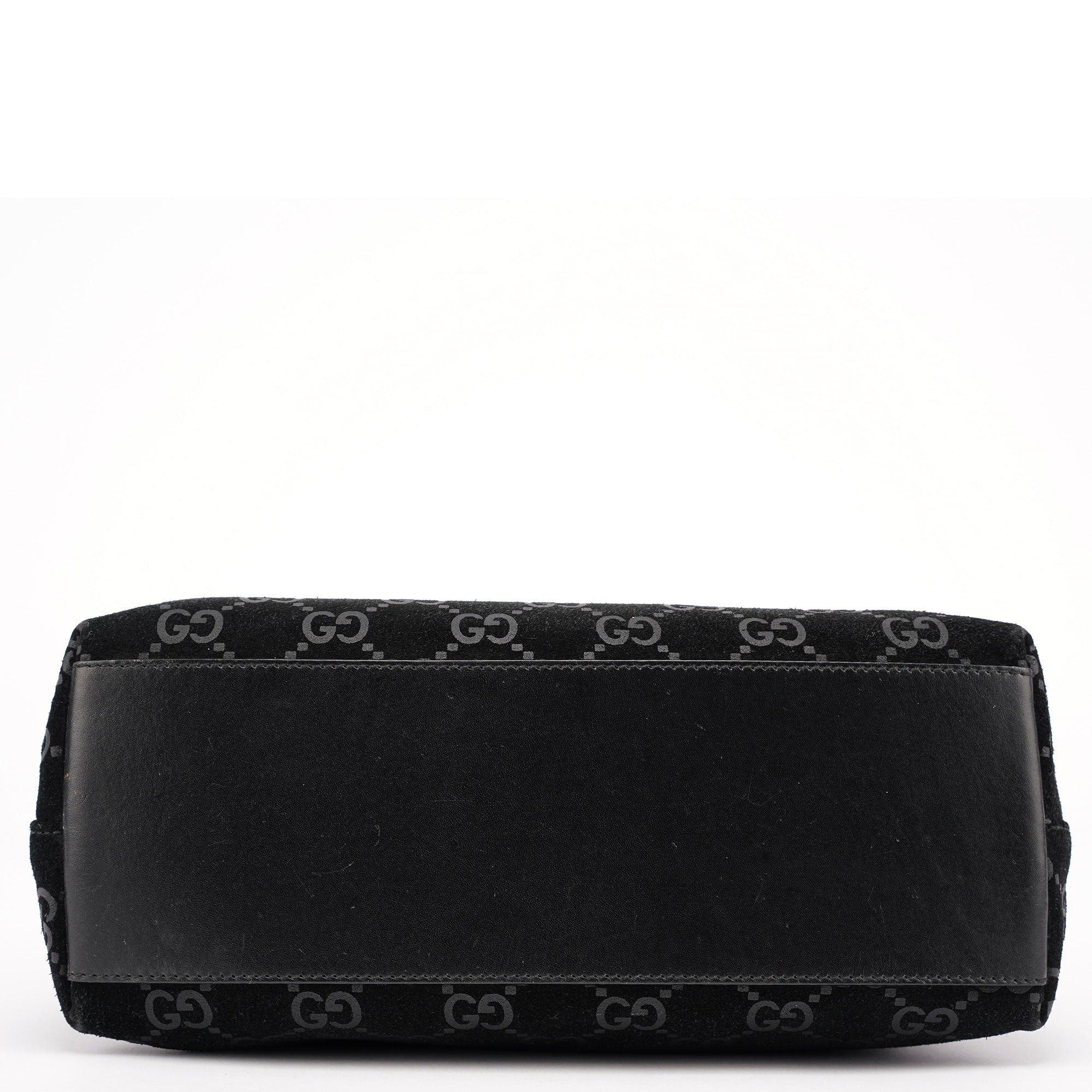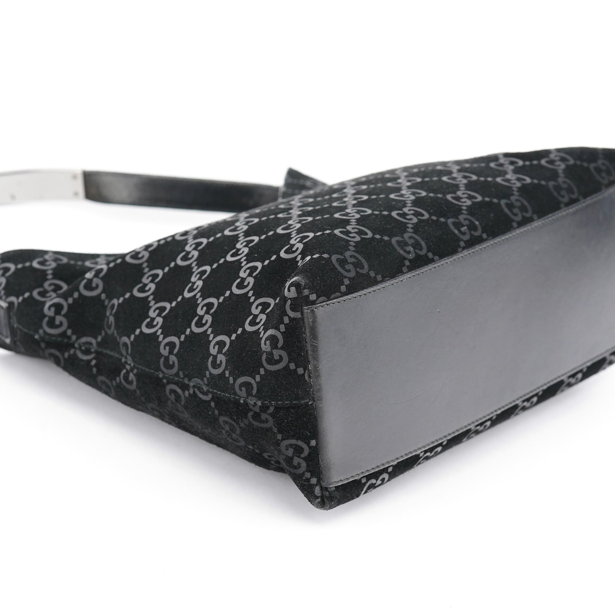 Designed in 1997 by Tom Ford, this Gucci shoulder bag is crafted in black GG monogram suede with tonal leather trim and a minimalist curved silhouette. It features dual zip-top compartments, silver-tone hardware, and a slim leather shoulder strap. The interior is lined in black canvas with one zipped pocket.