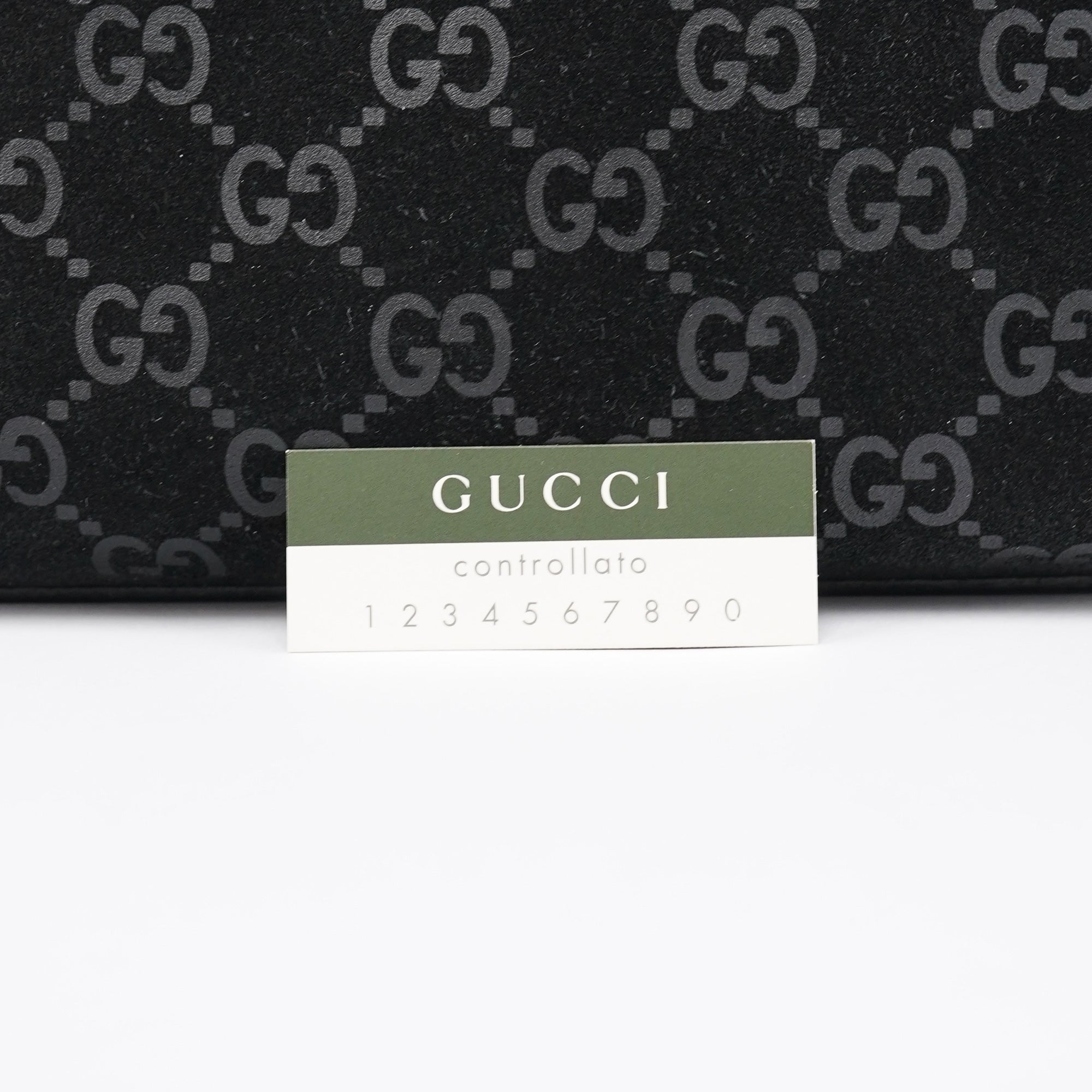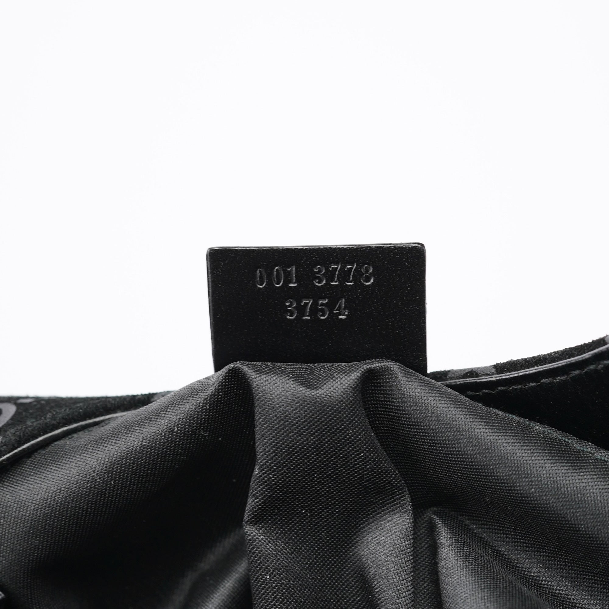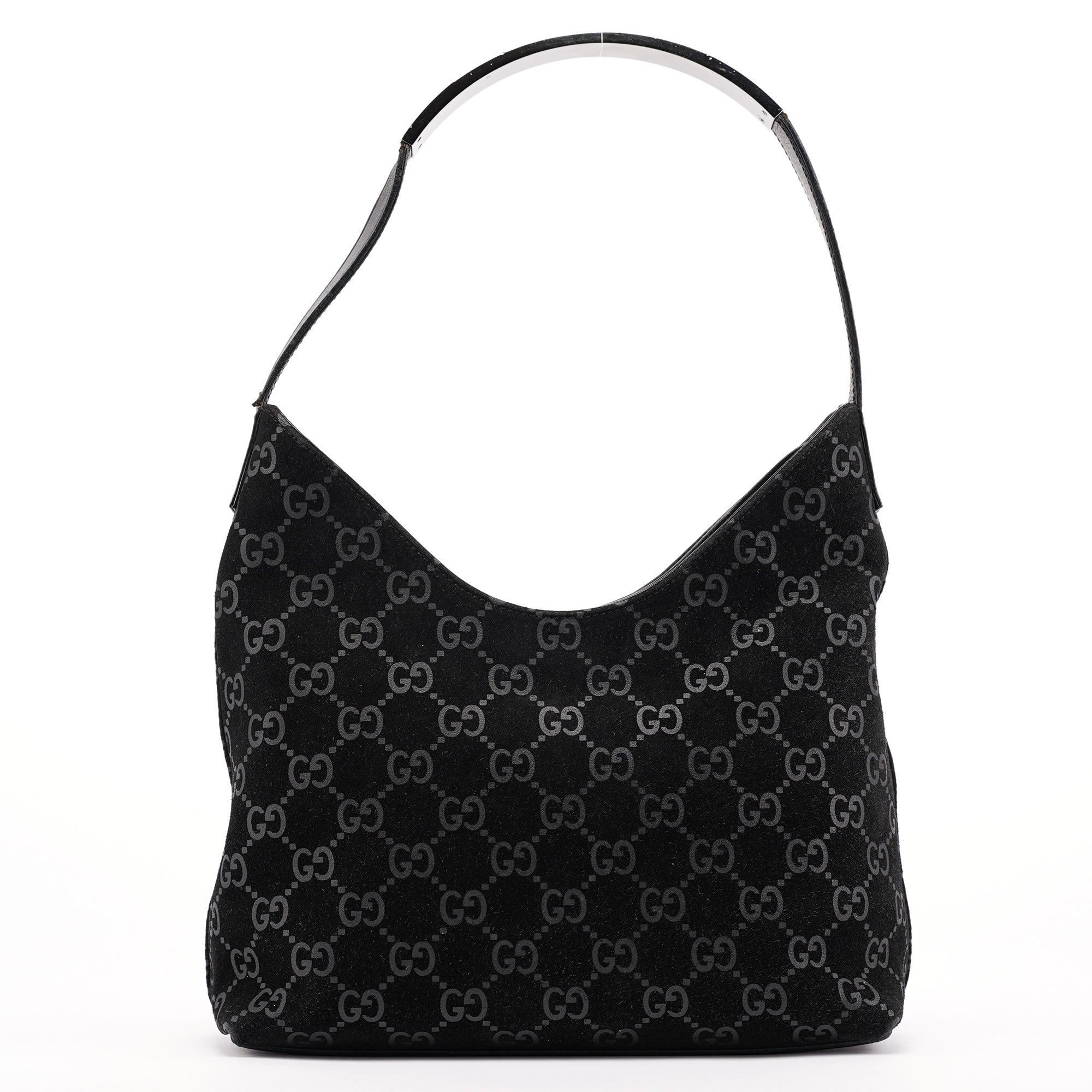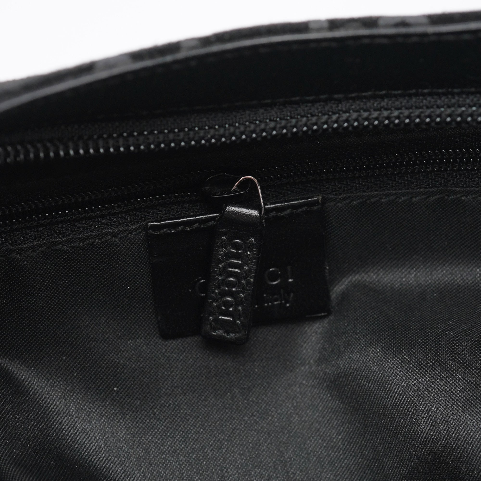 Designed in 1997 by Tom Ford, this Gucci shoulder bag is crafted in black GG monogram suede with tonal leather trim and a minimalist curved silhouette. It features dual zip-top compartments, silver-tone hardware, and a slim leather shoulder strap. The interior is lined in black canvas with one zipped pocket.