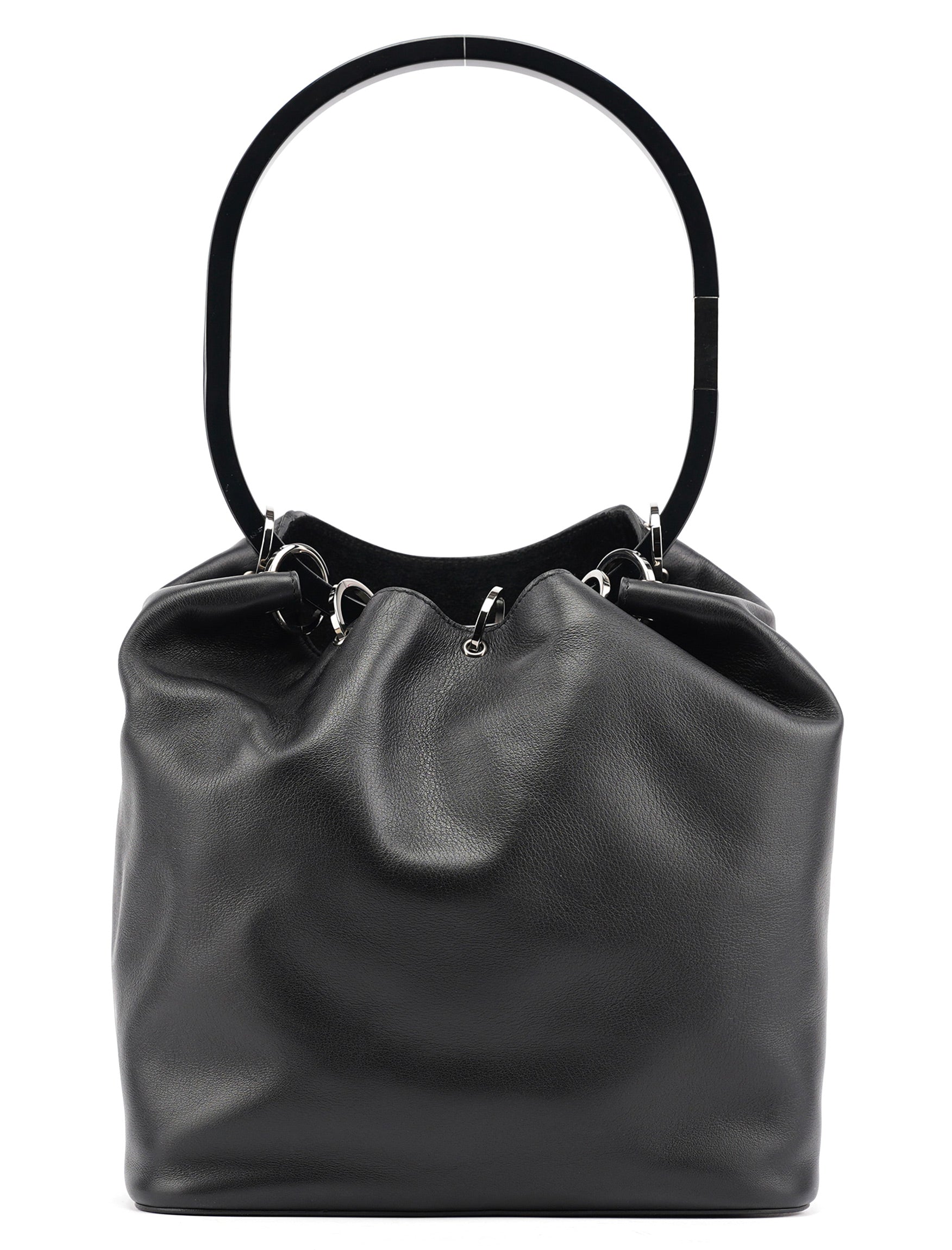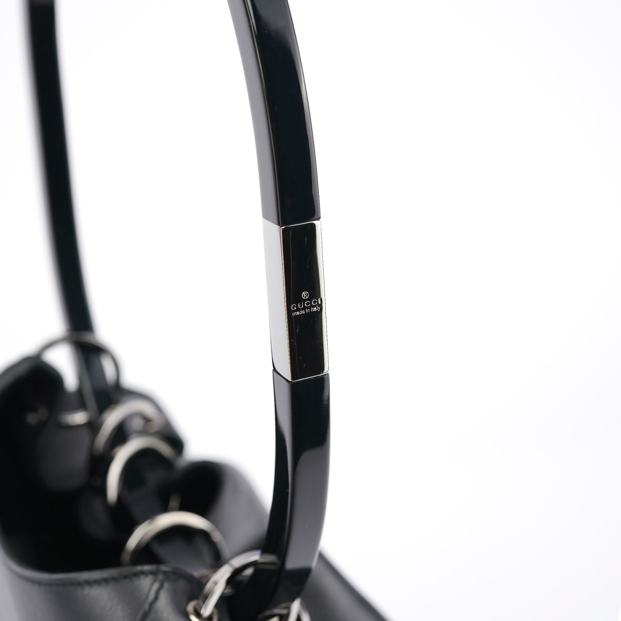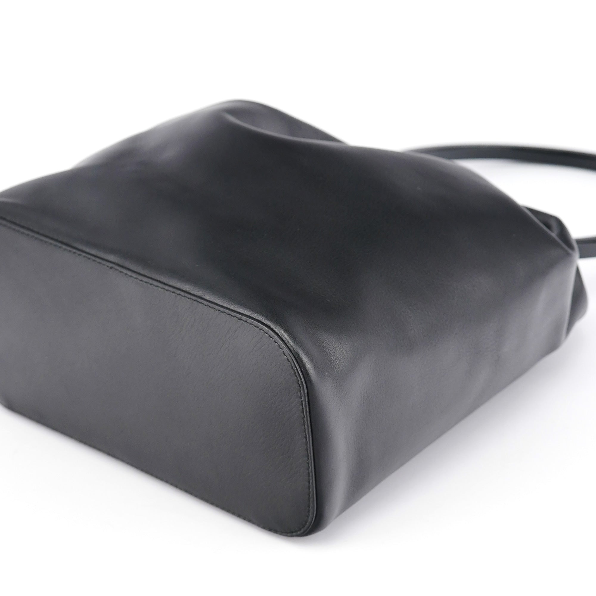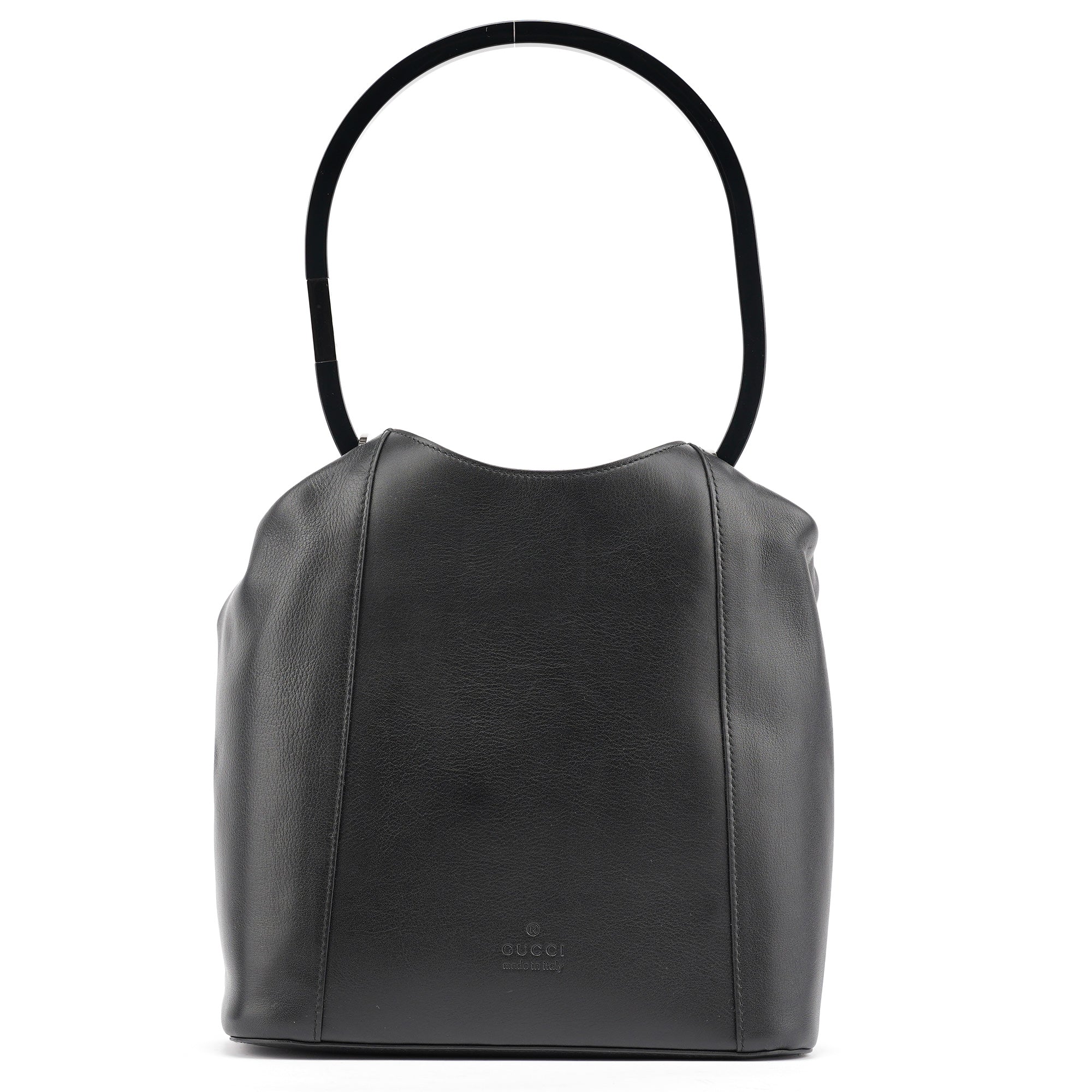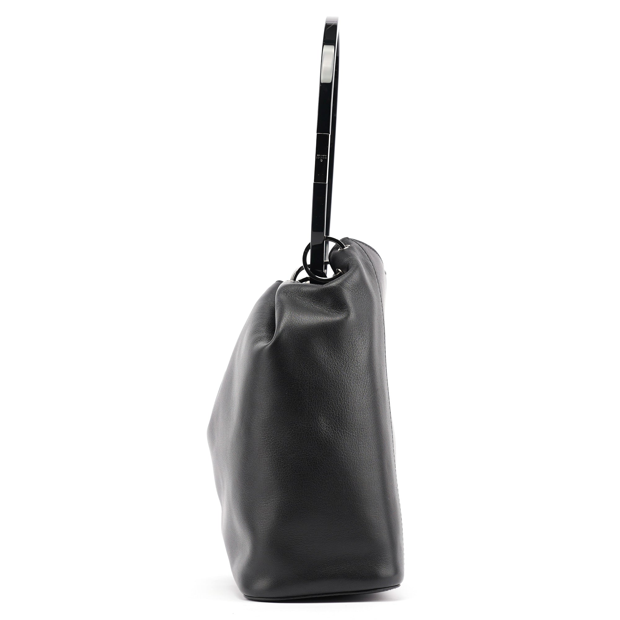 Designed in 1999 by Tom Ford, this vintage Gucci Loop shoulder bag showcases the sleek minimalism that defined Ford's revolutionary tenure at Gucci. Crafted in smooth black calfskin leather, the bag features a distinctive oval loop handle with silver-tone hardware accent, a drawstring closure system, and a structured yet soft silhouette. The interior is lined in black fabric with a zip pocket for organization.
