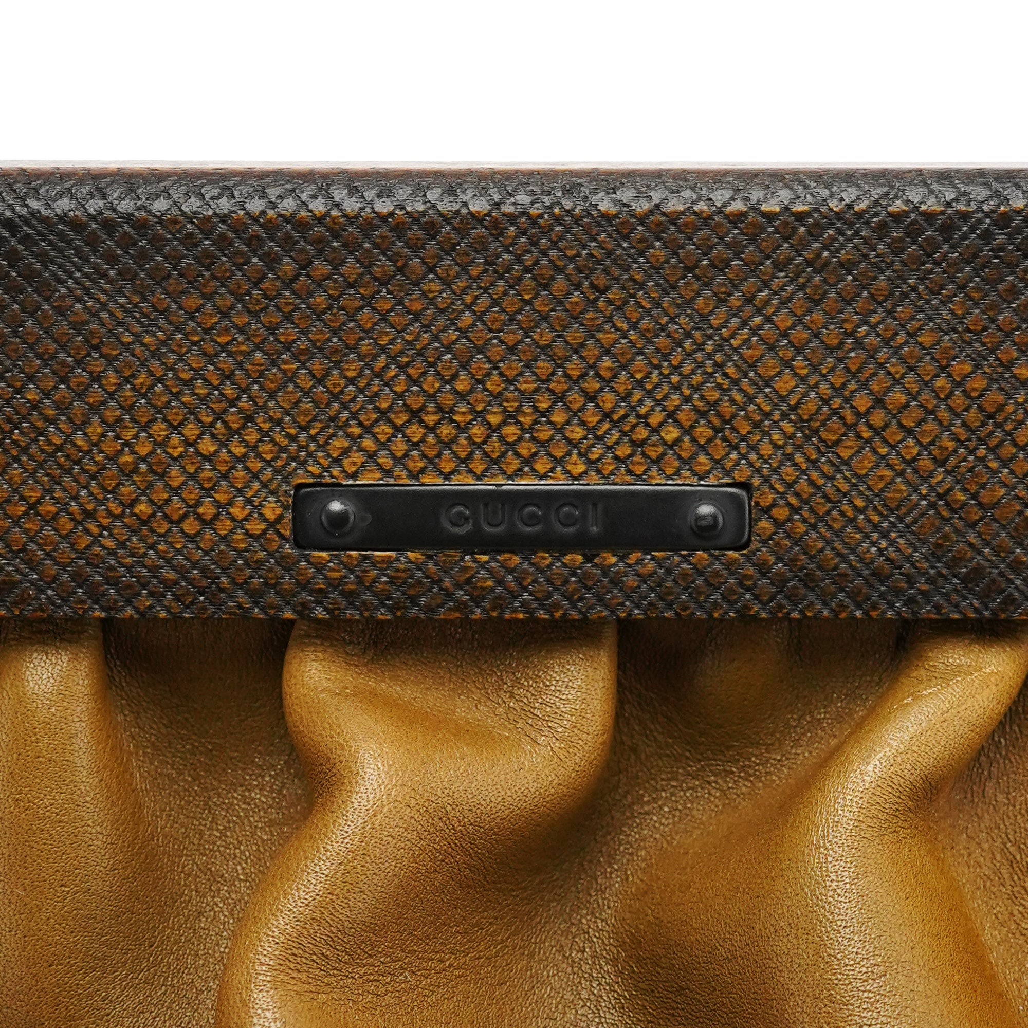Designed in 2002 by Tom Ford, this Gucci runway bag is crafted in brown gradient calfskin with sculptural wooden handles and blackened hardware. Finished with a belt-style flap closure, it reflects the era’s sensual, architectural approach to accessories.