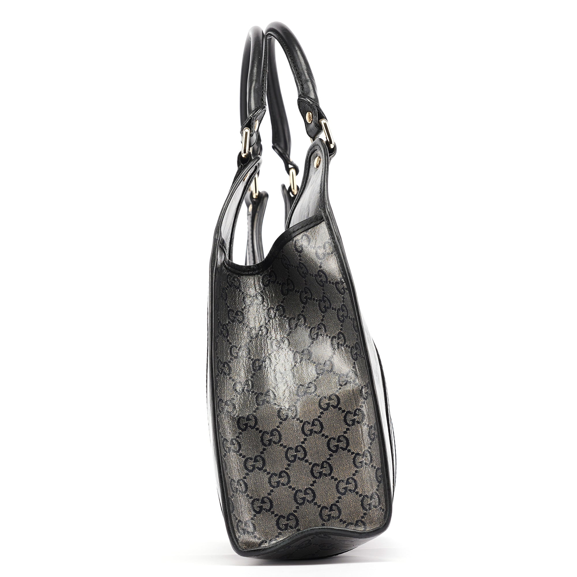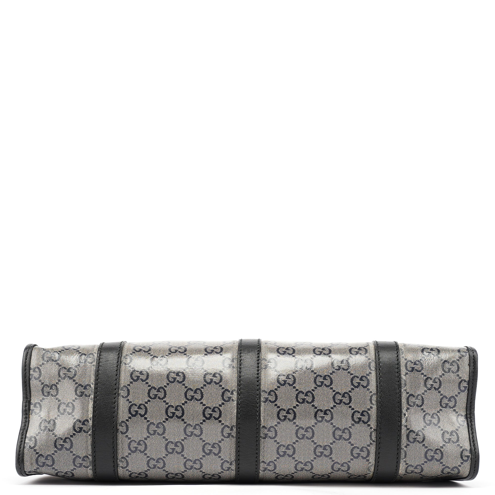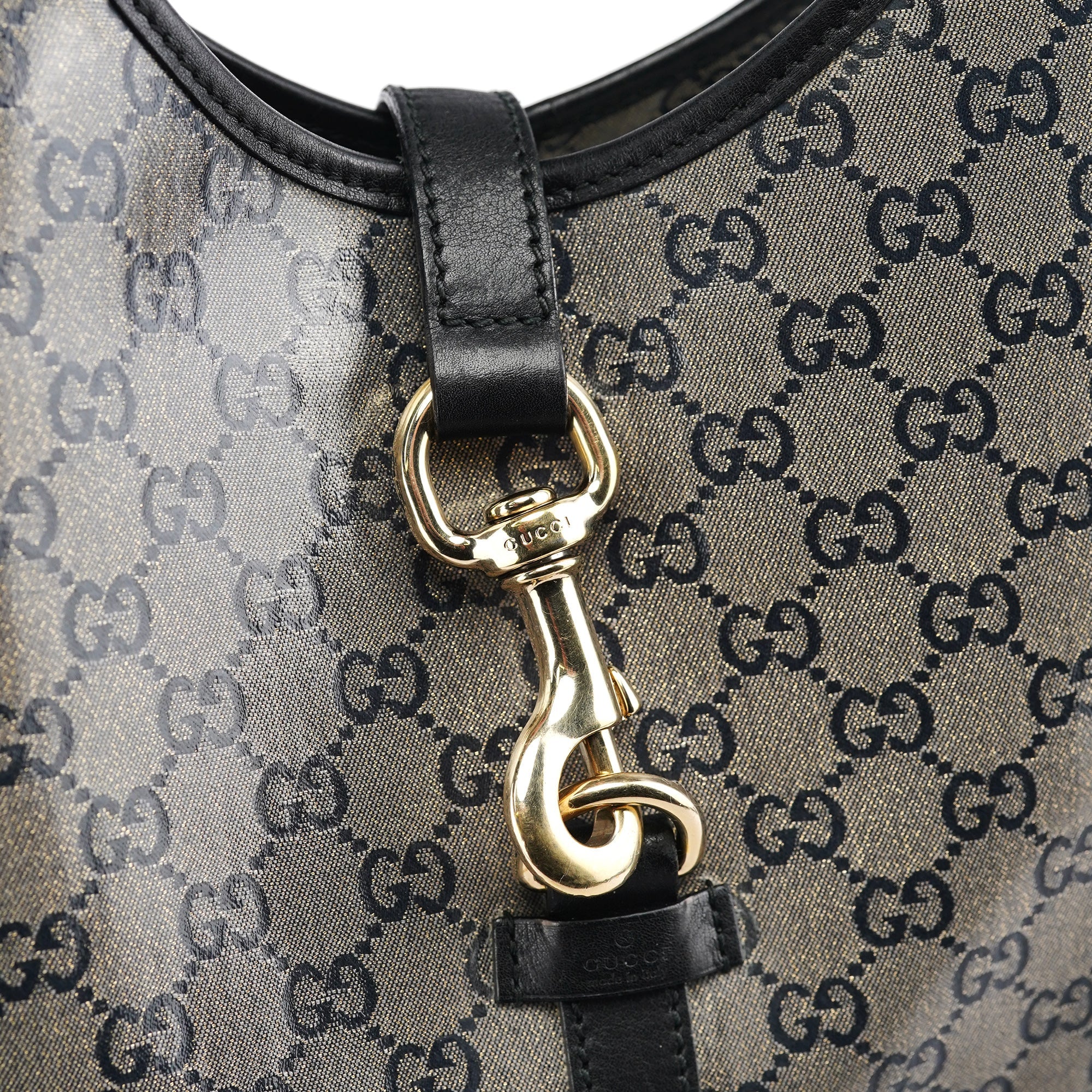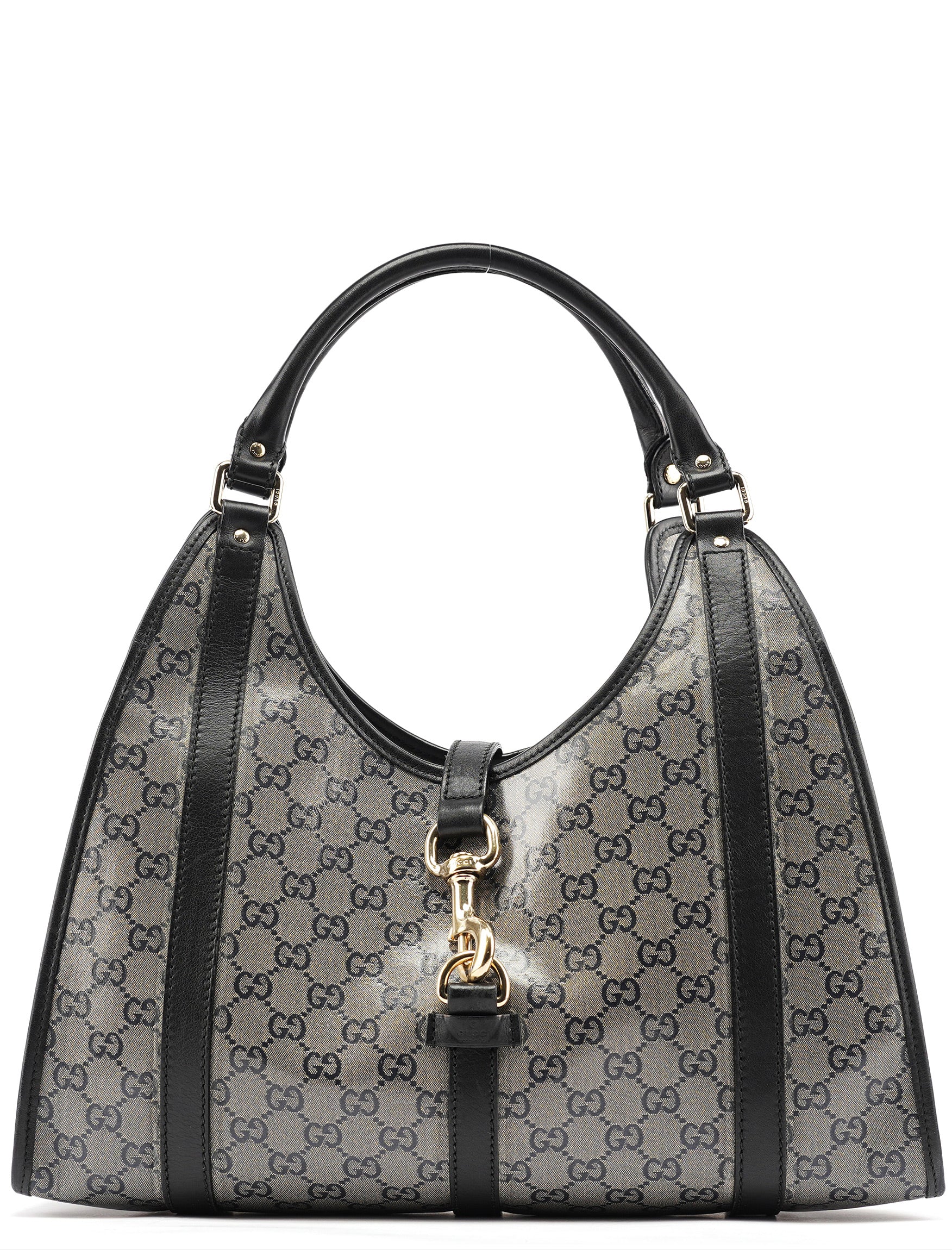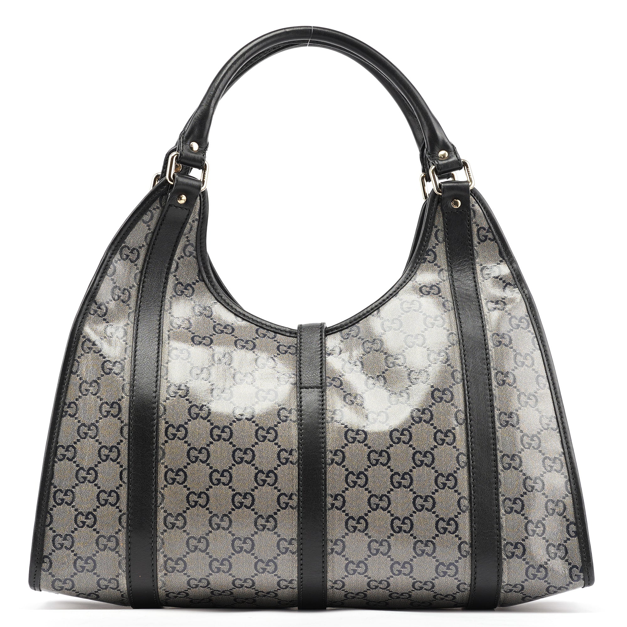 Designed in the early 2000s by Tom Ford, this vintage large Gucci Jackie shoulder bag features the iconic GG coated canvas that defined Ford's glamorous vision for the house. Rendered in beige GG crystal-coated canvas with black leather trim, the bag showcases the classic Jackie hobo silhouette with its signature piston closure detail in gold-tone hardware. The structured handles and spacious interior lined in fabric complete this sophisticated design.