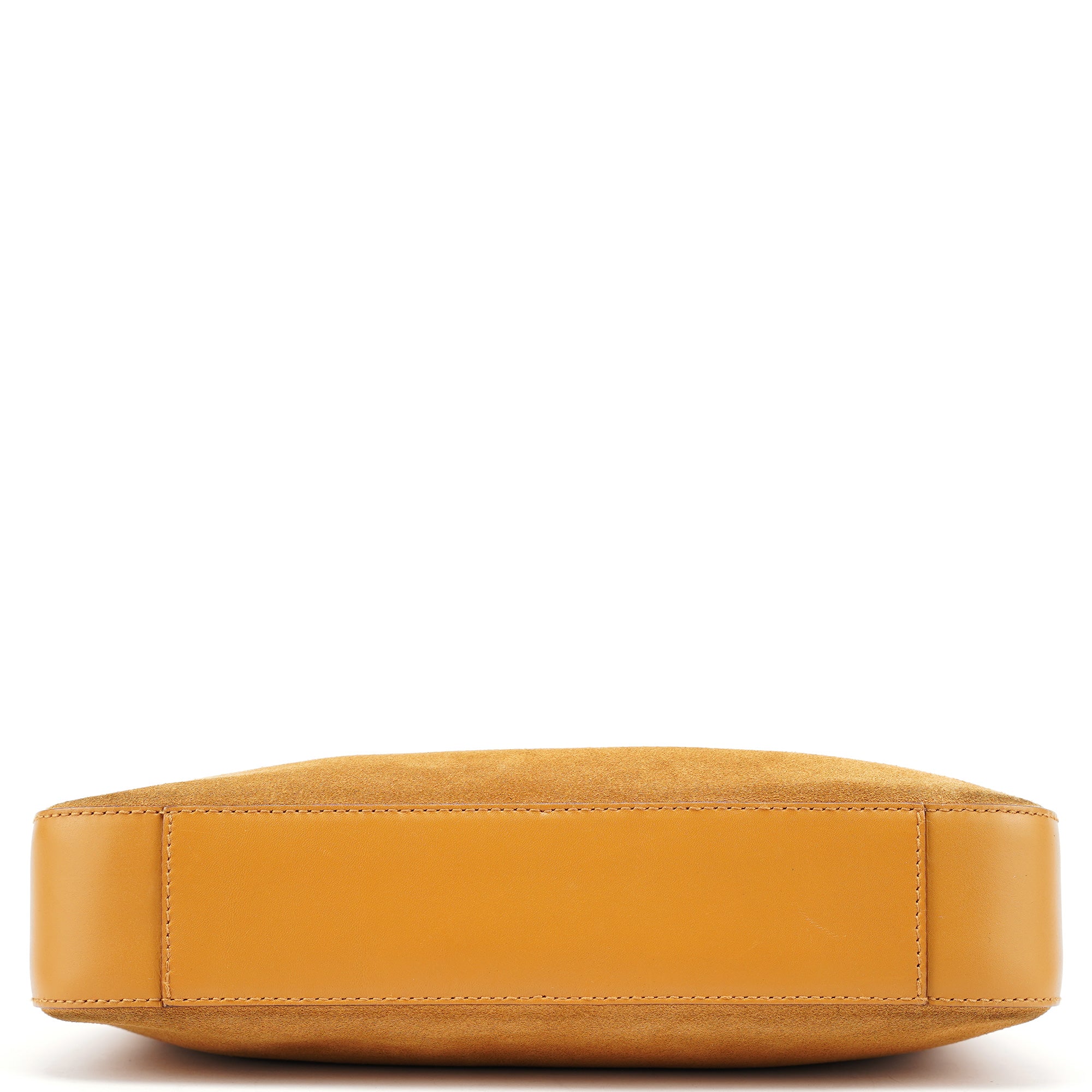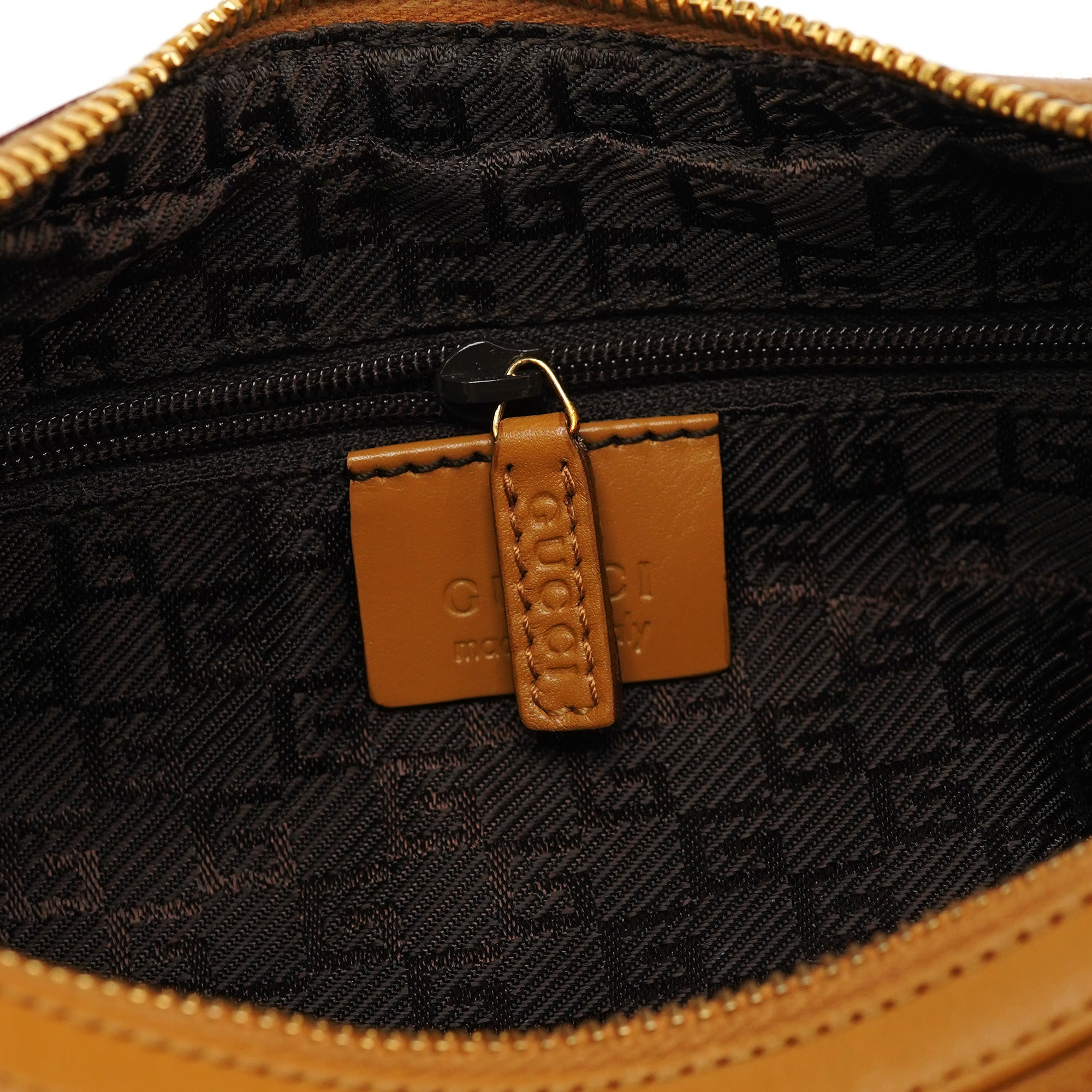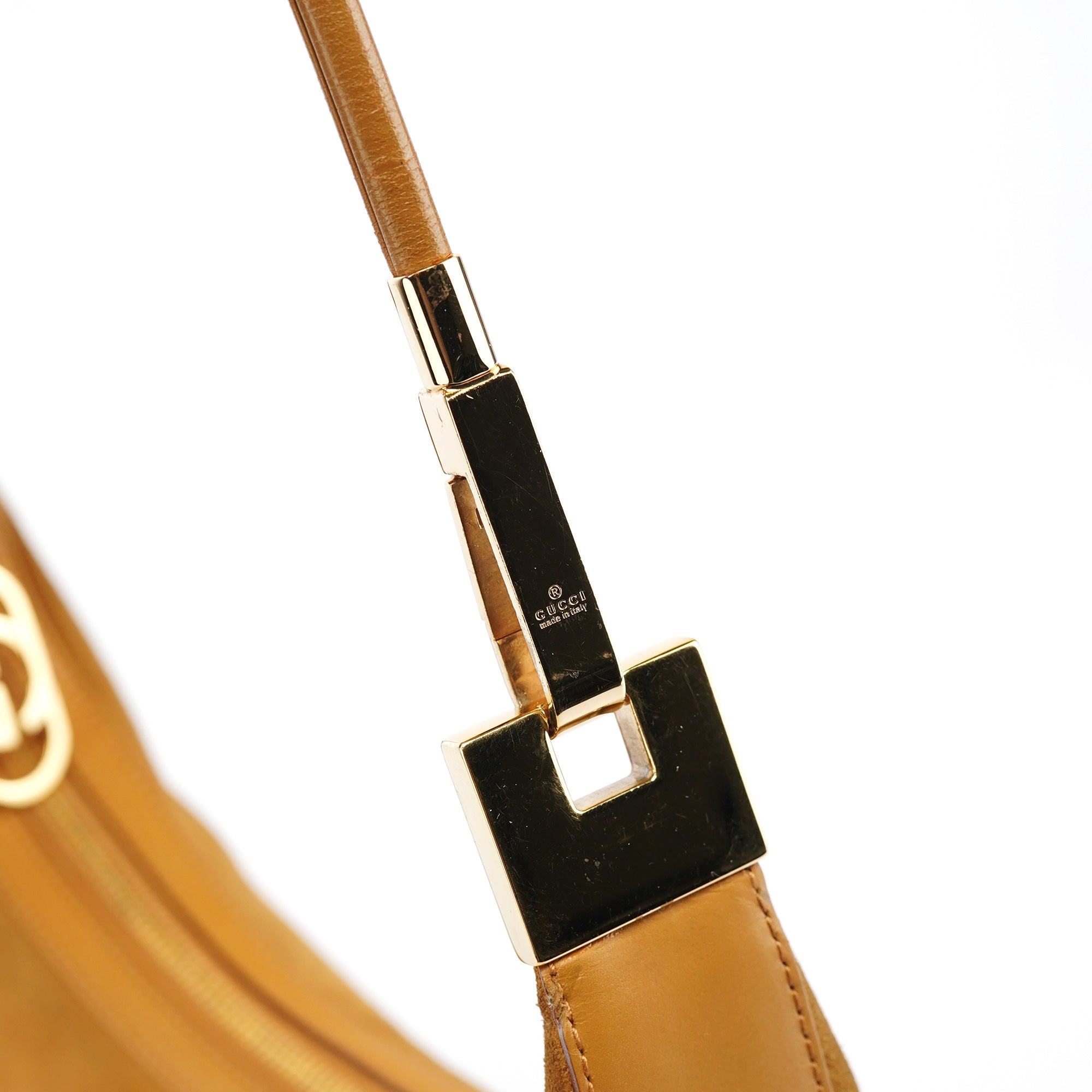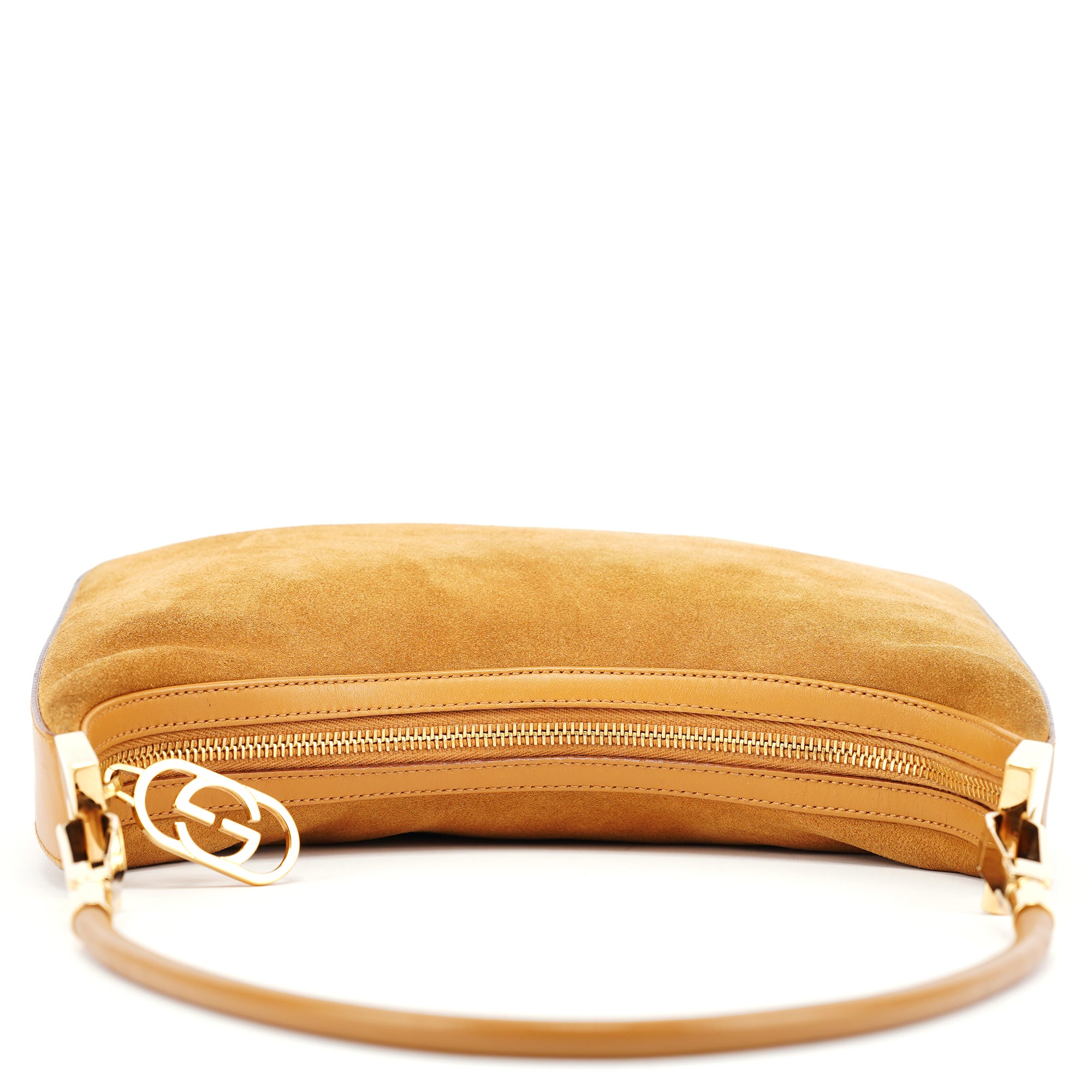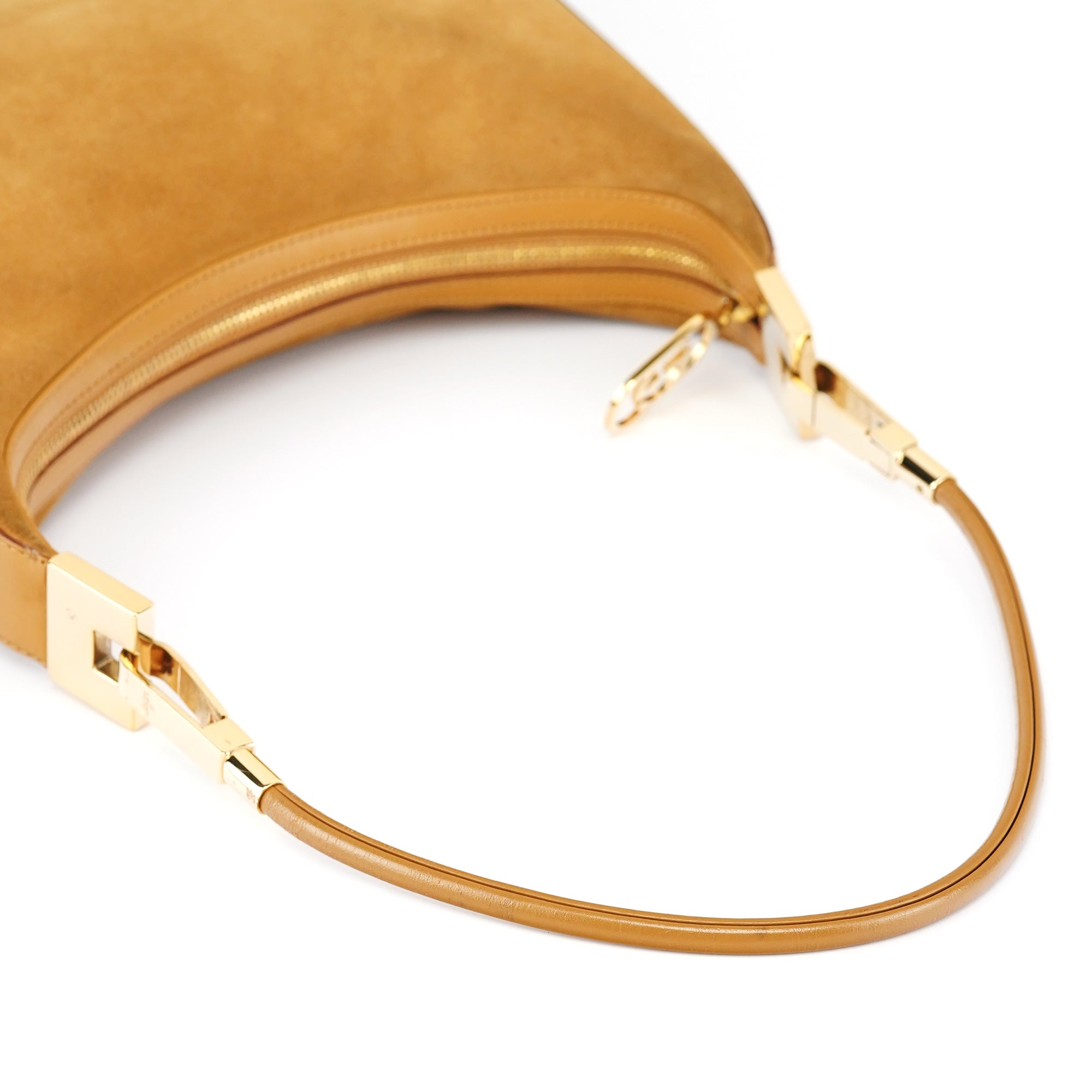 Designed in the late 1990s by Tom Ford, this Gucci shoulder bag is crafted in light brown suede with smooth leather trim and features the iconic double G logo accent on the side. The minimalist silhouette is complemented by gold-tone hardware and a removable shoulder strap, while the interior is lined in brown fabric with a zip pocket for essentials.