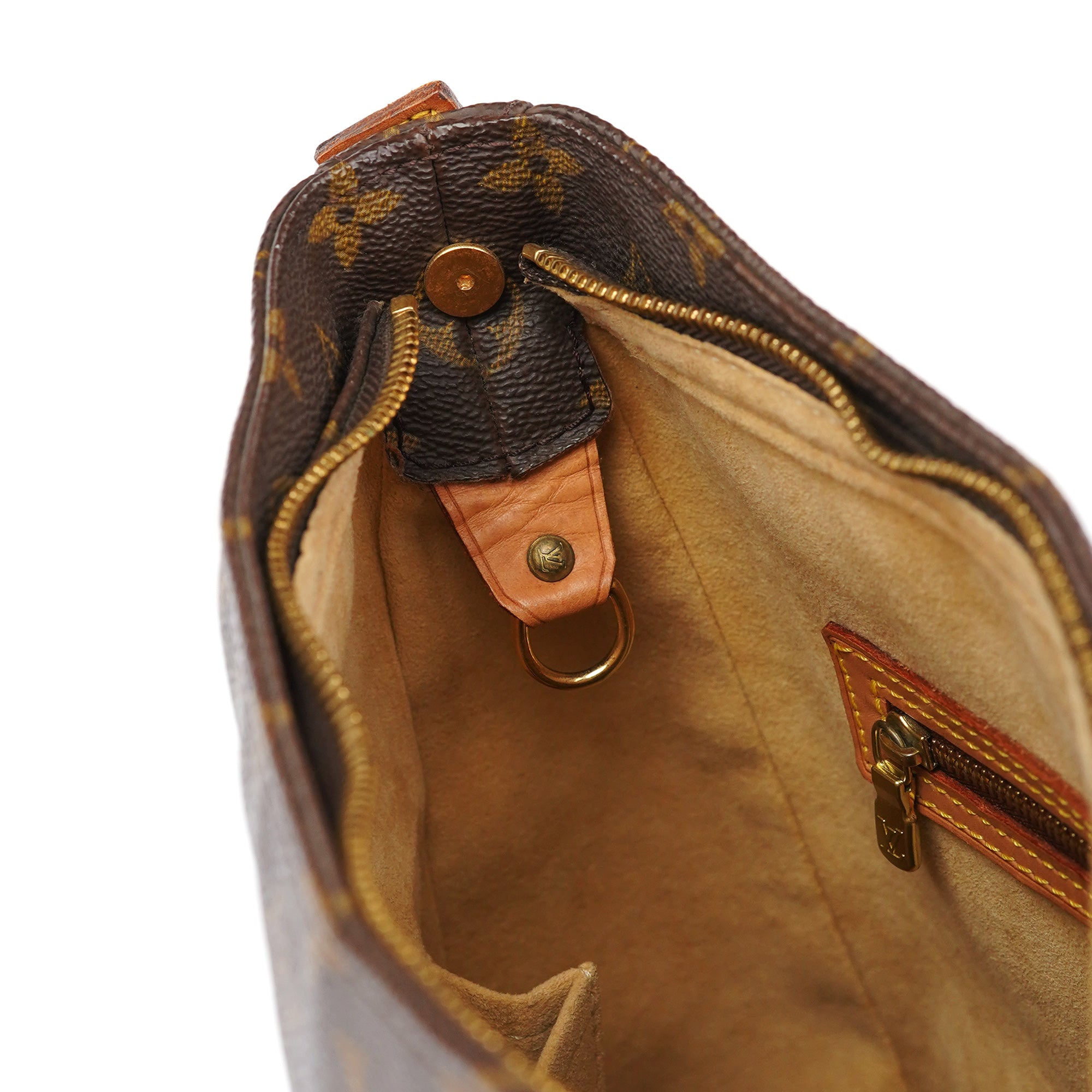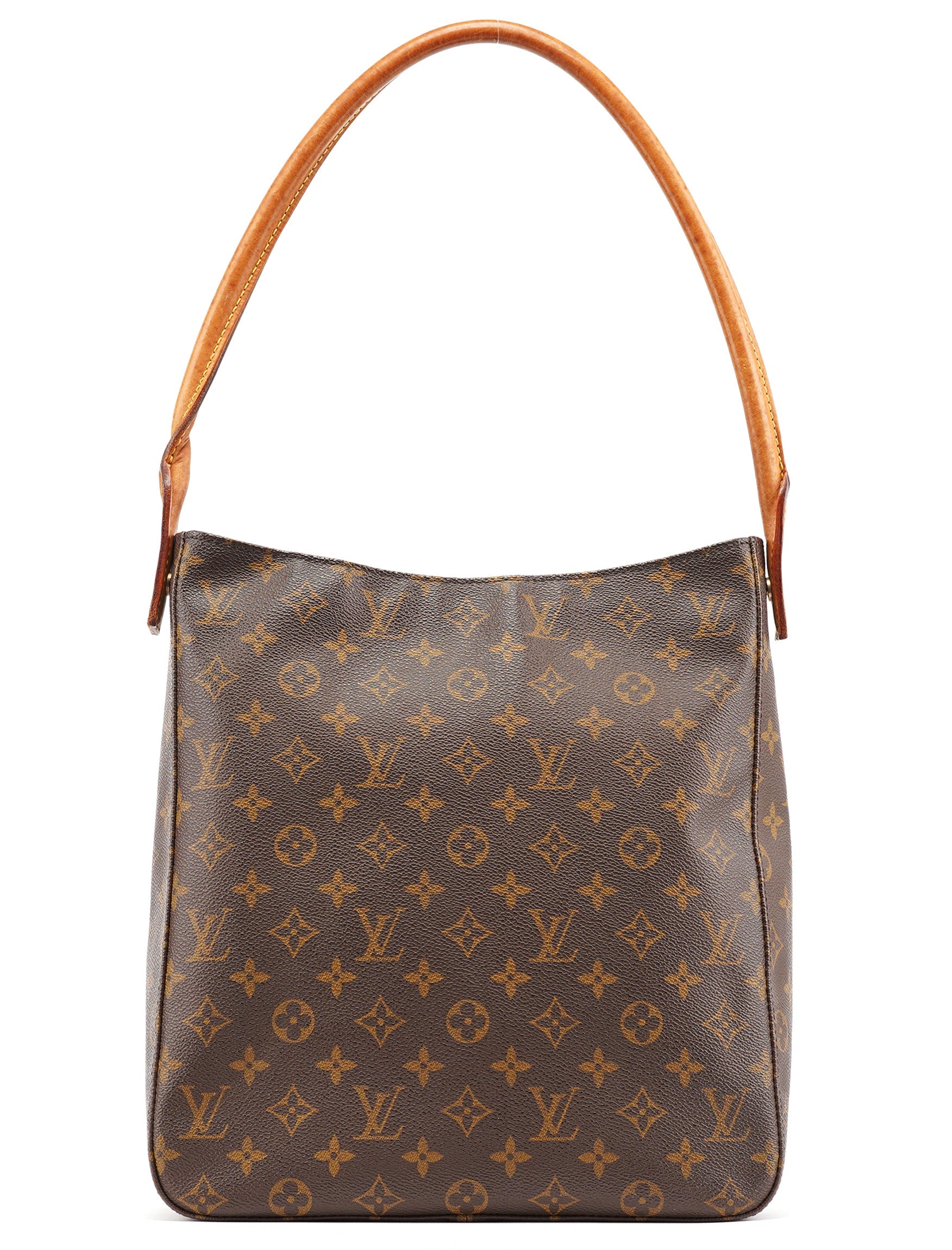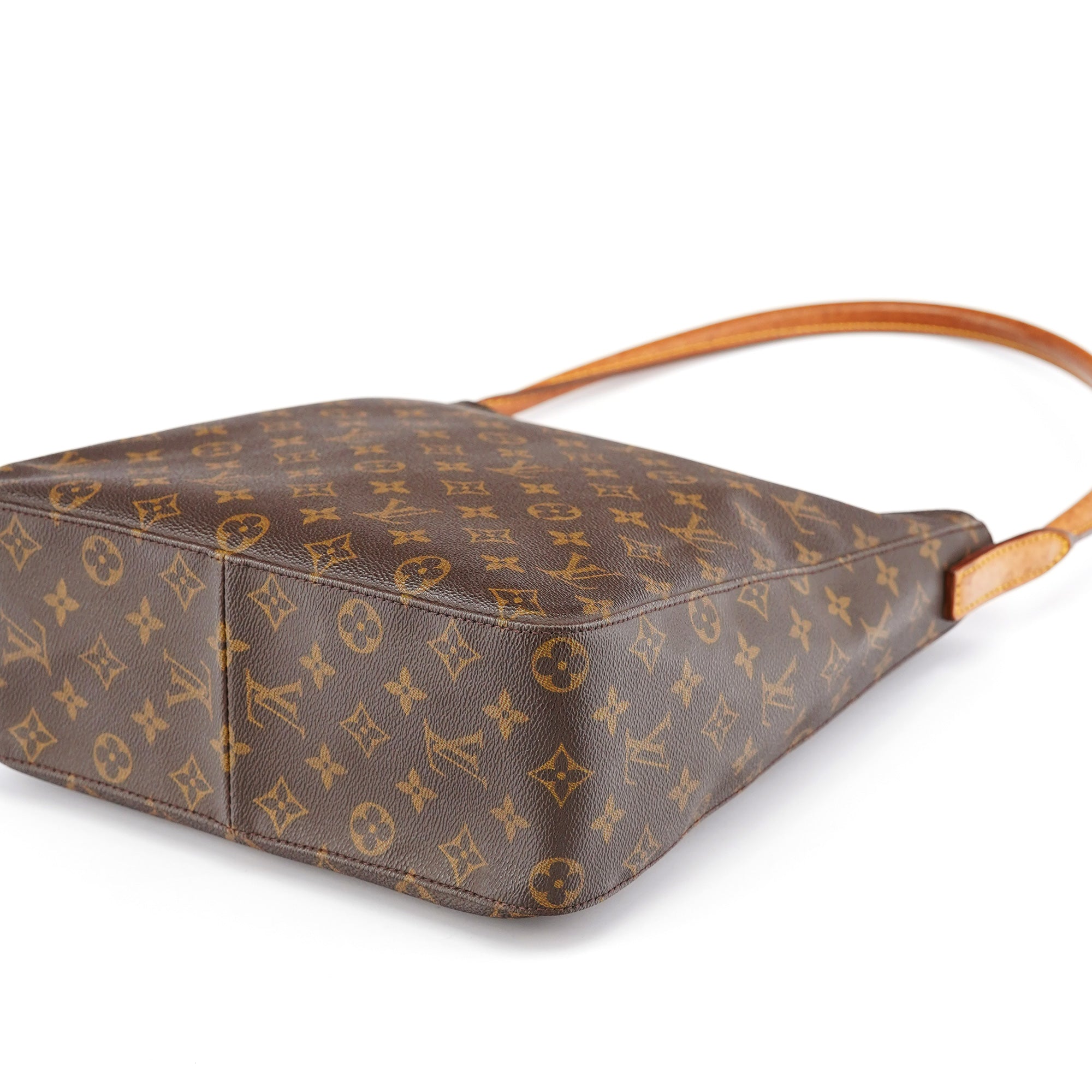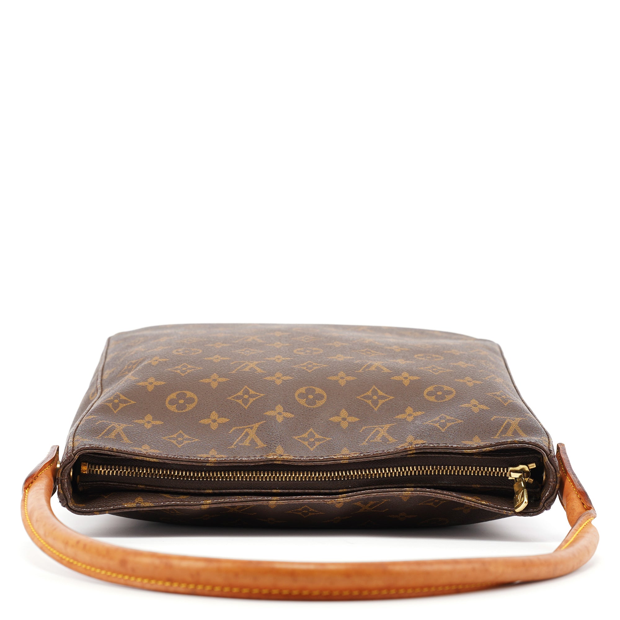 Designed in the late 1990s, this vintage Louis Vuitton Looping shoulder bag features the iconic monogram canvas in brown with the model's distinctive asymmetrical silhouette. Crafted from durable monogram canvas with vachetta leather trim and brass-tone hardware, the bag closes with a secure top zipper and features a comfortable flat leather shoulder strap. The interior is lined in tan canvas with practical pocket organization.