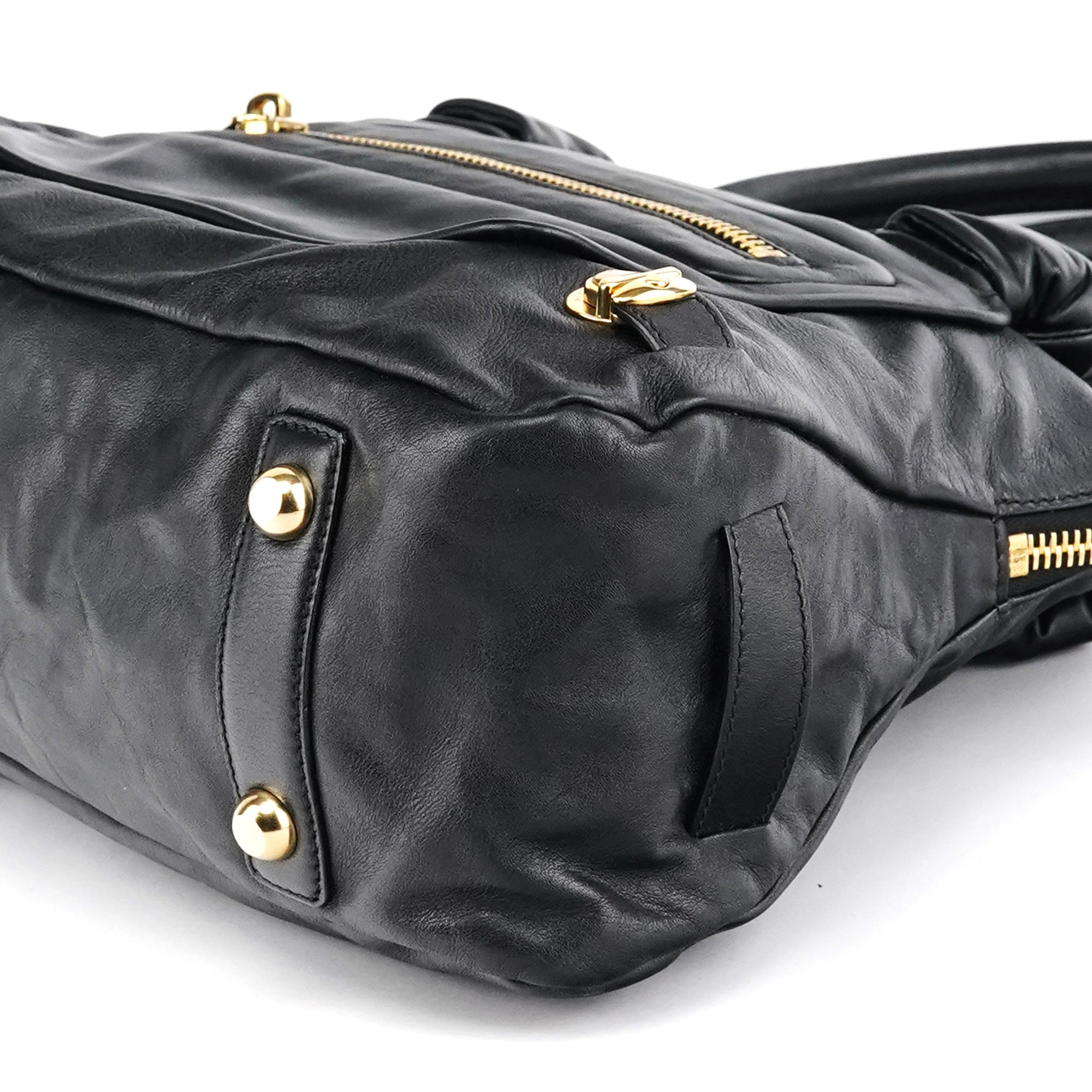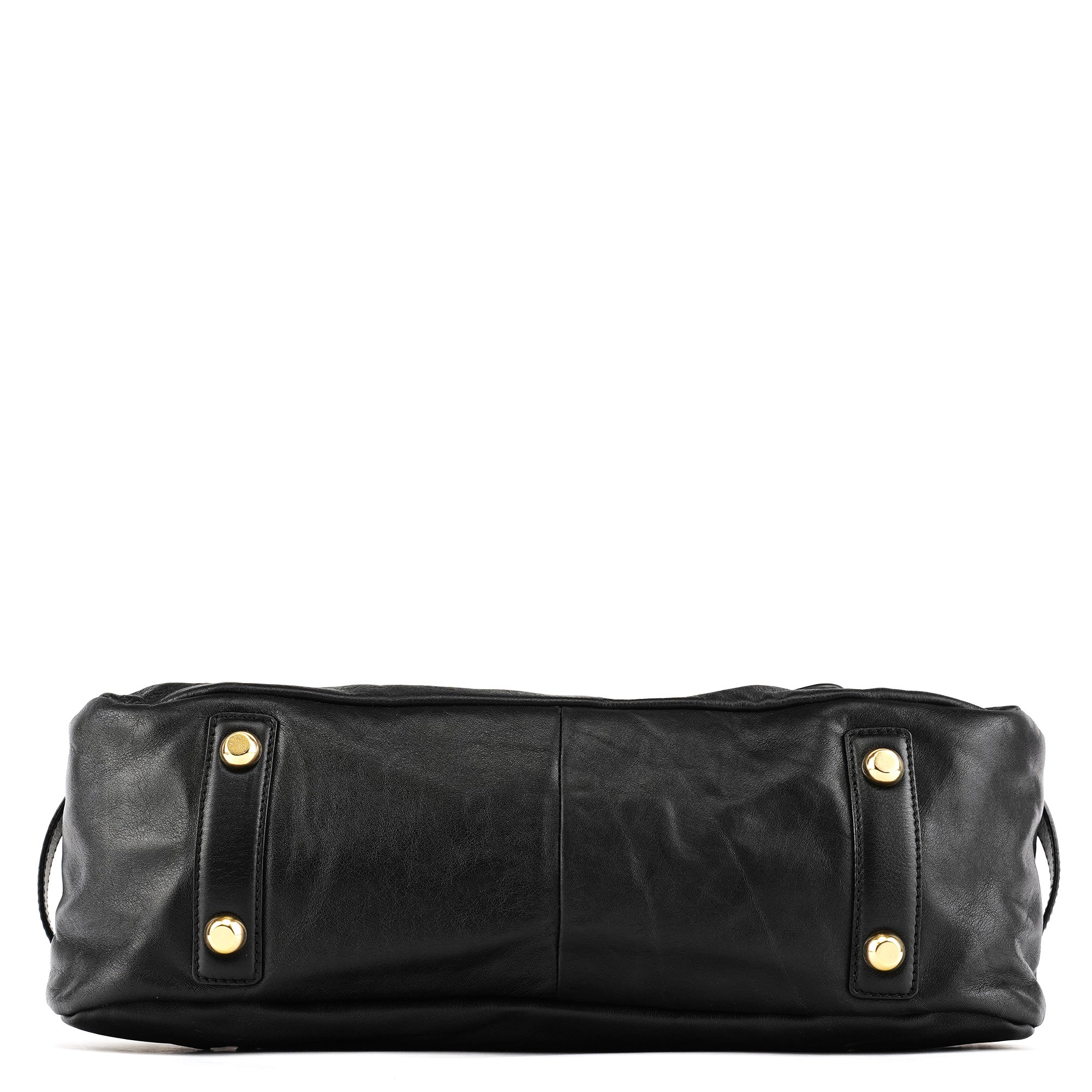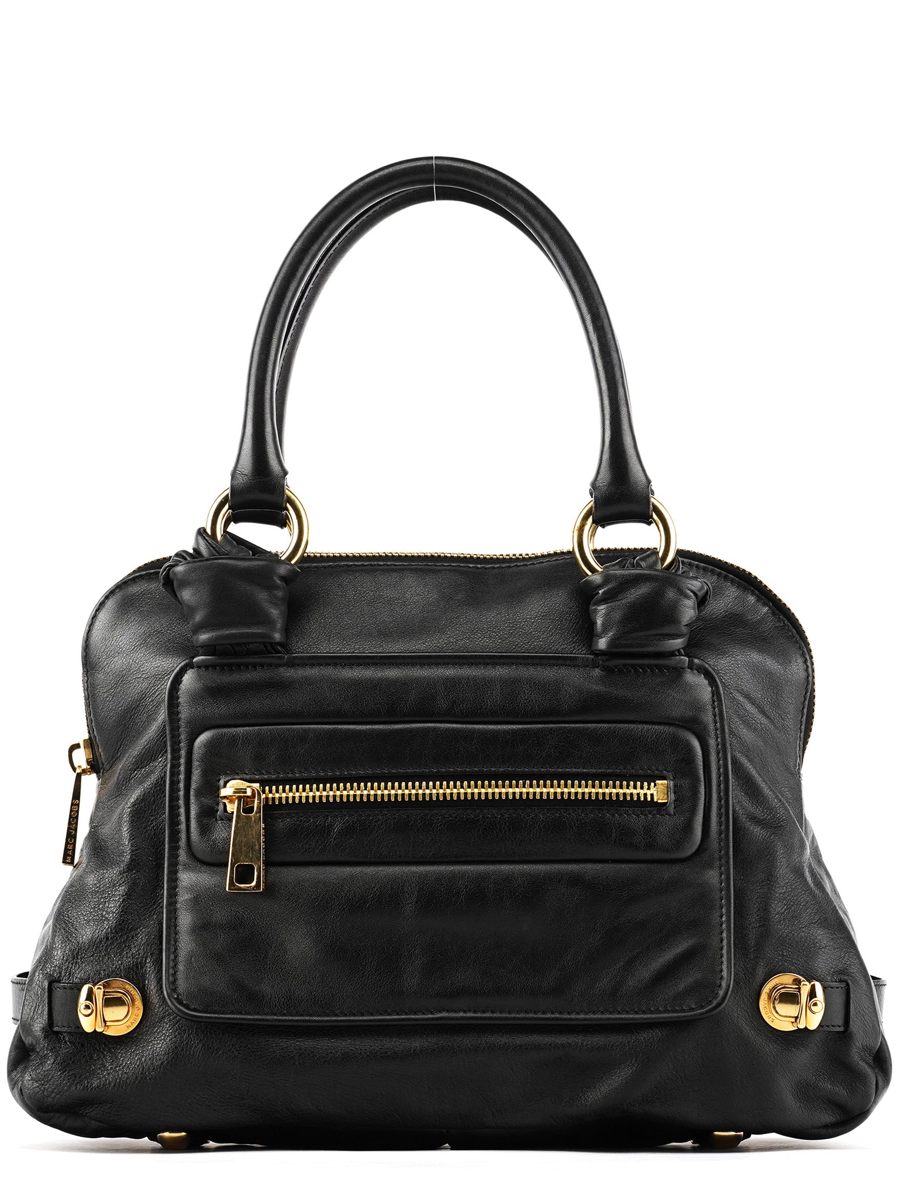 Designed in the mid 2000s, this Marc Jacobs mainline Venetia tote bag is crafted from black leather, finished with gold-tone hardware, dual rolled handles, a front zip pocket, side turn-lock details, and a top zip closure.