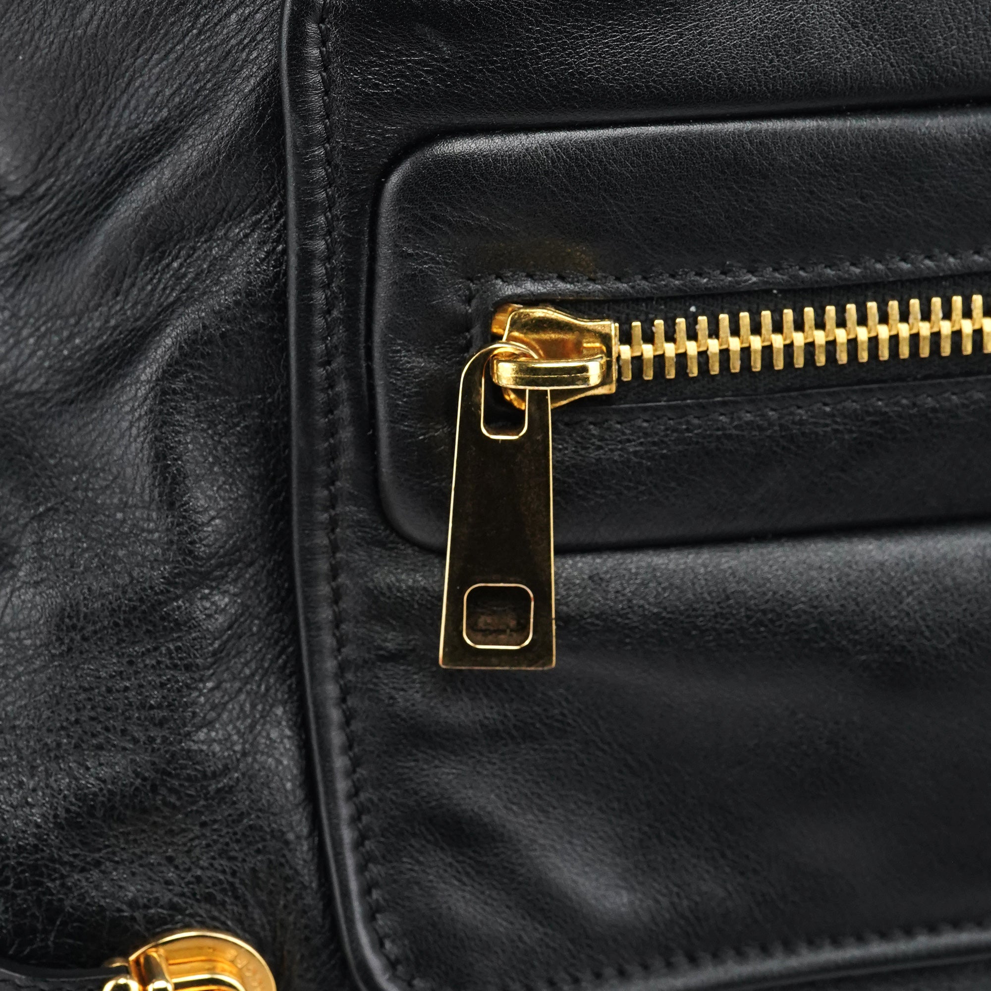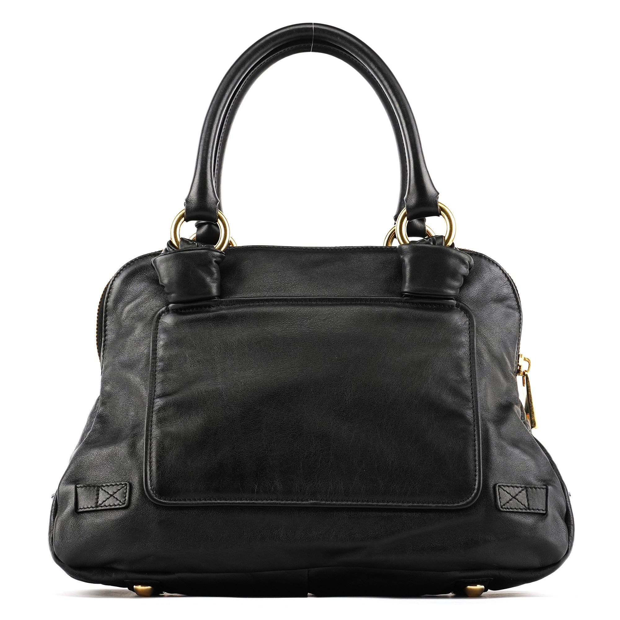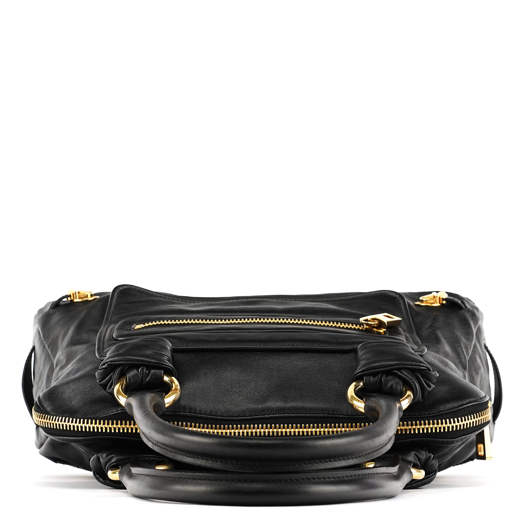 Designed in the mid 2000s, this Marc Jacobs mainline Venetia tote bag is crafted from black leather, finished with gold-tone hardware, dual rolled handles, a front zip pocket, side turn-lock details, and a top zip closure.