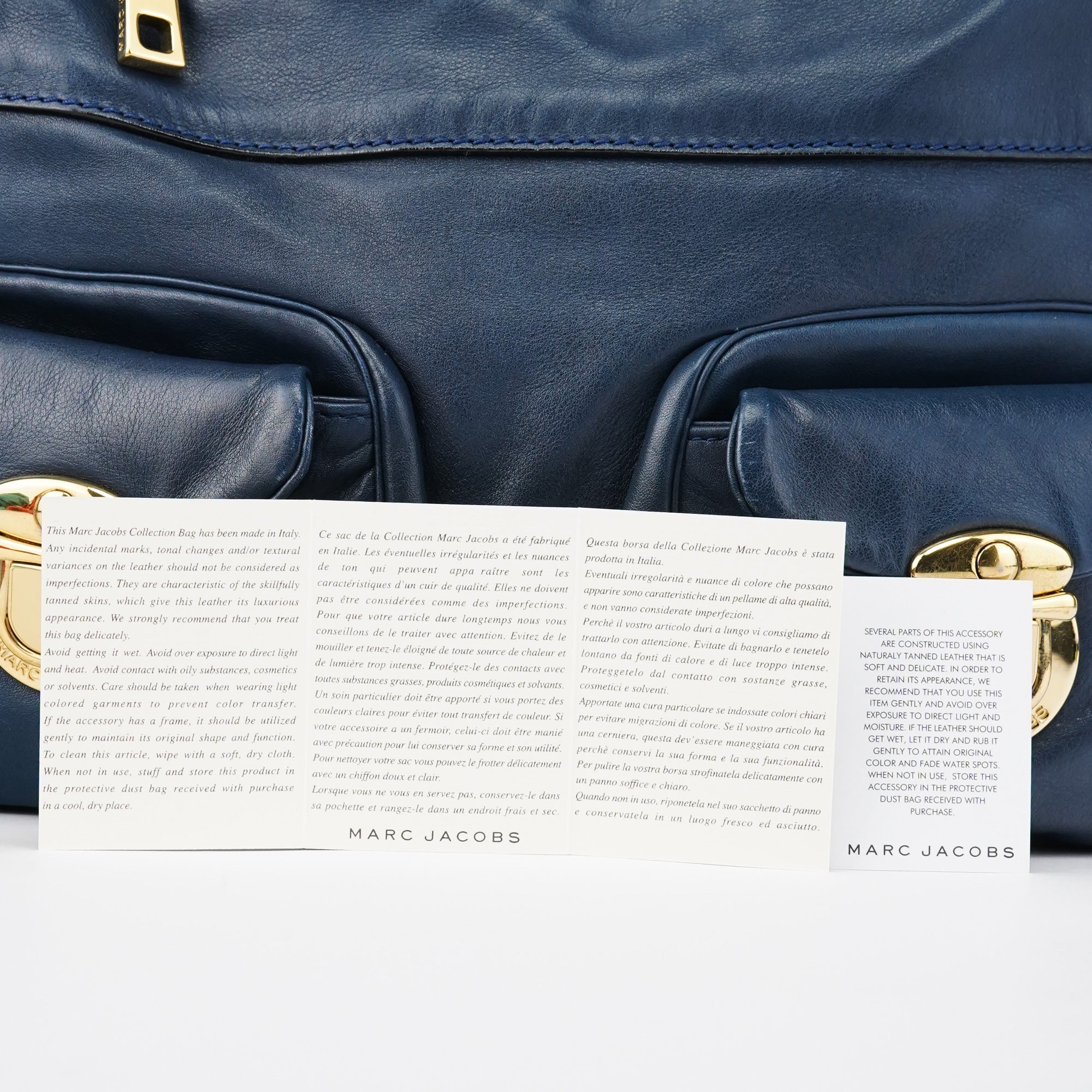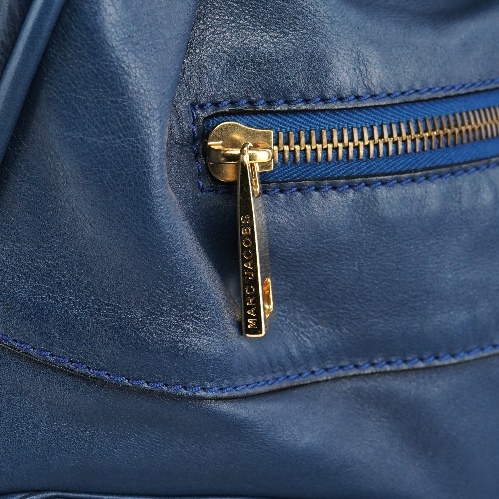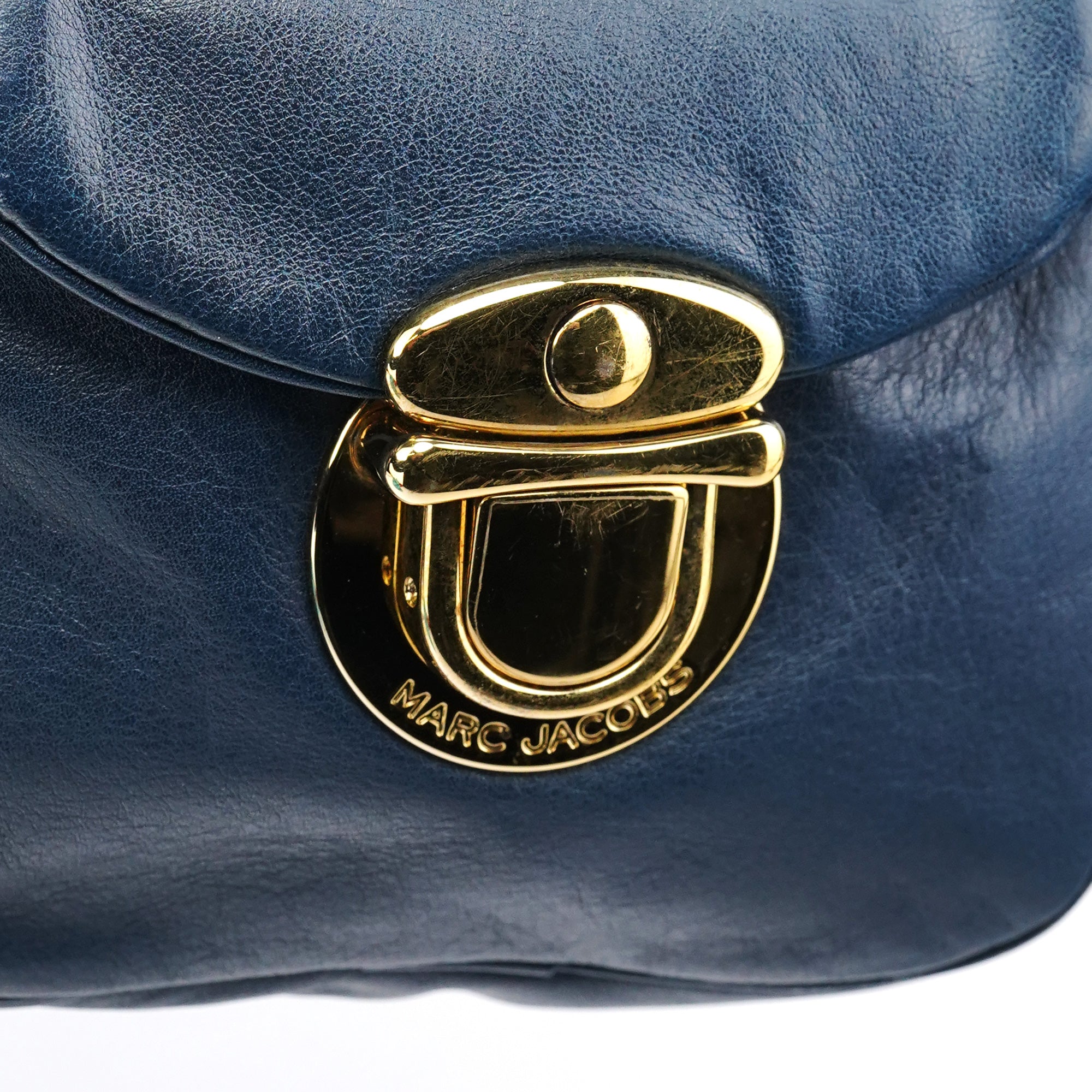 Designed in the mid 2000s, this Marc Jacobs Blake shoulder bag is crafted from blue leather with gold-tone hardware, featuring dual front flap pockets, a front zip pocket and an adjustable studded shoulder strap, opening to a spacious interior for everyday essentials.