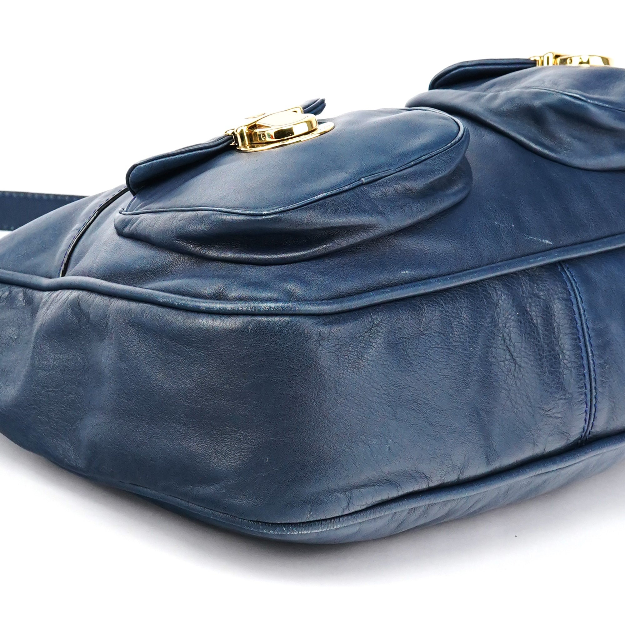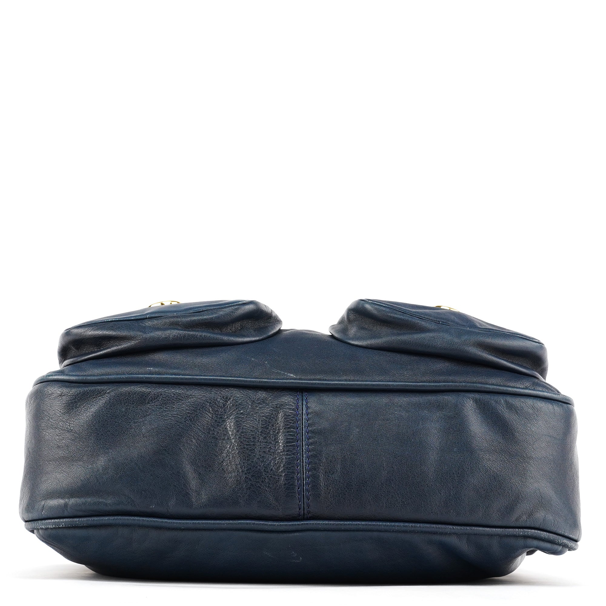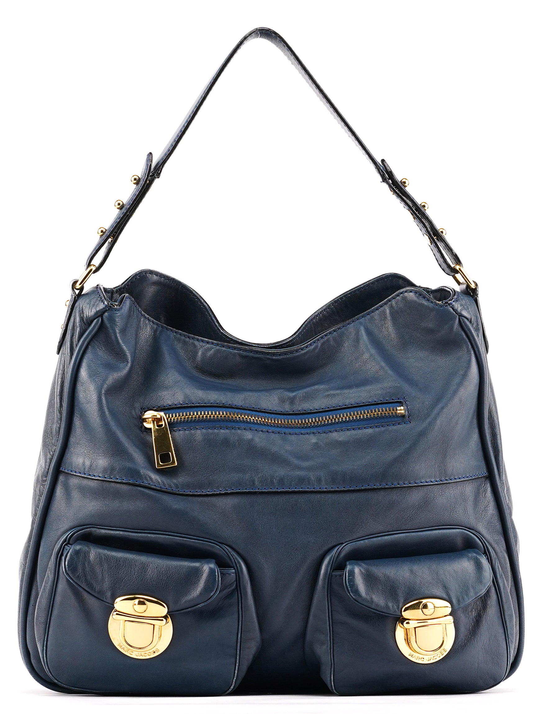 Designed in the mid 2000s, this Marc Jacobs Blake shoulder bag is crafted from blue leather with gold-tone hardware, featuring dual front flap pockets, a front zip pocket and an adjustable studded shoulder strap, opening to a spacious interior for everyday essentials.