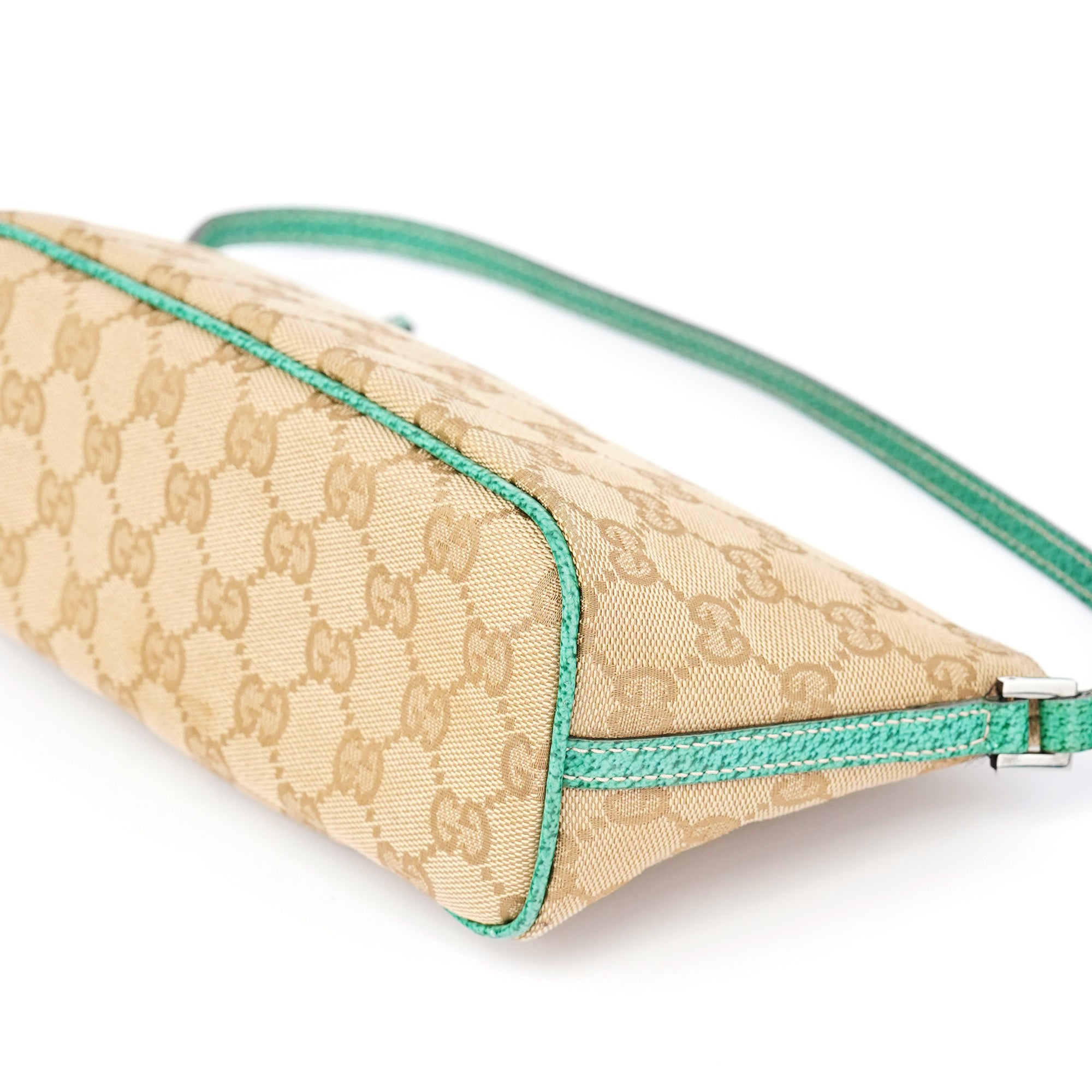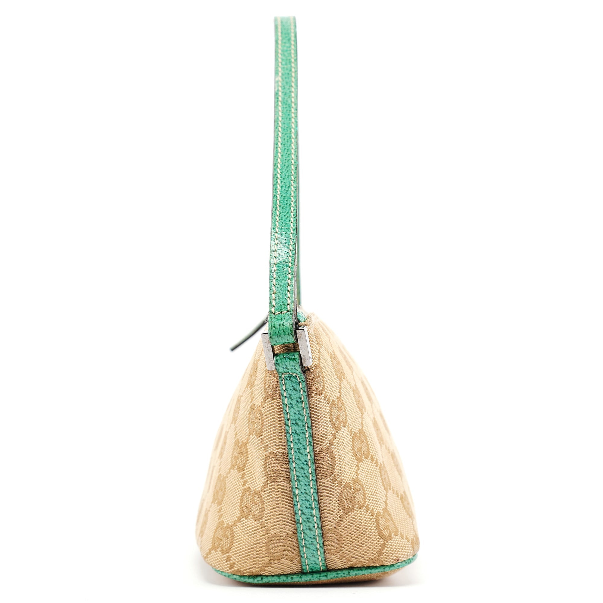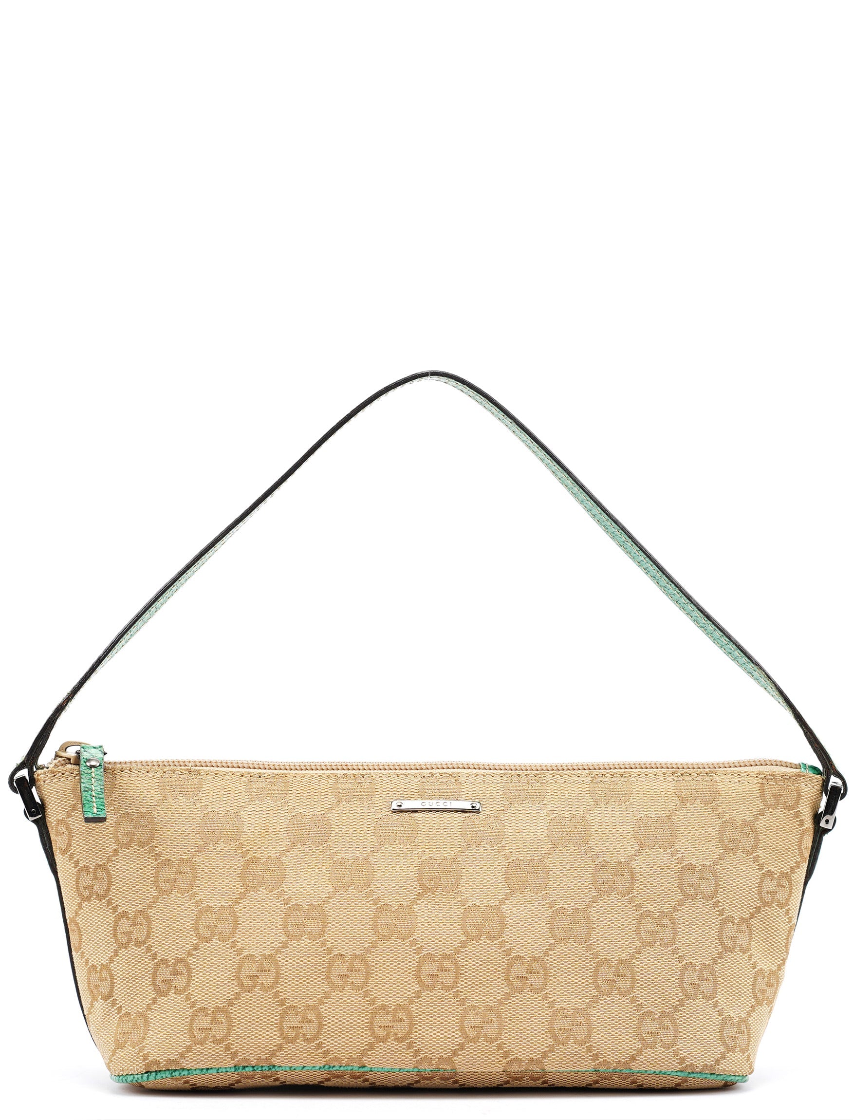 Designed in the early 2000s by Tom Ford, this vintage Gucci GG Boat Pochette features the iconic beige monogram canvas with contrasting turquoise leather trim. The sleek boat-shaped silhouette showcases silver-tone hardware and zip closure, while the slim strap offers comfortable carrying. The minimalist design represents Gucci's signature blend of heritage codes with contemporary sophistication, making it a versatile everyday companion.