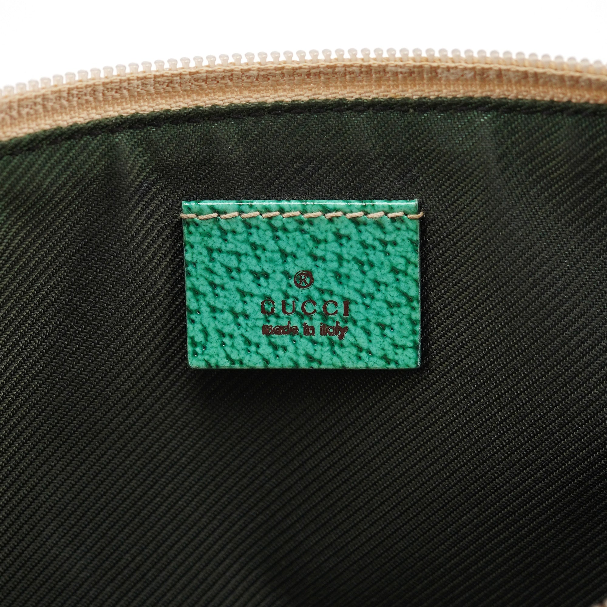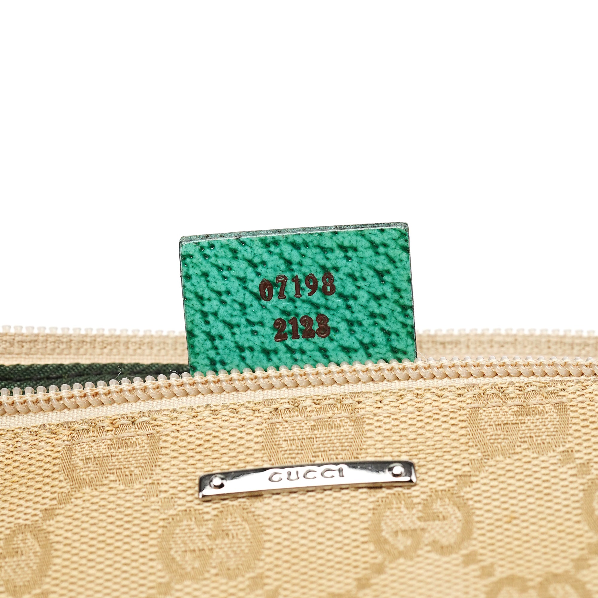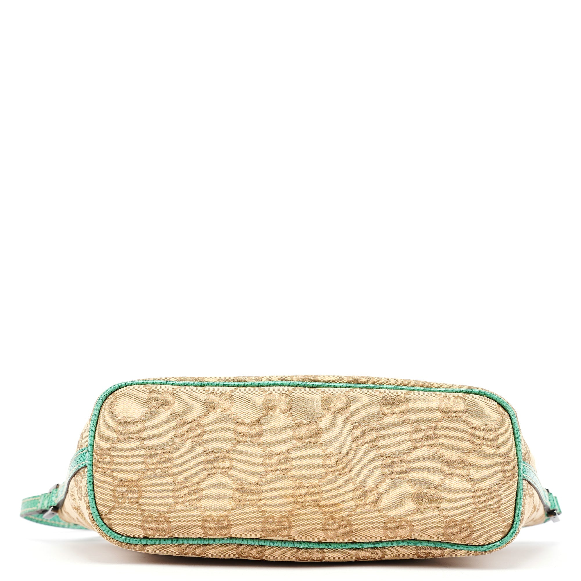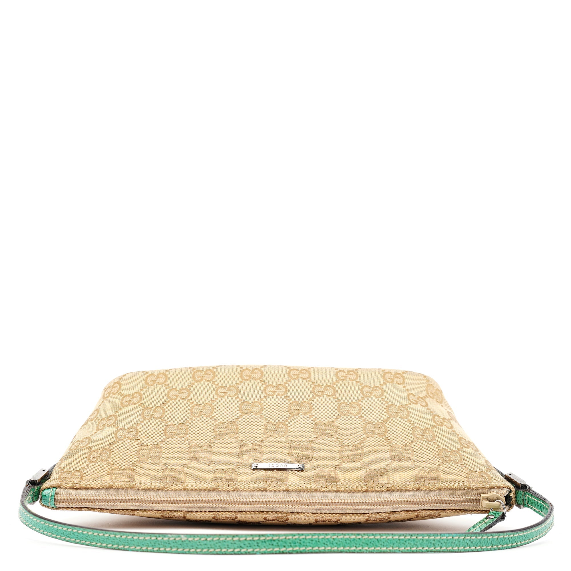 Designed in the early 2000s by Tom Ford, this vintage Gucci GG Boat Pochette features the iconic beige monogram canvas with contrasting turquoise leather trim. The sleek boat-shaped silhouette showcases silver-tone hardware and zip closure, while the slim strap offers comfortable carrying. The minimalist design represents Gucci's signature blend of heritage codes with contemporary sophistication, making it a versatile everyday companion.