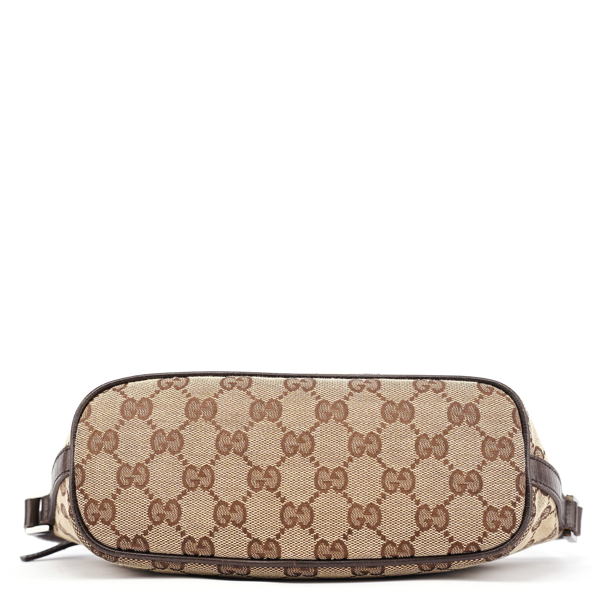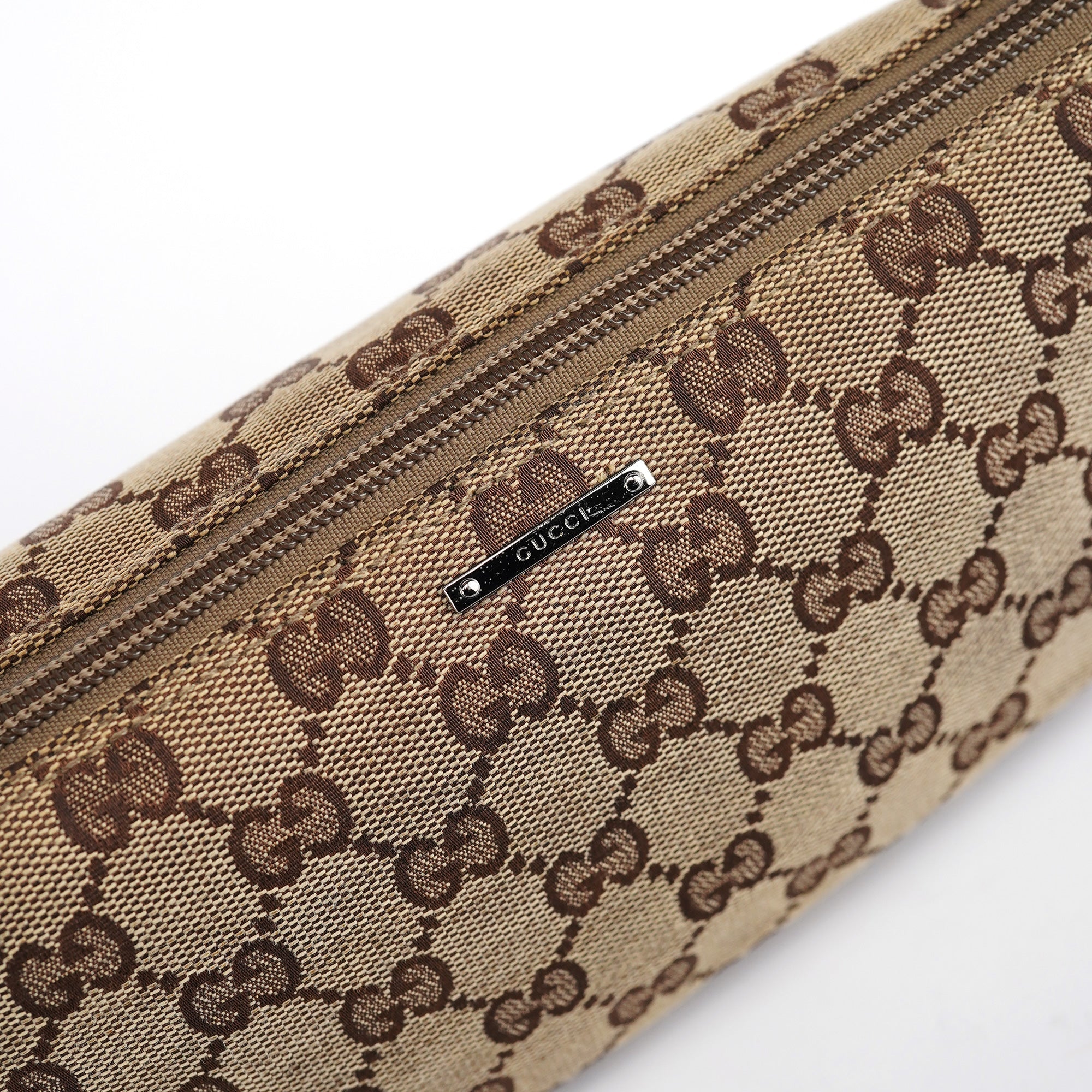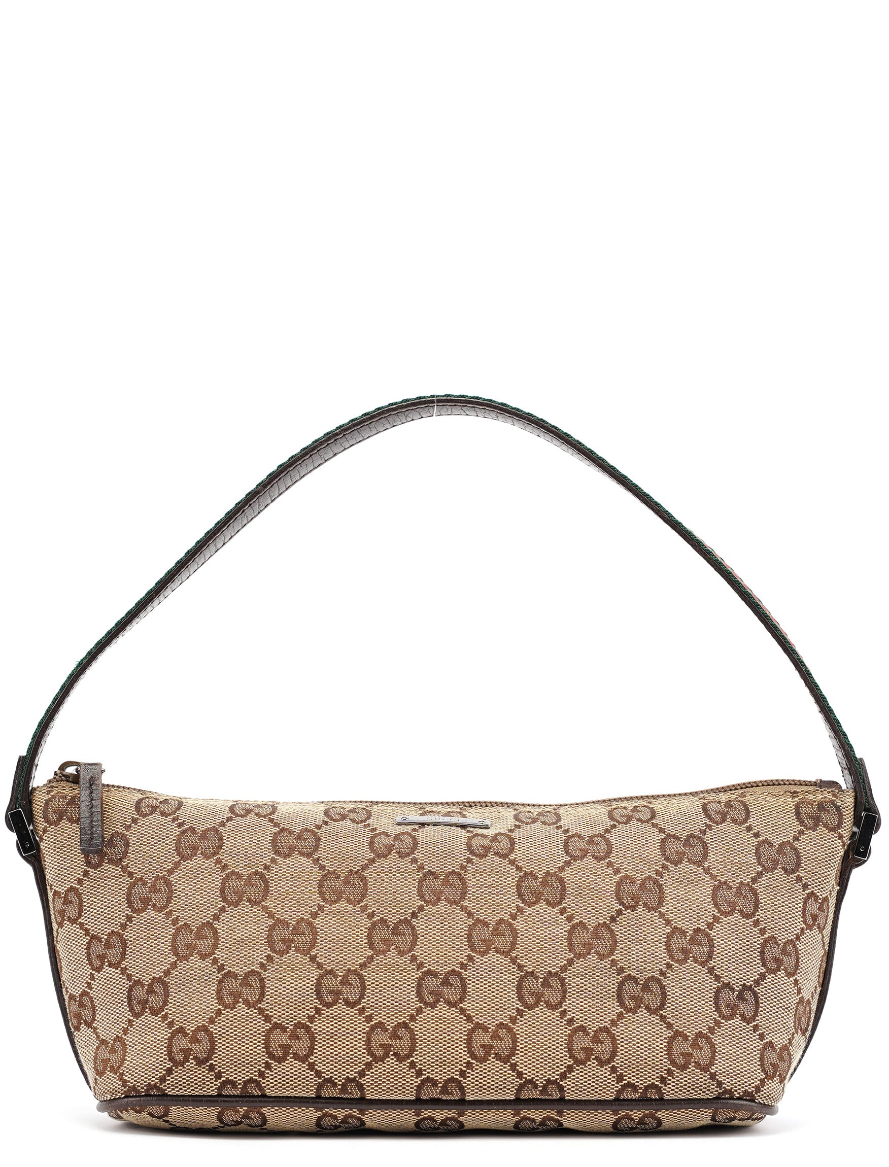 Designed in the early 2000s by Tom Ford, this vintage Gucci GG Boat Pochette features classic beige GG monogram canvas with dark brown leather trim. The elongated pochette silhouette includes a zipper closure, single leather handle, and lined interior.