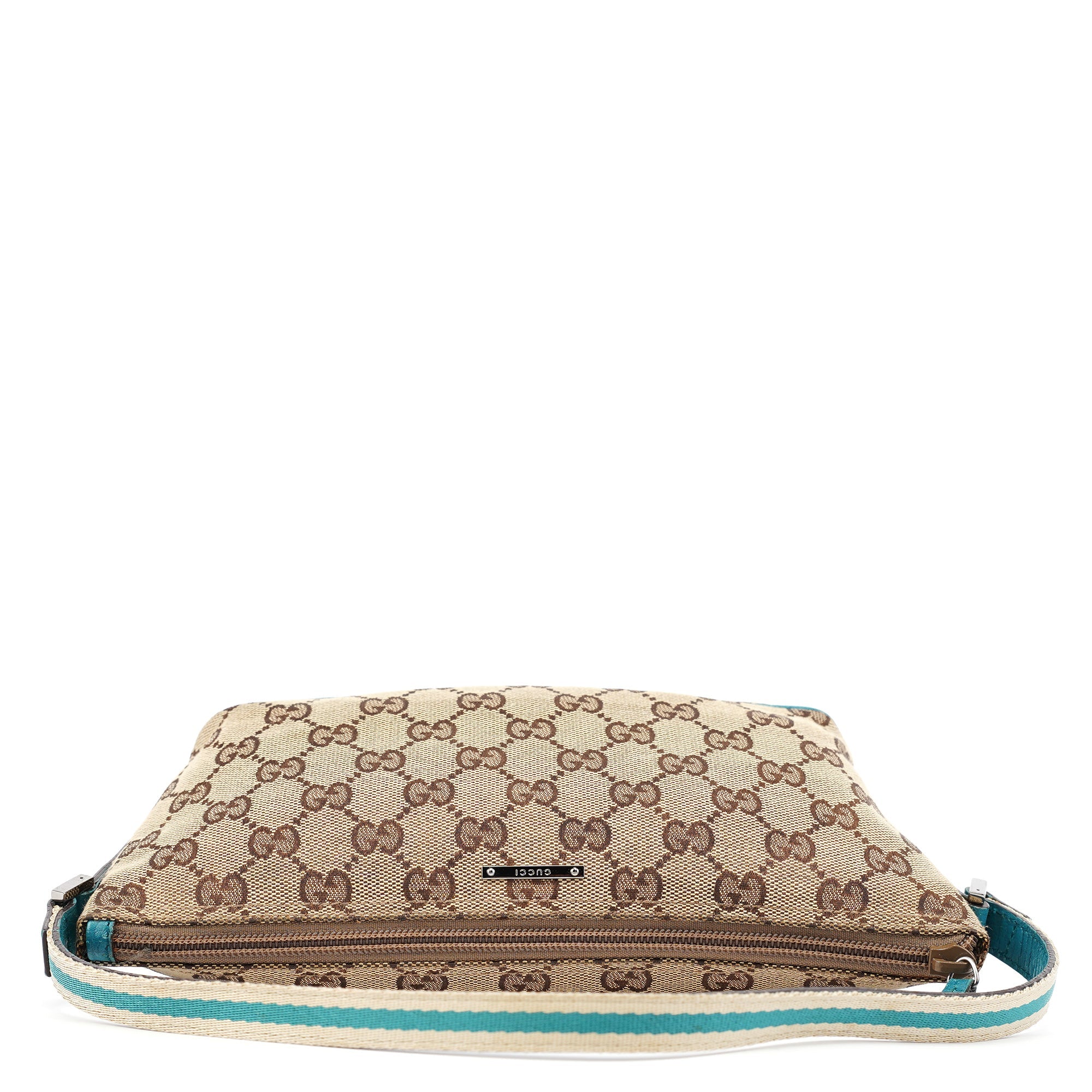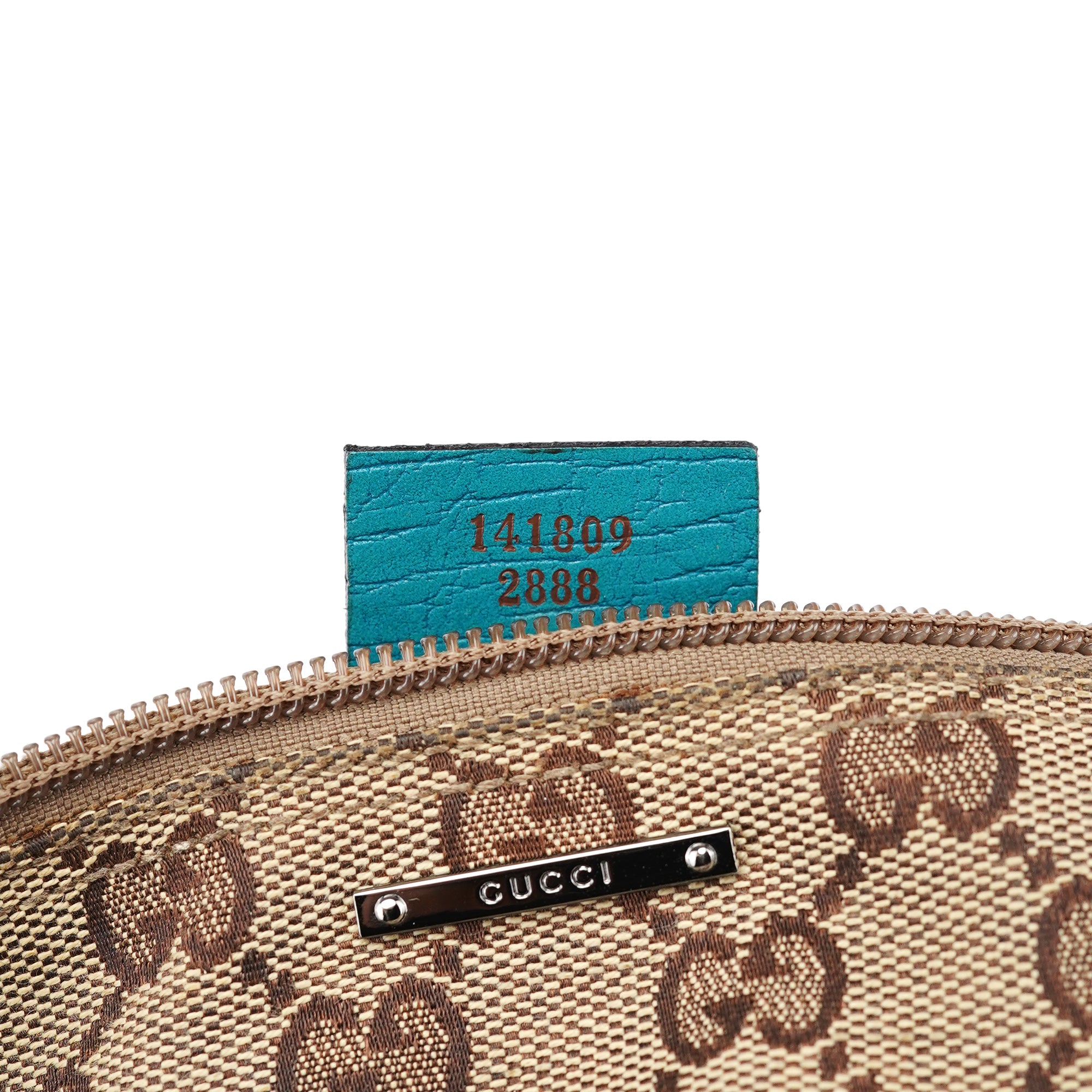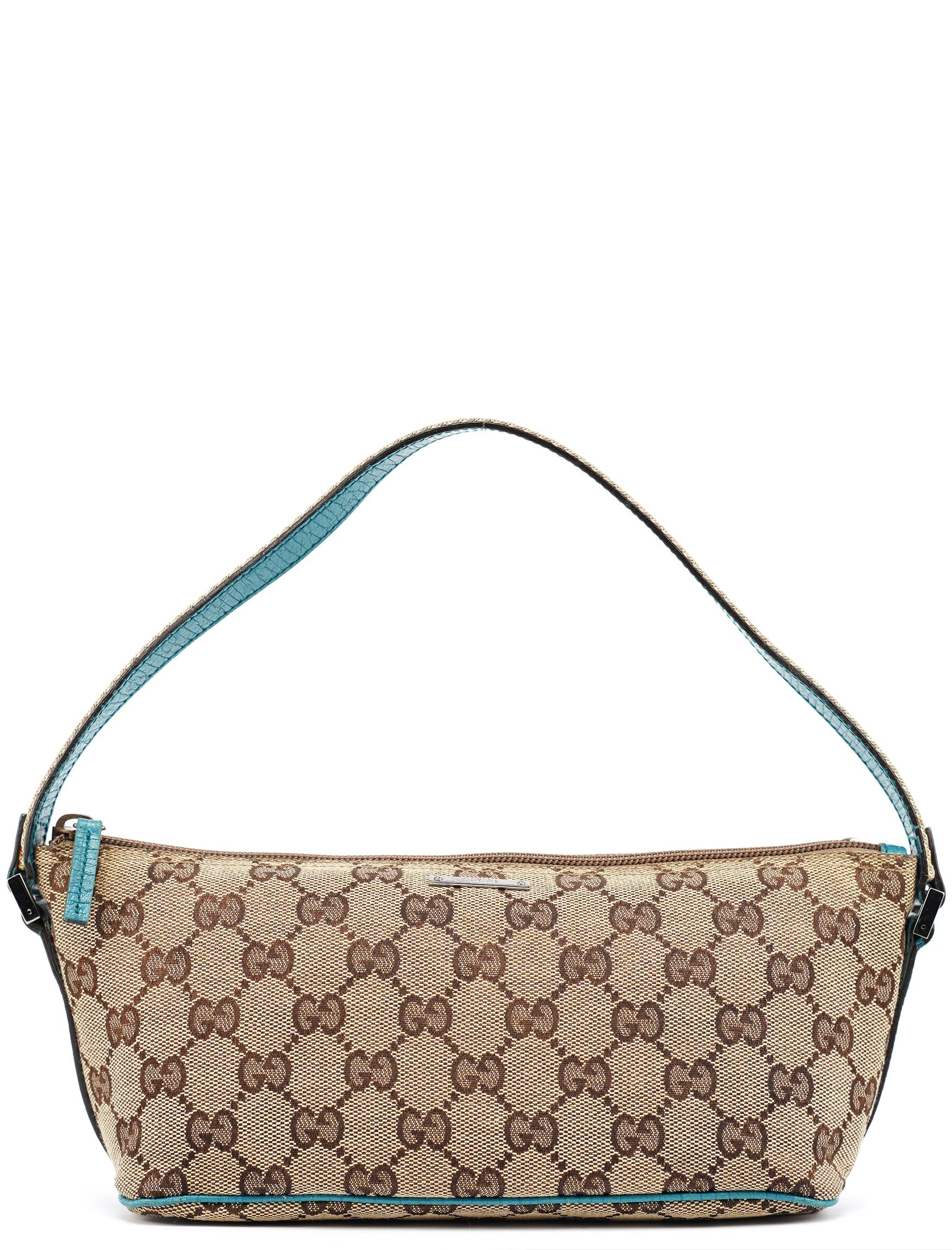 Designed in the early 2000s by Tom Ford, this vintage Gucci GG Boat Pochette features the iconic beige and brown monogram canvas with vibrant turquoise leather trim. The sleek boat-shaped silhouette showcases silver-tone hardware and zip closure, while the adjustable shoulder strap offers versatile carrying options. The striking color combination represents Gucci's bold approach to reimagining classic codes with contemporary flair, making this piece both a functional accessory and statement bag.