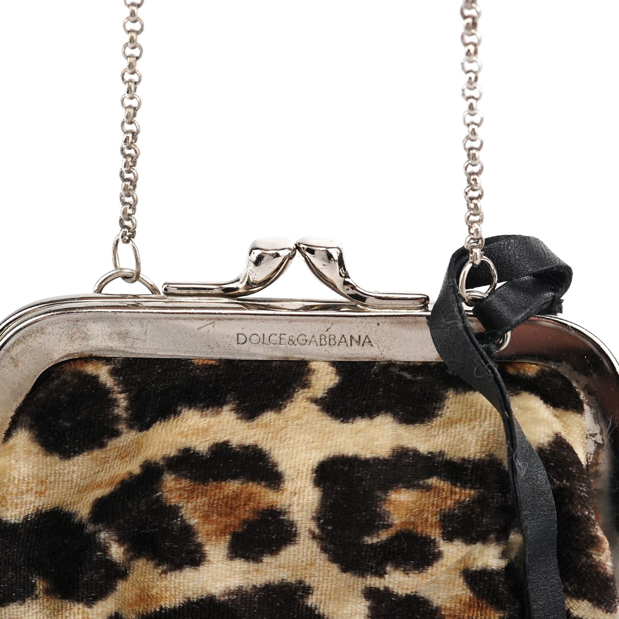 Designed in the early 2000s, this Dolce & Gabbana mini shoulder bag features leopard-print velvet with a silver-tone frame and chain strap. The clasp opening adds vintage charm, while the dangling metal “D&G” logo detail nods to the brand’s bold aesthetic.