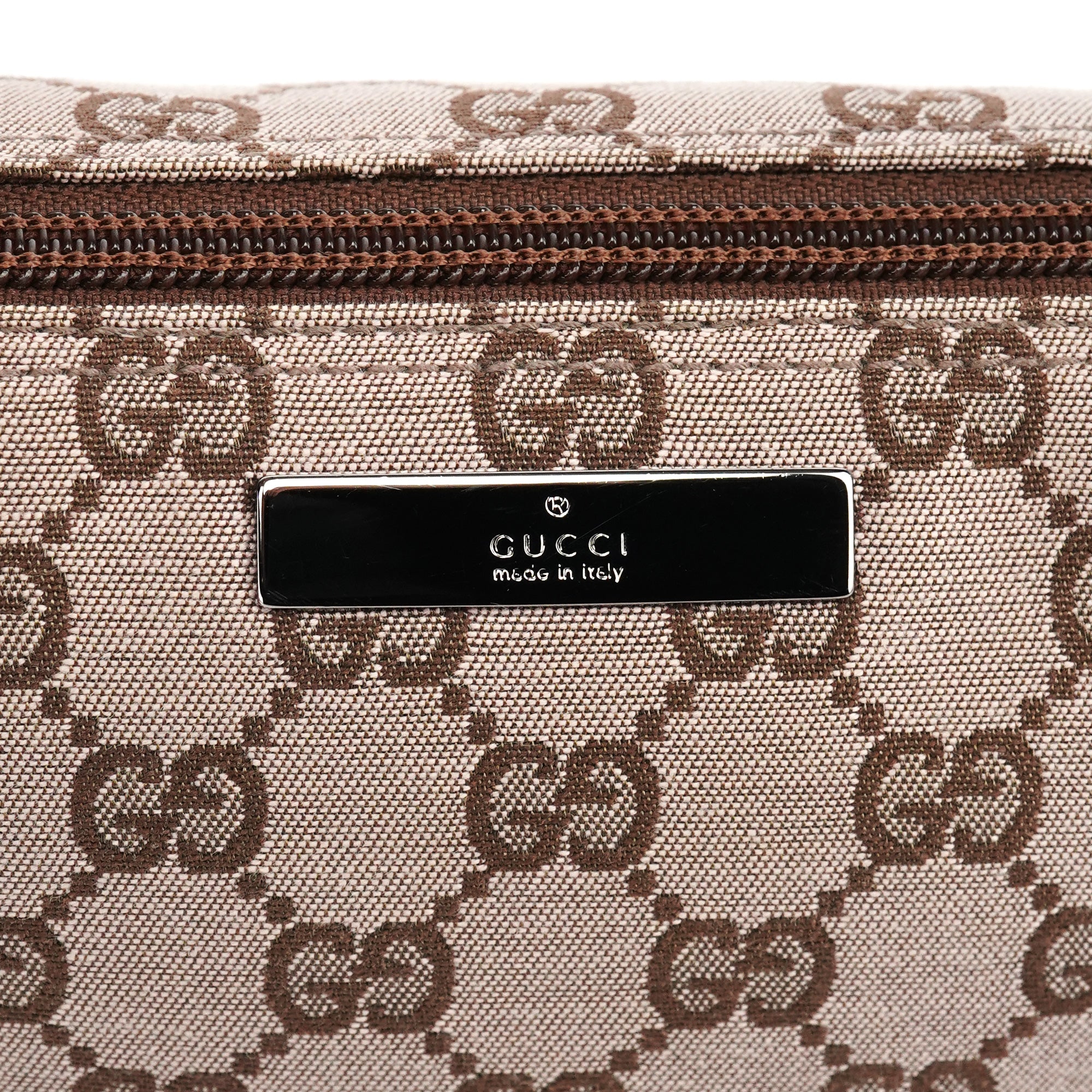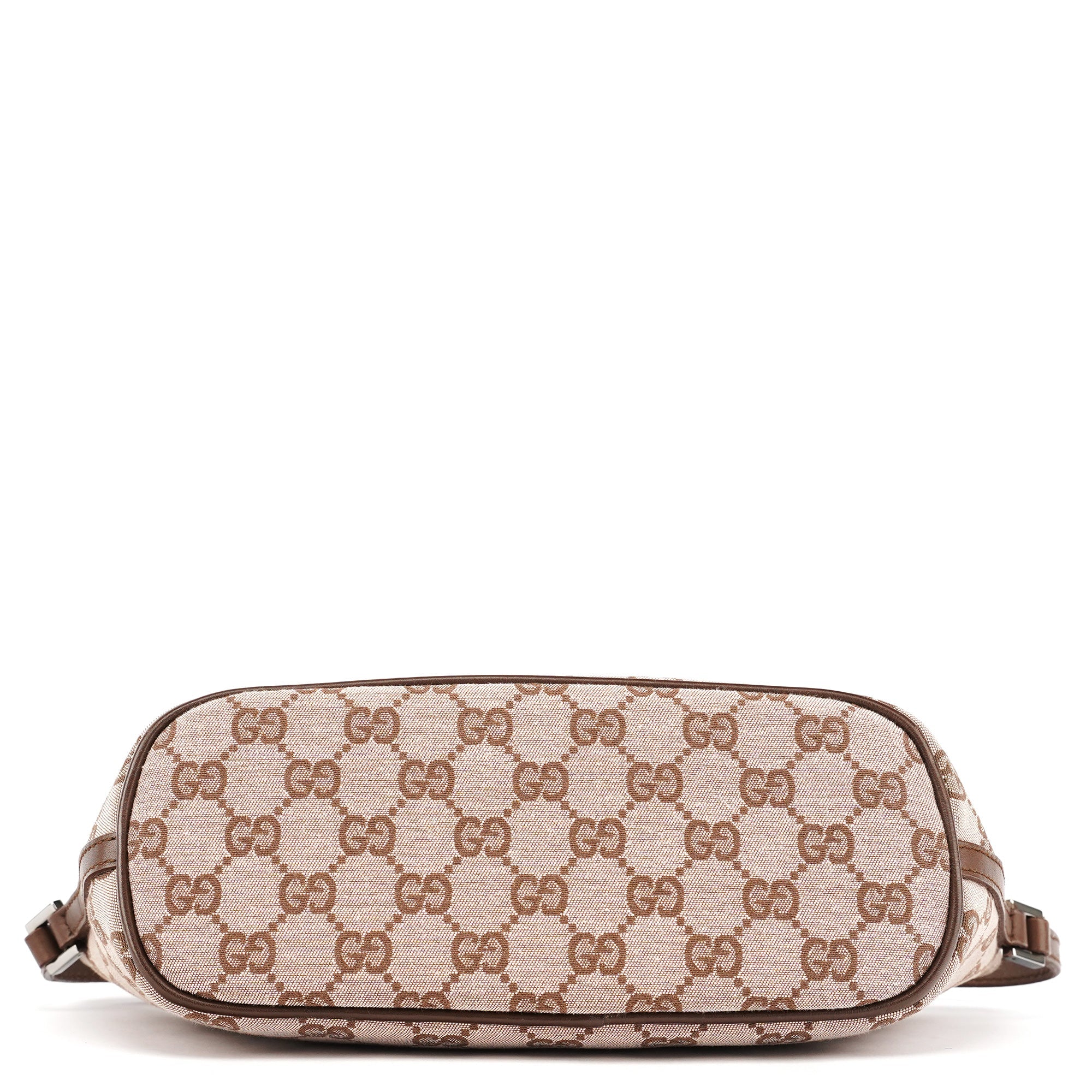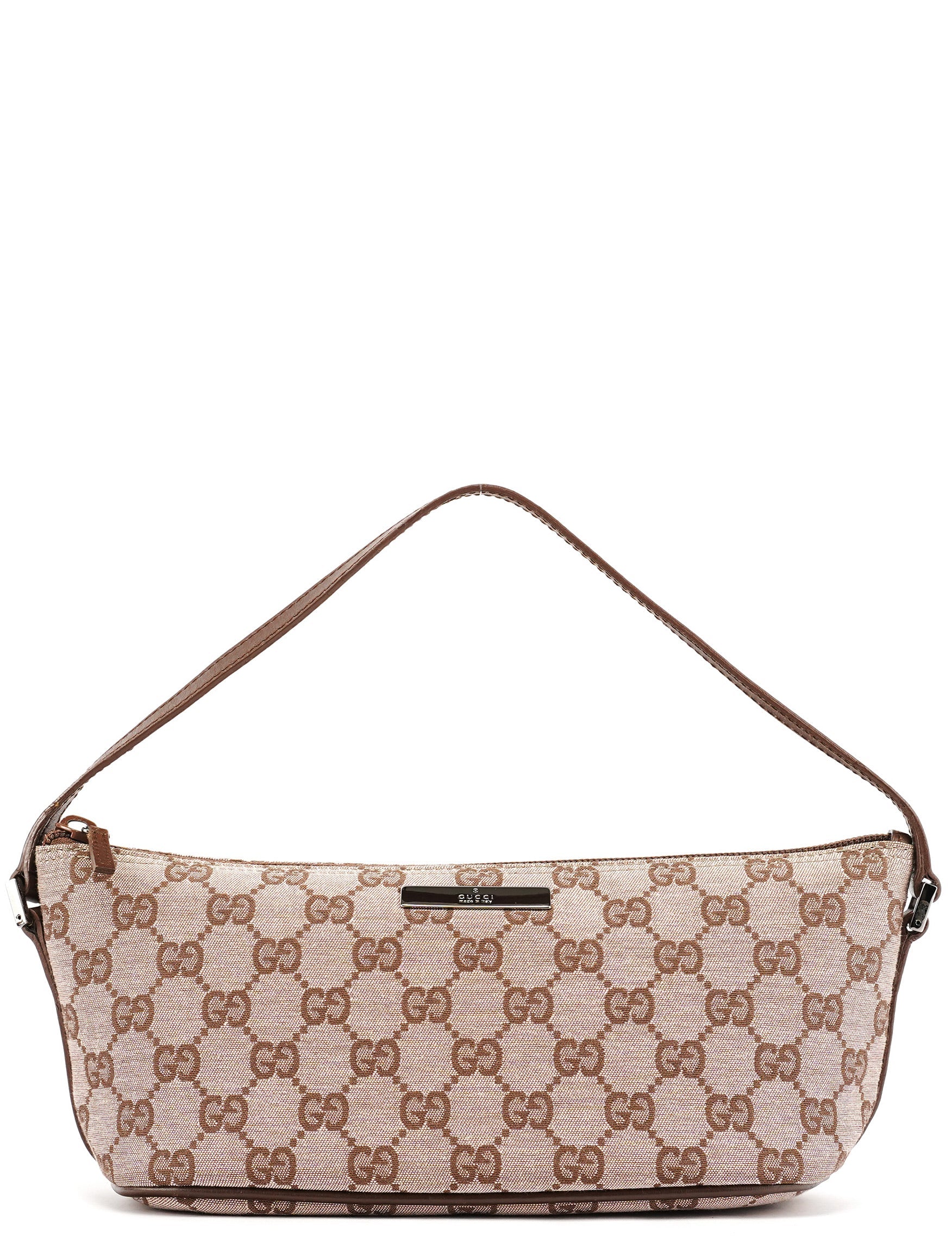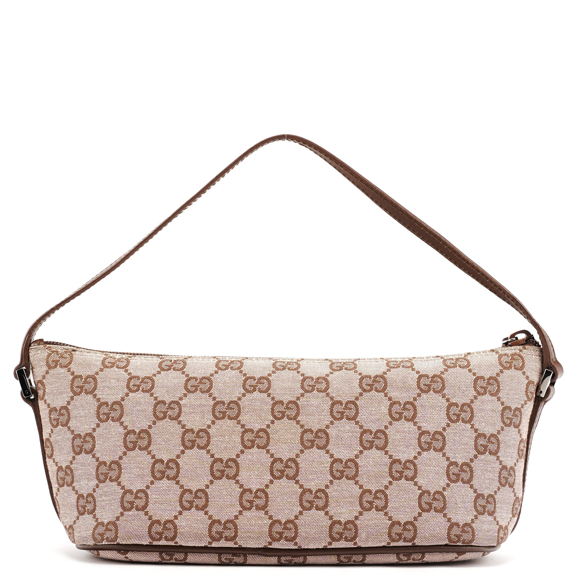 Designed in the late 1990s by Tom Ford, this Gucci GG Boat Pochette features beige GG monogram canvas with brown leather trim. The elongated silhouette is finished with a structured top line, a slim shoulder strap, and a zip closure accented by a polished logo plaque. The interior is lined in fabric with a slip pocket for essentials.