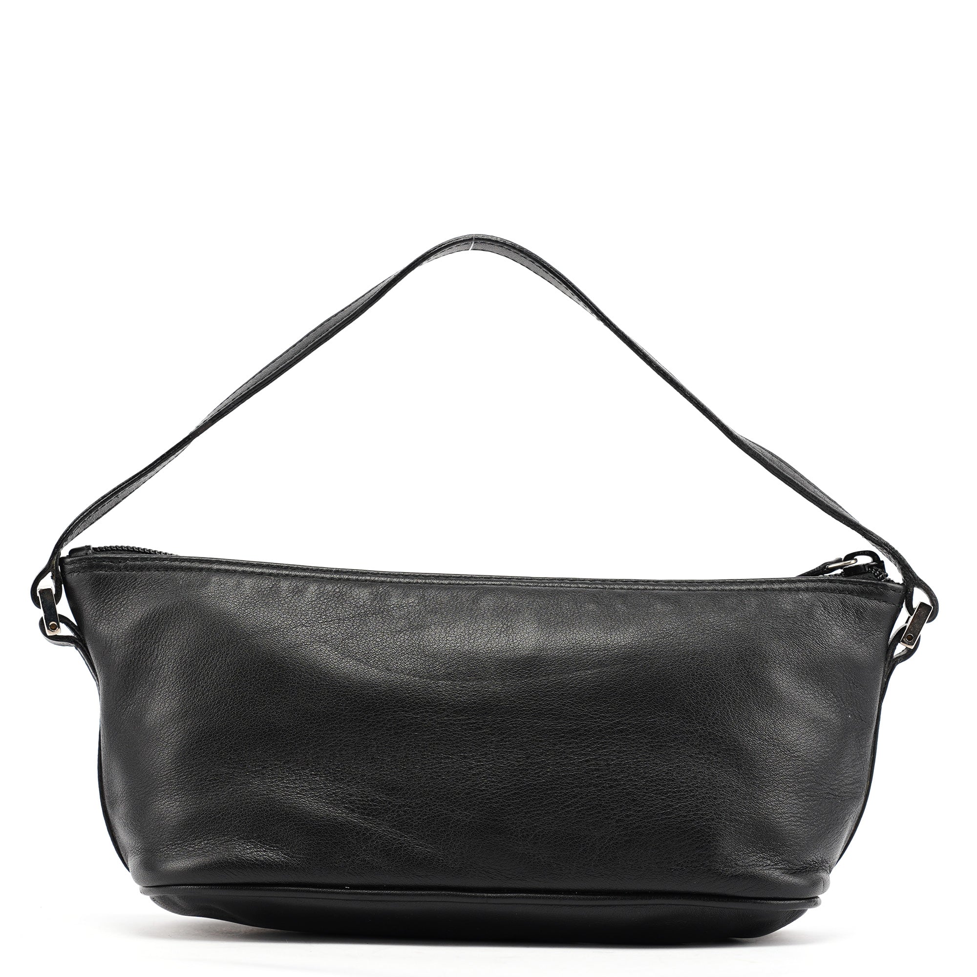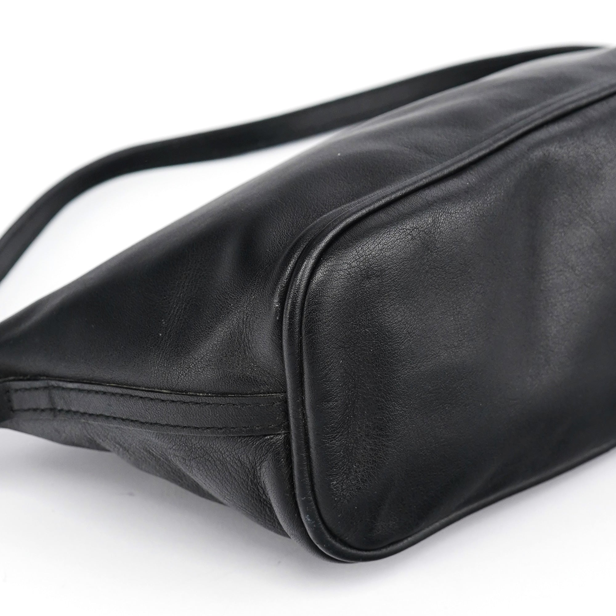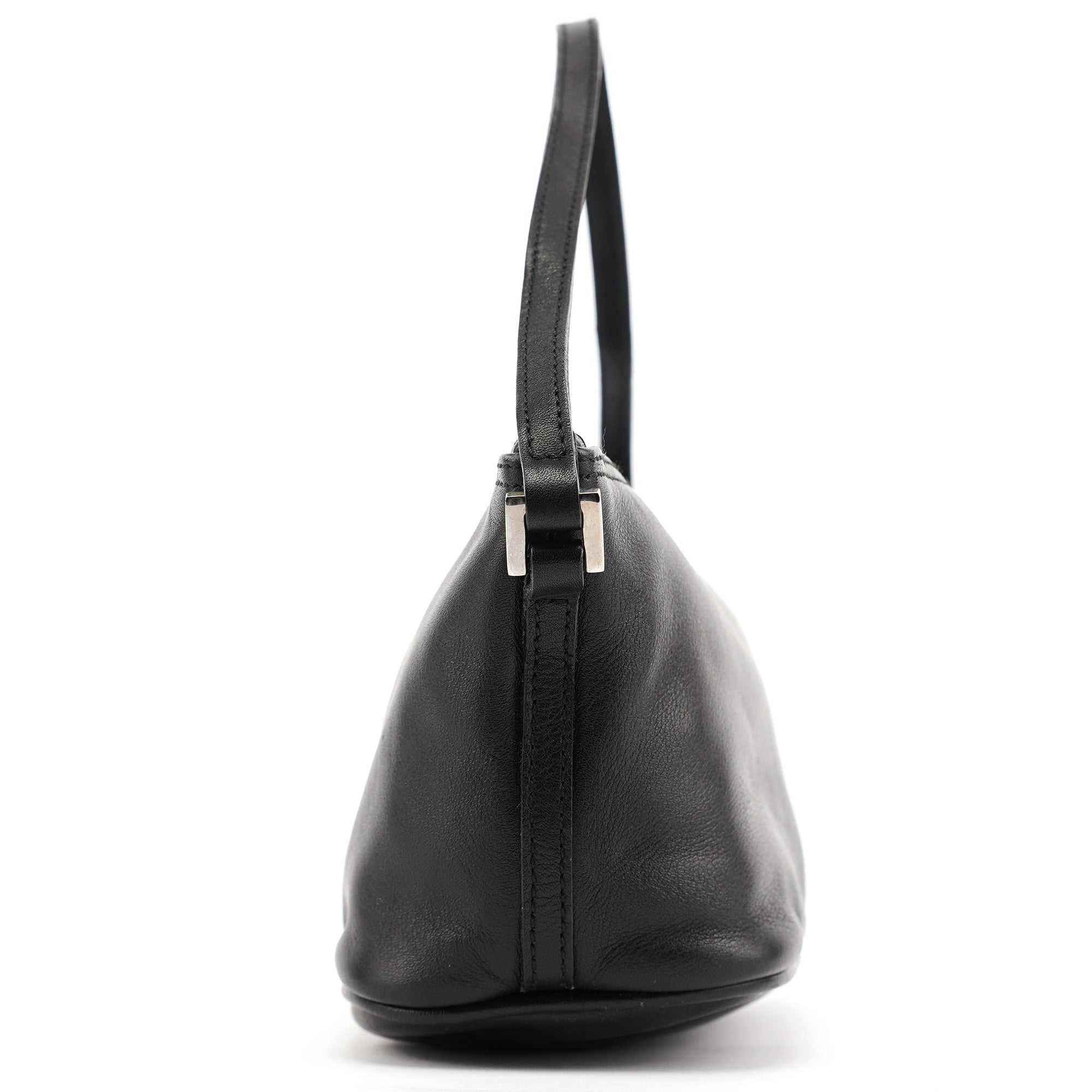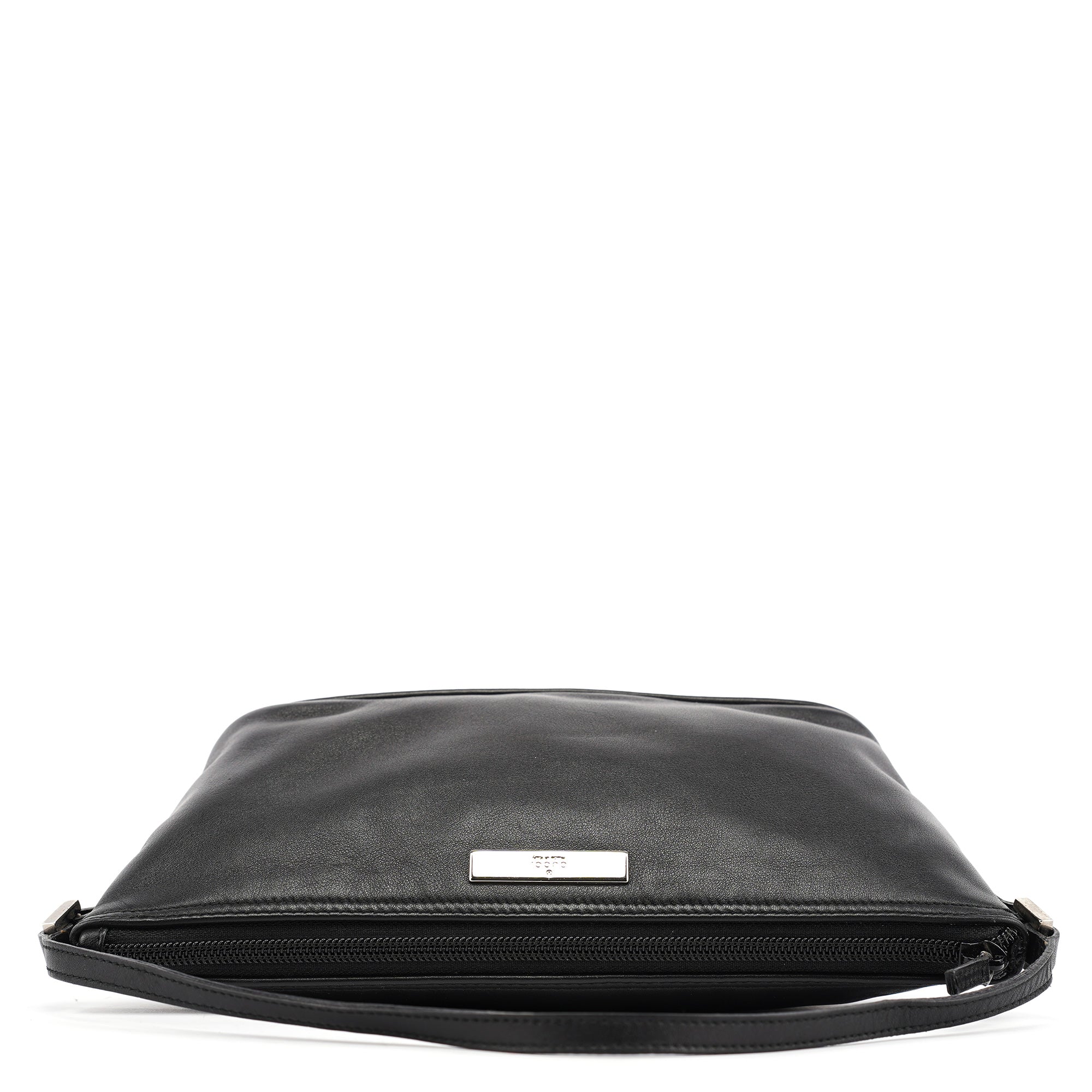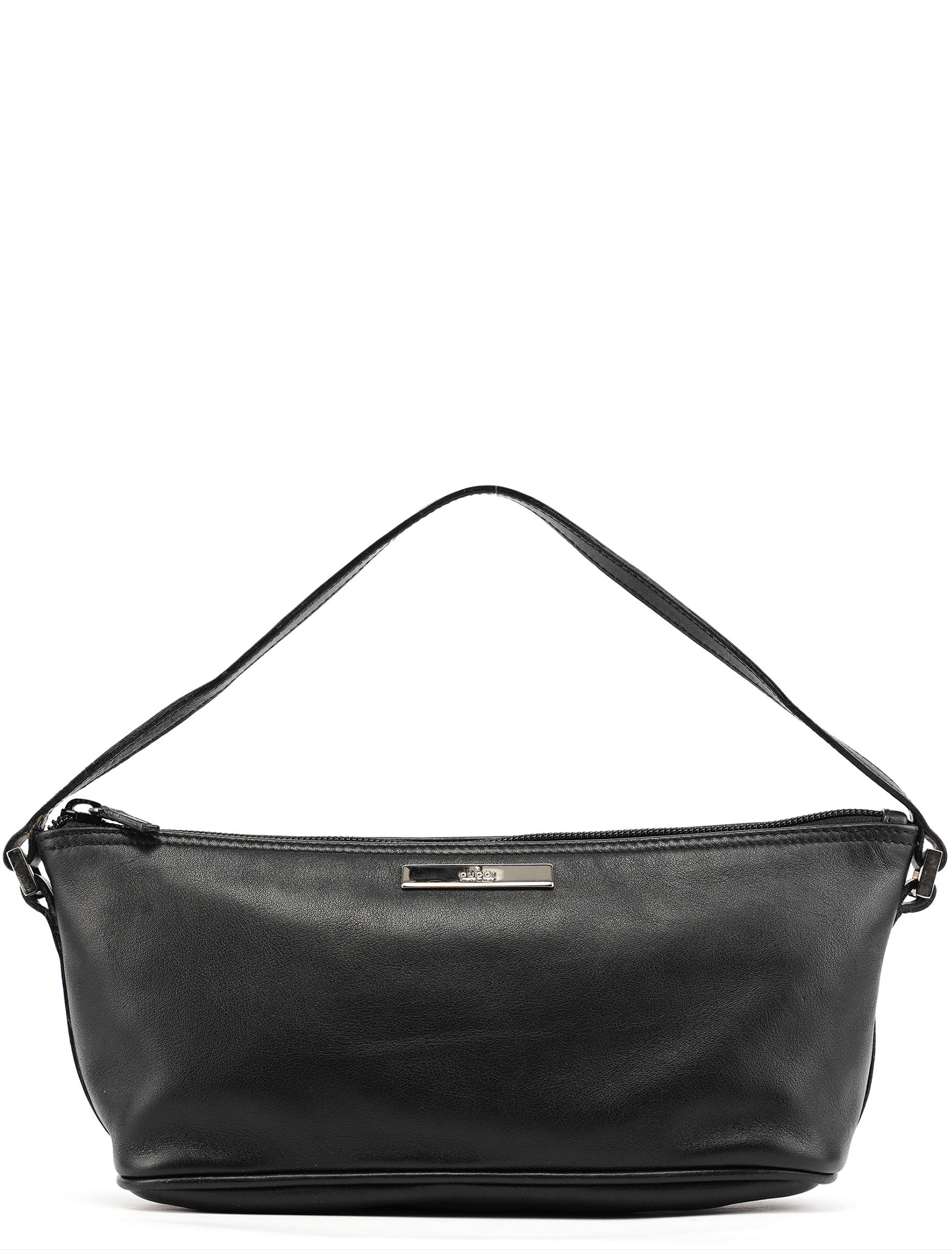 Designed in the late 1990's by Tom Ford, this vintage Gucci Boat Pochette features black calfskin leather in a structured boat-shaped silhouette with a silver-tone Gucci logo plaque on the front. The bag has a single strap, silver-tone hardware and closes with a top zip. The interior is lined in black satin.
