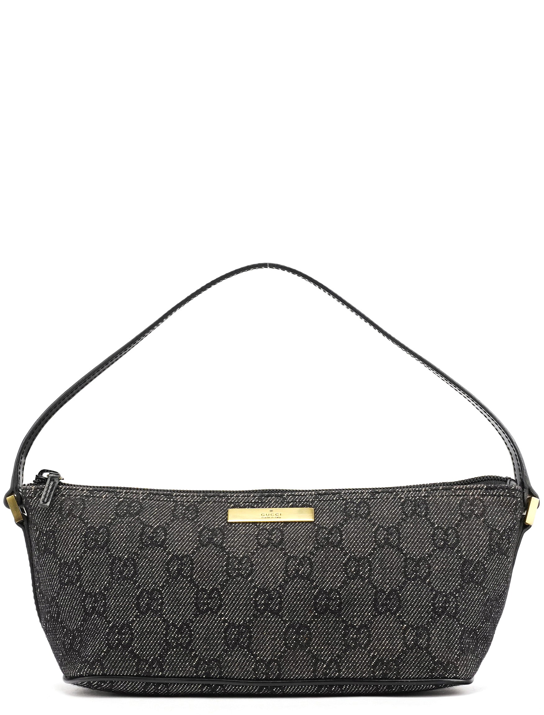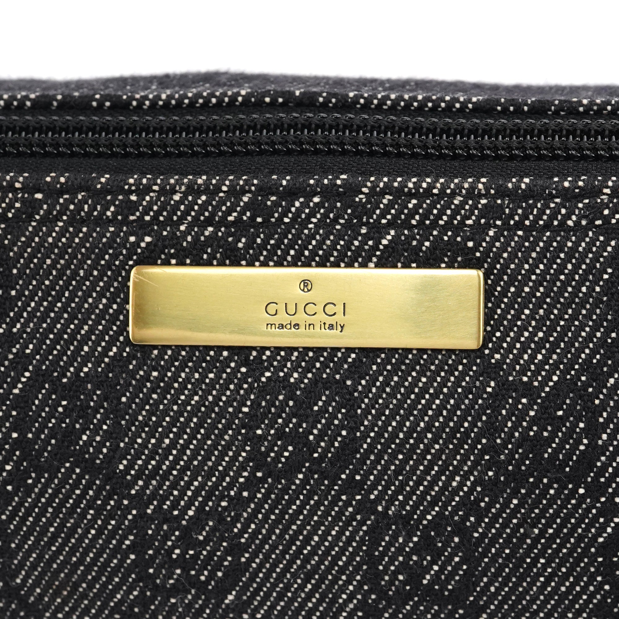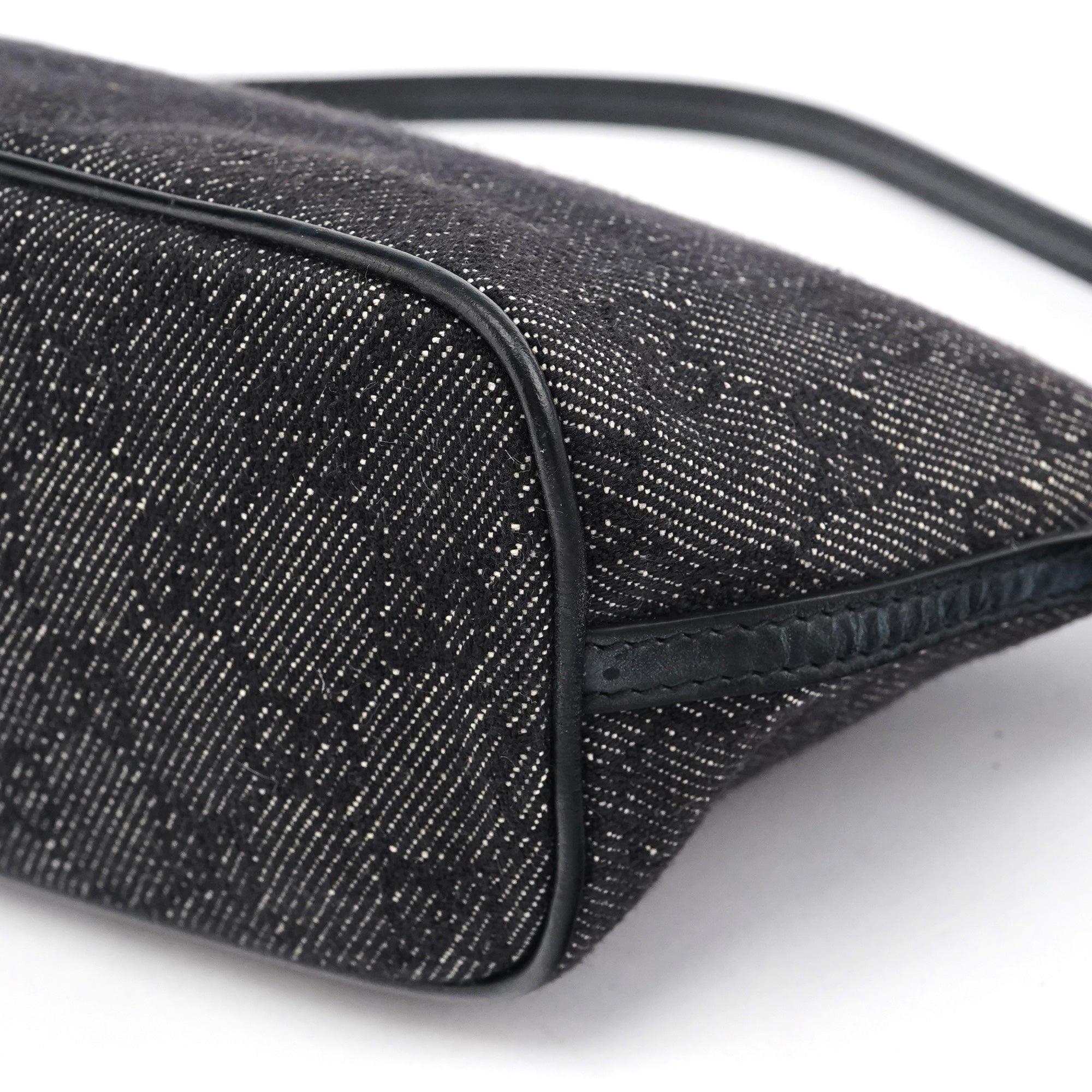 Designed in the early 2000s by Tom Ford, this Gucci GG Boat Pochette features anthracite denim canvas woven with a metallic GG monogram. The minimalist baguette silhouette includes a black patent leather shoulder strap and polished gold-tone hardware. It features a rectangular Gucci logo plaque and a top zip closure.