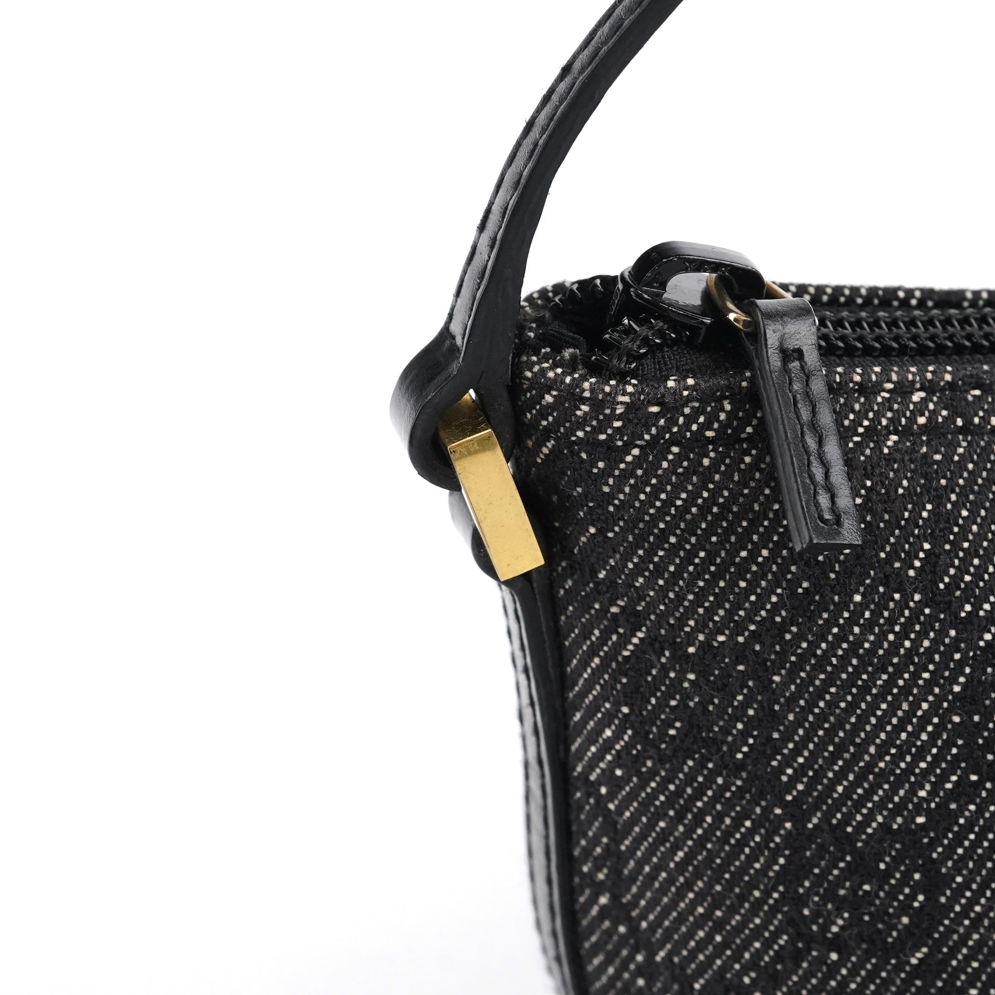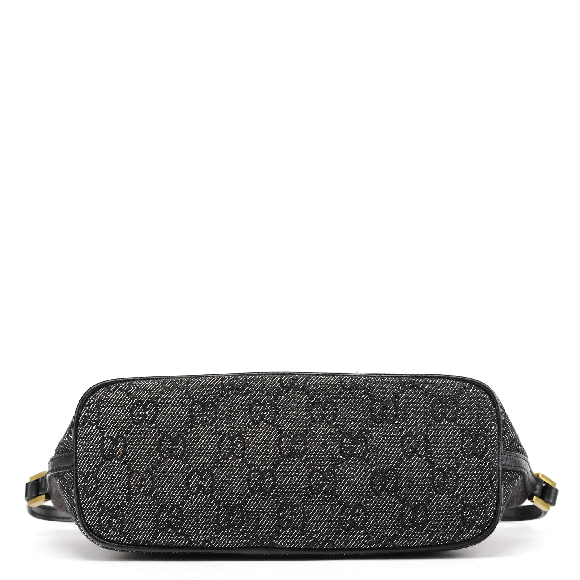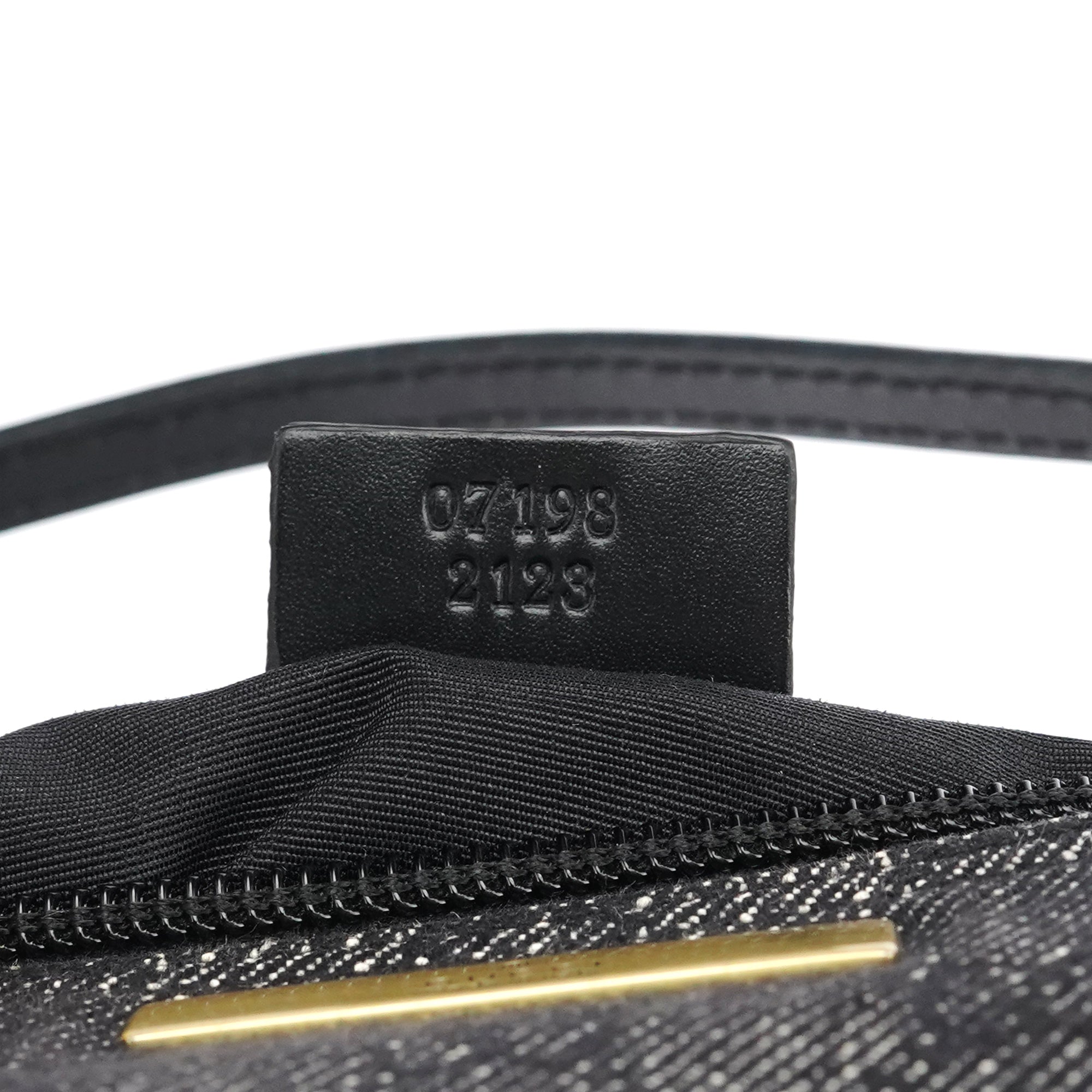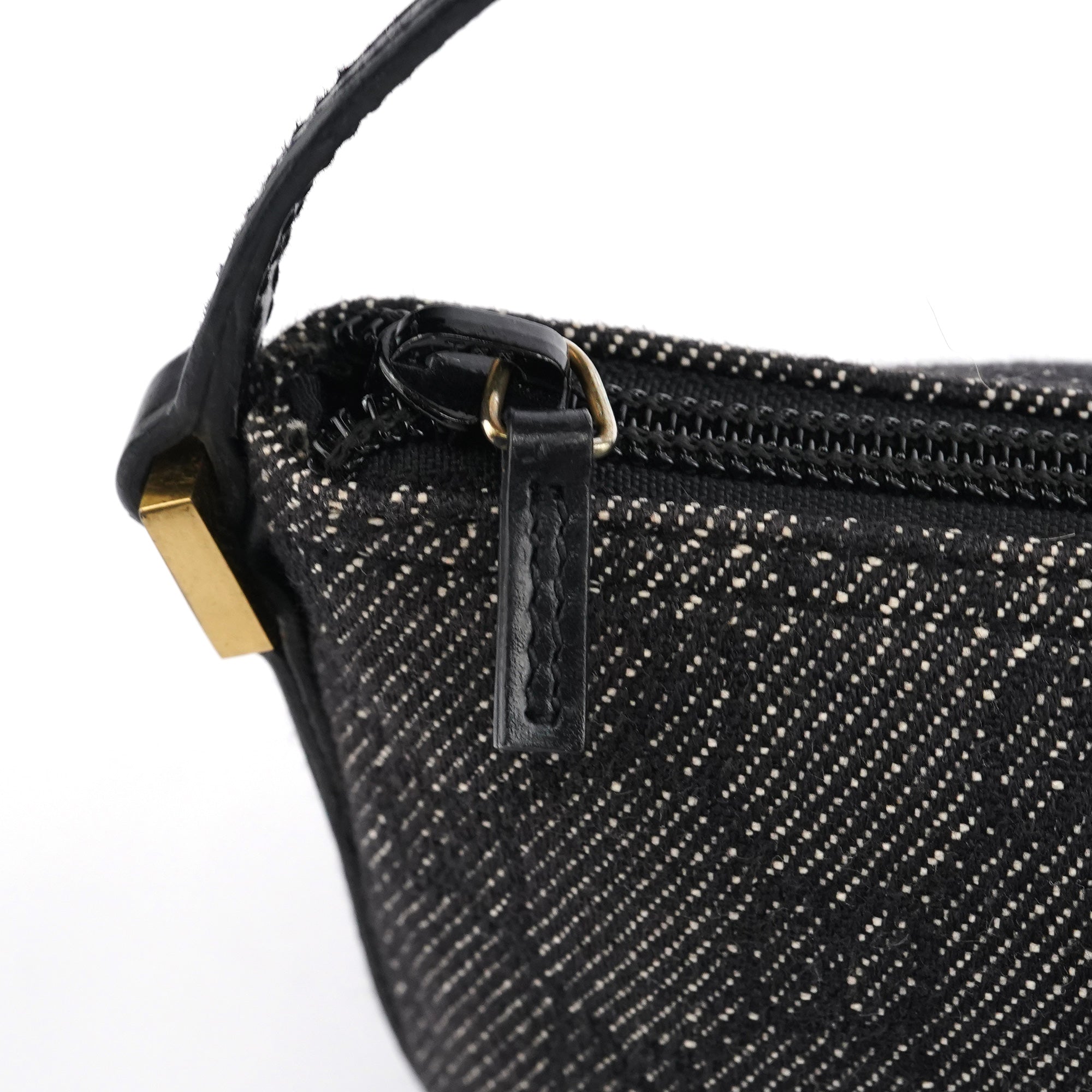 Designed in the early 2000s by Tom Ford, this Gucci GG Boat Pochette features anthracite denim canvas woven with a metallic GG monogram. The minimalist baguette silhouette includes a black patent leather shoulder strap and polished gold-tone hardware. It features a rectangular Gucci logo plaque and a top zip closure.