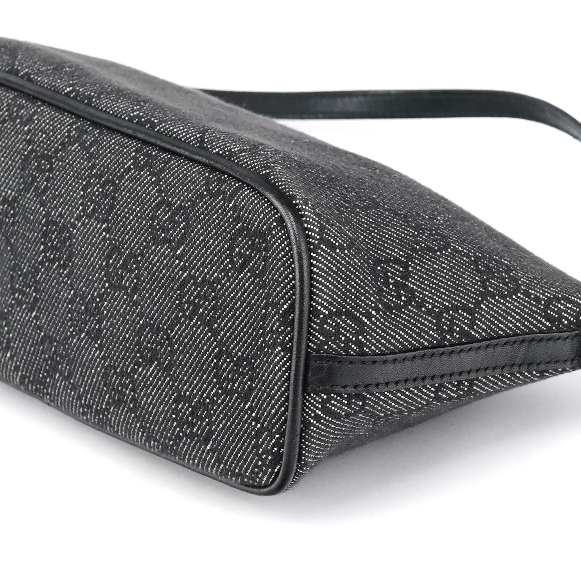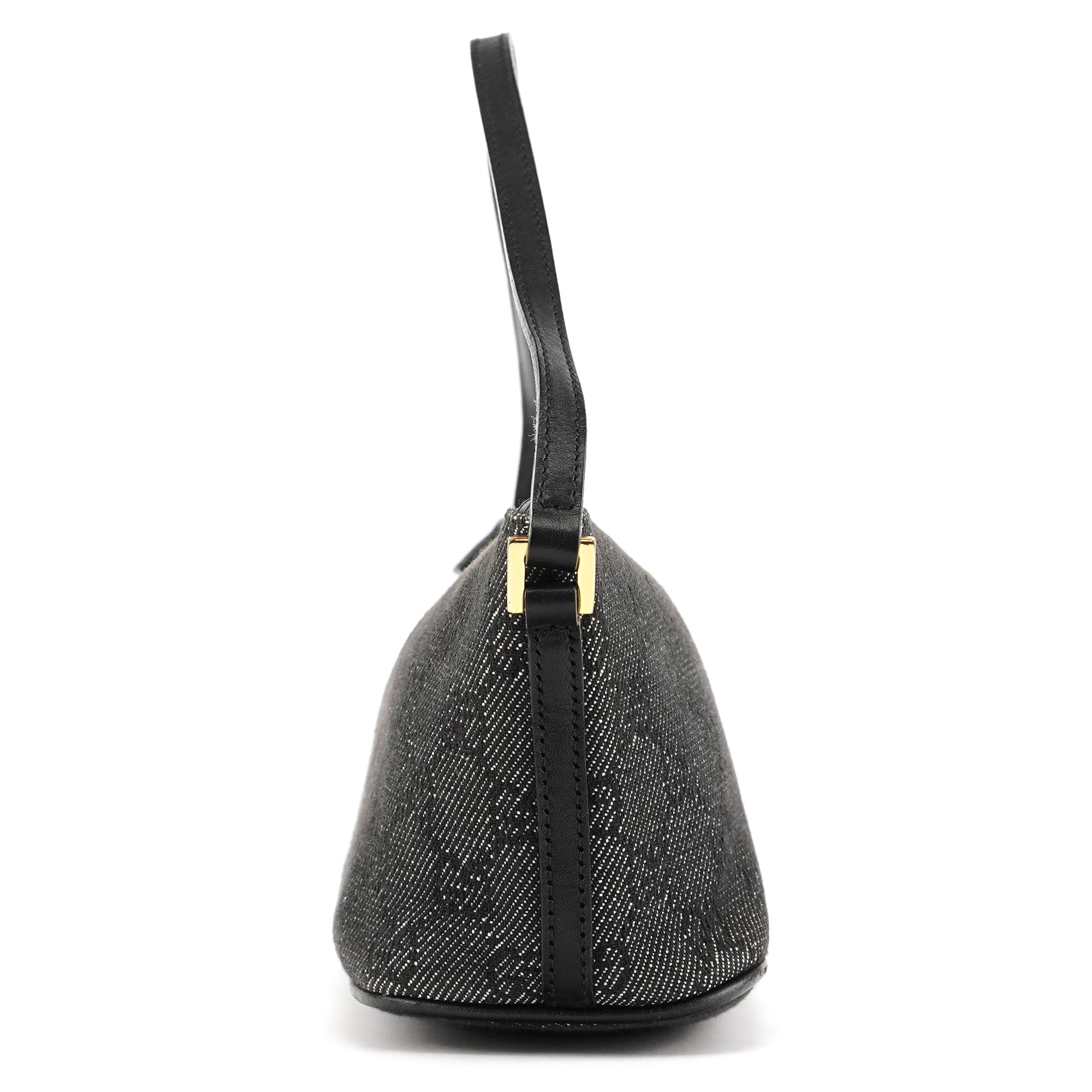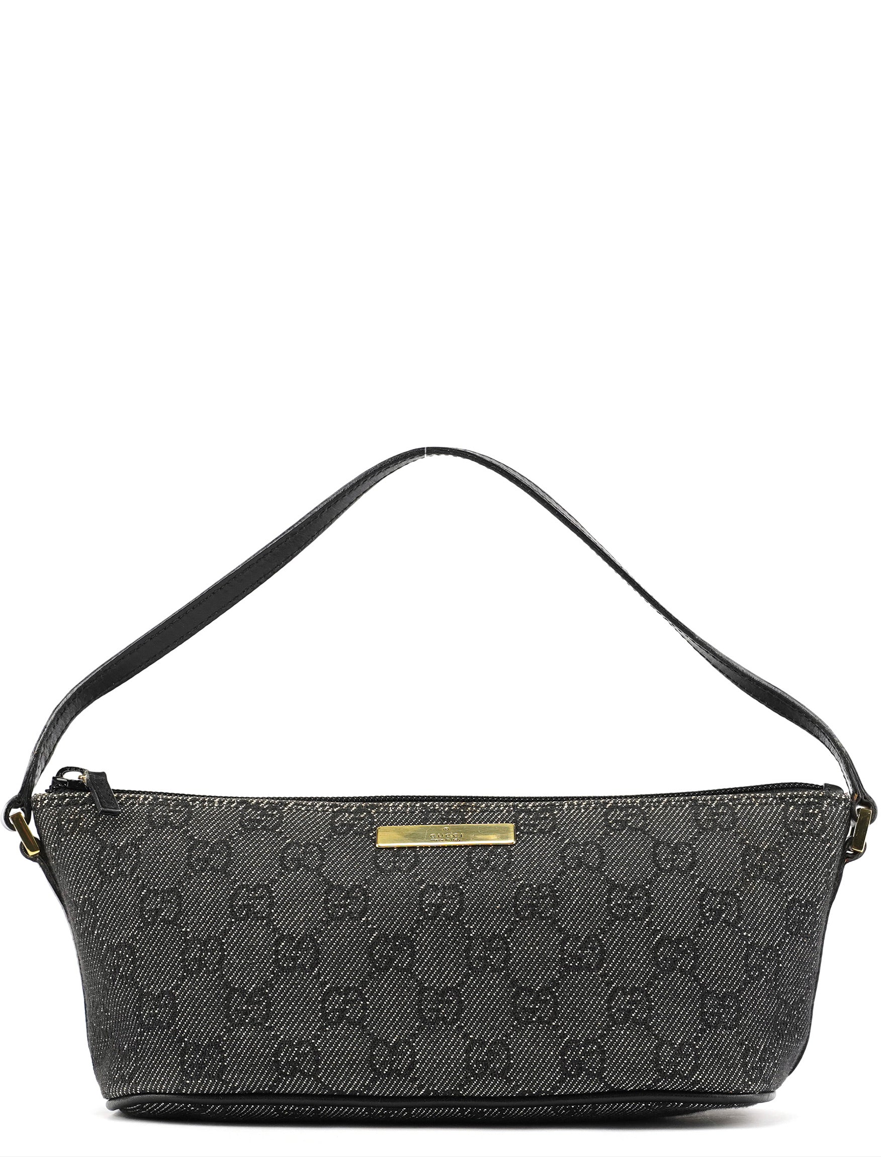 Designed in the early 2000s by Tom Ford, this Gucci GG Boat Pochette features anthracite denim canvas woven with a metallic GG monogram. The minimalist baguette silhouette includes a black patent leather shoulder strap and polished gold-tone hardware. It features a rectangular Gucci logo plaque and a top zip closure.