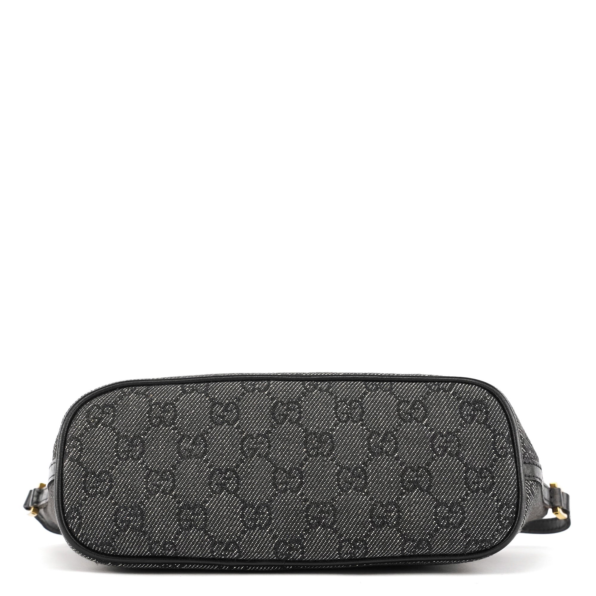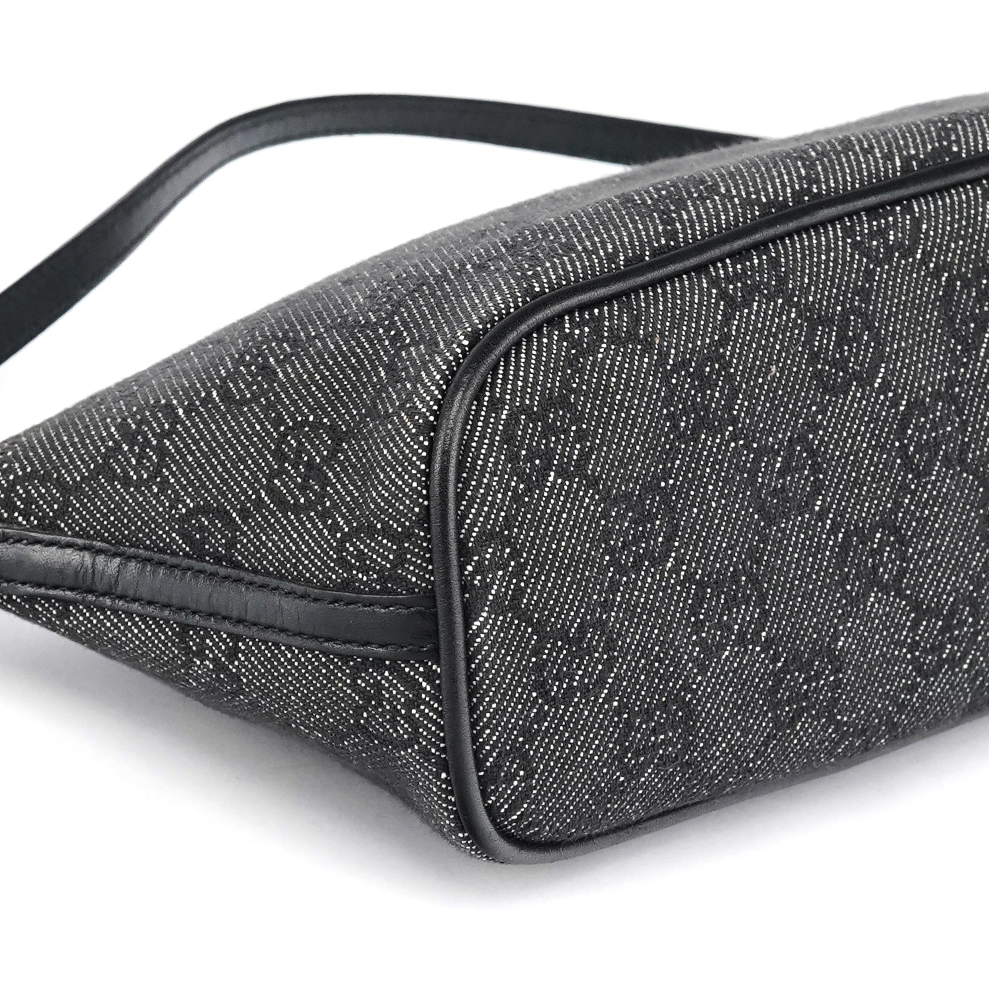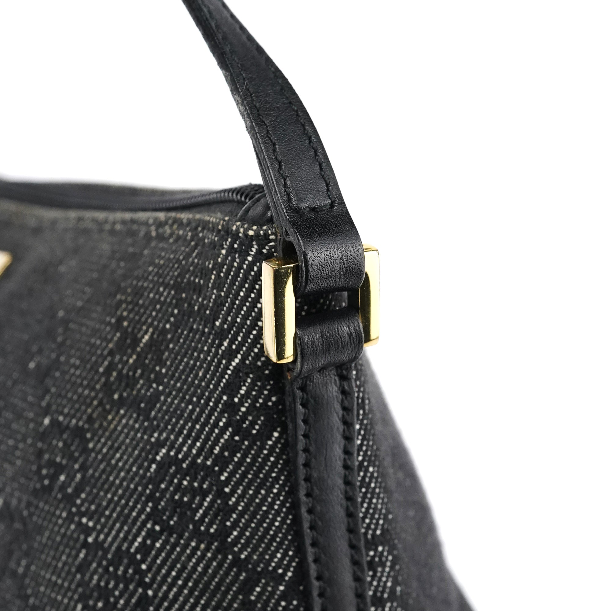 Designed in the early 2000s by Tom Ford, this Gucci GG Boat Pochette features anthracite denim canvas woven with a metallic GG monogram. The minimalist baguette silhouette includes a black patent leather shoulder strap and polished gold-tone hardware. It features a rectangular Gucci logo plaque and a top zip closure.