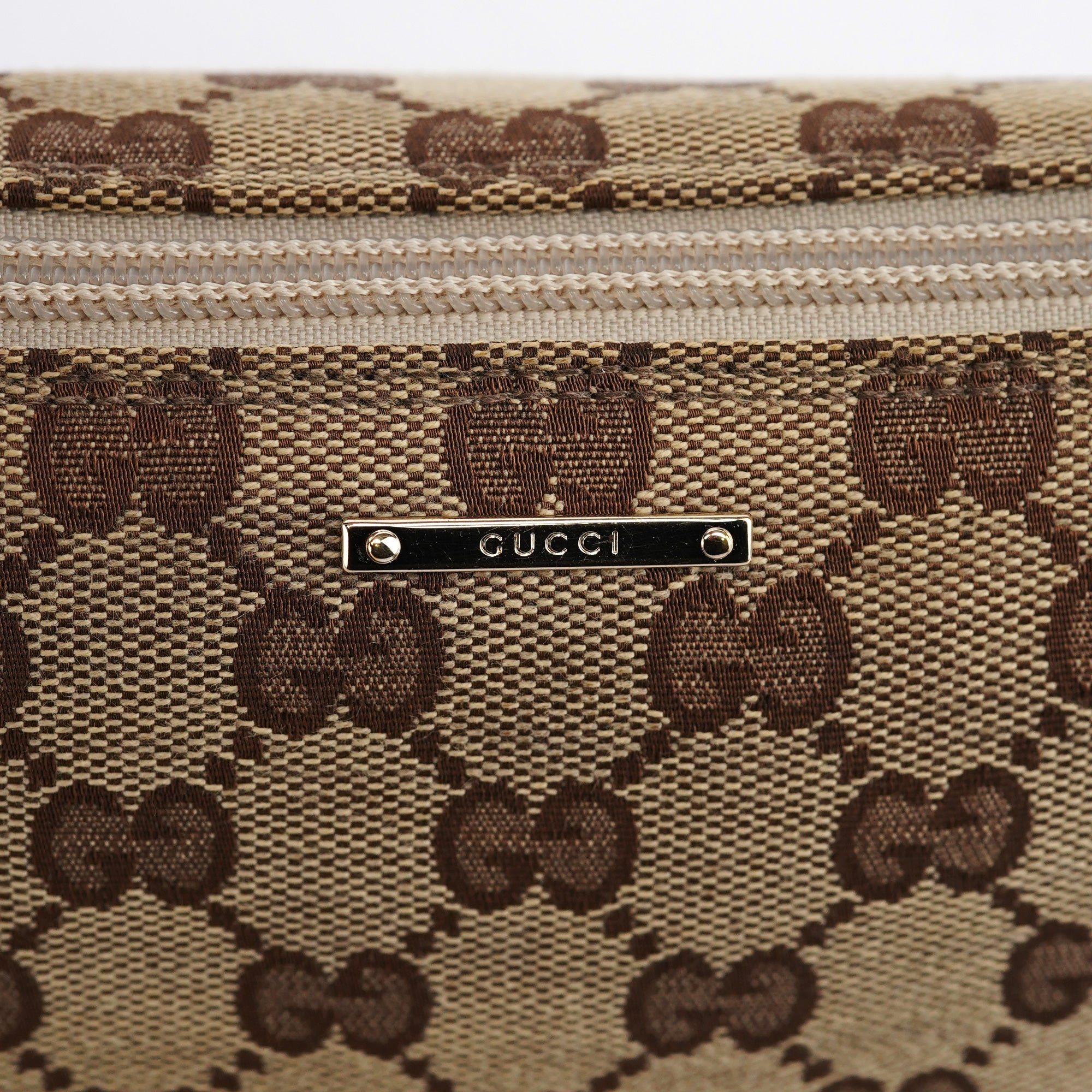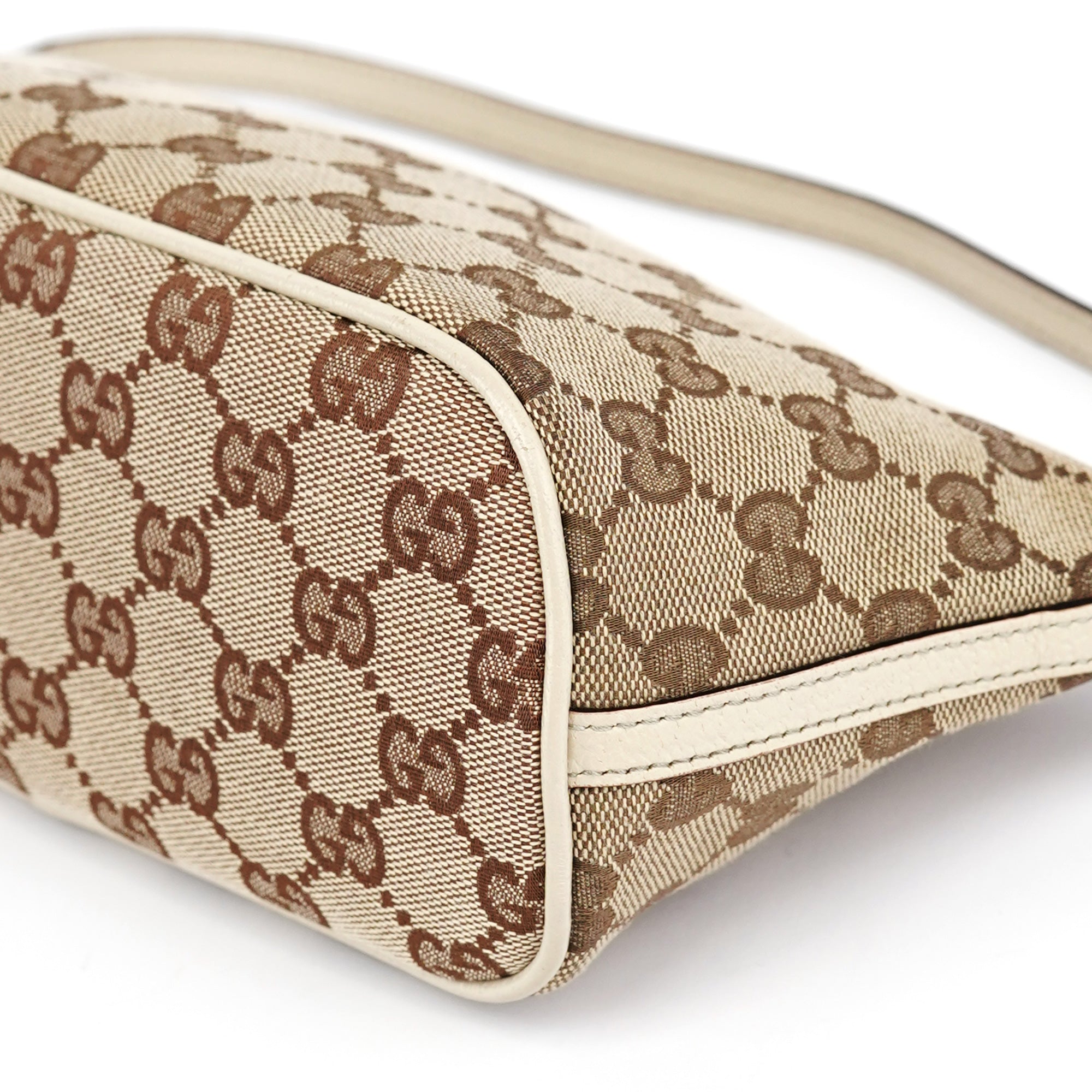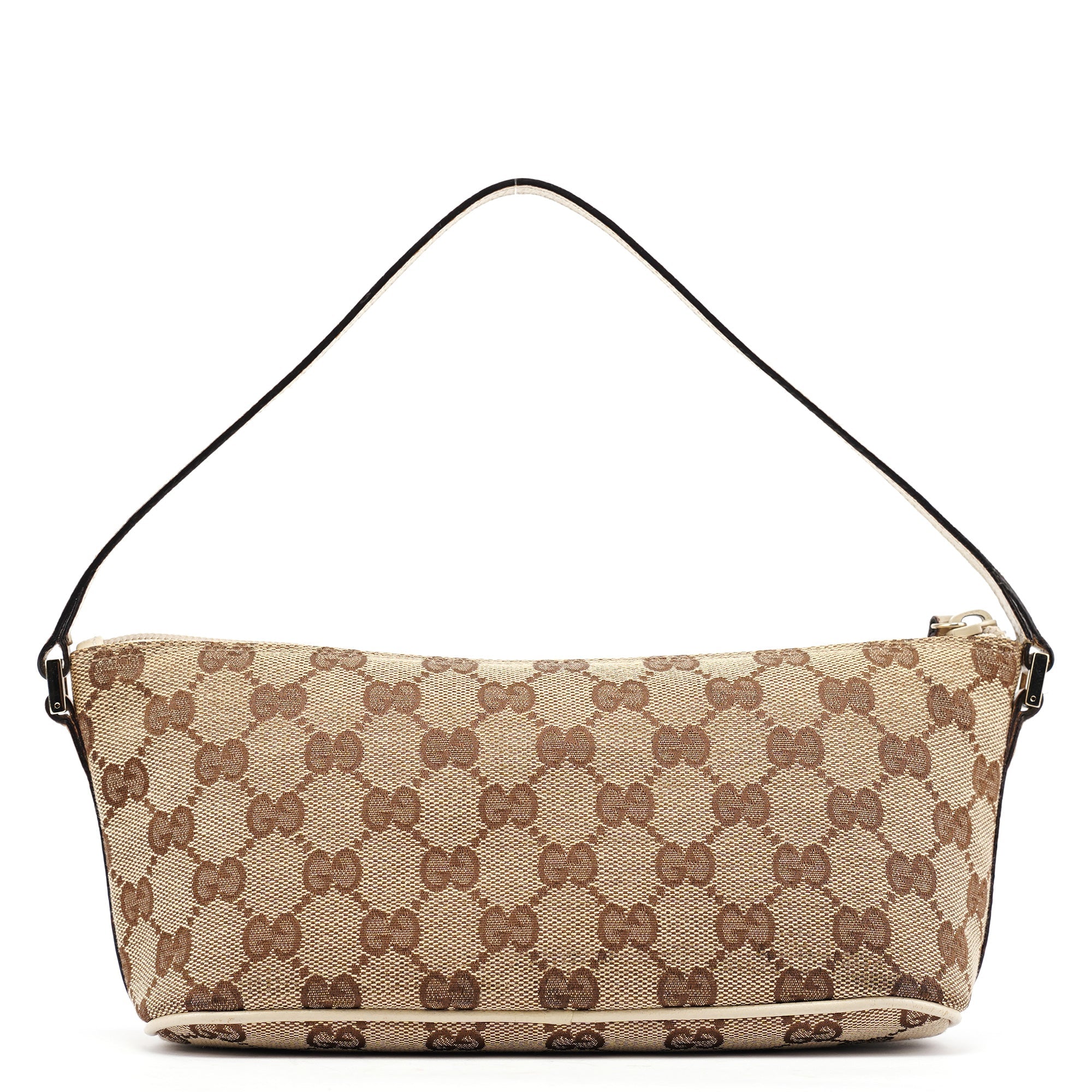 Designed in the early 2000's by Tom Ford, this vintage Gucci GG Boat Pochette features beige and brown GG monogram canvas with white leather trim. The curved boat shape offers a distinctive silhouette, while a zip closure with an embossed Gucci logo secures the top. A single strap provides versatile carrying options.