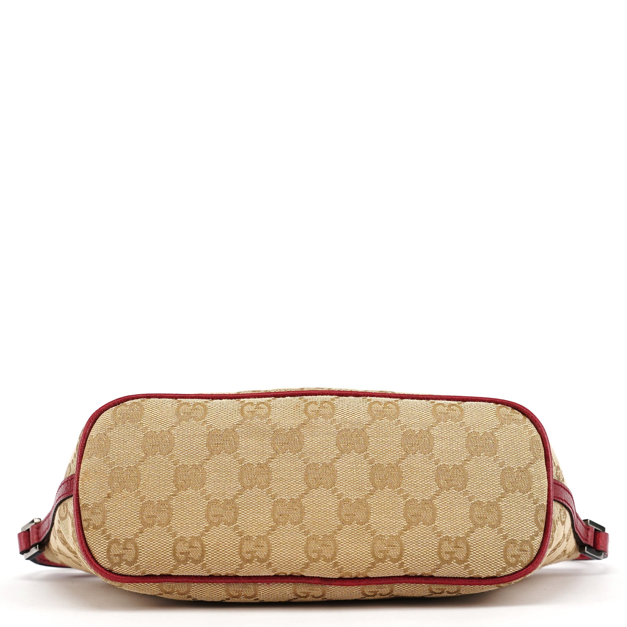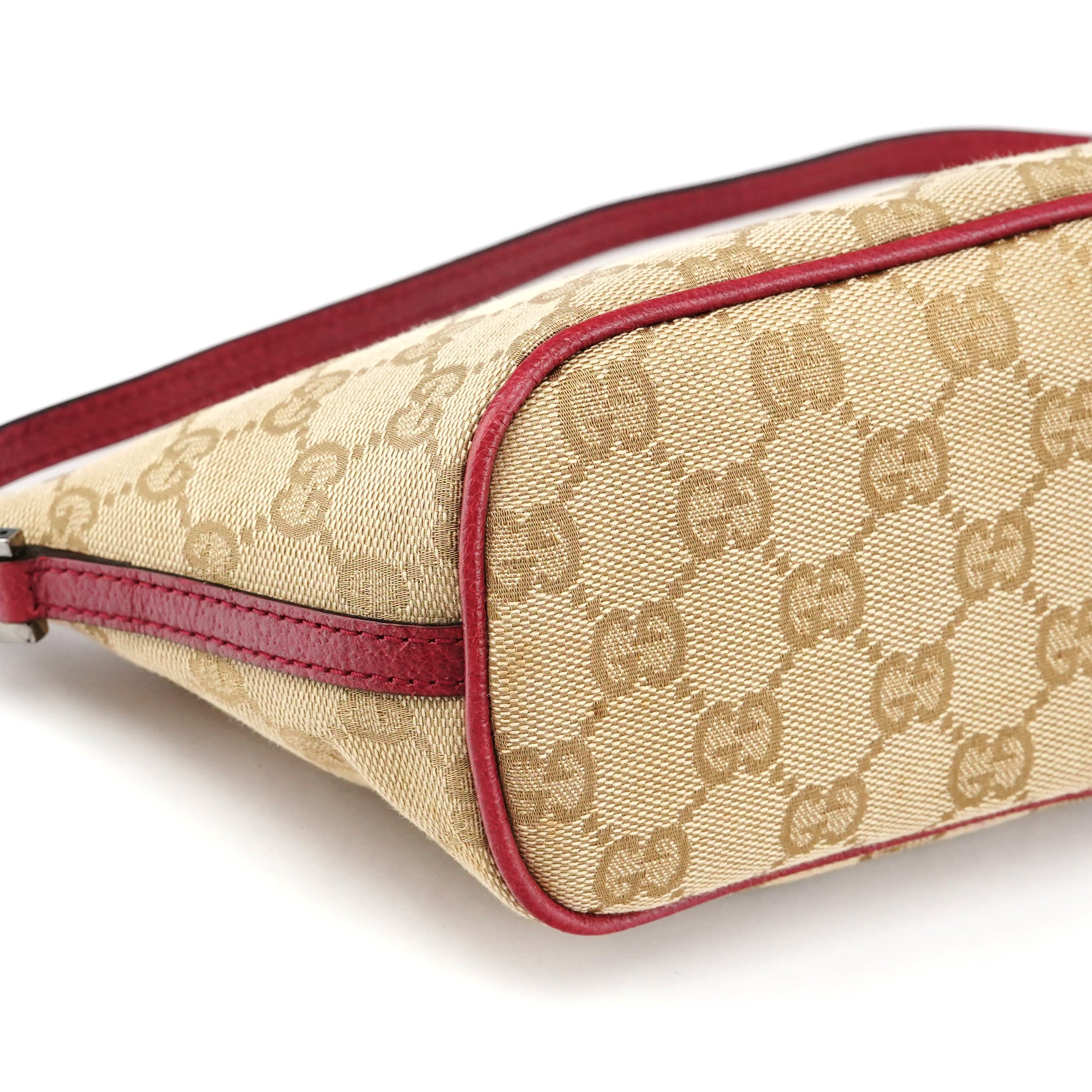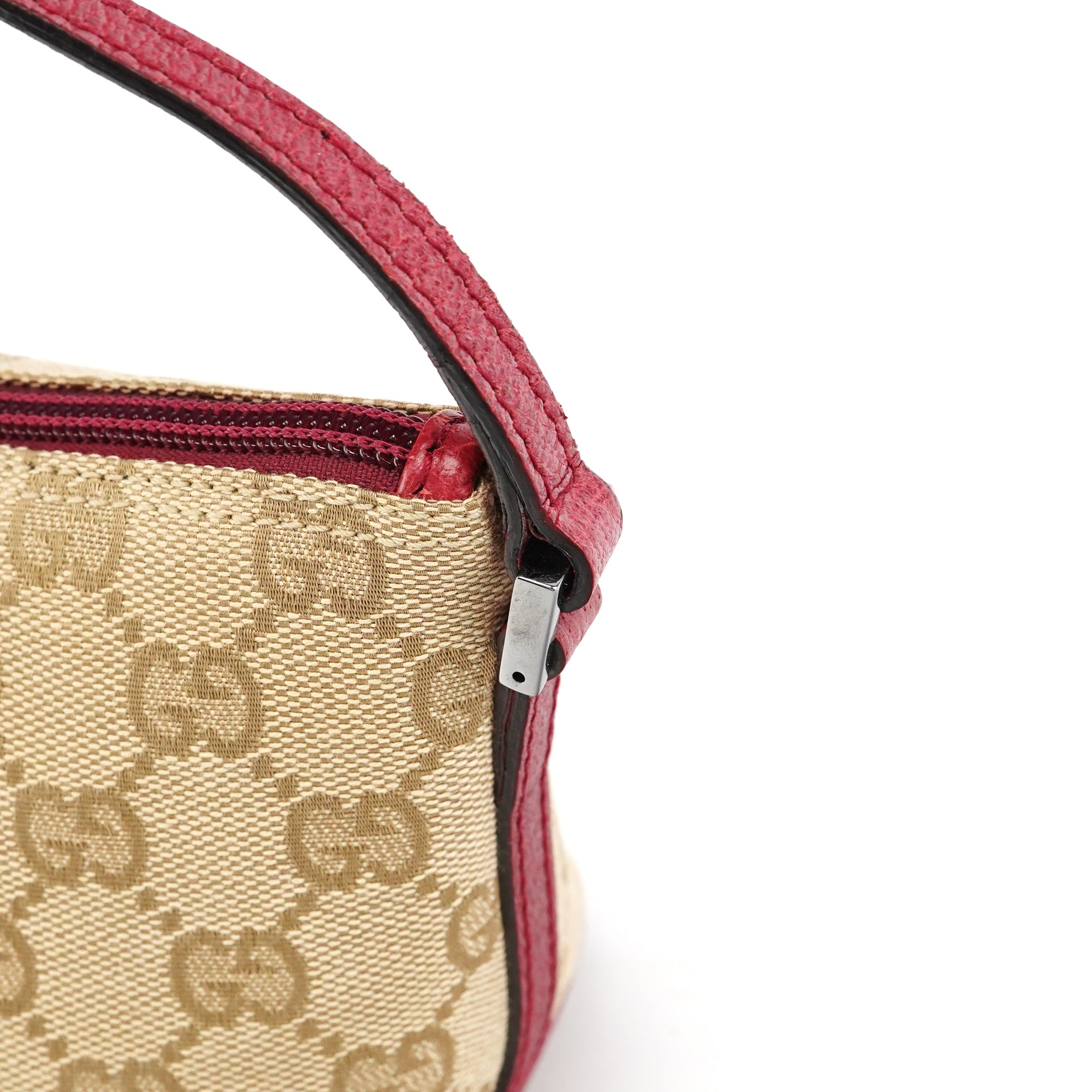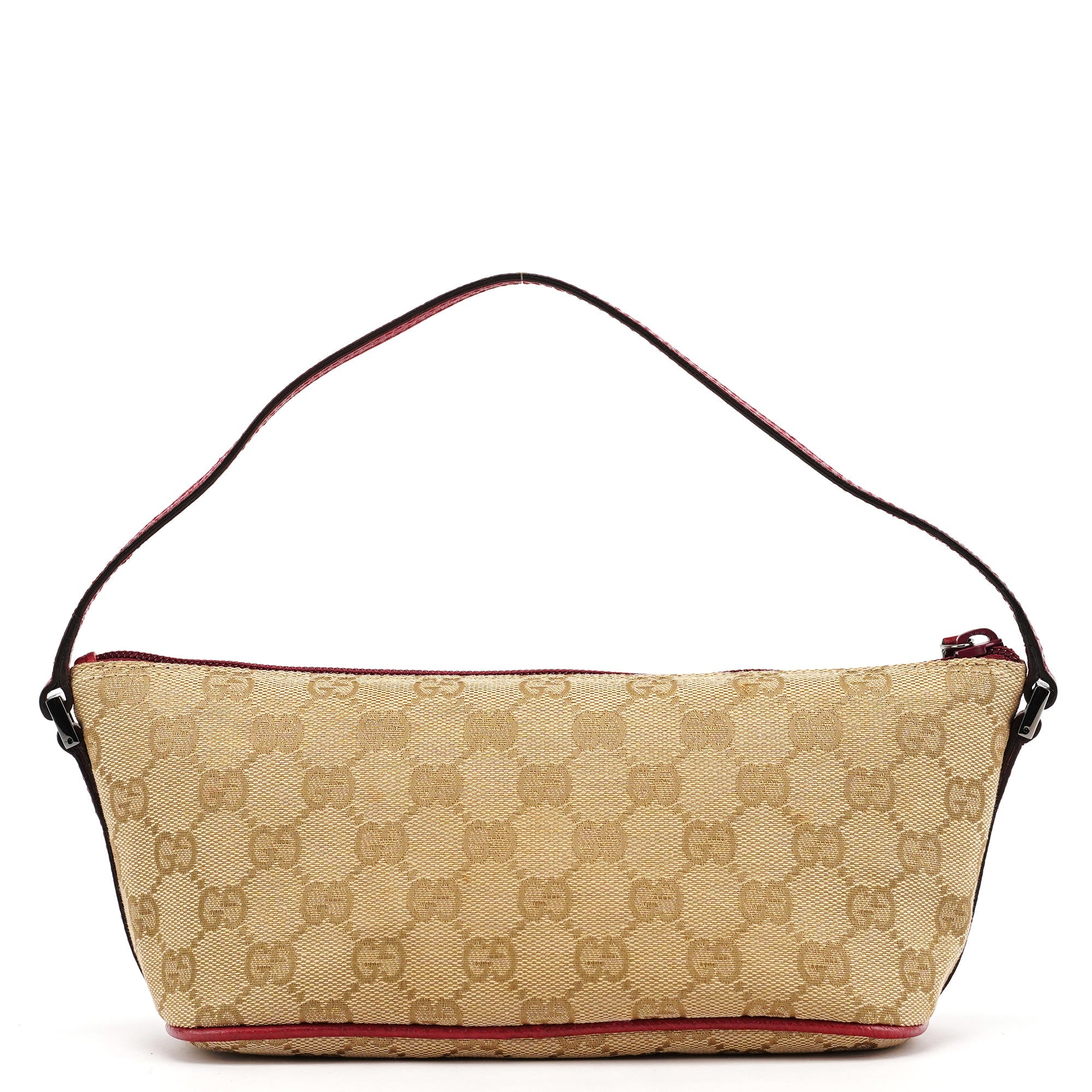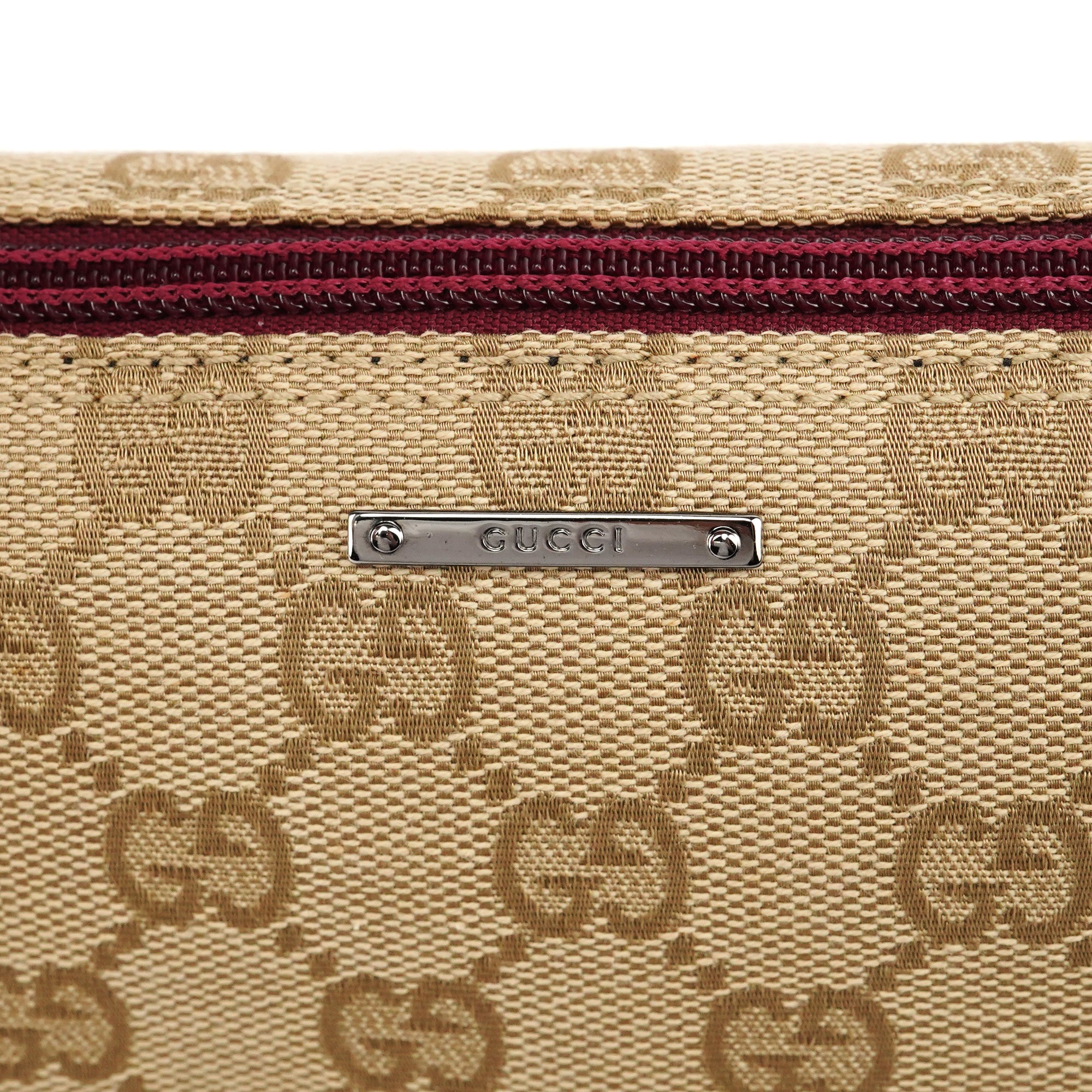 Designed in the late 1990s by Tom Ford, this Gucci GG Boat Pochette features beige GG monogram canvas with contrasting burgundy leather trim and silver hardware. The sleek, structured silhouette includes a zip closure and a slim shoulder strap. The interior is lined in black fabric and fitted with a zip pocket for small essentials.