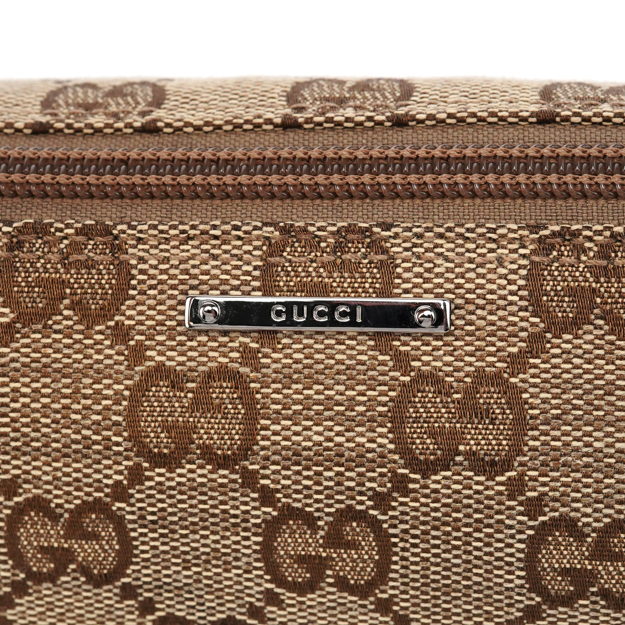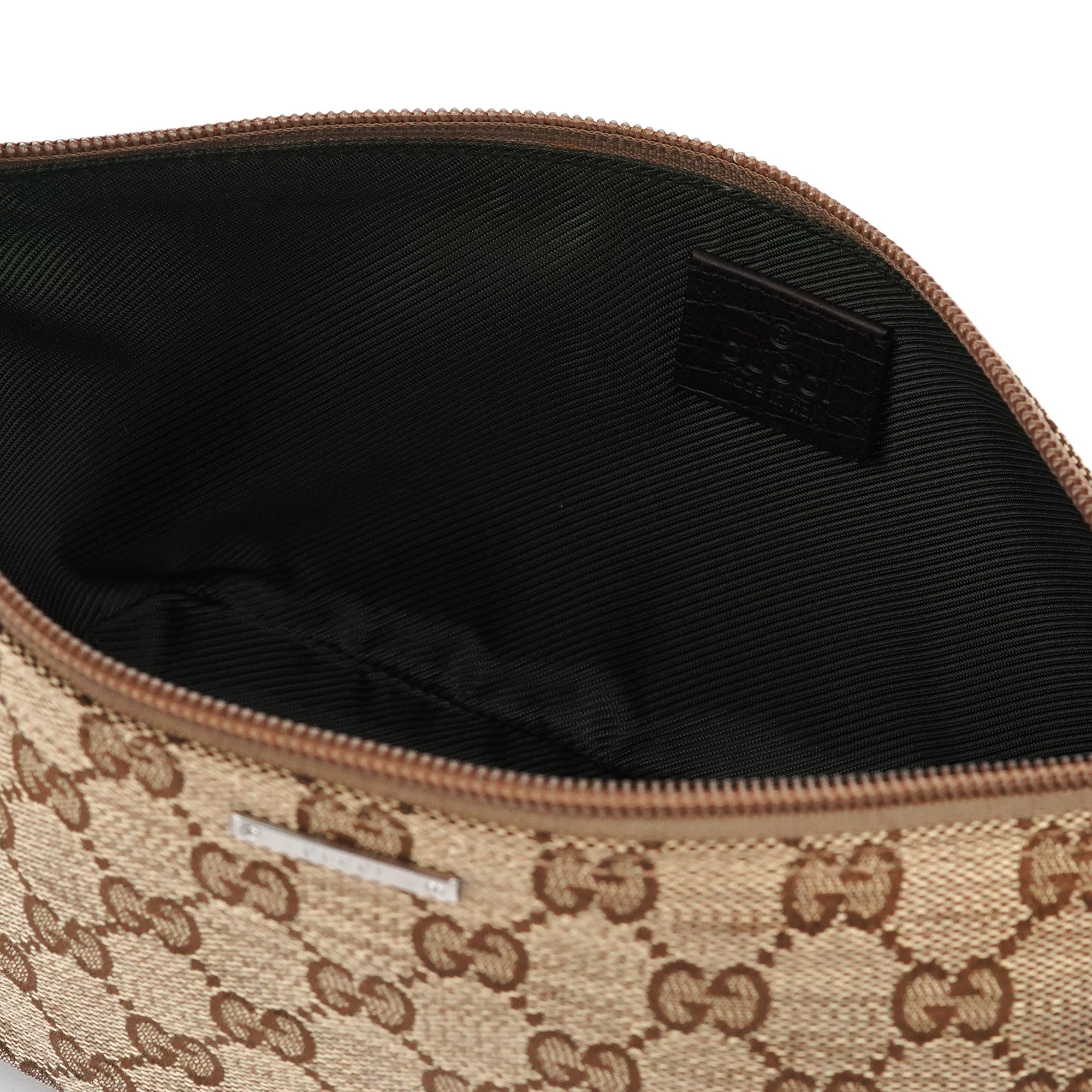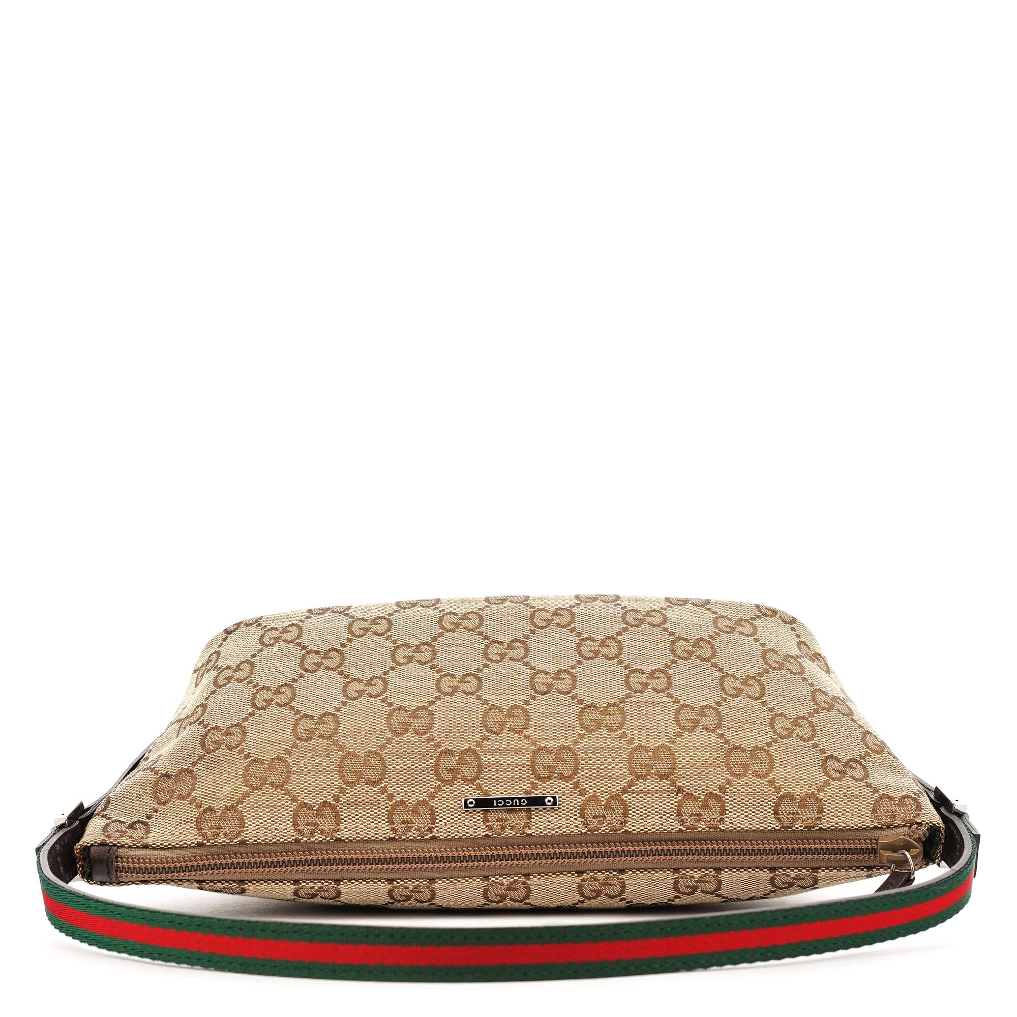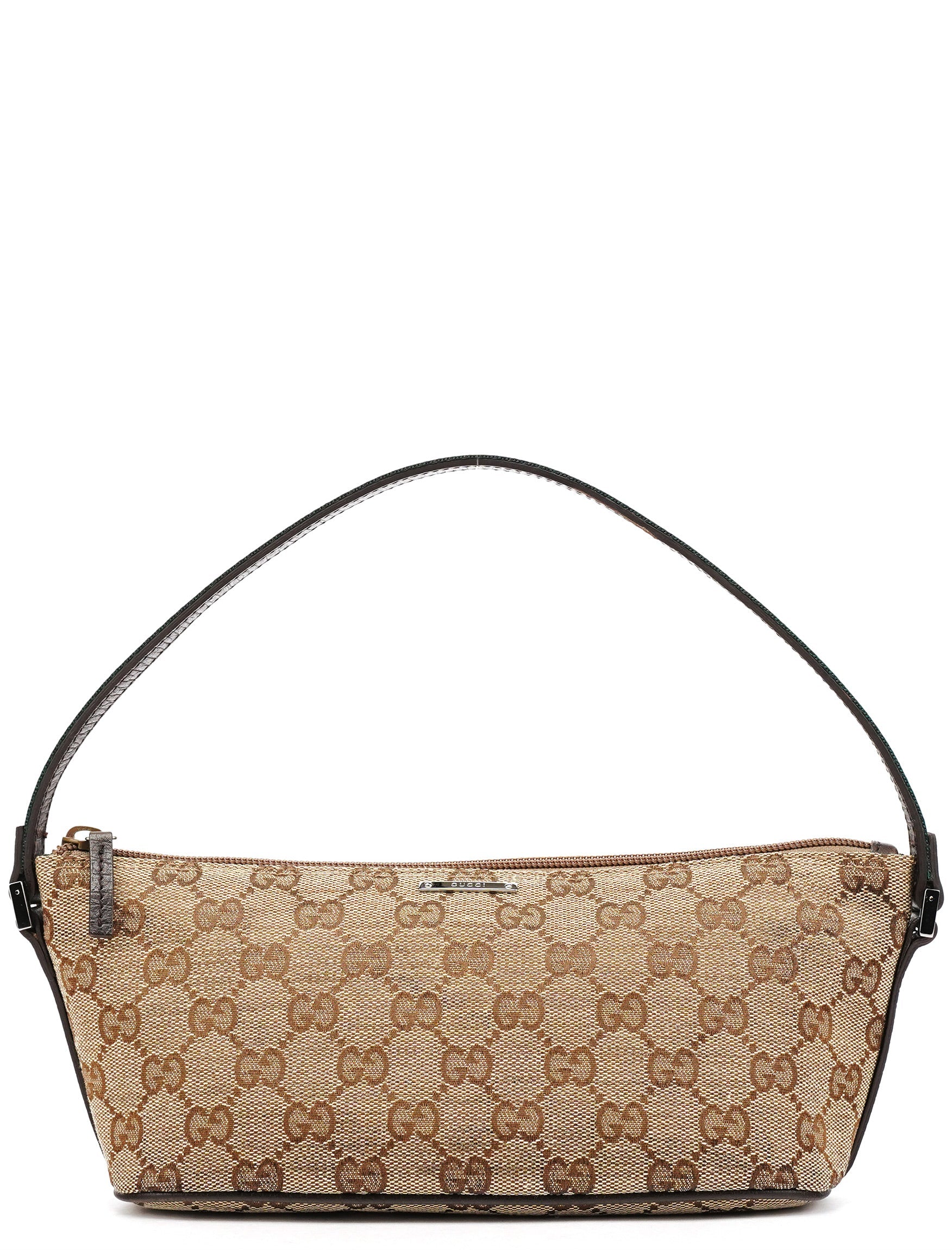 Designed in the early 2000s by Tom Ford, this Gucci GG Boat Pochette is crafted from beige and brown monogram canvas. The slim baguette silhouette features dark brown leather trim and silver-tone hardware accents. It includes a single shoulder strap detailed with the iconic red and green web stripe, and a simple fabric-lined interior.