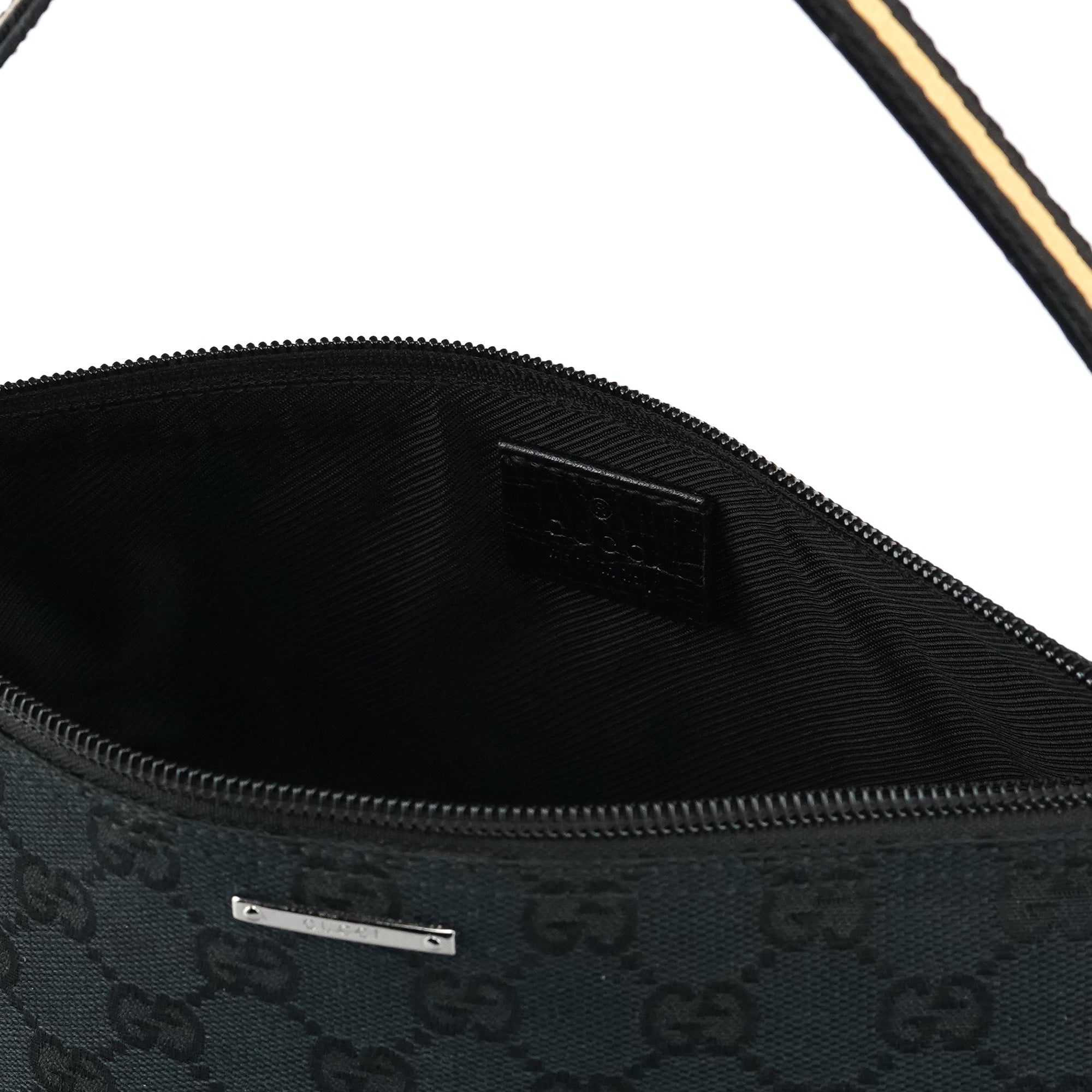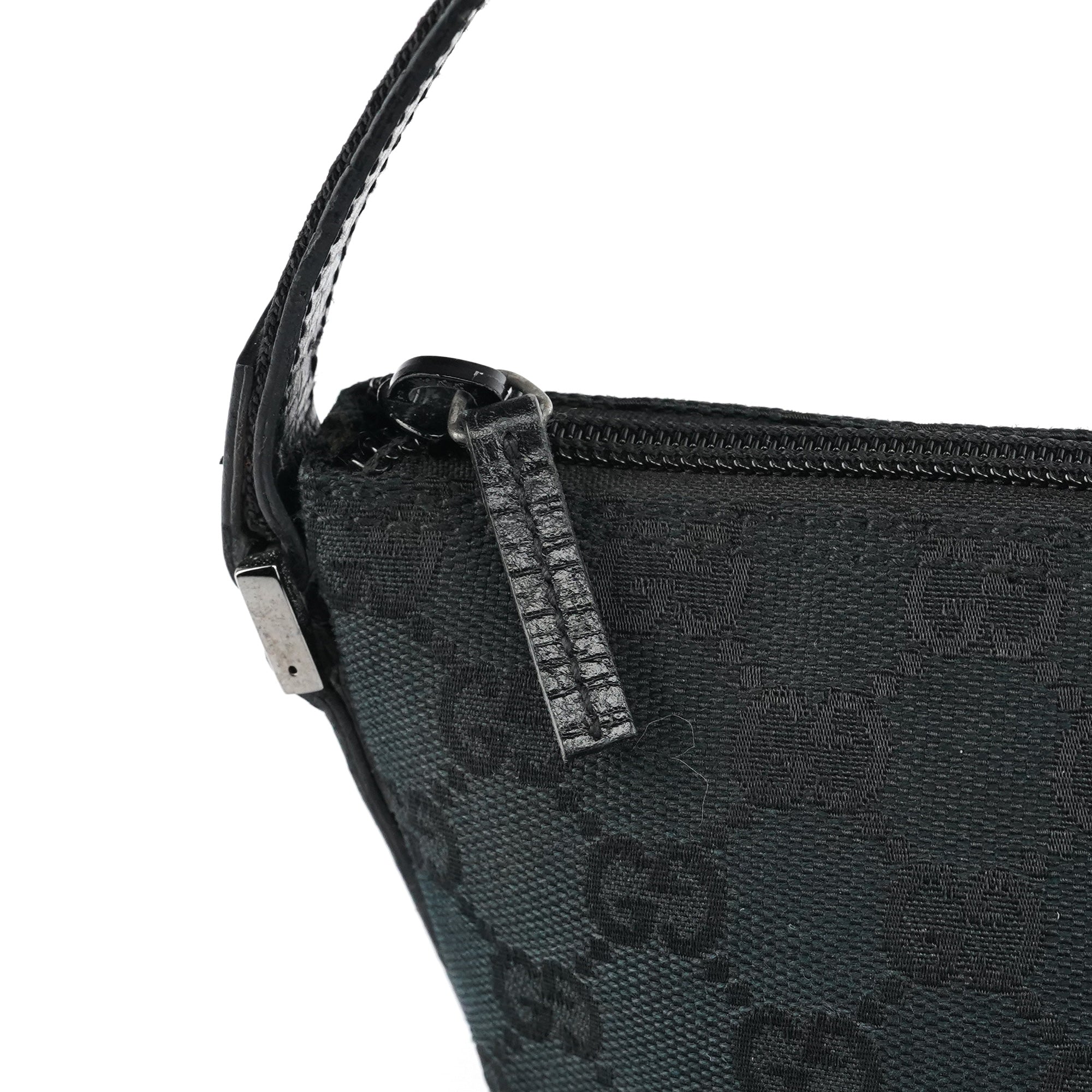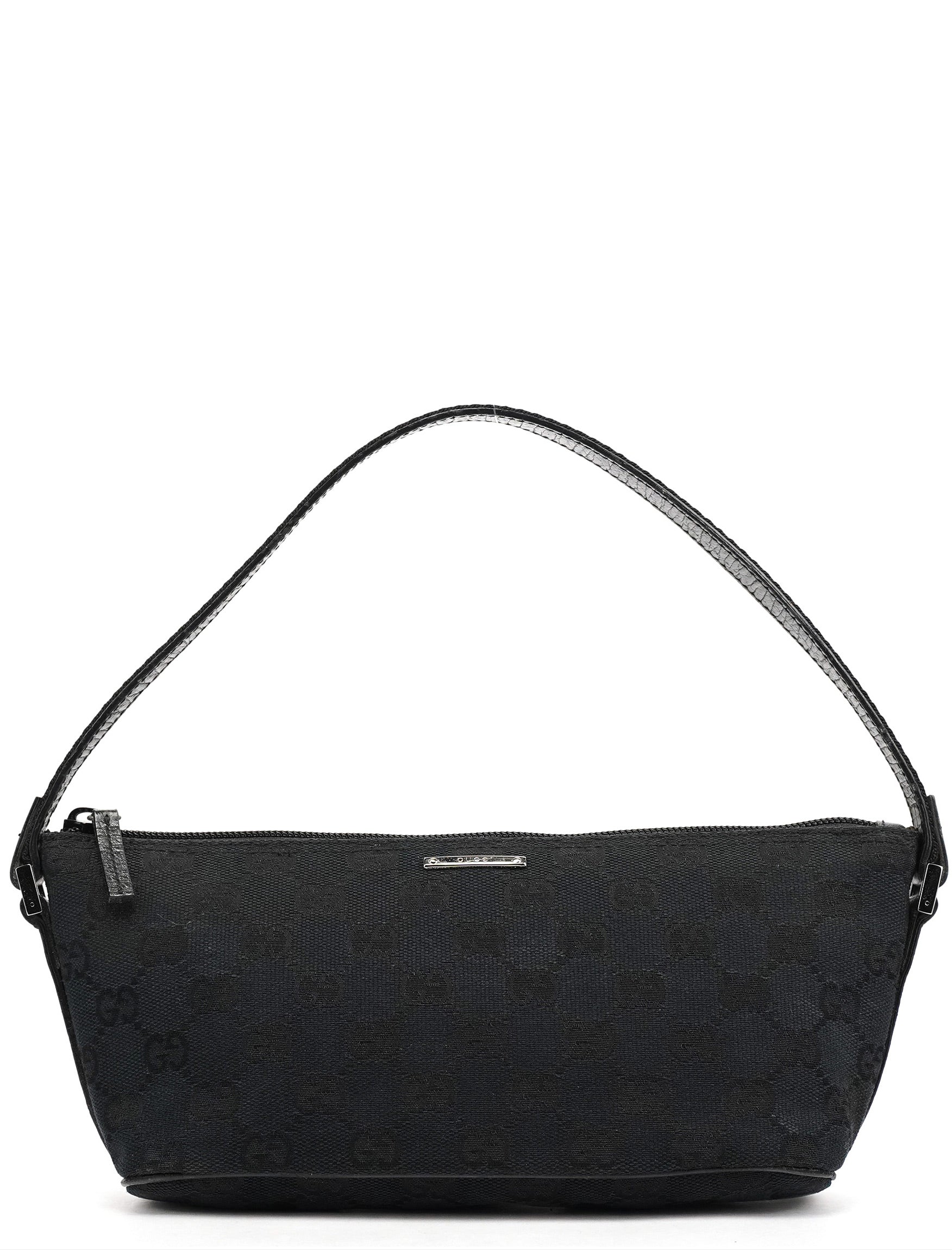 Designed in the early 2000s by Tom Ford, this Gucci GG Boat Pochette is crafted from anthracite GG monogram canvas with black leather trim. The compact silhouette features a top zip closure with a matching leather pull, a single top strap with a subtle yellow accent, and a silver-tone logo plaque at the front. Its minimalist design captures the sleek sophistication of Ford’s Gucci era.