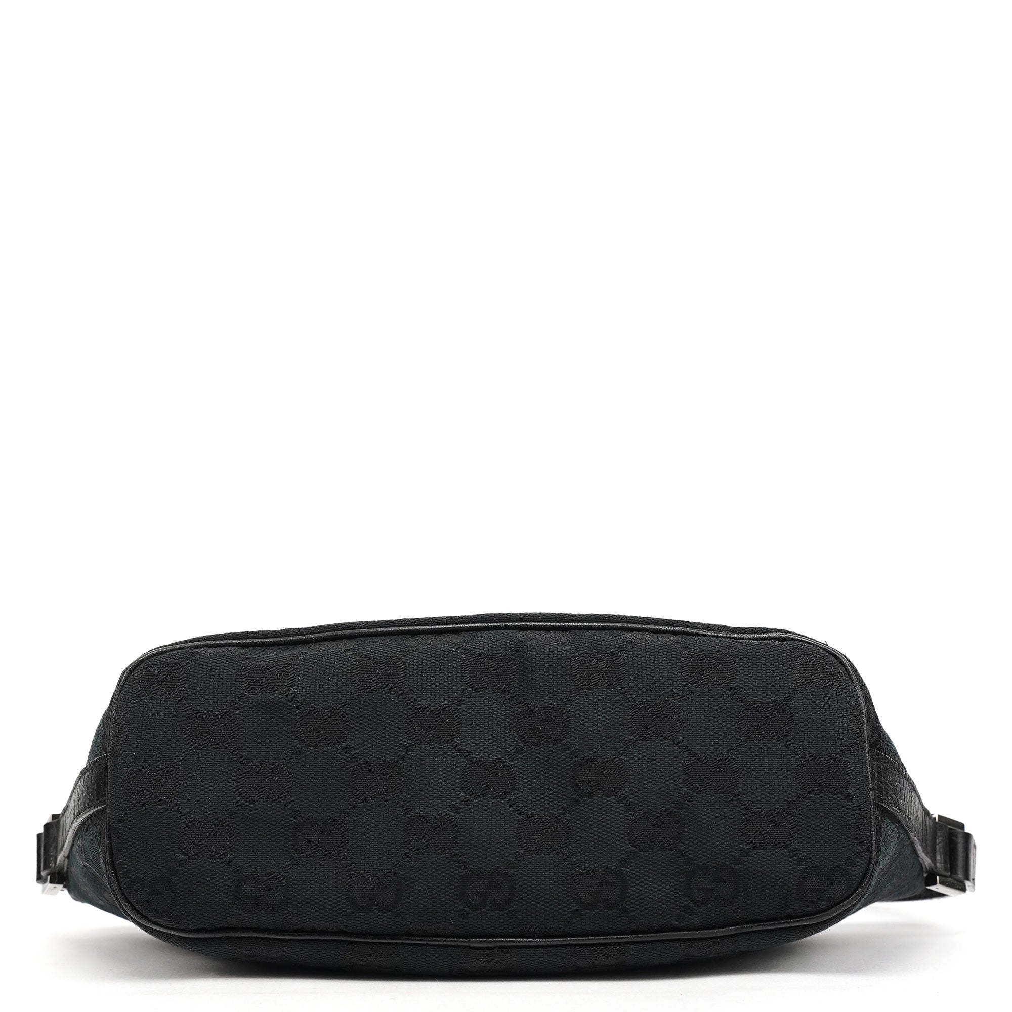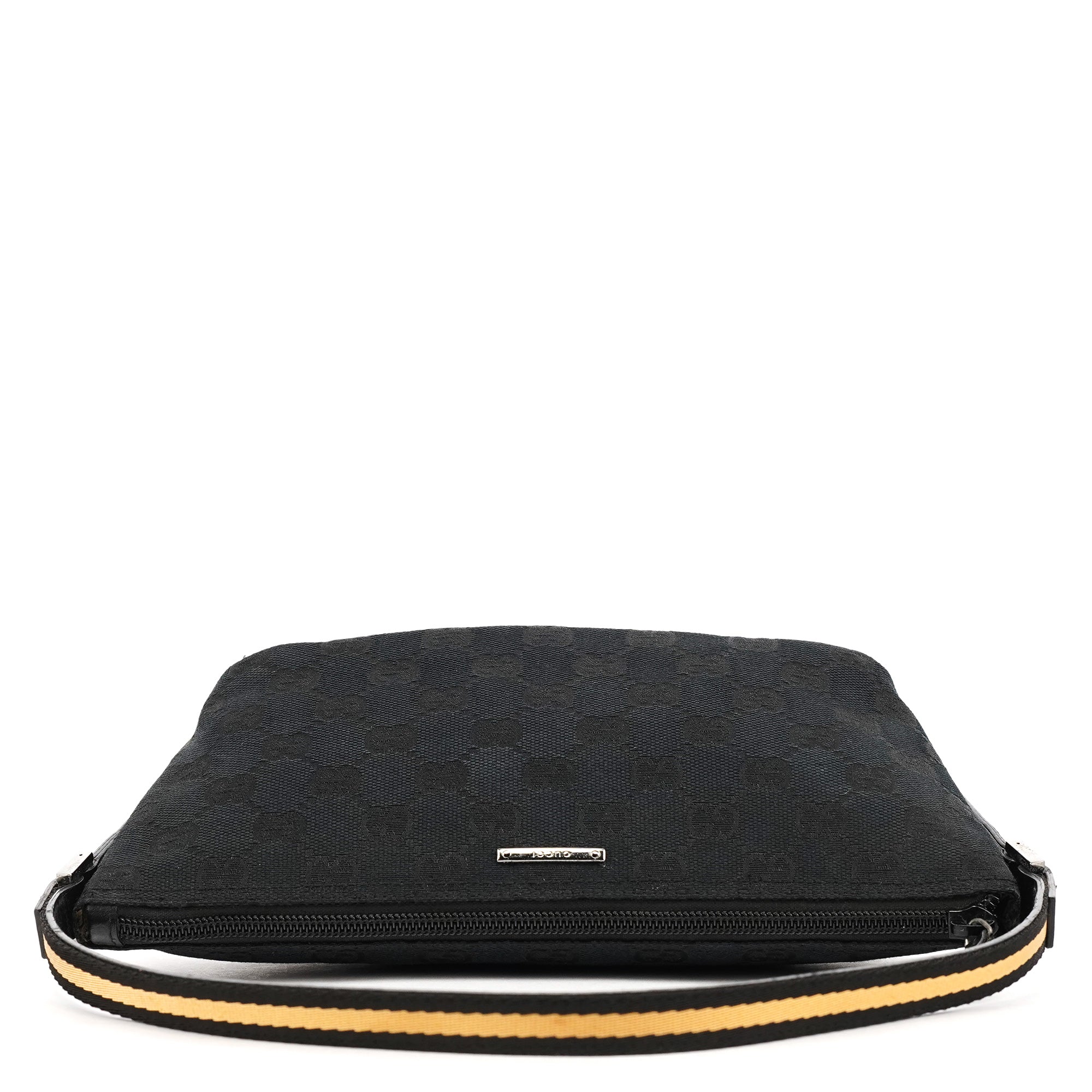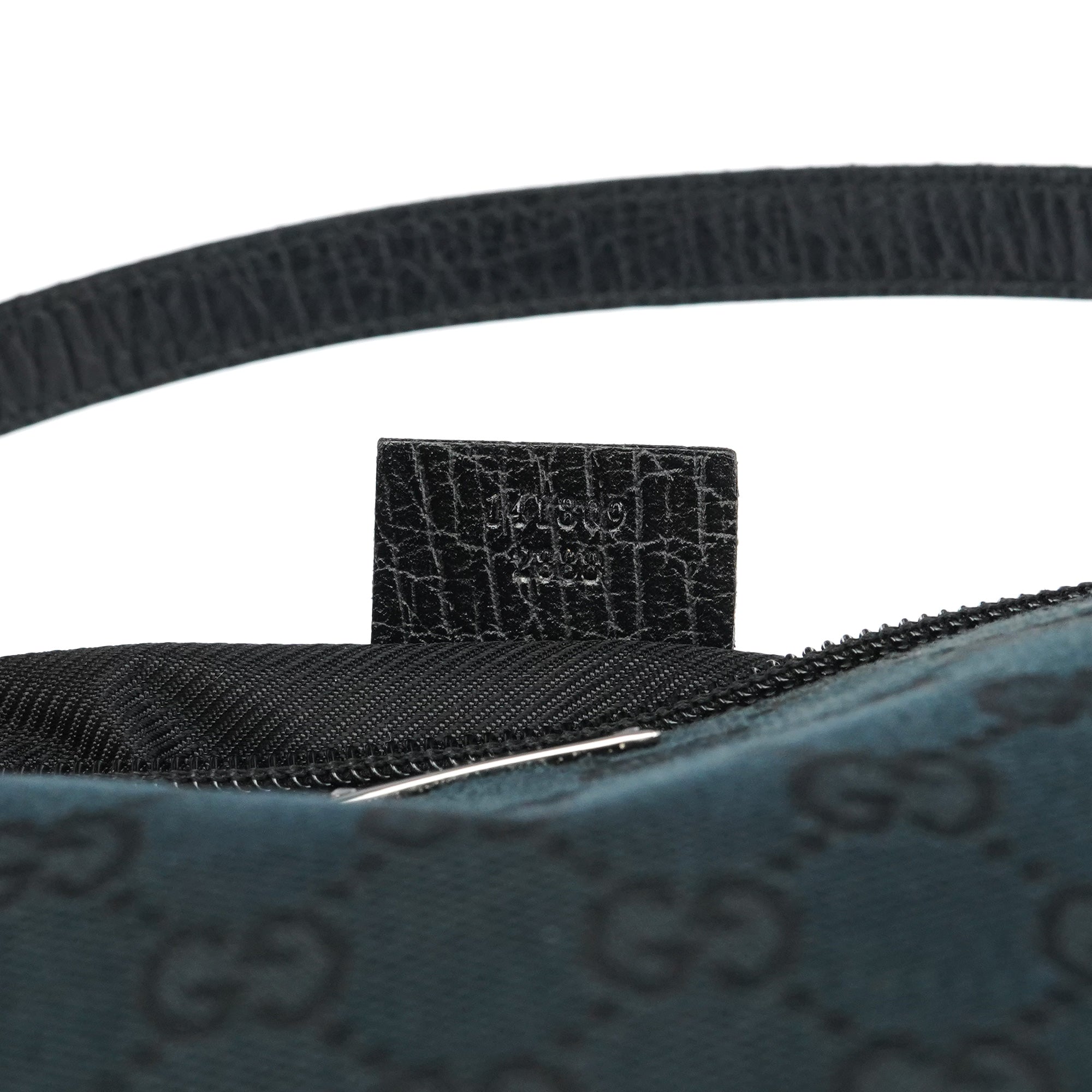 Designed in the early 2000s by Tom Ford, this Gucci GG Boat Pochette is crafted from anthracite GG monogram canvas with black leather trim. The compact silhouette features a top zip closure with a matching leather pull, a single top strap with a subtle yellow accent, and a silver-tone logo plaque at the front. Its minimalist design captures the sleek sophistication of Ford’s Gucci era.