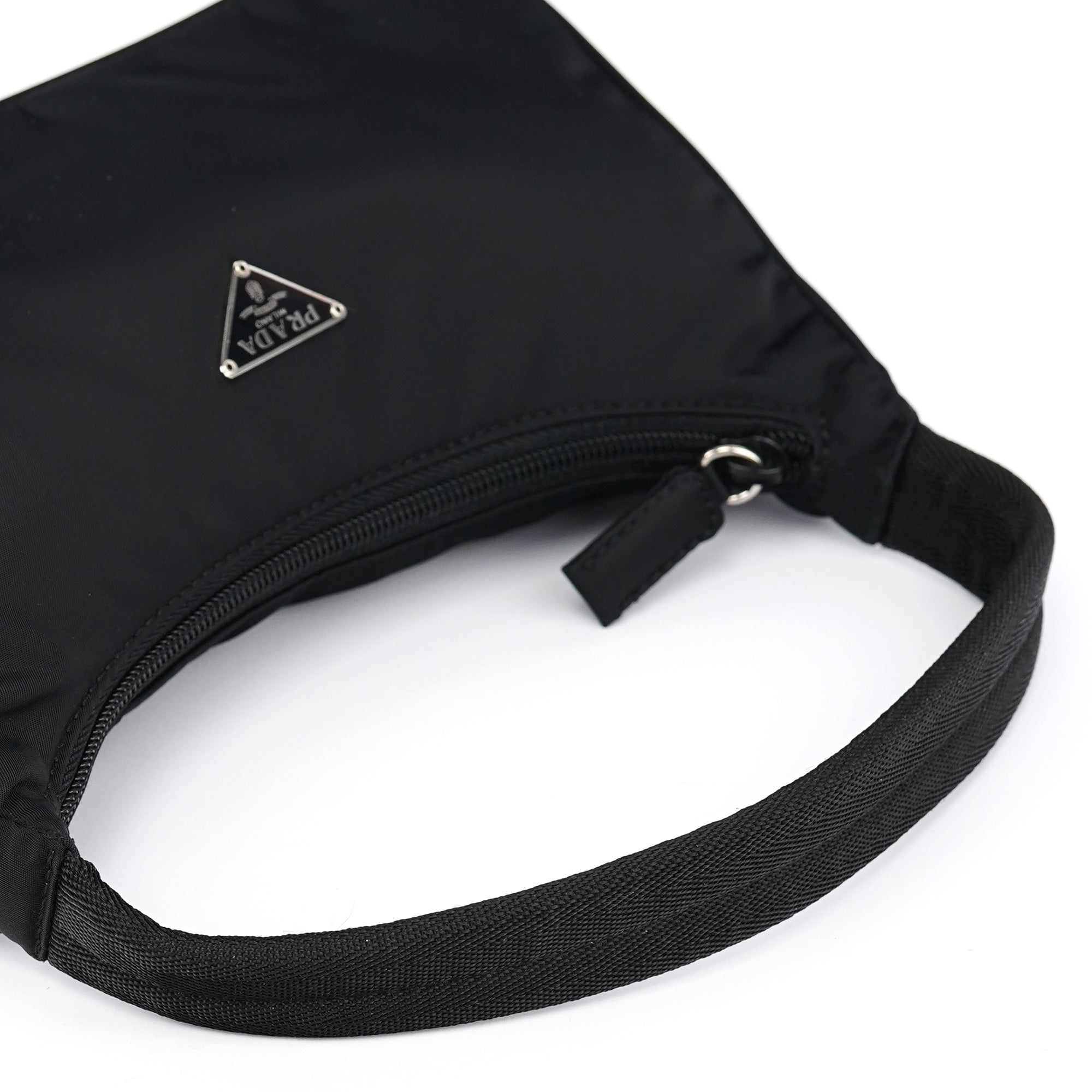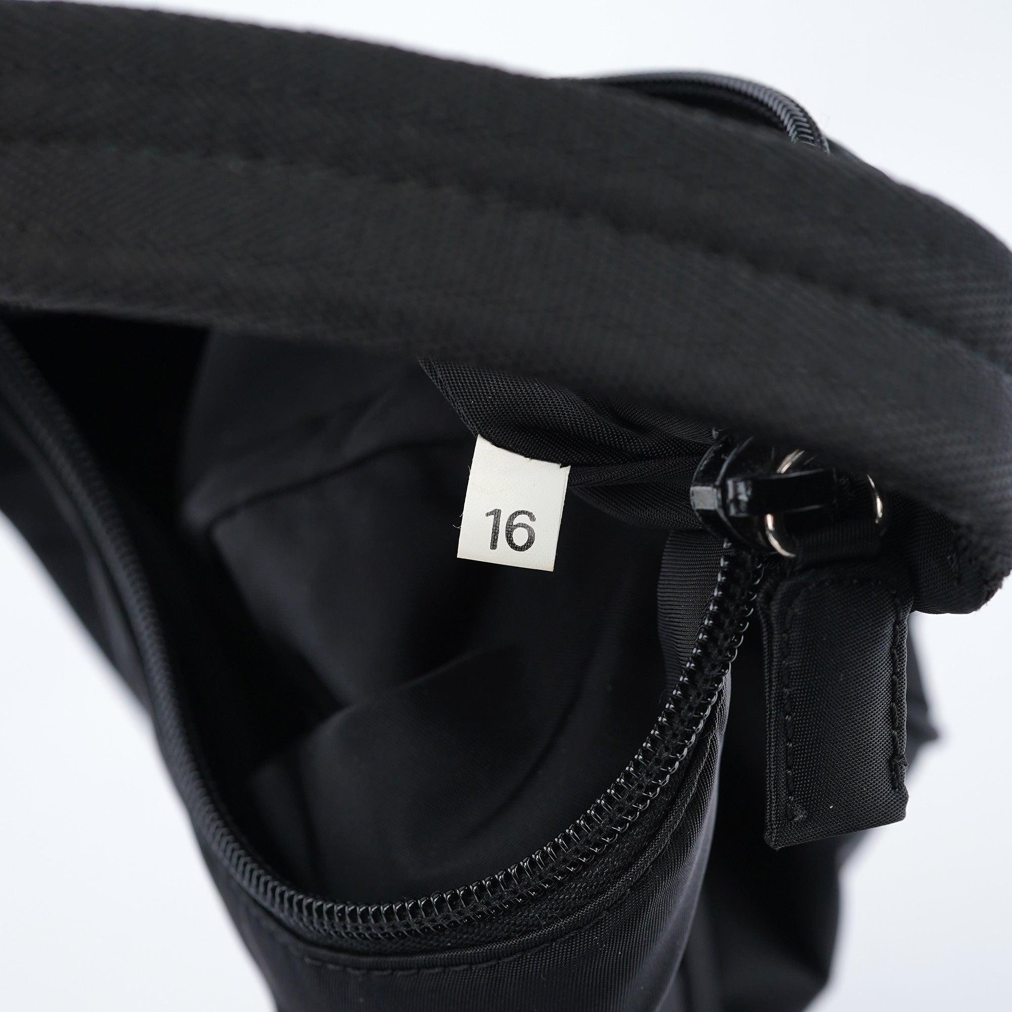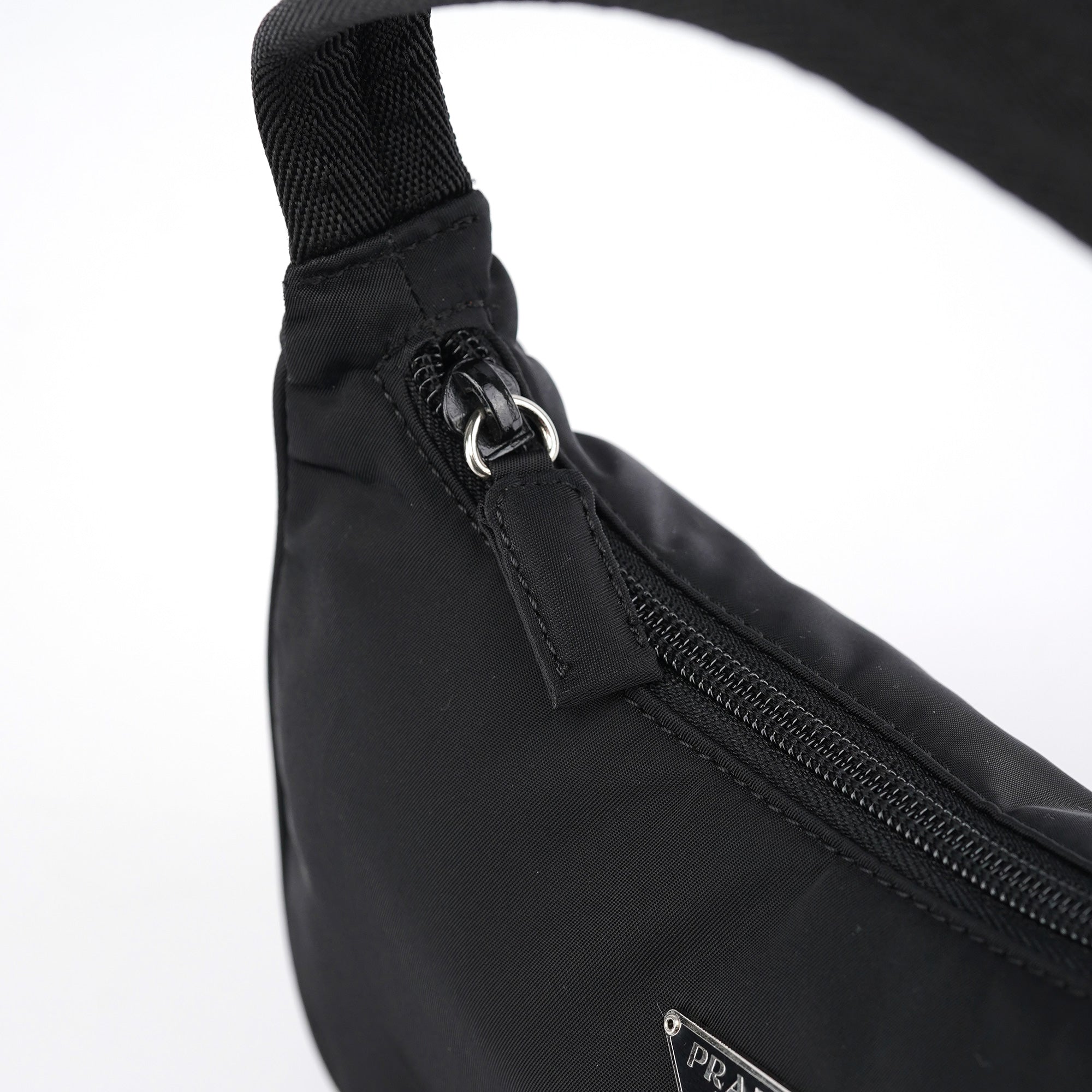 Designed in the early 2000's by Miuccia Prada, this vintage Prada Tessuto mini hobo bag features lightweight black nylon with a curved hobo silhouette. The iconic triangular Prada logo plate adorns the front, while the single braided fabric handle offers comfortable carry. The zip-top closure opens to a fabric-lined interior with the signature Prada label.
