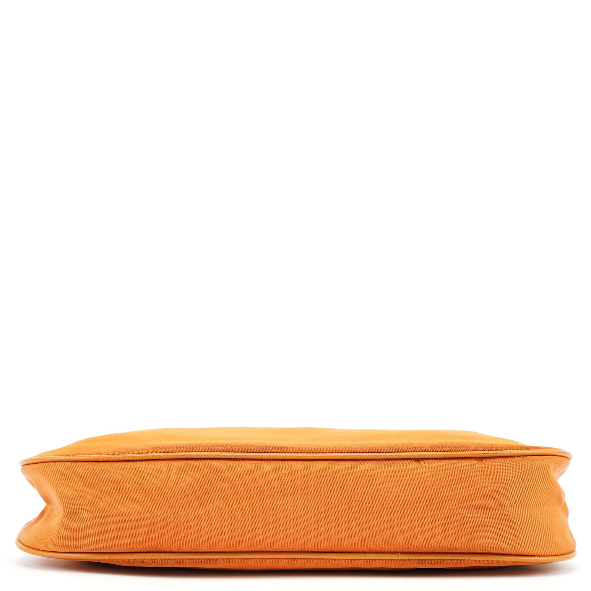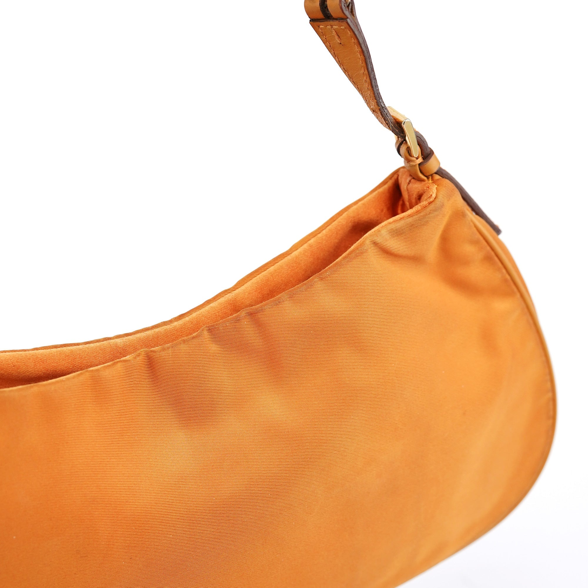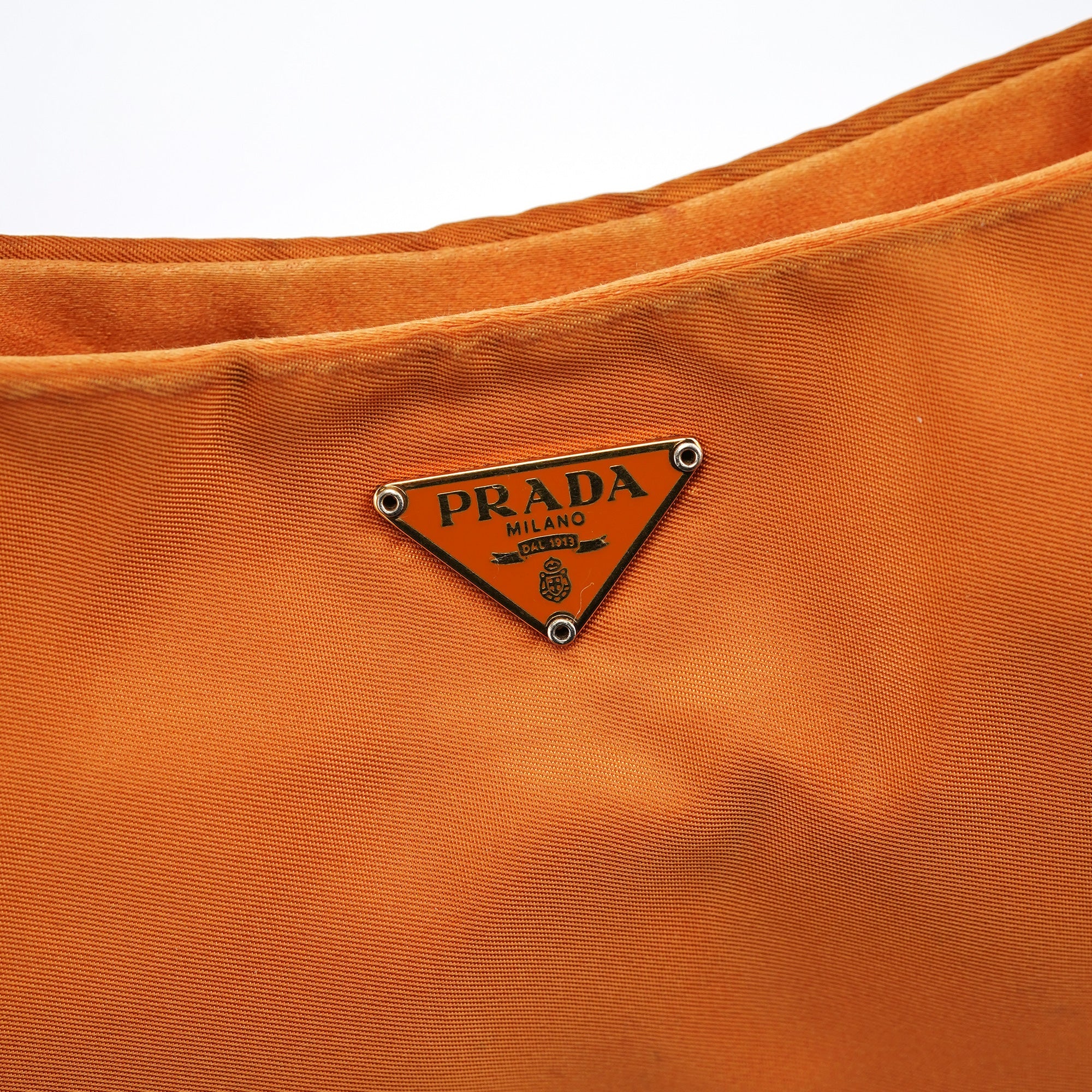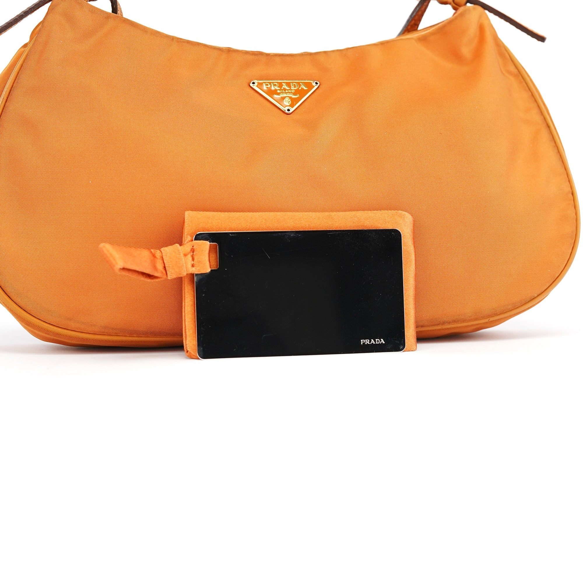 Designed in the early 2000s by Miuccia Prada, this vintage Prada mini hobo features orange nylon tessuto fabric with a gold-tone chain shoulder strap. The compact pochette silhouette showcases the iconic triangular Prada logo plaque and includes a matching pouch attachment.