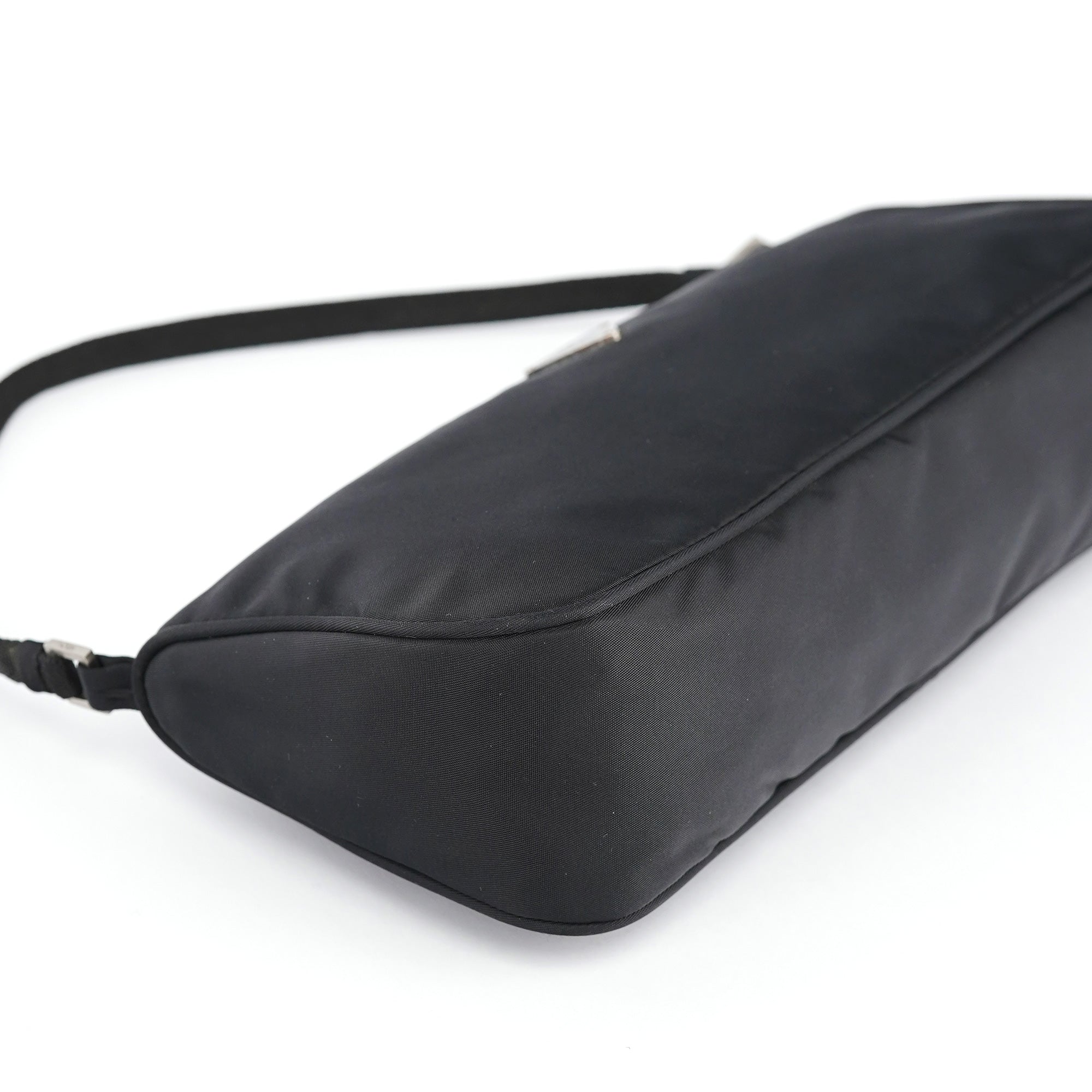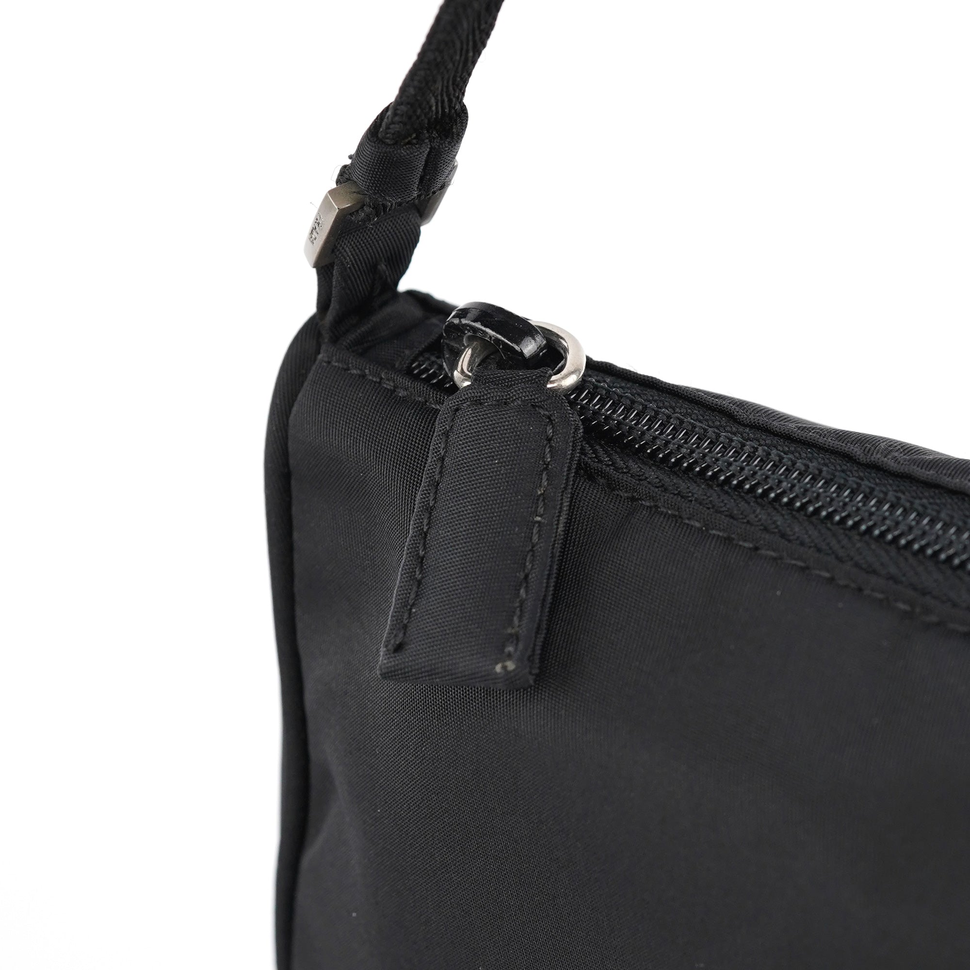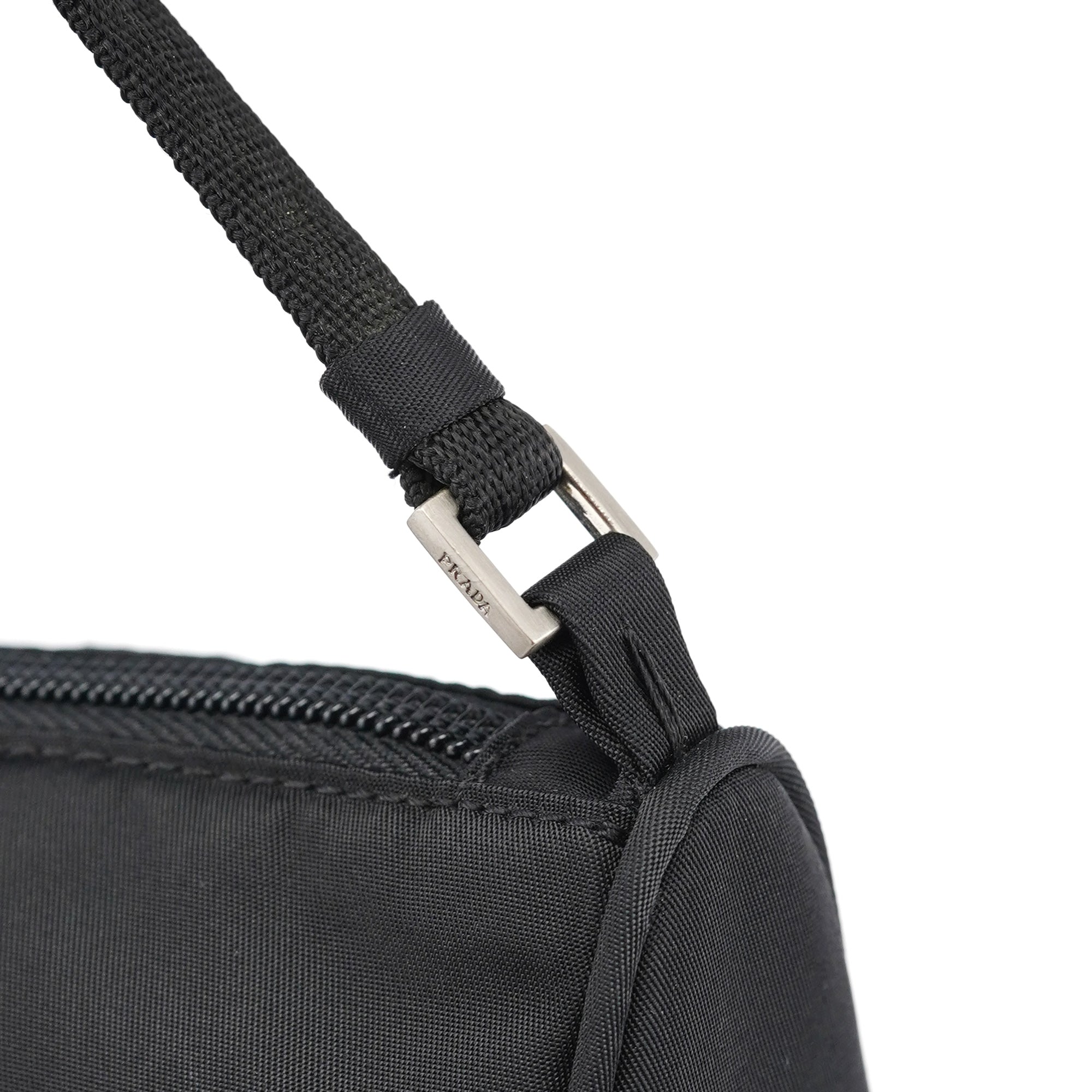 Designed in the late 1990s by Miuccia Prada, this Prada Tessuto mini hobo is crafted from black nylon with tonal saffiano leather trim and silver-tone logo hardware. The compact rectangular shape features a top zip closure and a short nylon strap, with a logo jacquard interior.