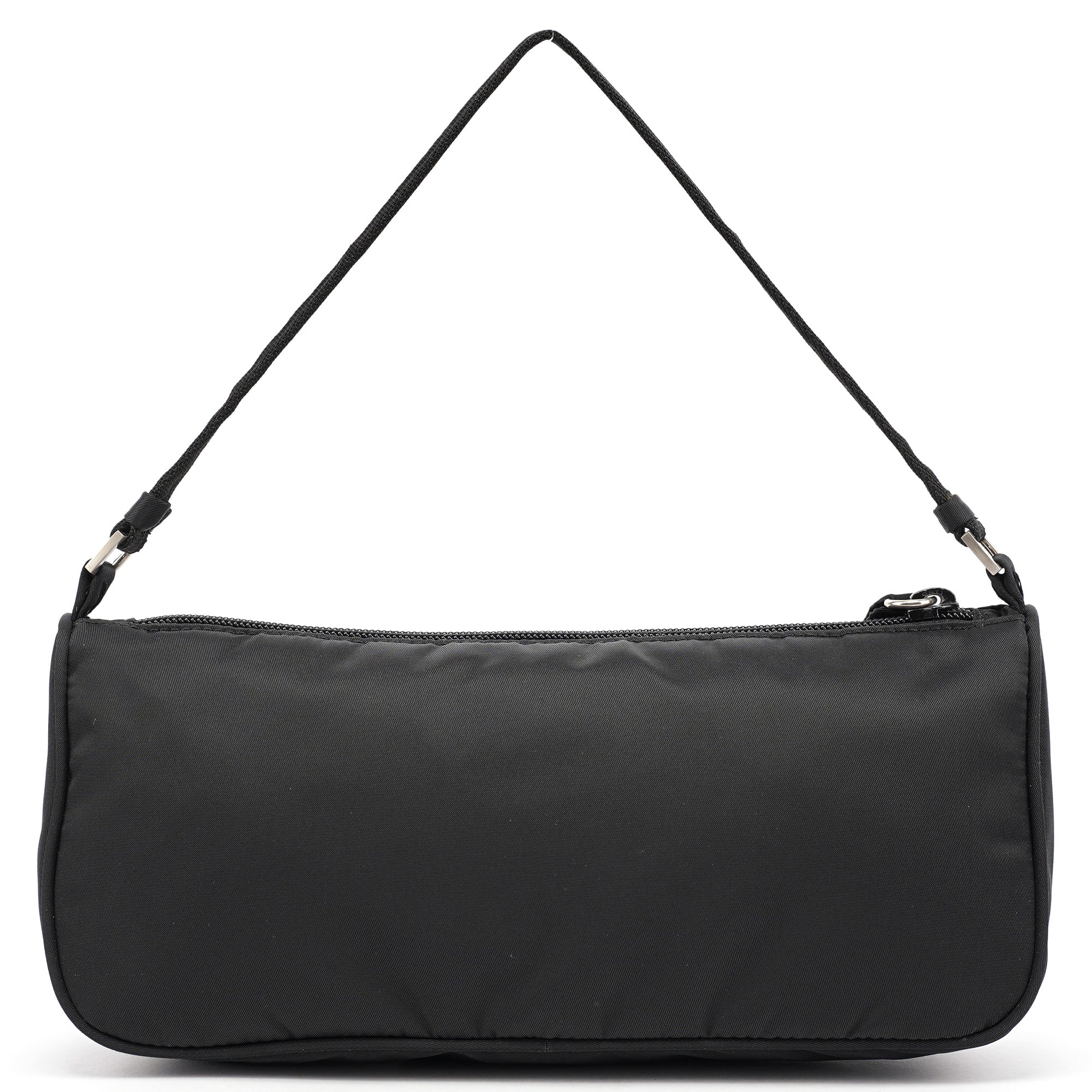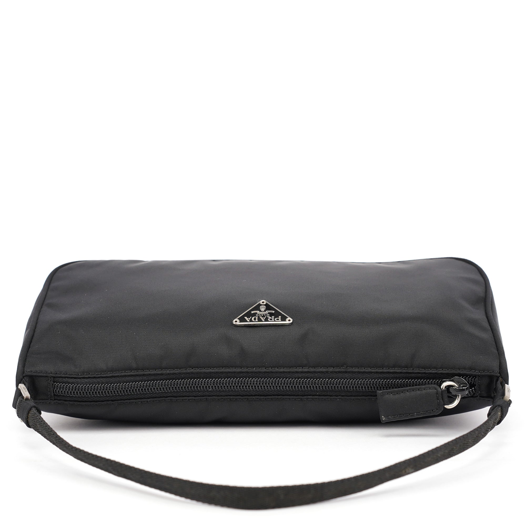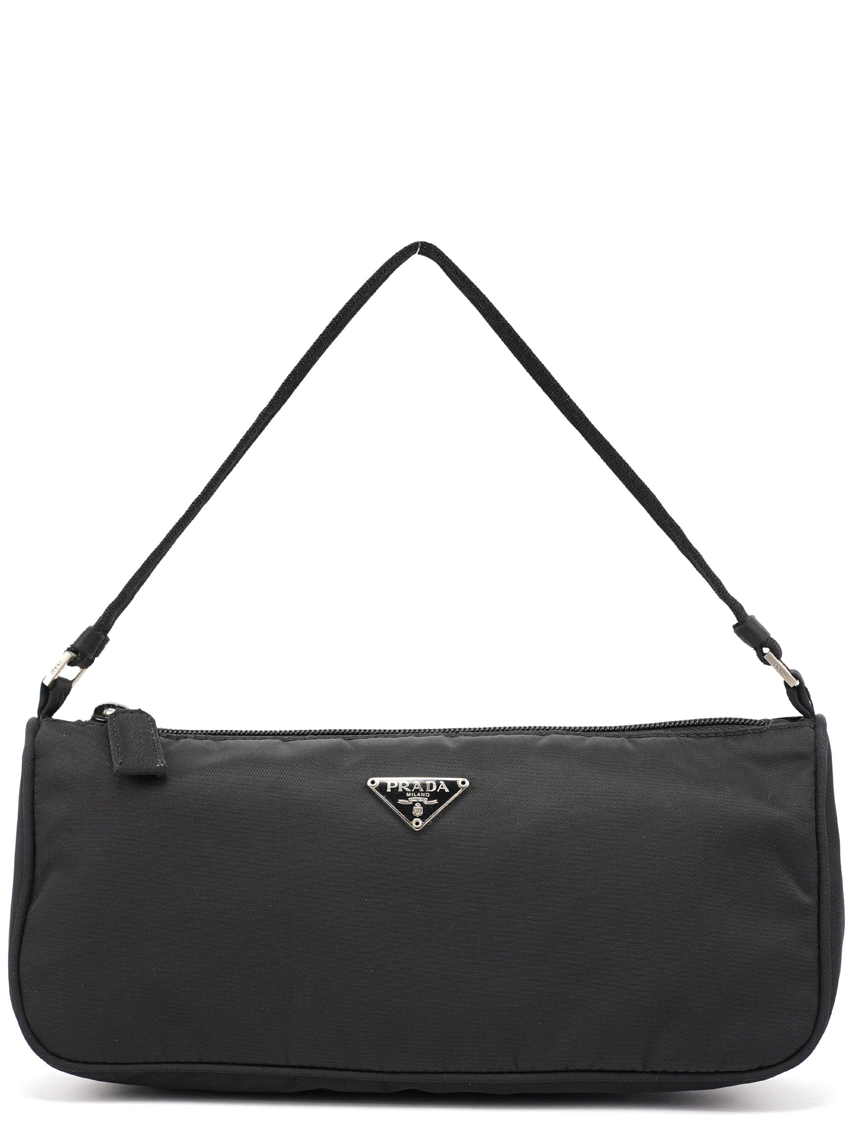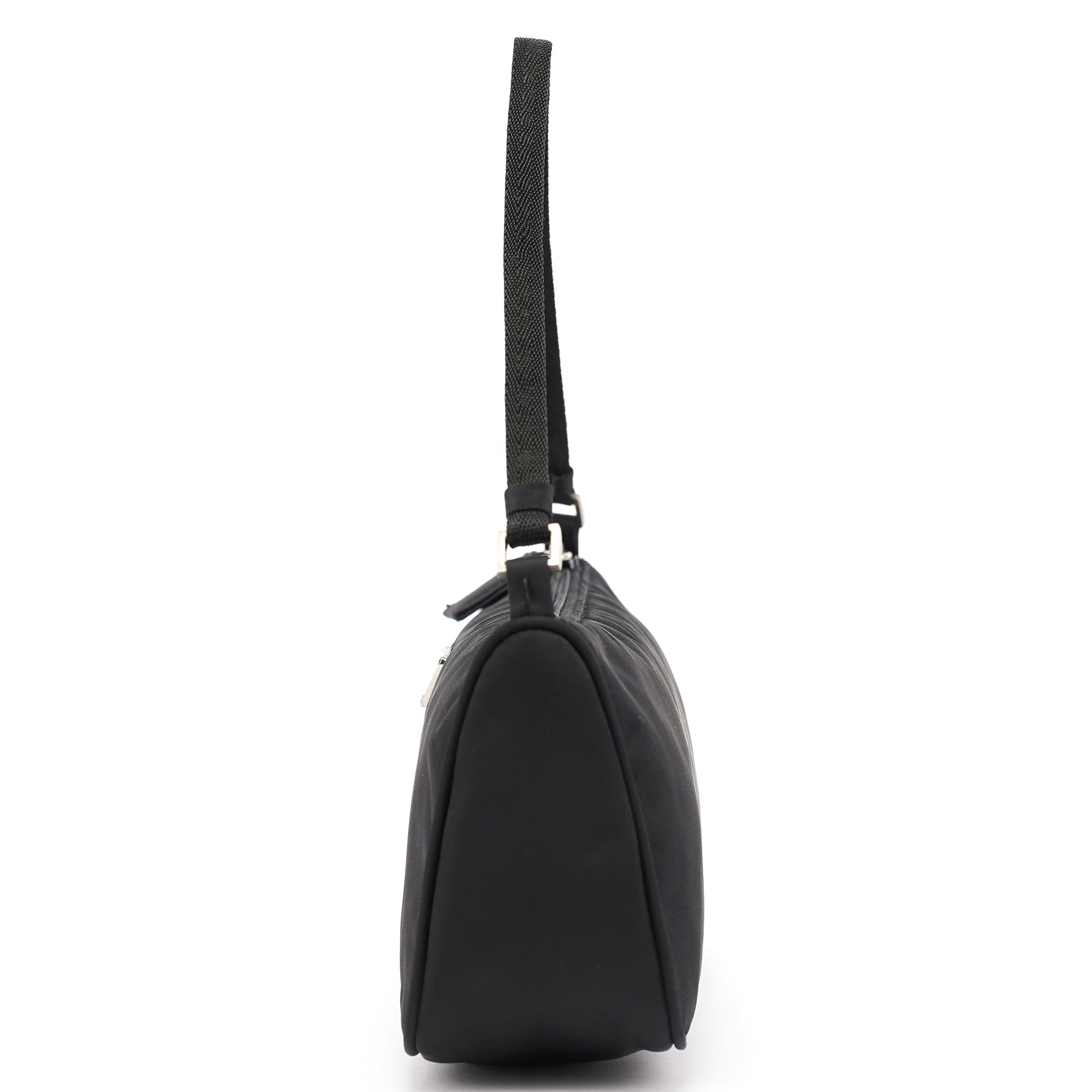 Designed in the late 1990s by Miuccia Prada, this Prada Tessuto mini hobo is crafted from black nylon with tonal saffiano leather trim and silver-tone logo hardware. The compact rectangular shape features a top zip closure and a short nylon strap, with a logo jacquard interior.
