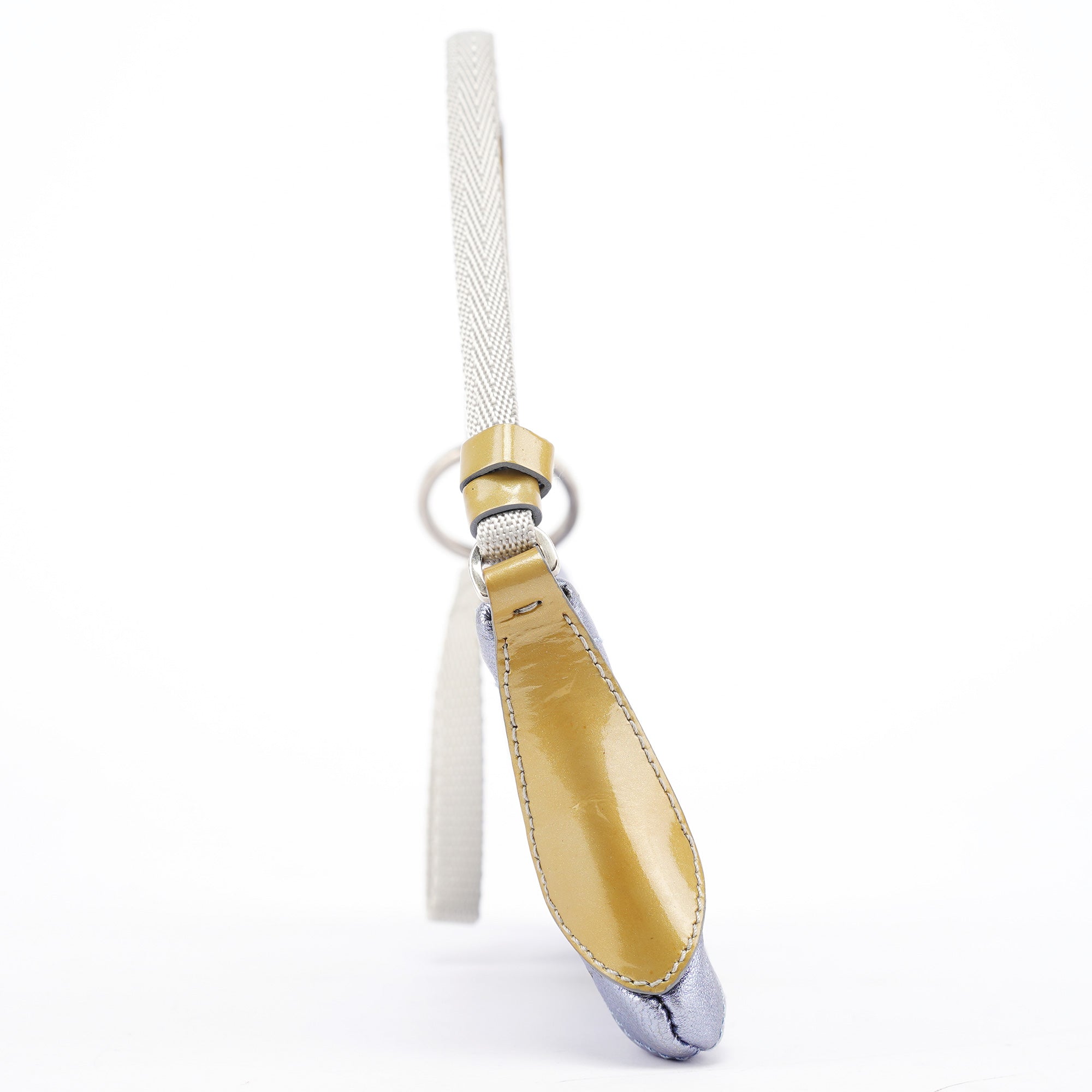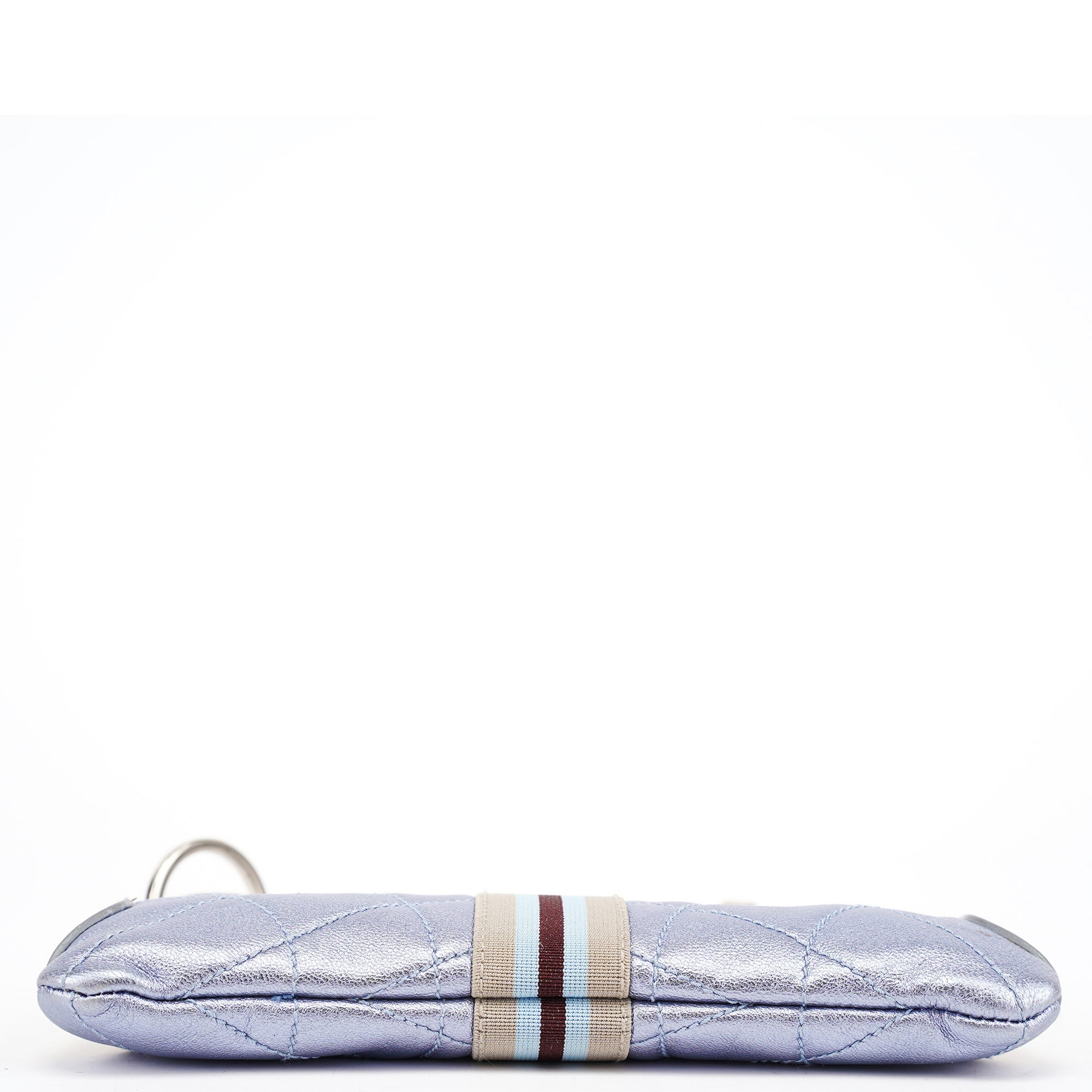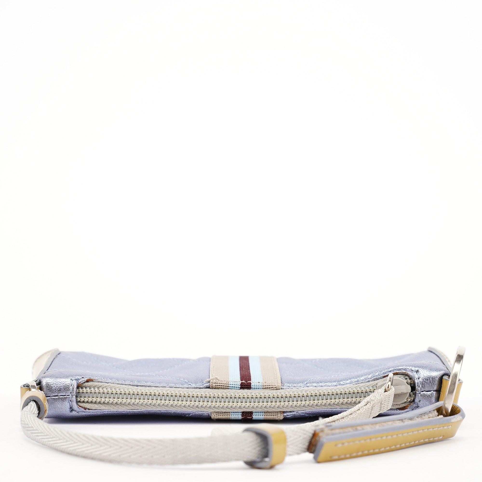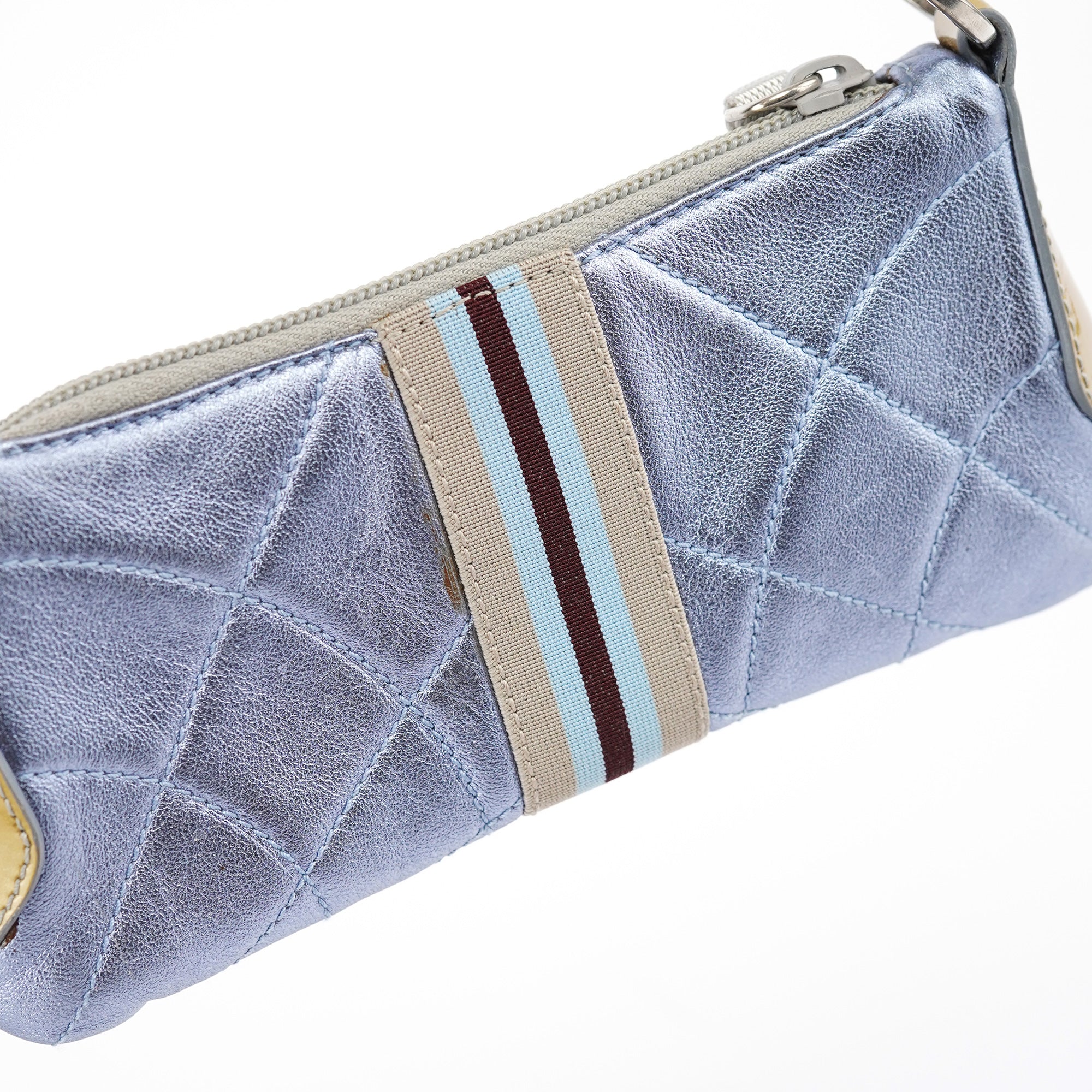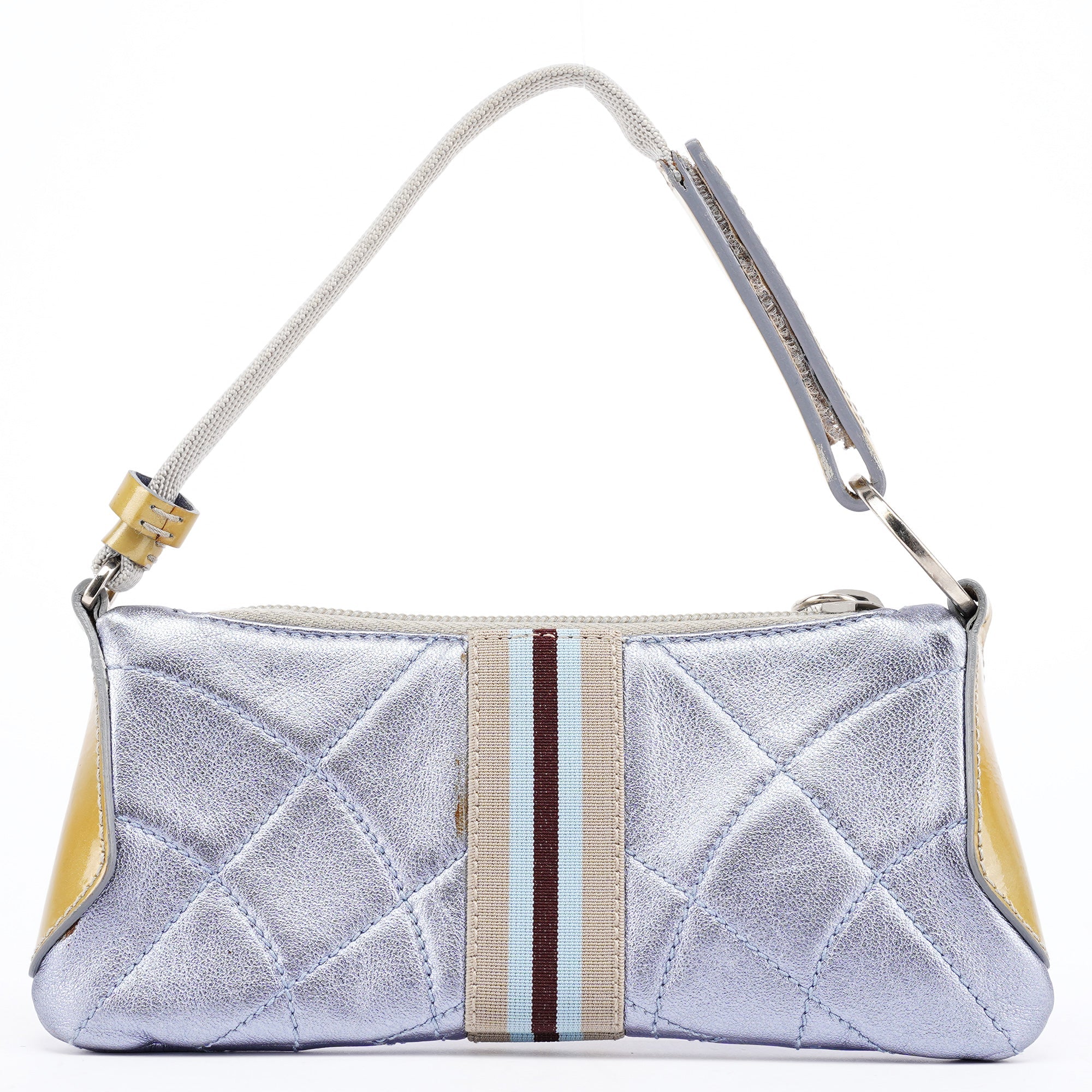 Designed by Miuccia Prada for the Spring 2000 collection, this rare Prada mini bag is crafted in metallic blue quilted leather with geometric stitching and contrasting beige patent leather corners. A sporty striped nylon band adds contrast to the structured silhouette, while the canvas strap is finished with signature resin hardware. The interior is lined in black jacquard with a metal Prada logo plaque.
