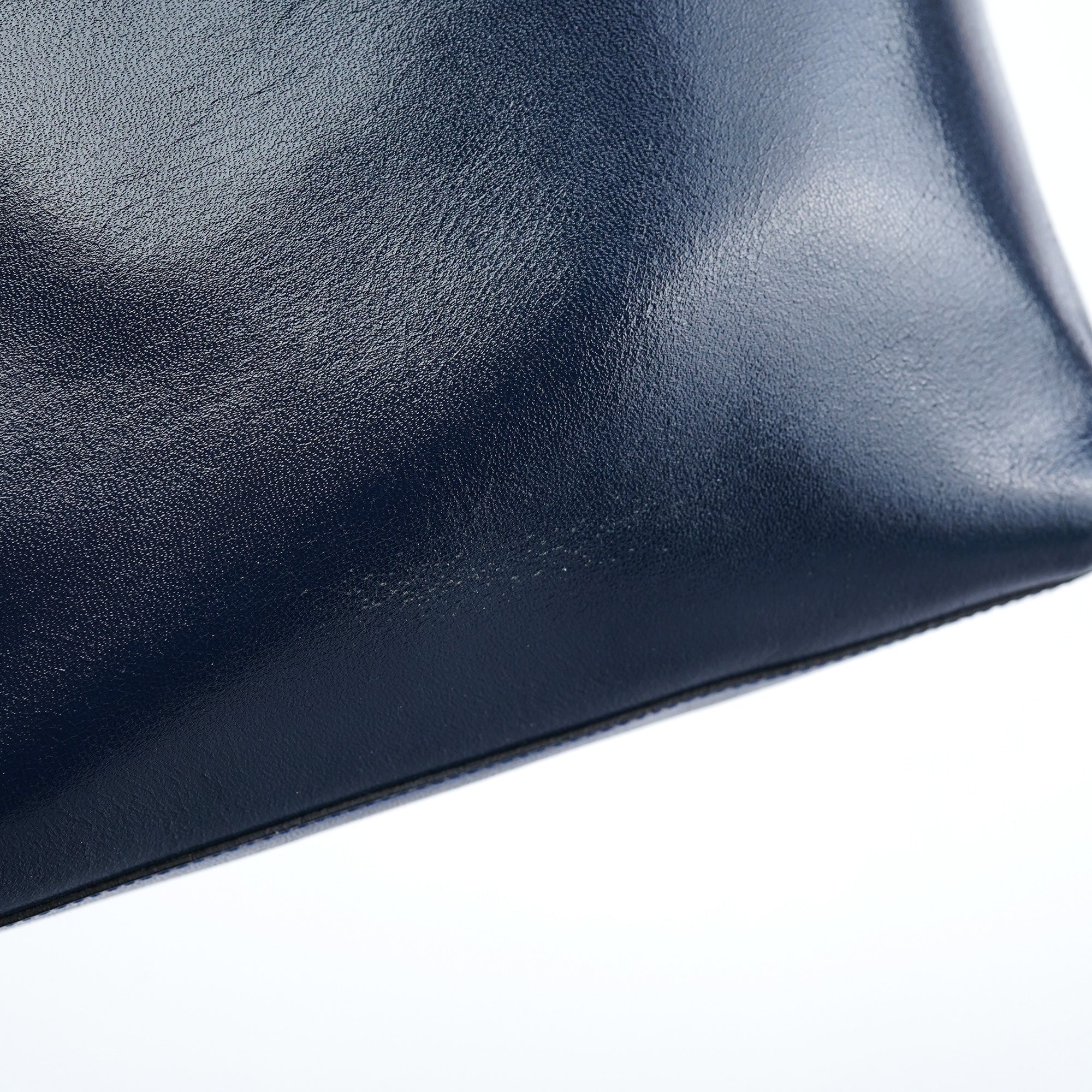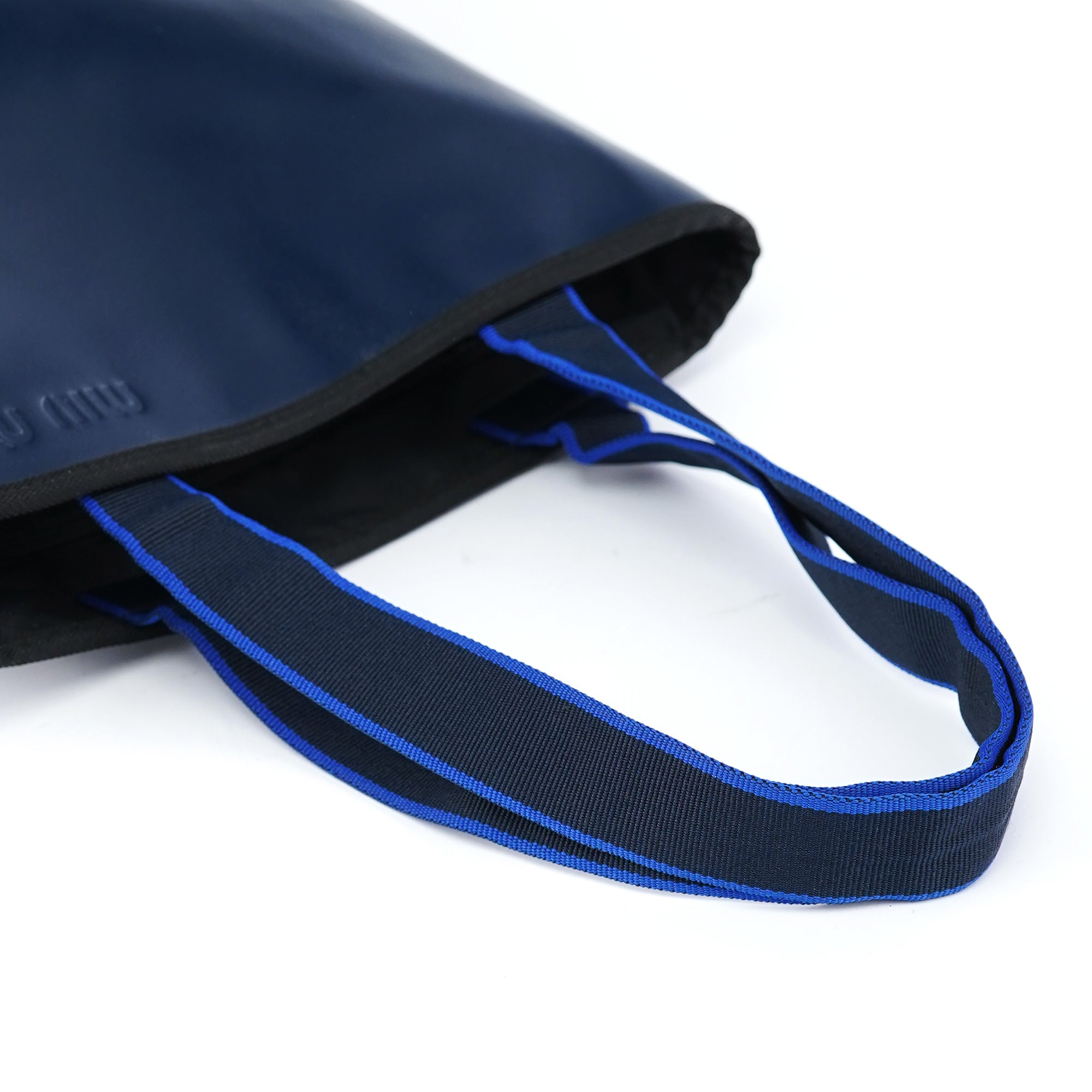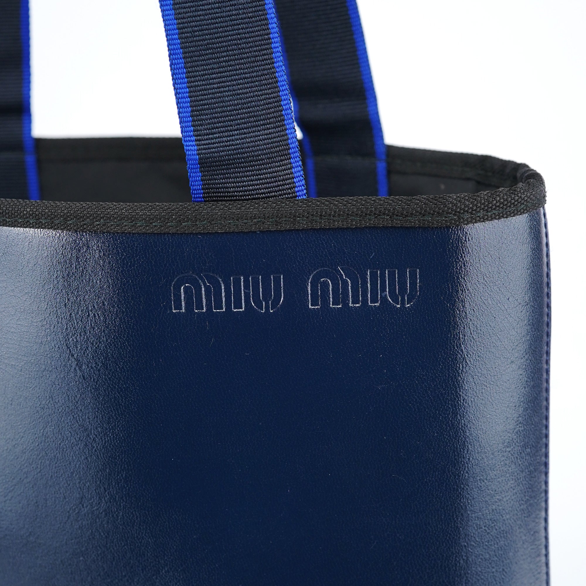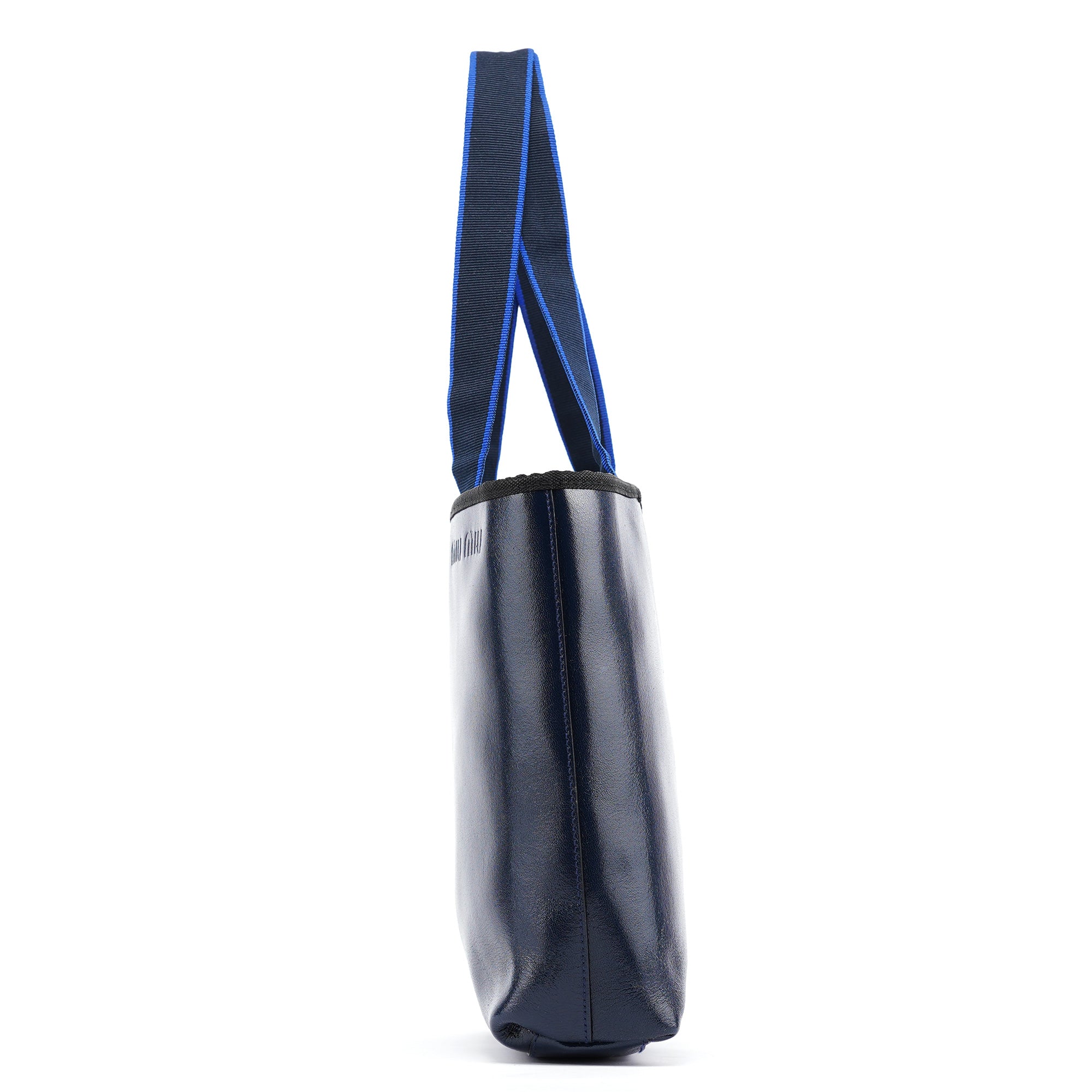 Designed in 1999 by Miuccia Prada, this vintage Miu Miu tote exemplifies the brand's youthful take on minimalist luxury at the turn of the millennium. Crafted in navy leather with a smooth finish, the bag features a practical tote silhouette with dual handles in contrasting blue grosgrain ribbon. The embossed Miu Miu logo on the front adds subtle branding to the clean design. The black-lined interior includes an attached pouch for organization.