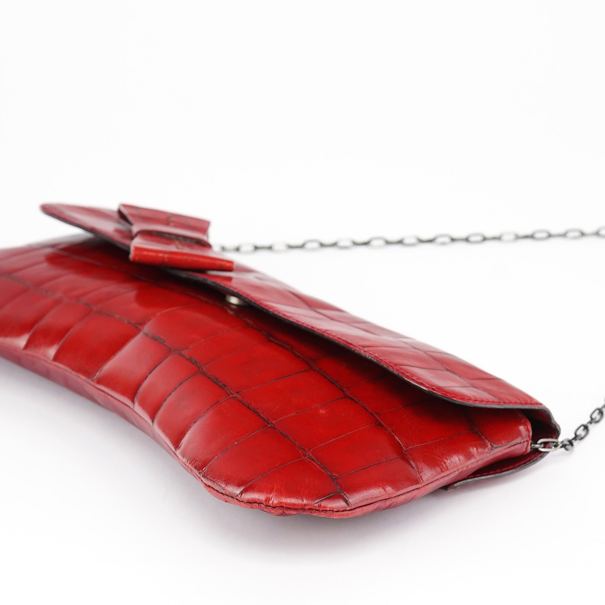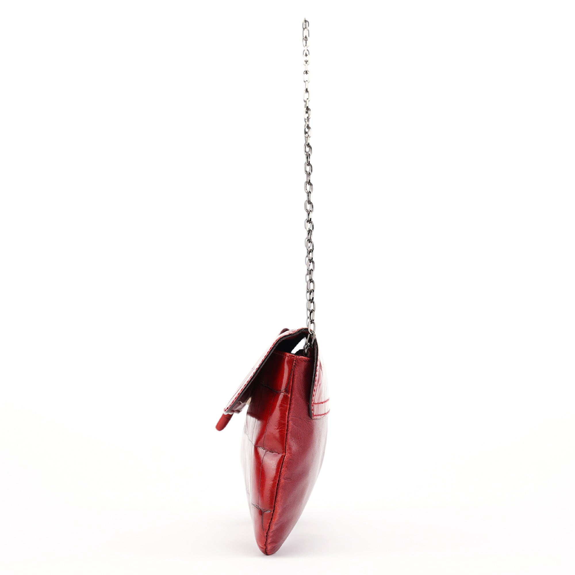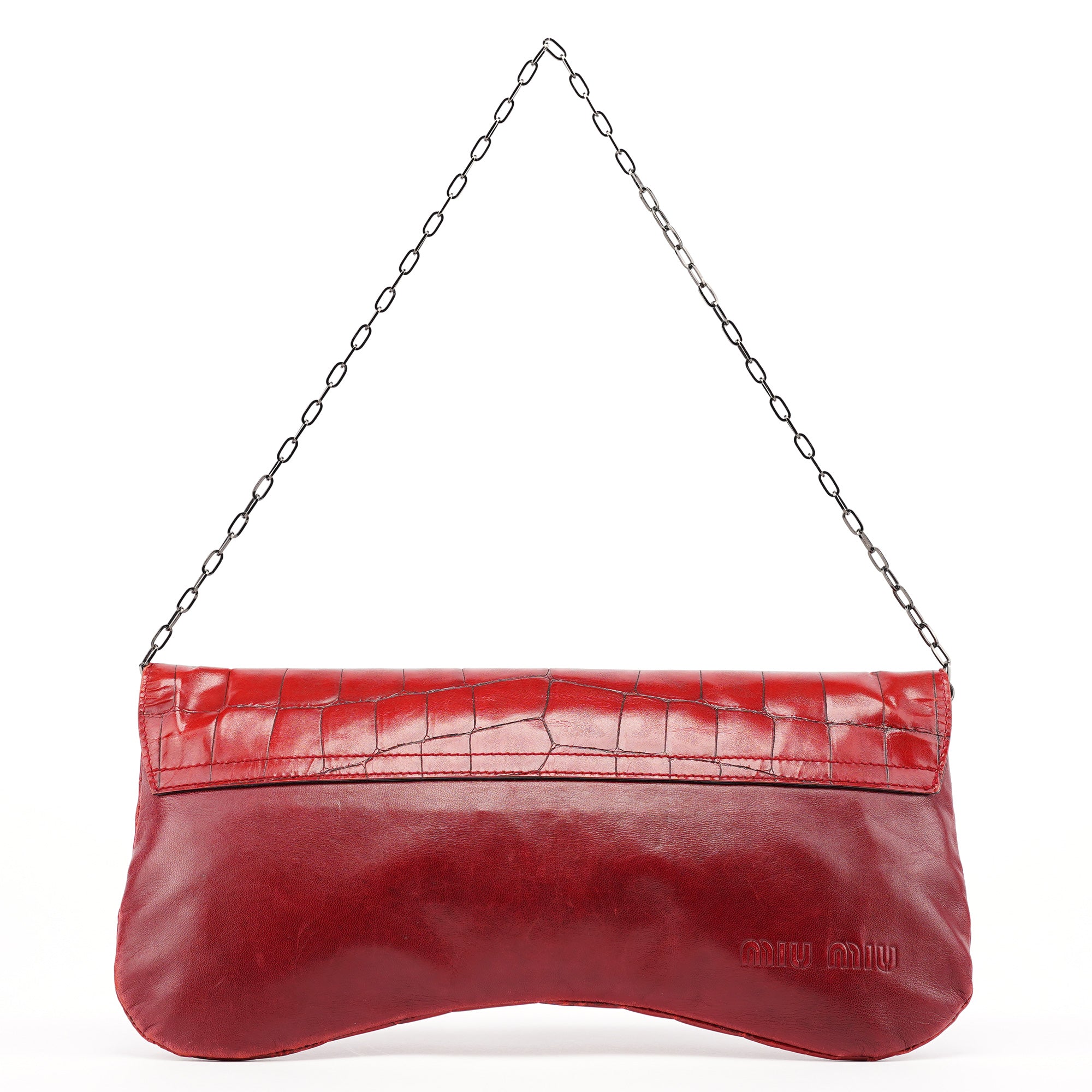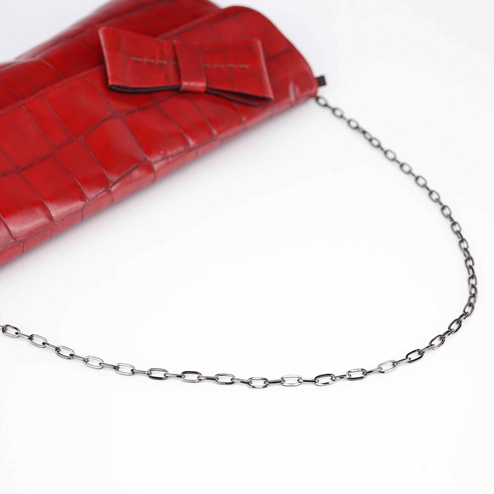 Designed in the early 2000s by Miuccia Prada, this Miu Miu burgundy croc-embossed shoulder bag is crafted from glossy embossed leather in a deep red tone. The structured silhouette features a flap closure adorned with a decorative leather bow and a dark metal chain shoulder strap for a touch of edge. The interior is lined with fabric and includes a zip pocket for essentials.