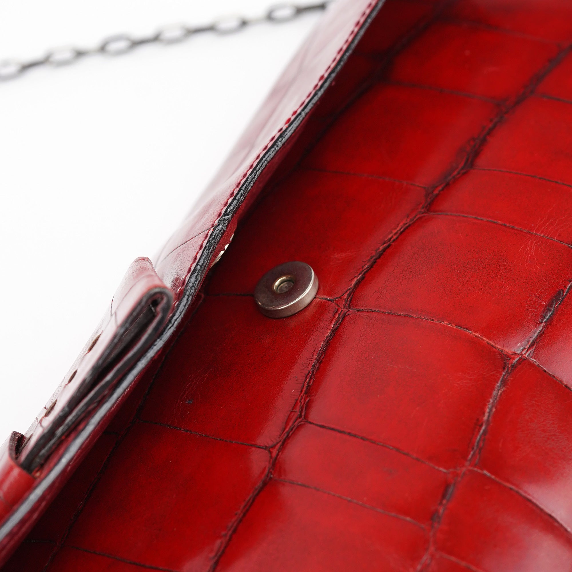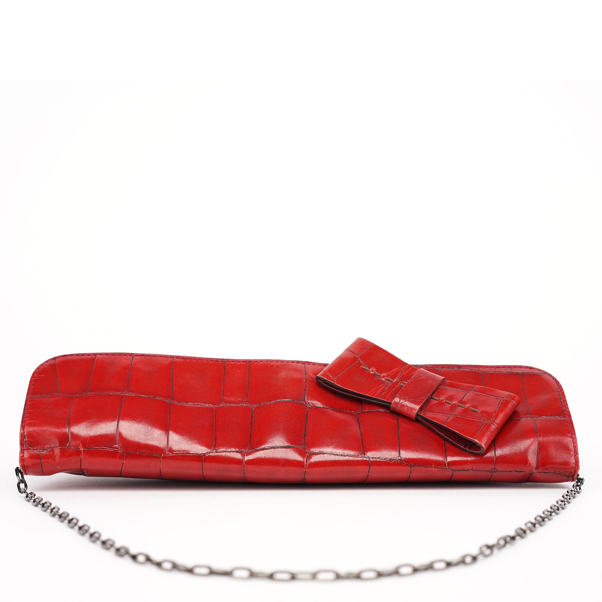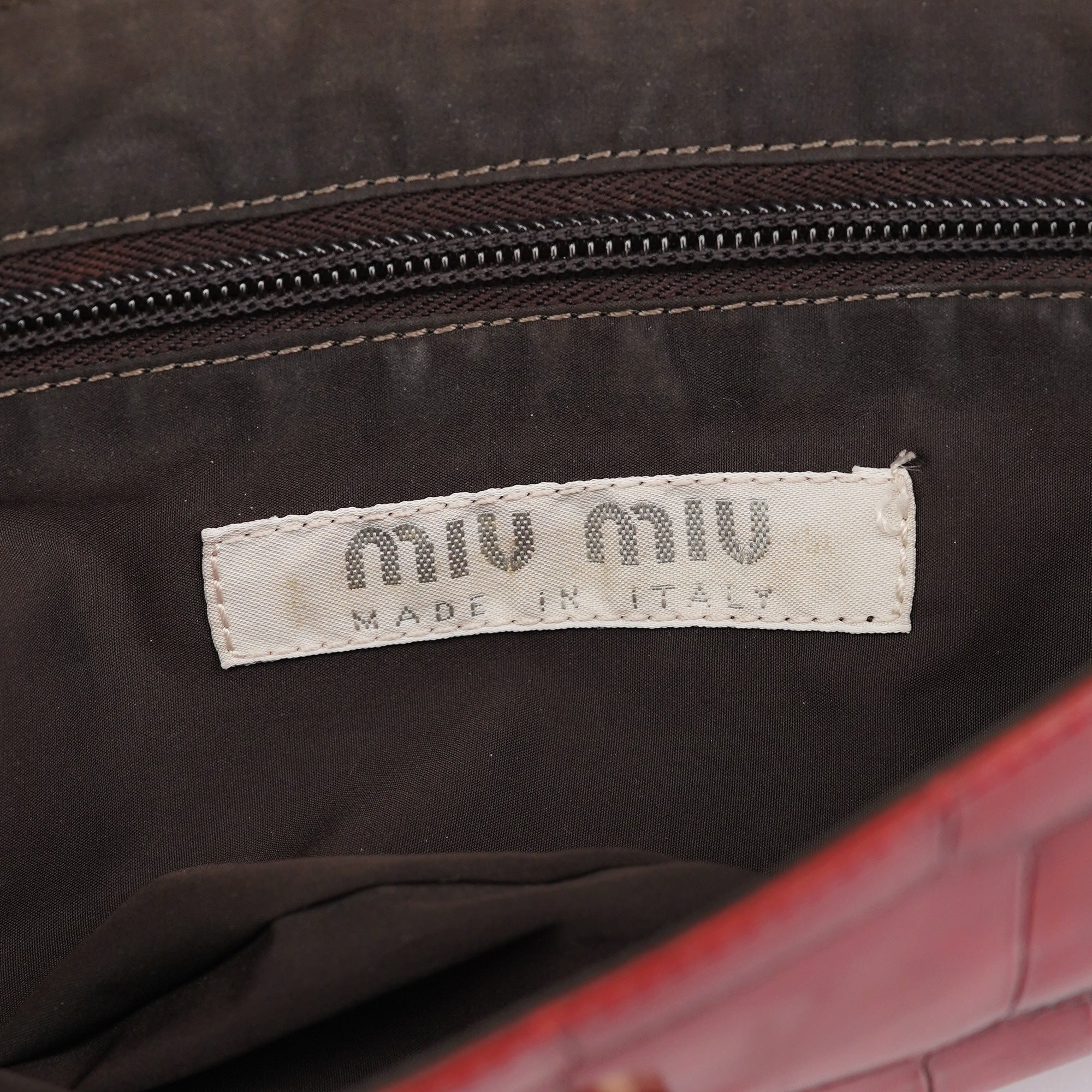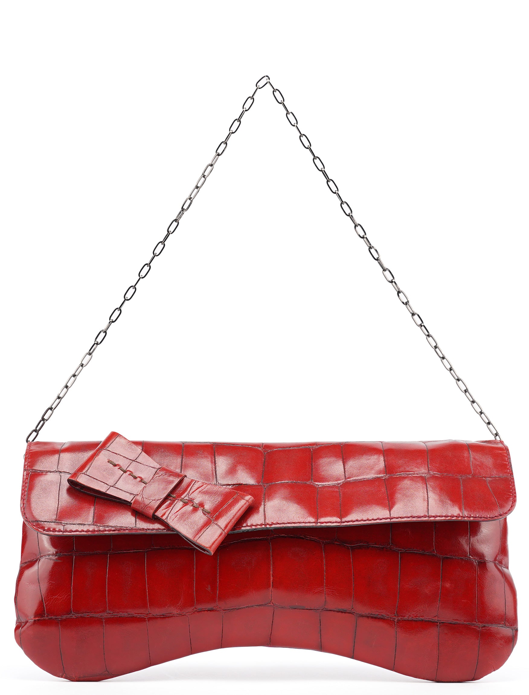 Designed in the early 2000s by Miuccia Prada, this Miu Miu burgundy croc-embossed shoulder bag is crafted from glossy embossed leather in a deep red tone. The structured silhouette features a flap closure adorned with a decorative leather bow and a dark metal chain shoulder strap for a touch of edge. The interior is lined with fabric and includes a zip pocket for essentials.