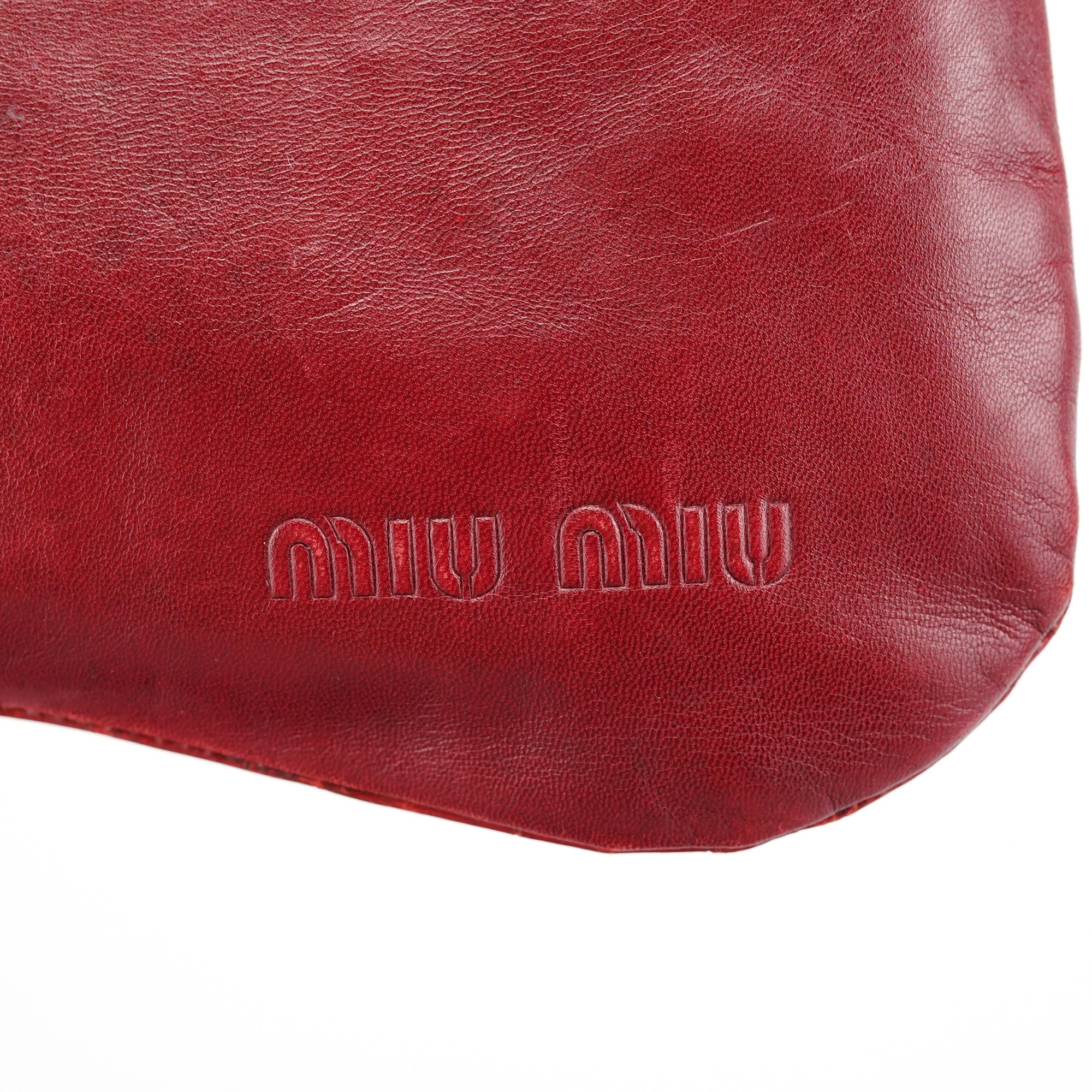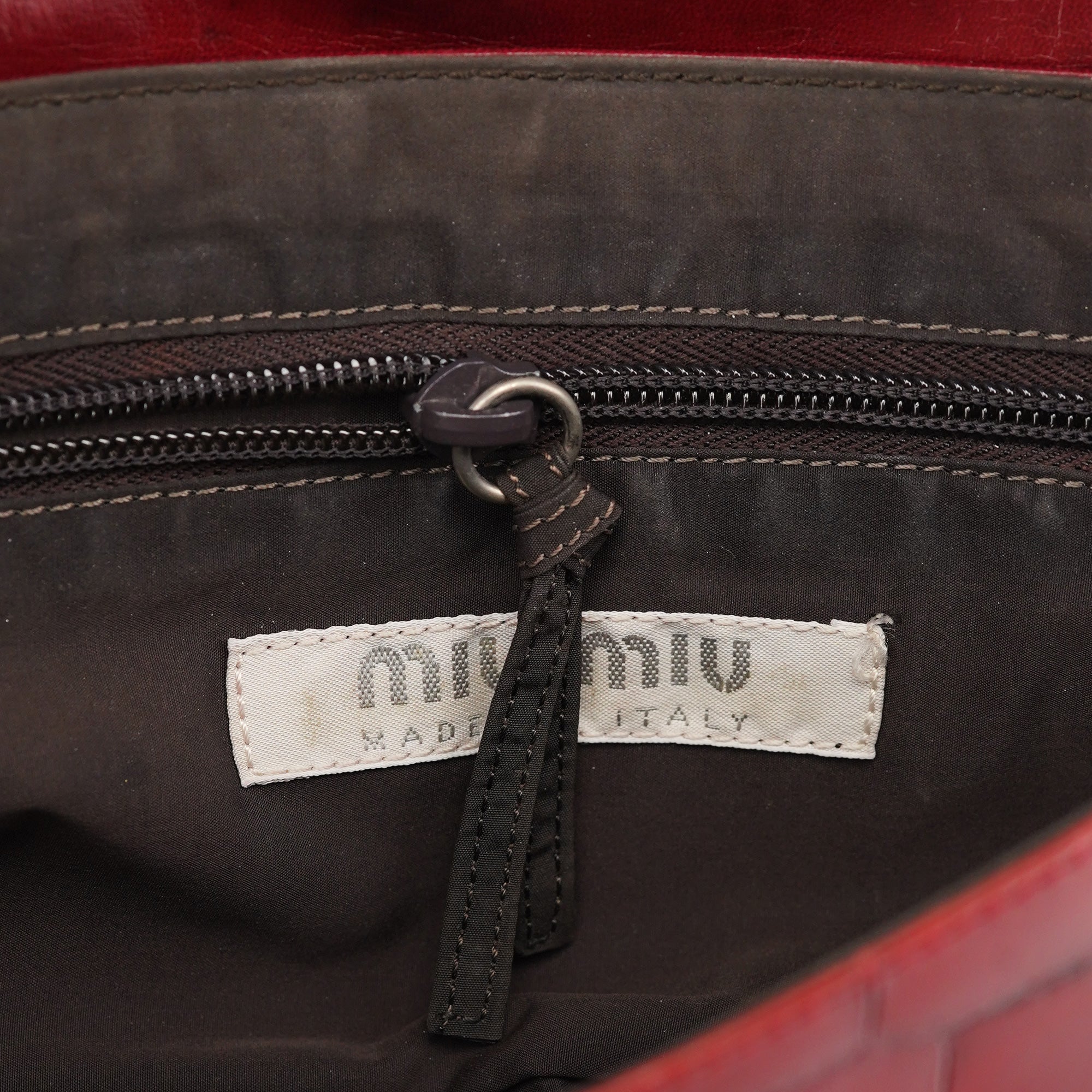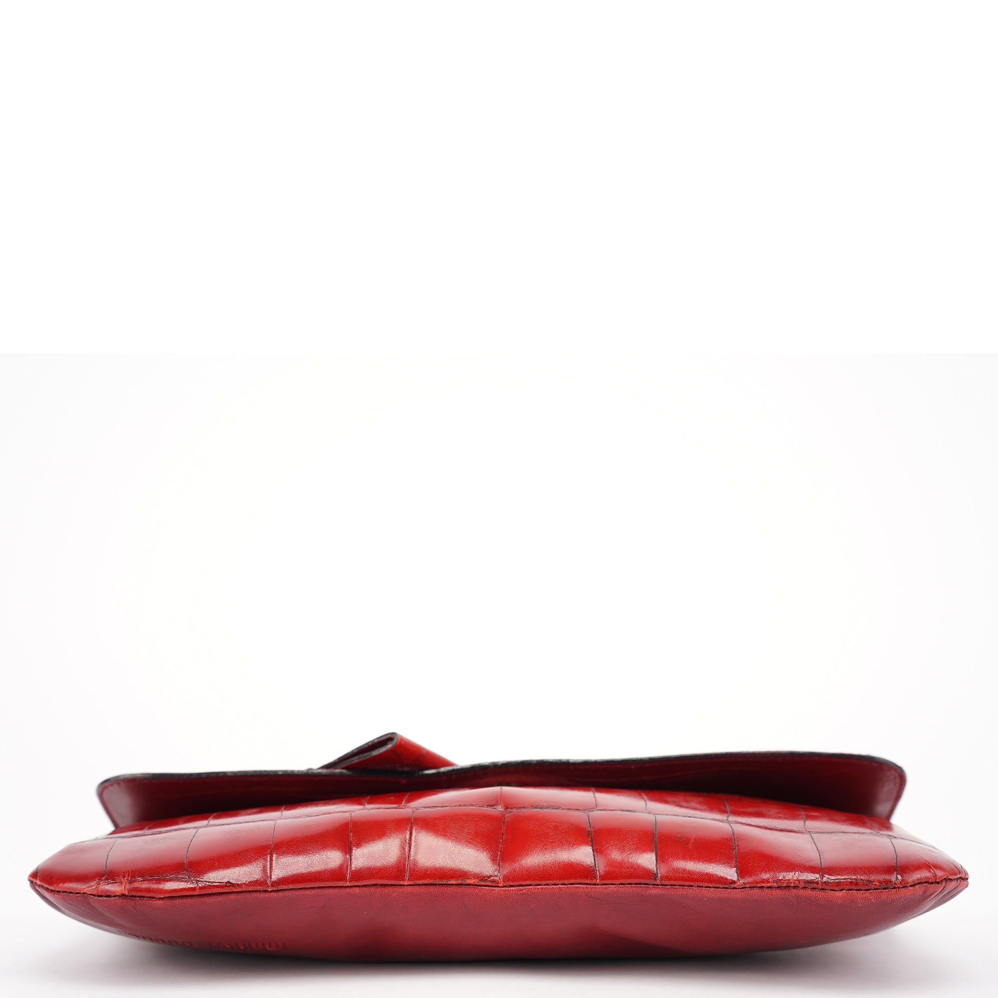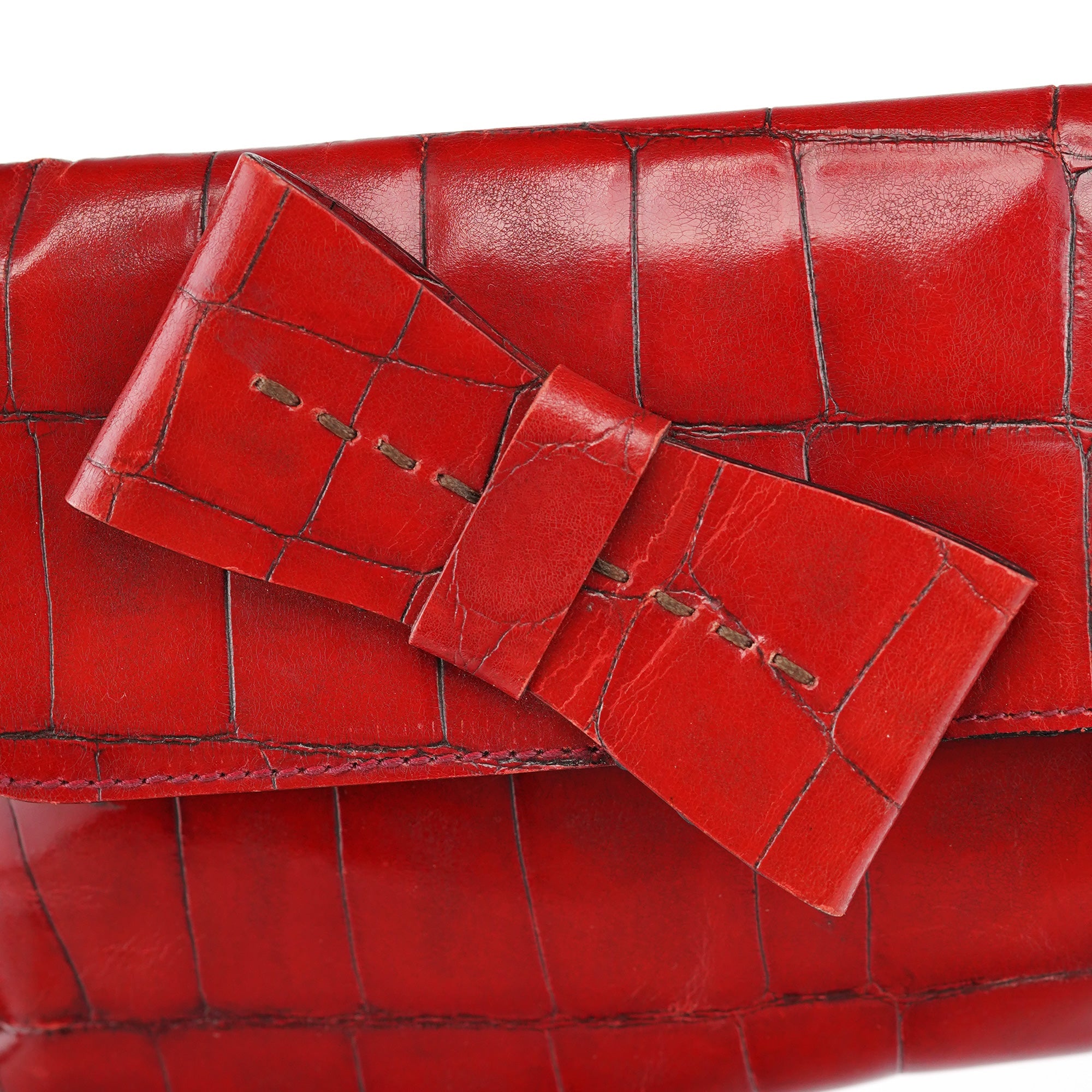 Designed in the early 2000s by Miuccia Prada, this Miu Miu burgundy croc-embossed shoulder bag is crafted from glossy embossed leather in a deep red tone. The structured silhouette features a flap closure adorned with a decorative leather bow and a dark metal chain shoulder strap for a touch of edge. The interior is lined with fabric and includes a zip pocket for essentials.