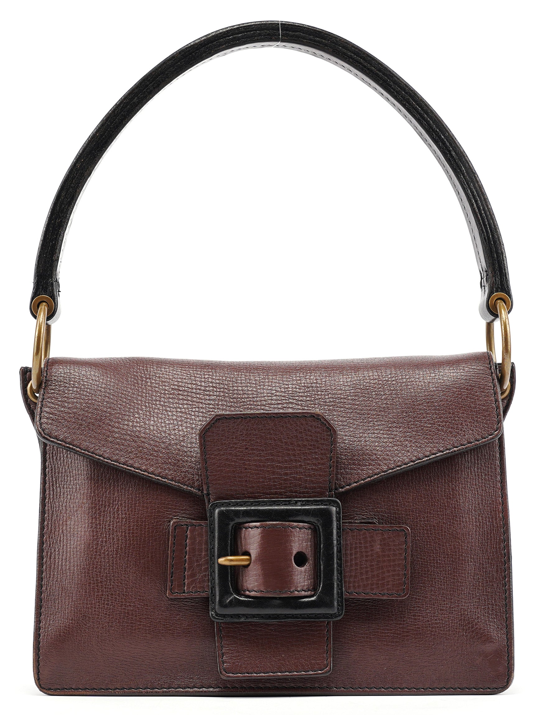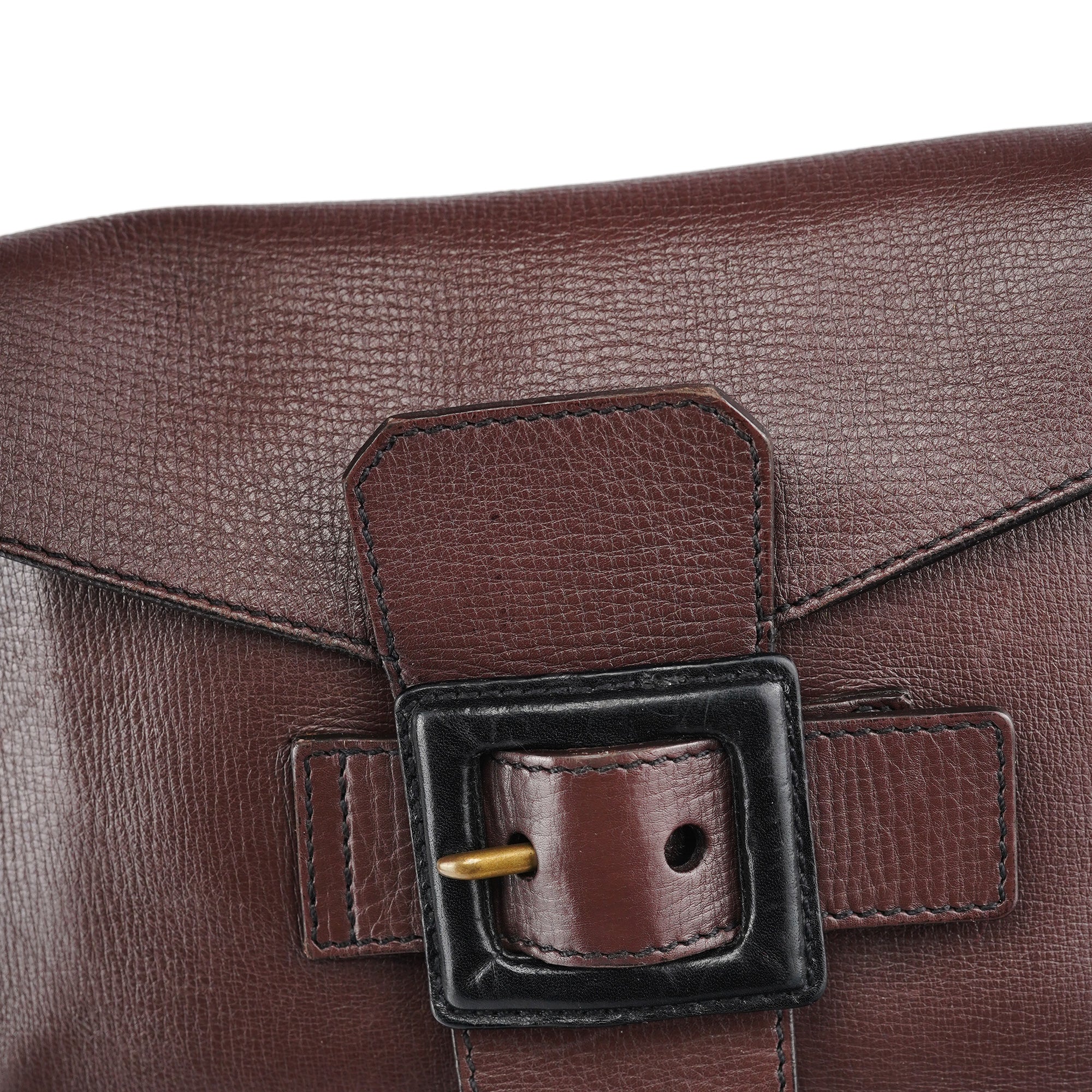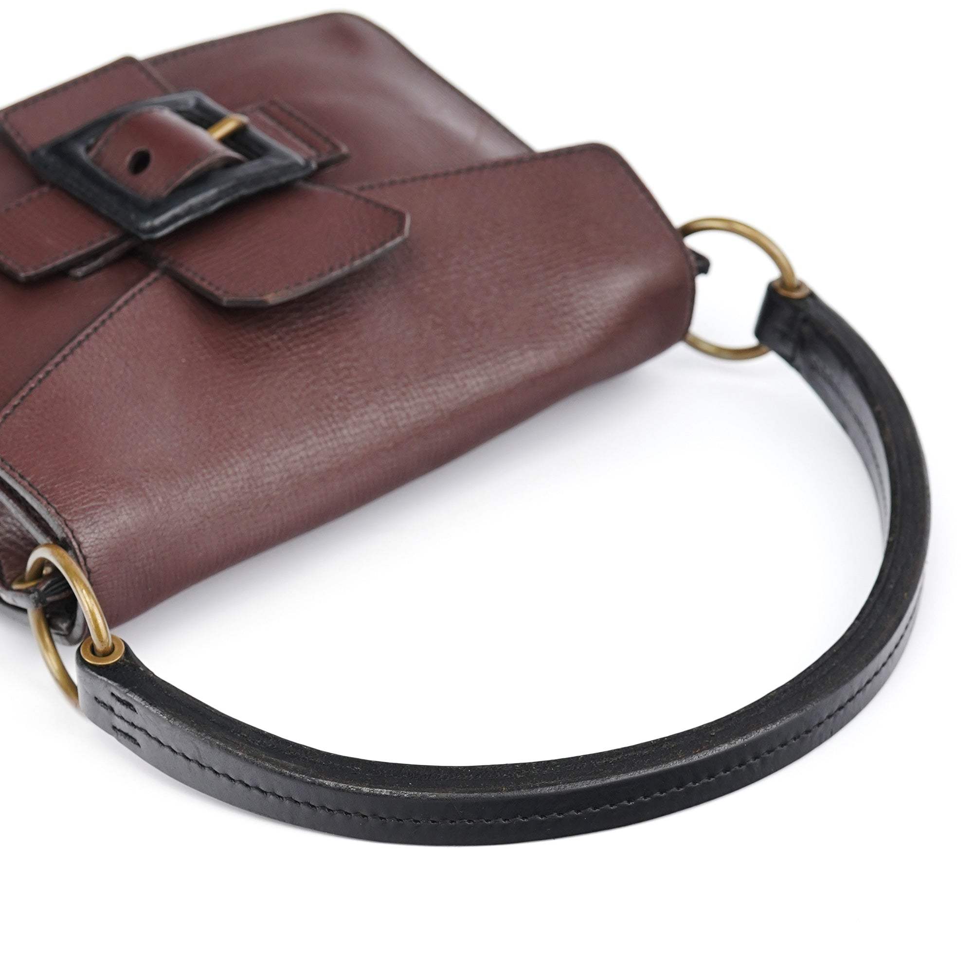Designed in the early 2000s by Miuccia Prada, this Miu Miu shoulder bag features deep brown textured leather with a distinctive oversized front buckle in black and brown leather. The structured silhouette is completed with a gold-tone ring handle attachment and a flap closure. The interior is lined in black canvas and includes a zippered pocket with a gold-tone metal logo plaque.