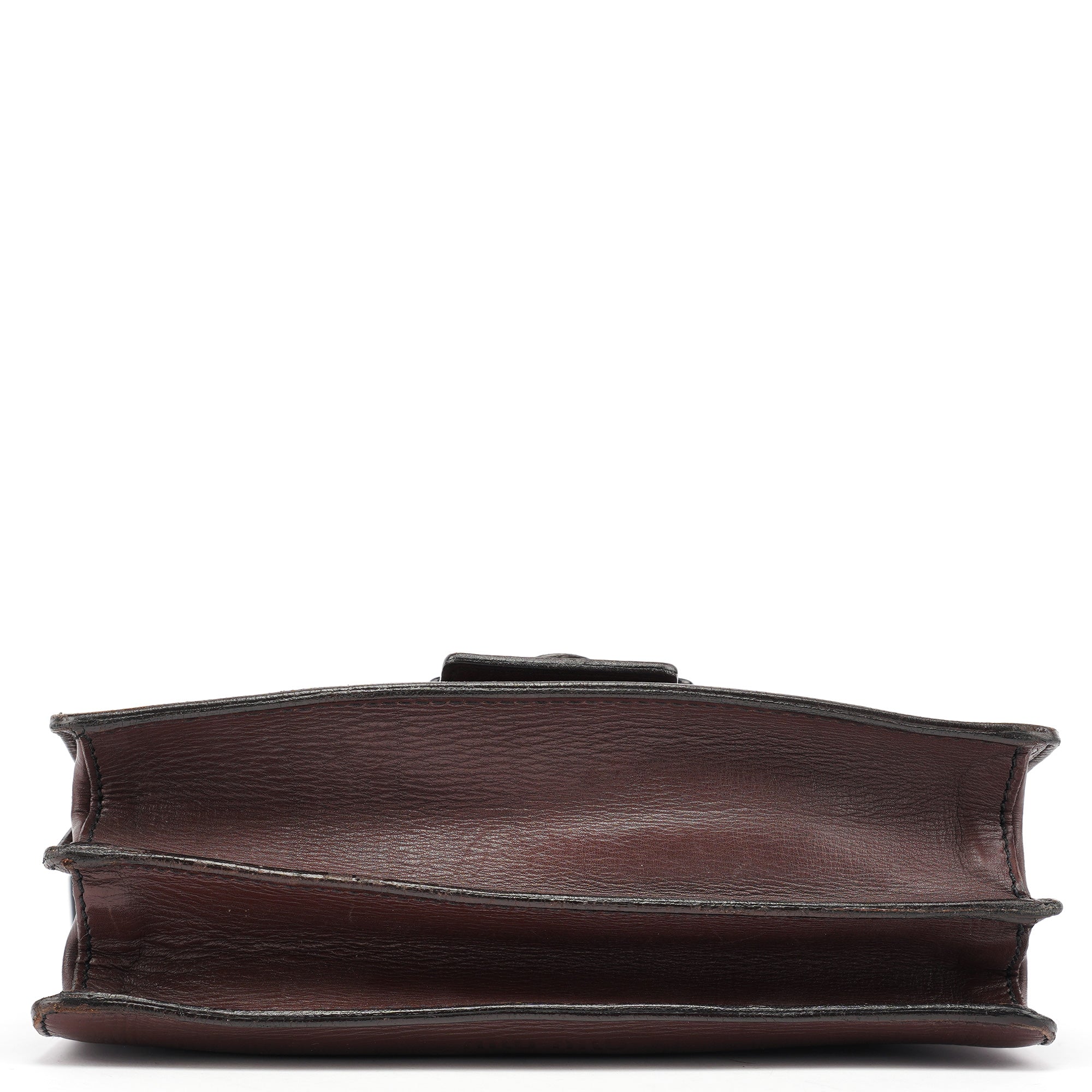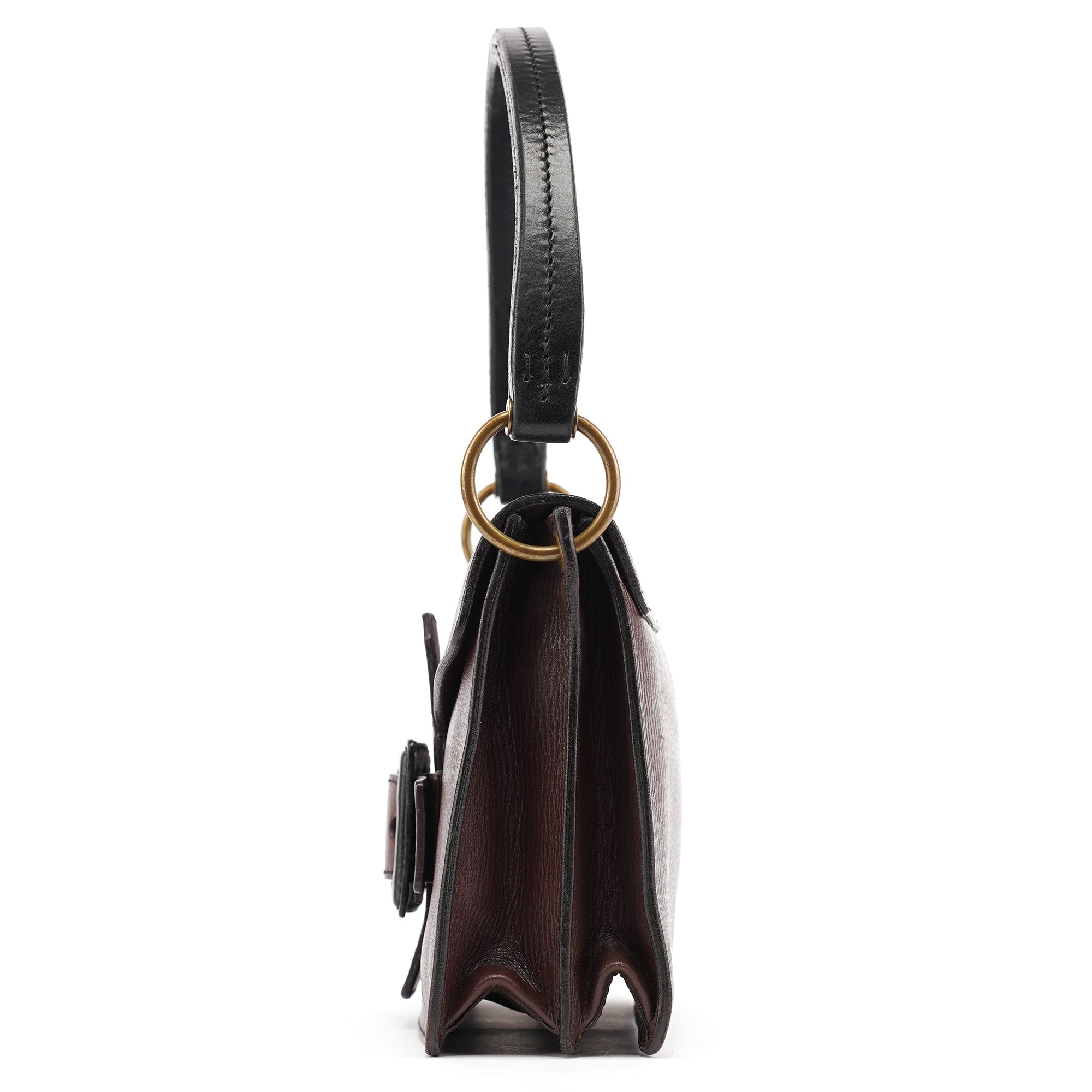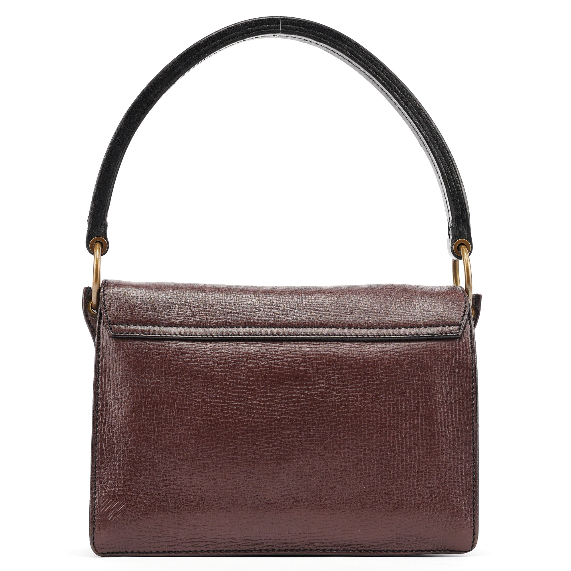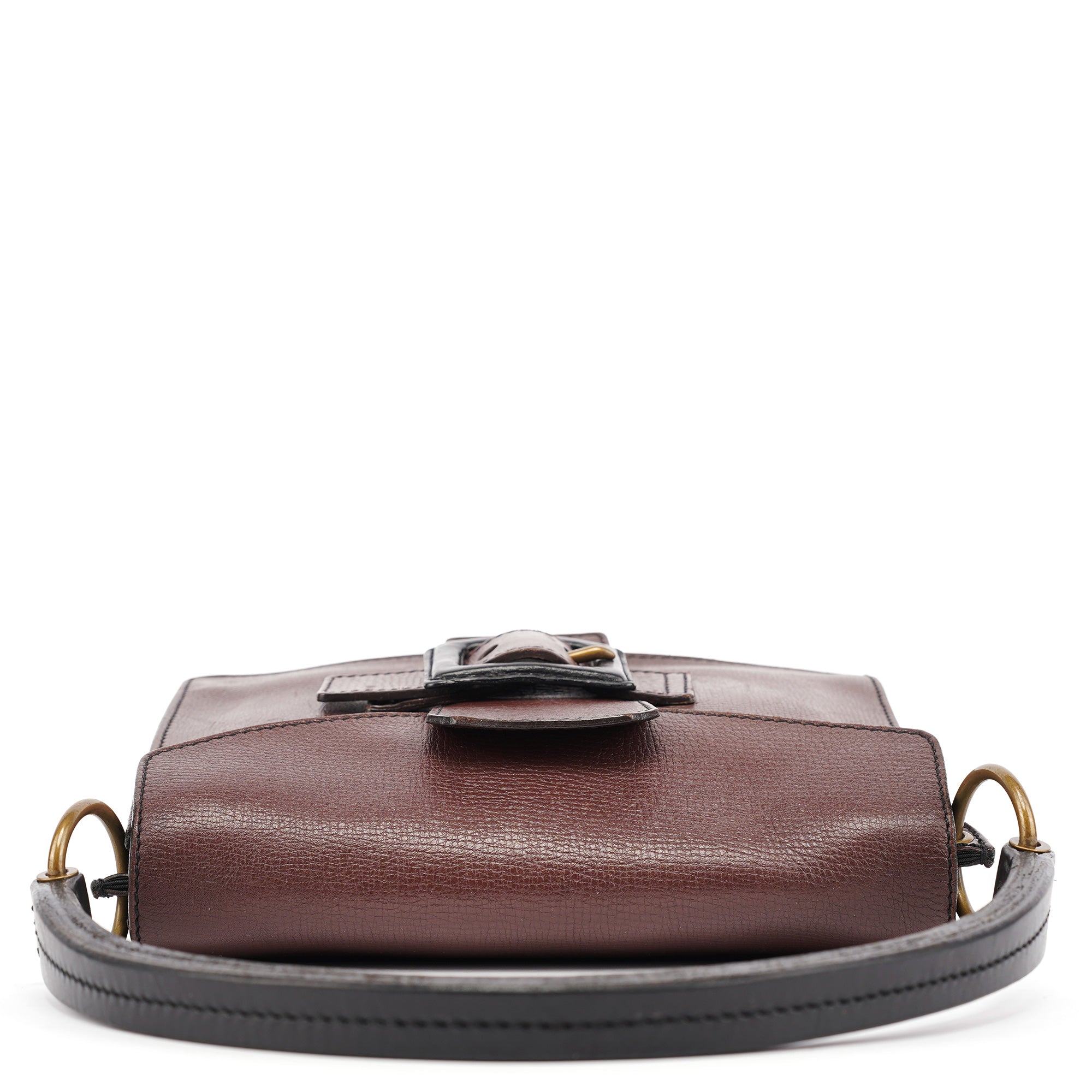 Designed in the early 2000s by Miuccia Prada, this Miu Miu shoulder bag features deep brown textured leather with a distinctive oversized front buckle in black and brown leather. The structured silhouette is completed with a gold-tone ring handle attachment and a flap closure. The interior is lined in black canvas and includes a zippered pocket with a gold-tone metal logo plaque.