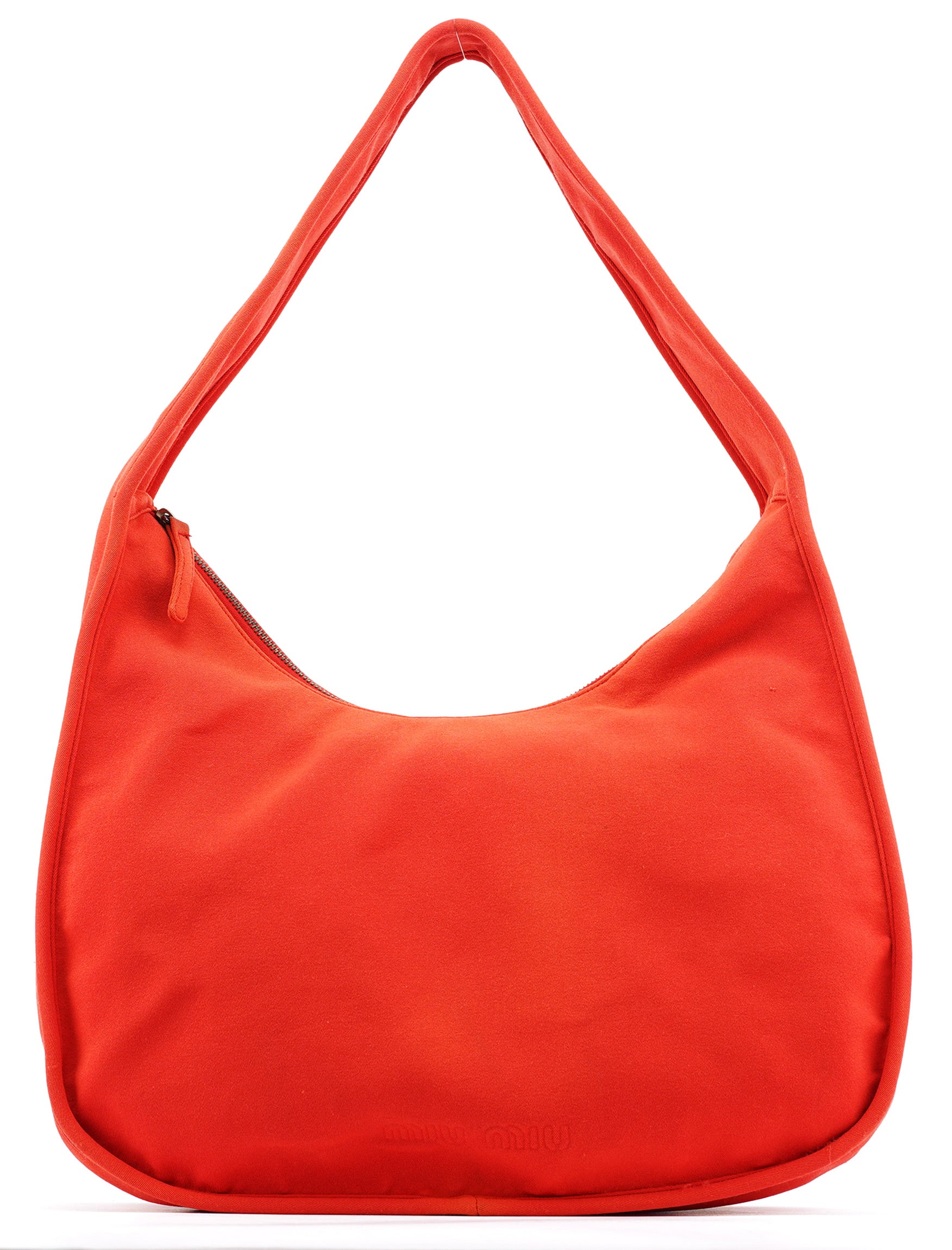 Designed in the late 1990's by Miuccia Prada, this vintage Miu Miu hobo shoulder bag features coral red mesh jersey construction with a soft, relaxed silhouette. The lightweight material creates a distinctive textured appearance, while a single shoulder strap offers comfortable wear. An embossed Miu Miu logo adorns the bag.