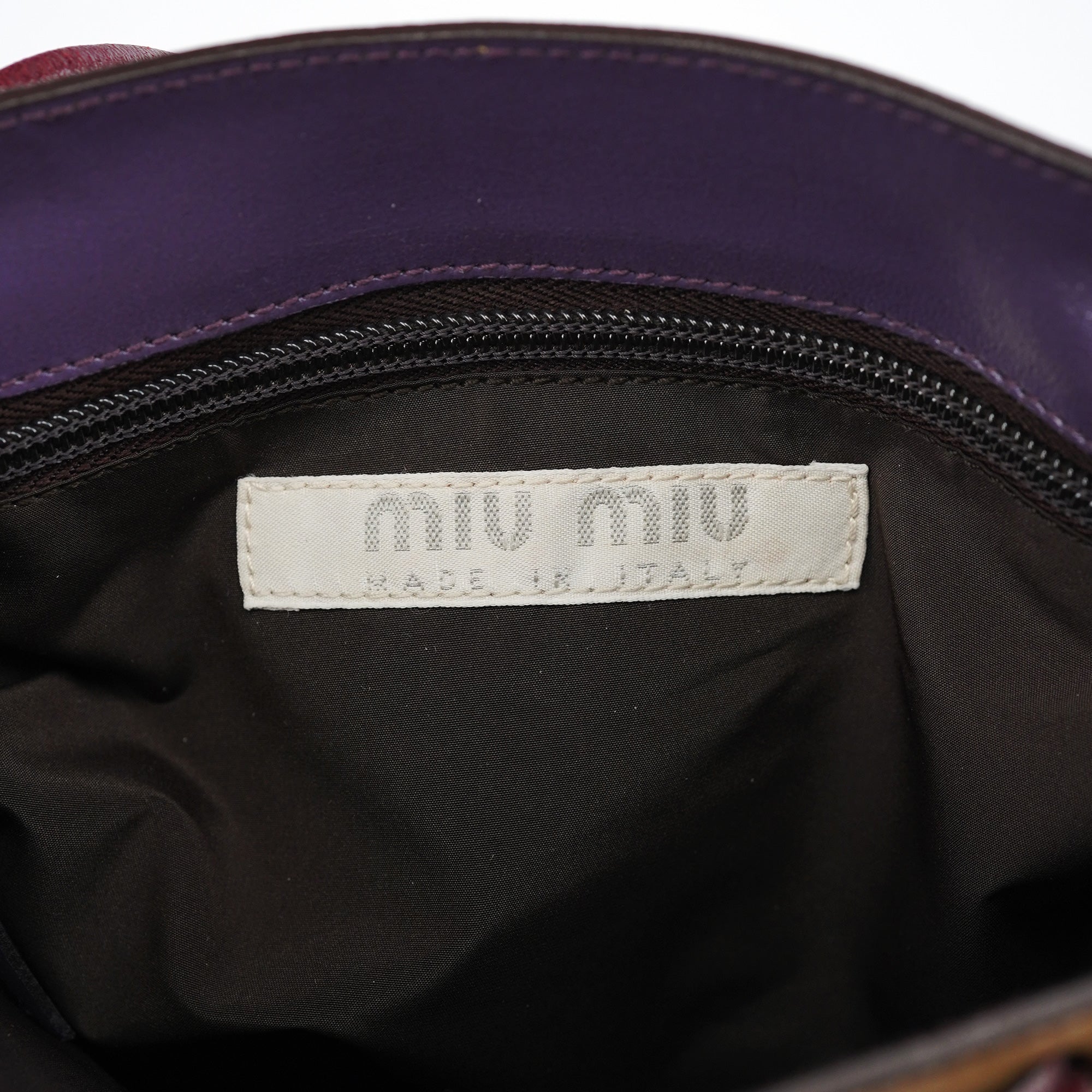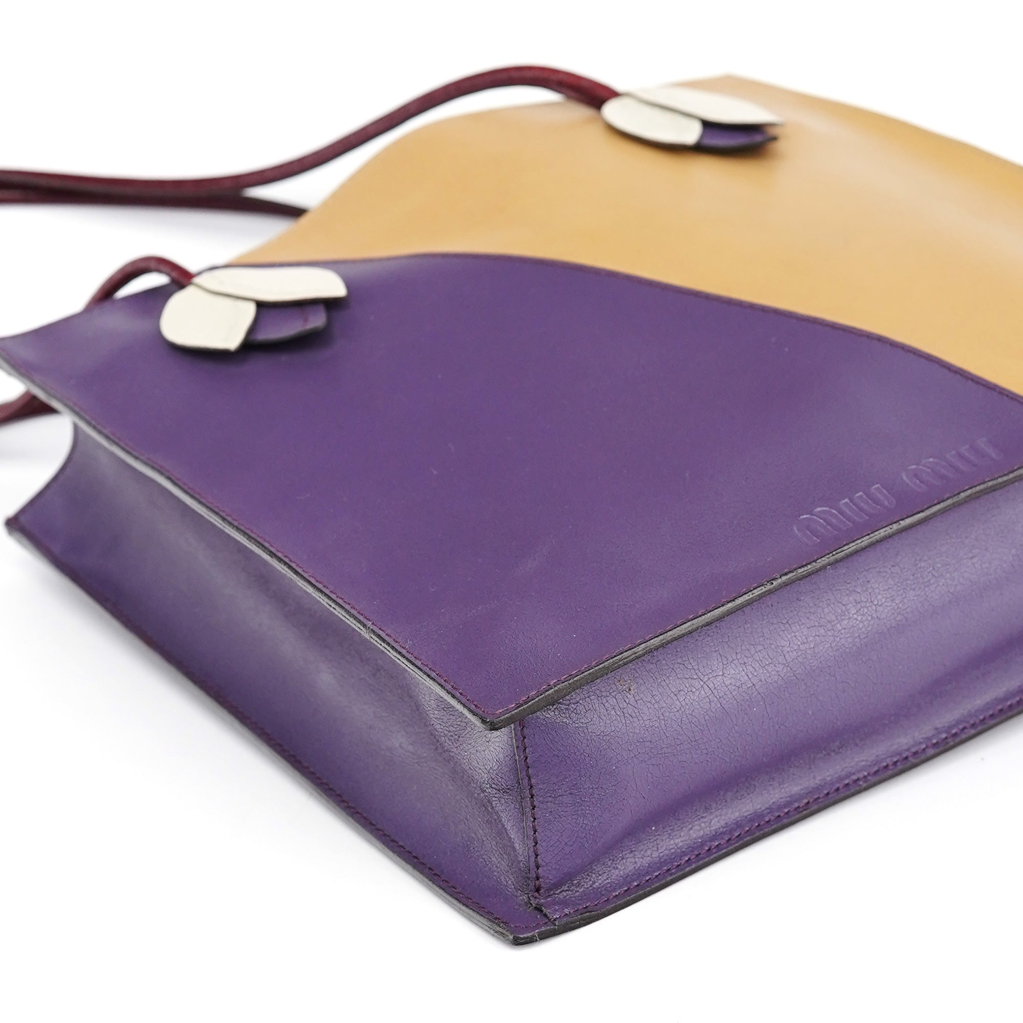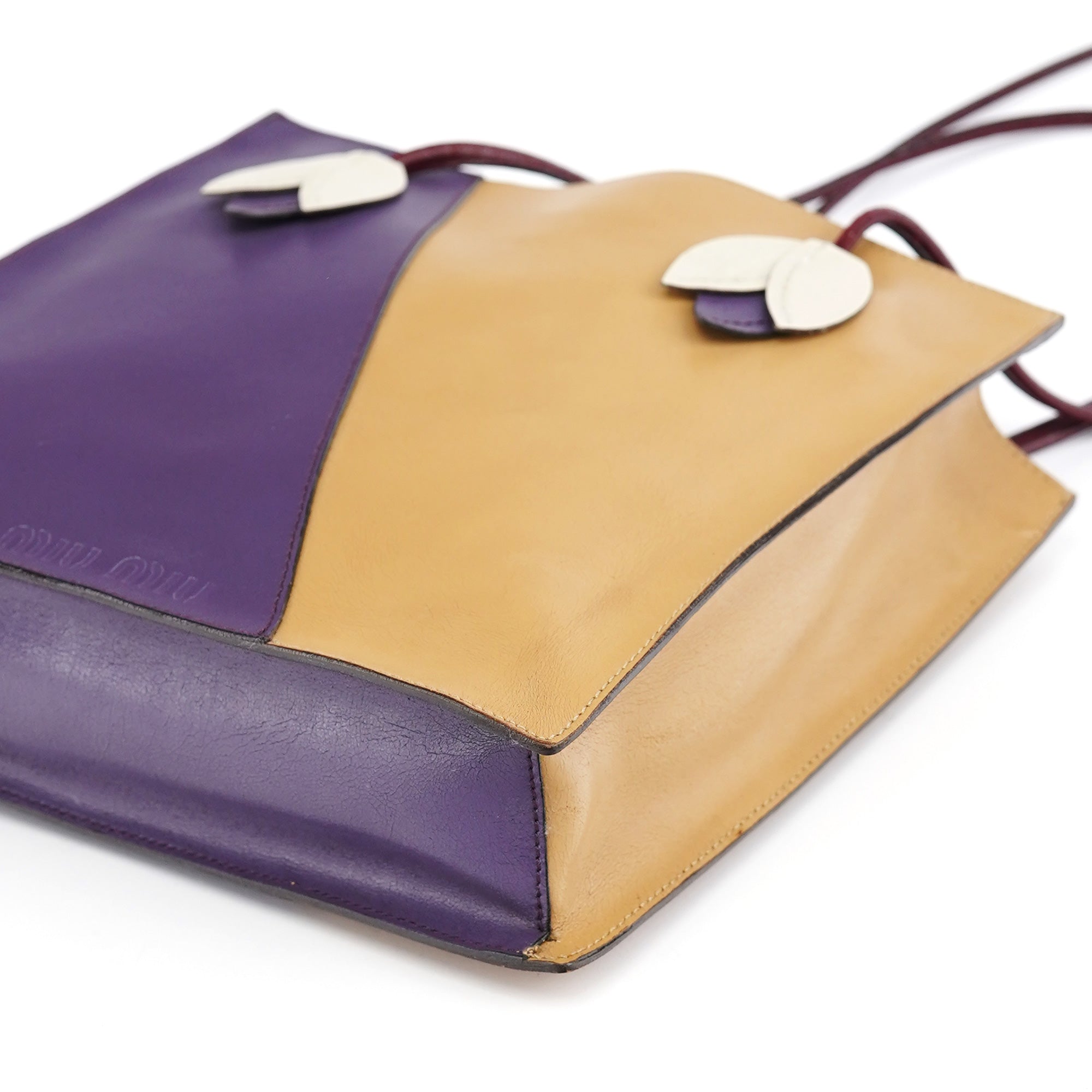 Designed in the early 2000's by Miuccia Prada, this vintage Miu Miu tote bag features purple and beige leather in a color-blocked design with twin top handles adorned with decorative leaf-shaped leather ornaments. The bag features contrast stitching along the edges and closes at the top. The interior is lined in brown nylon and includes a zipper pocket.